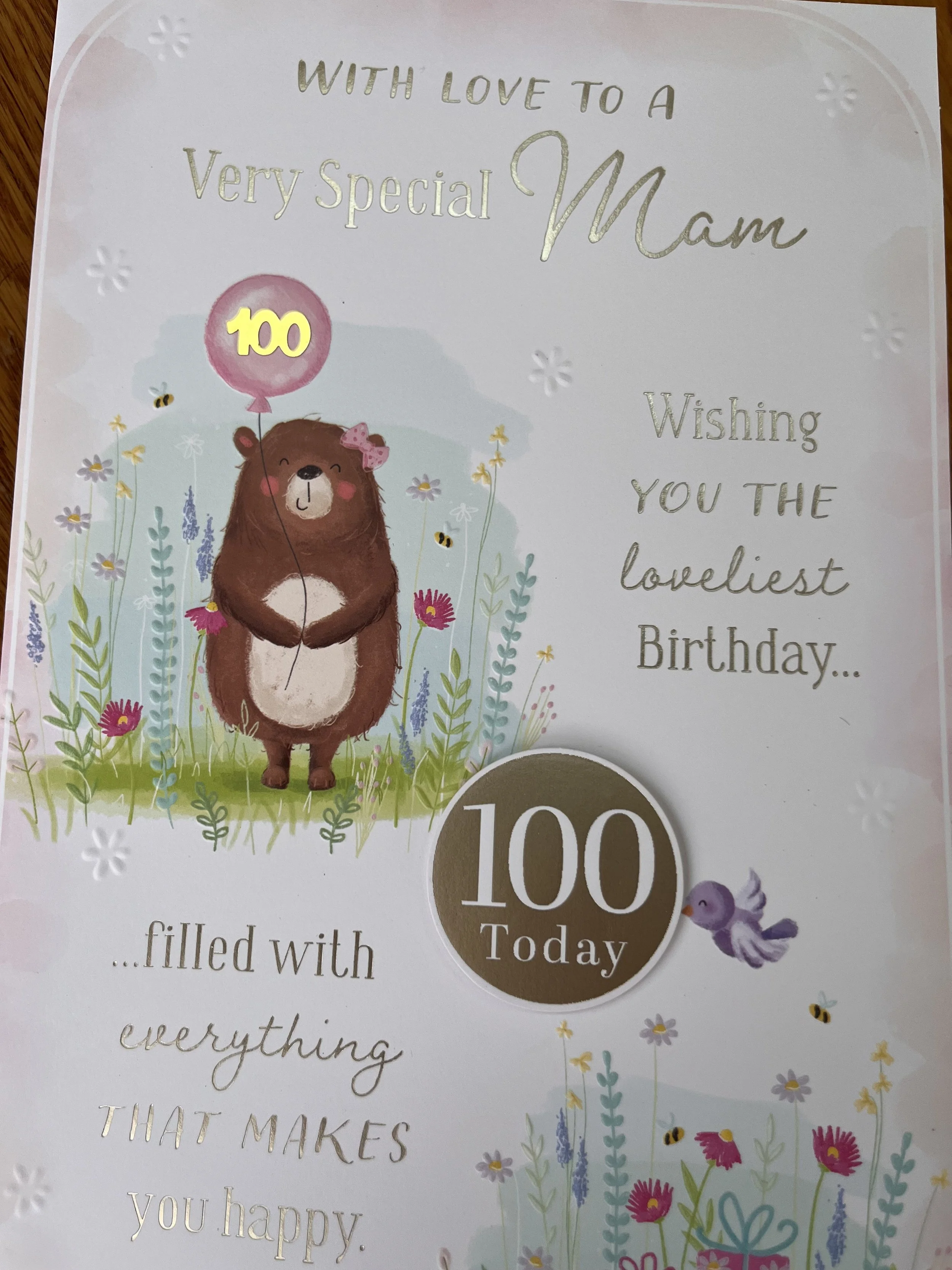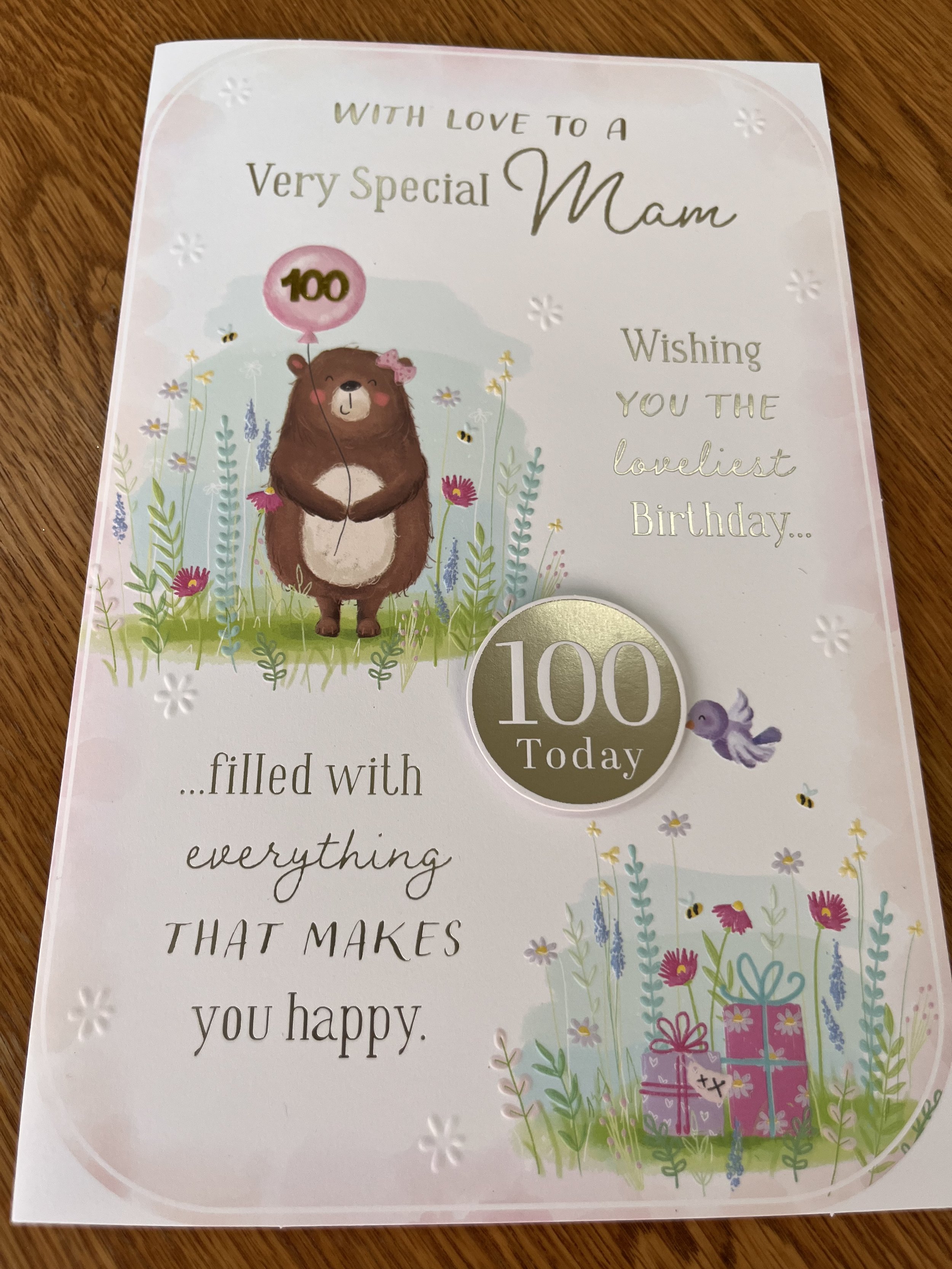 Mam 100th Birthday card is an extra special book type of design , HAND FINISHED and features a 3D gold foiled embellishment , a gold foiled 100 attachment, effective foiling and Inside 7 pages of "Loving Words" on full colour illustrated inserts with a green foiled 100 attachment on the 2nd to last page- please see all photos 😍