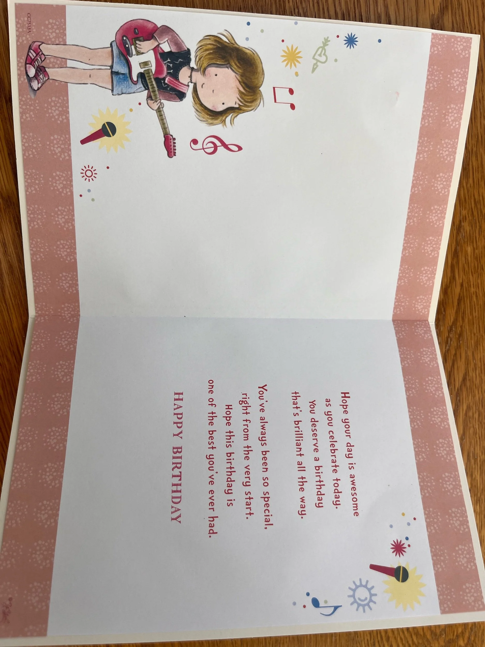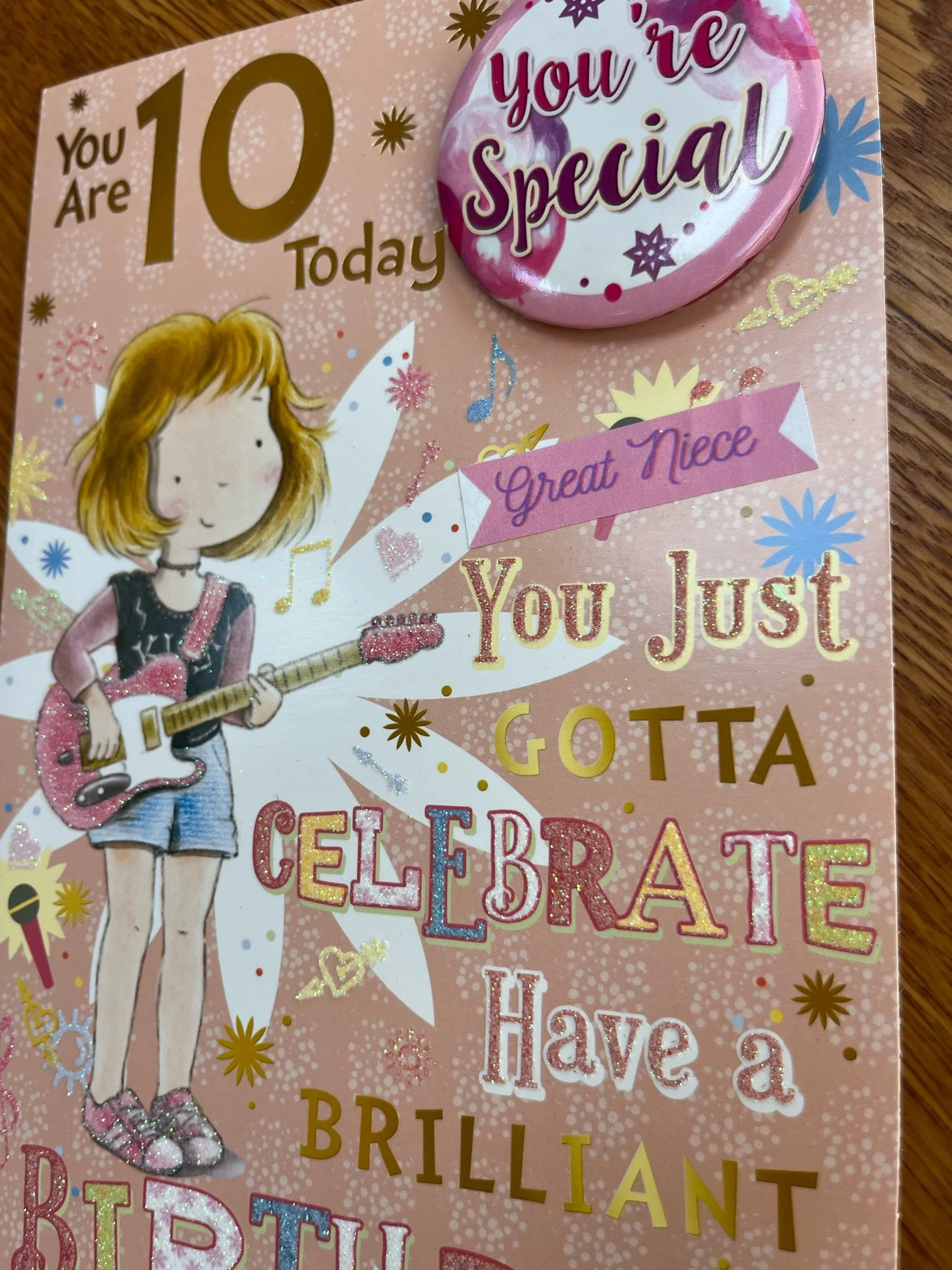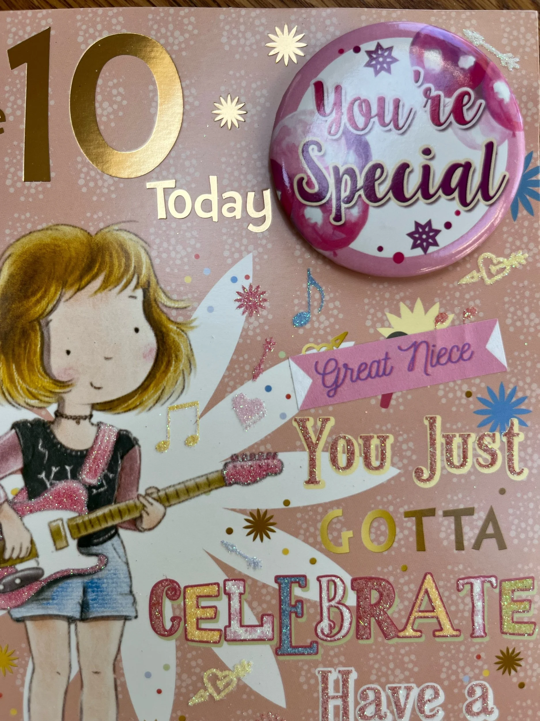 Girls 10th Birthday Card design features a detachable badge for the Birthday girl to wear - badge design varies, effective gold foiling, flitter and inside a full colour illustrated insert