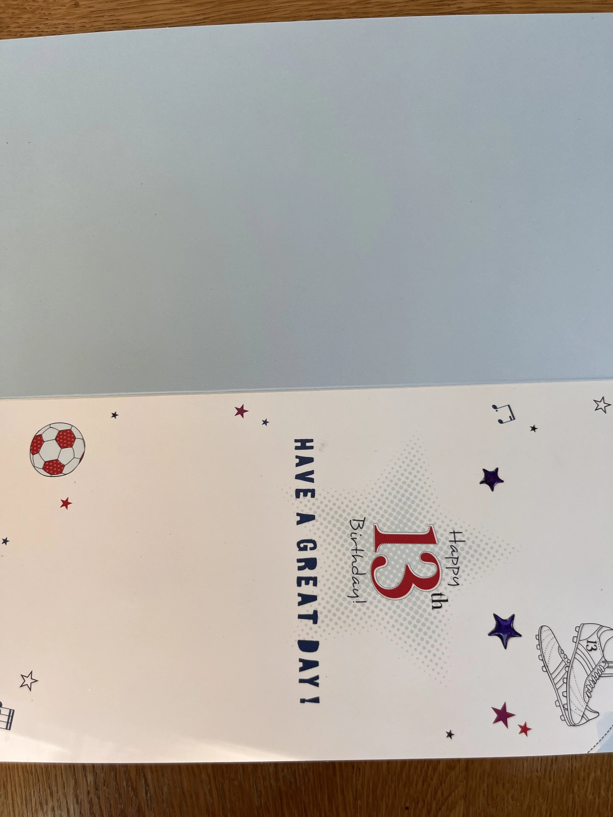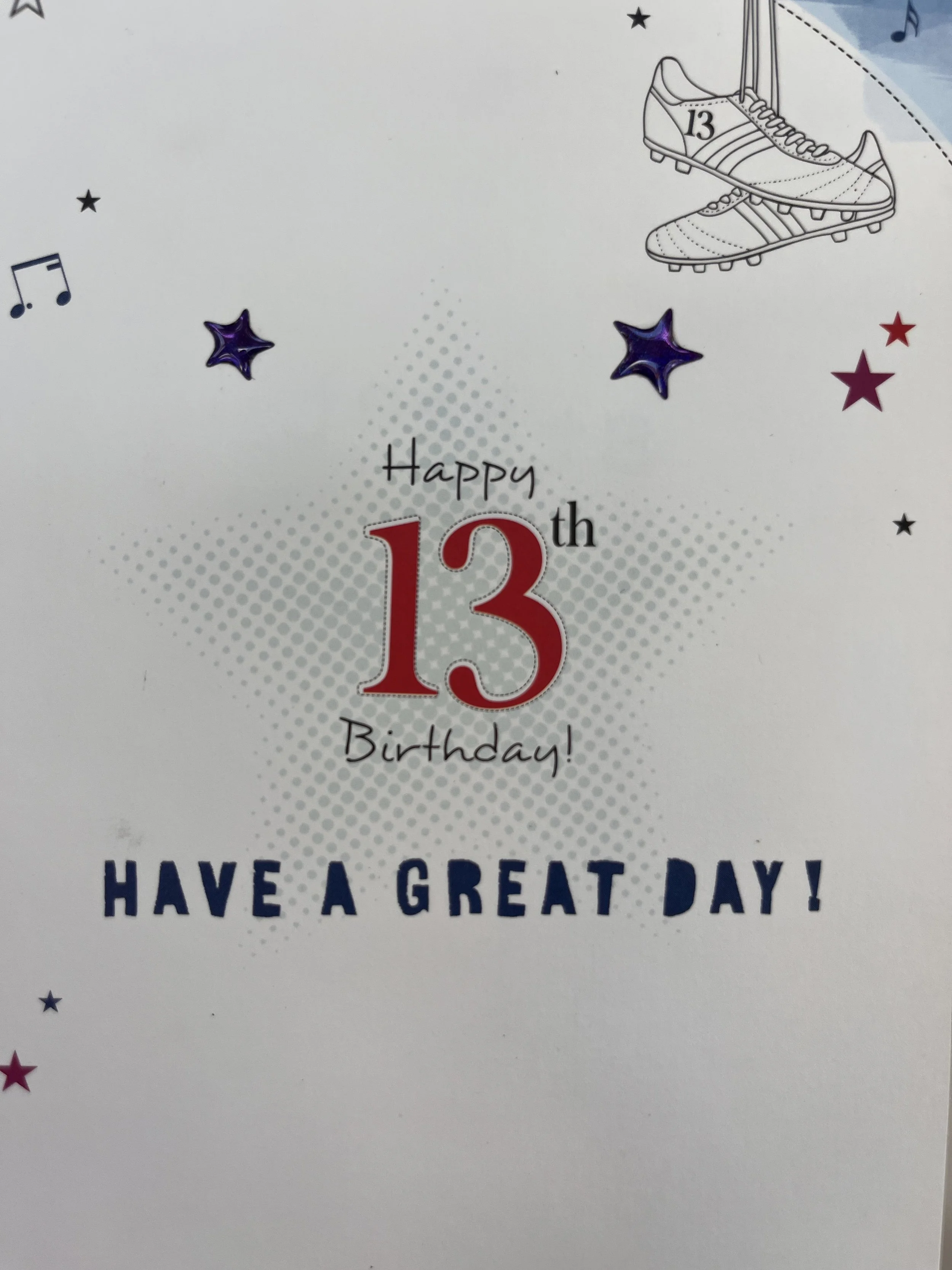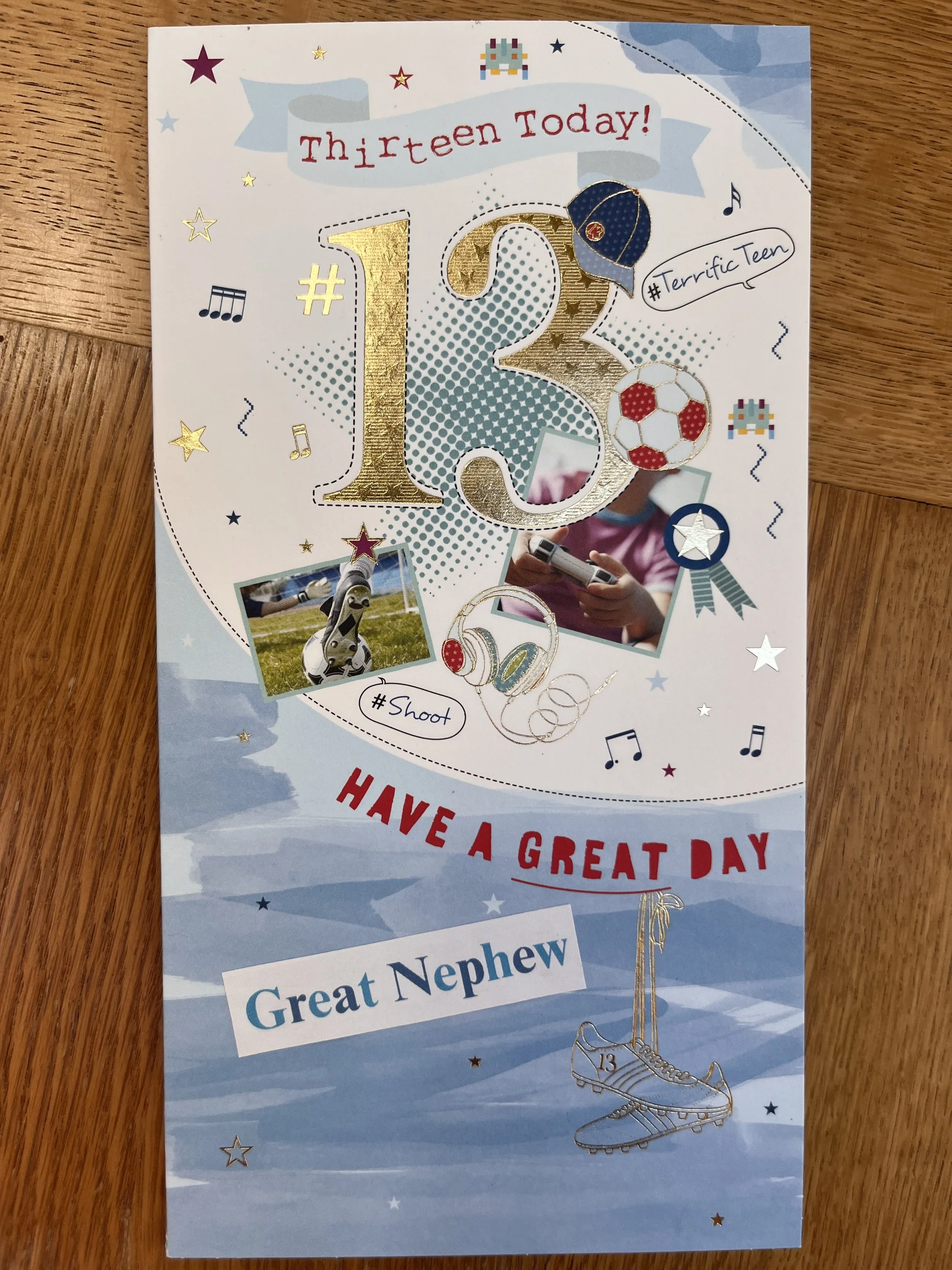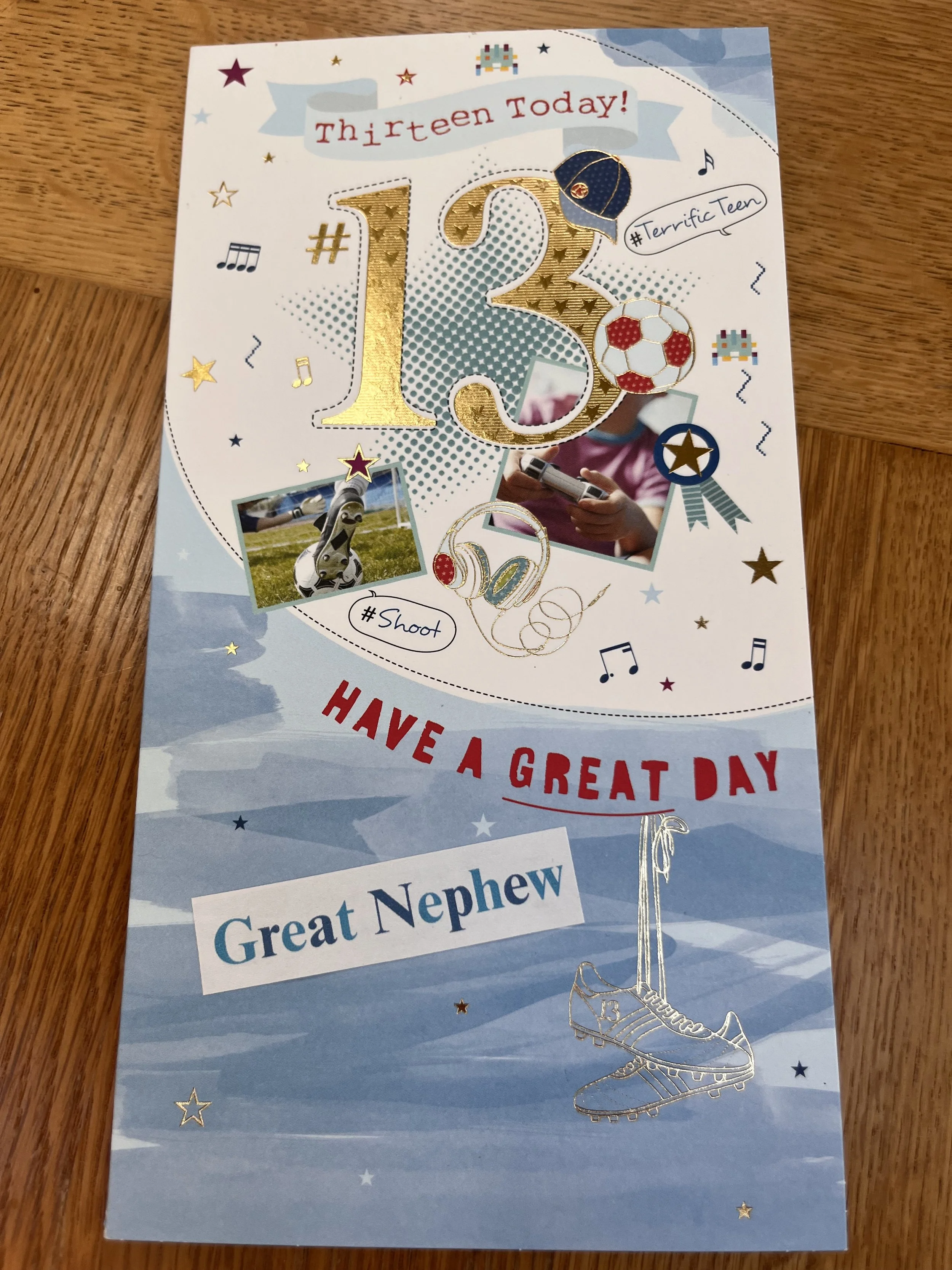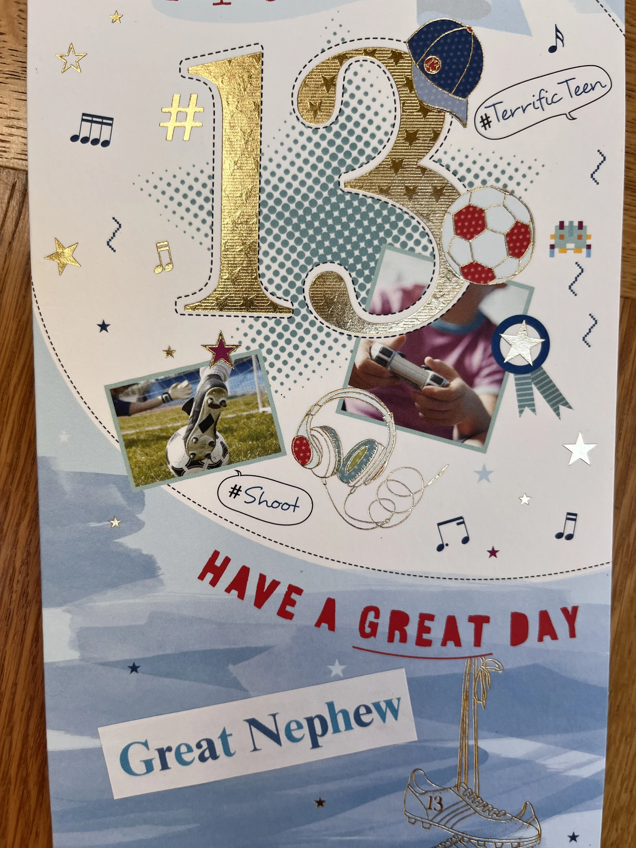 Great Nephew 13th Birthday card is a hand finished design that features effective gold foil, embossing, a 3d attachment with stars and inside a full colour illustrated insert with heartfelt words
