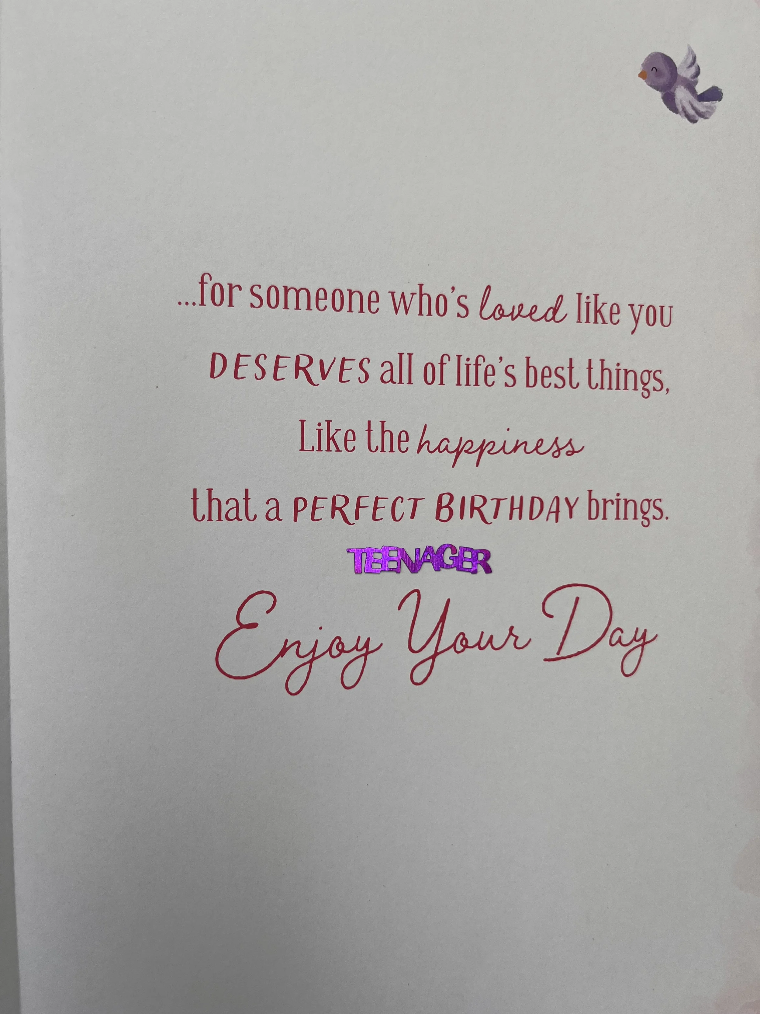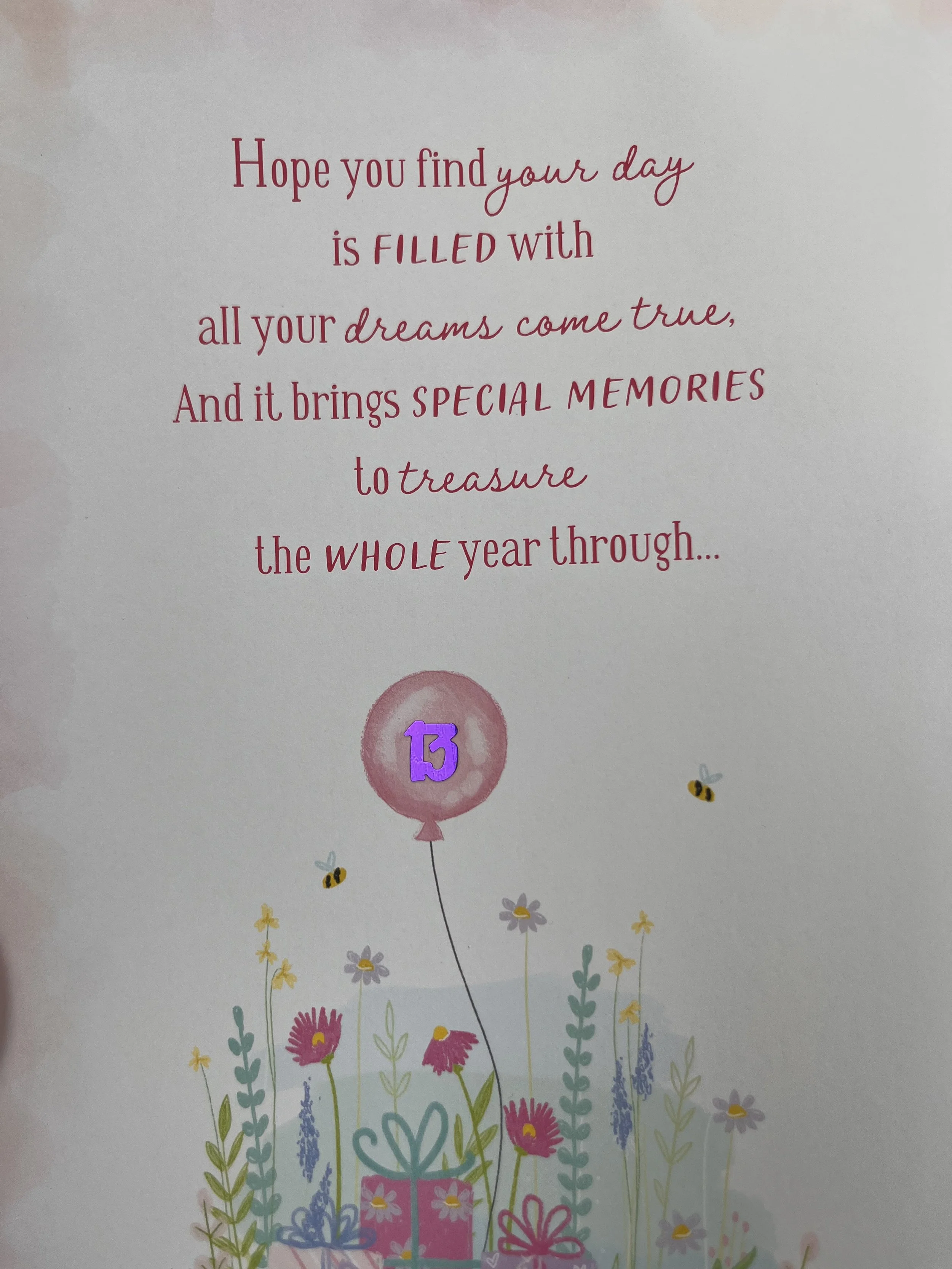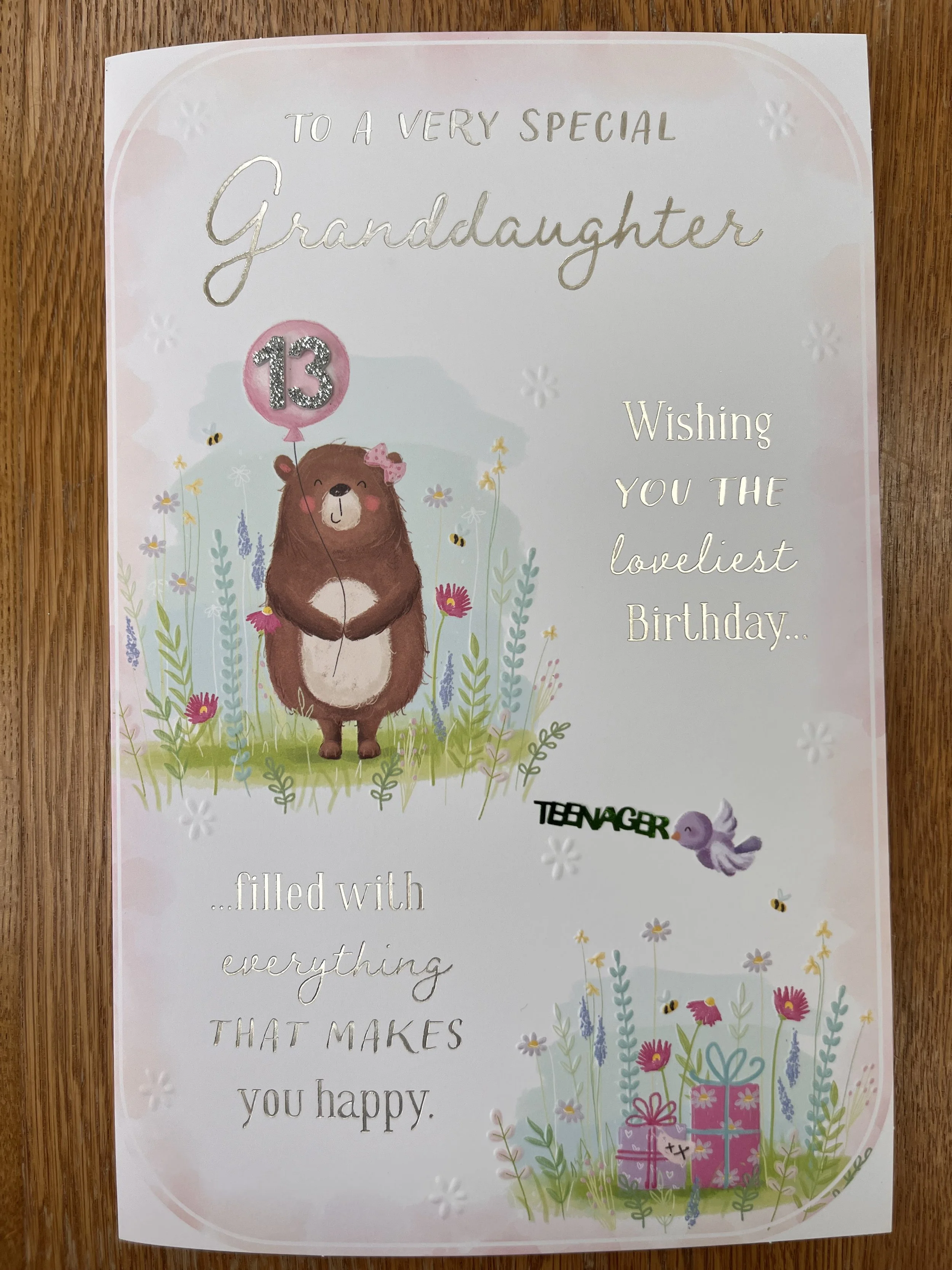 Granddaughter 13th Birthday Card design features a detachable badge for the Birthdaygirl to wear, flitter, diamanté effect attachments, foil and inside a full colour illustrated insert