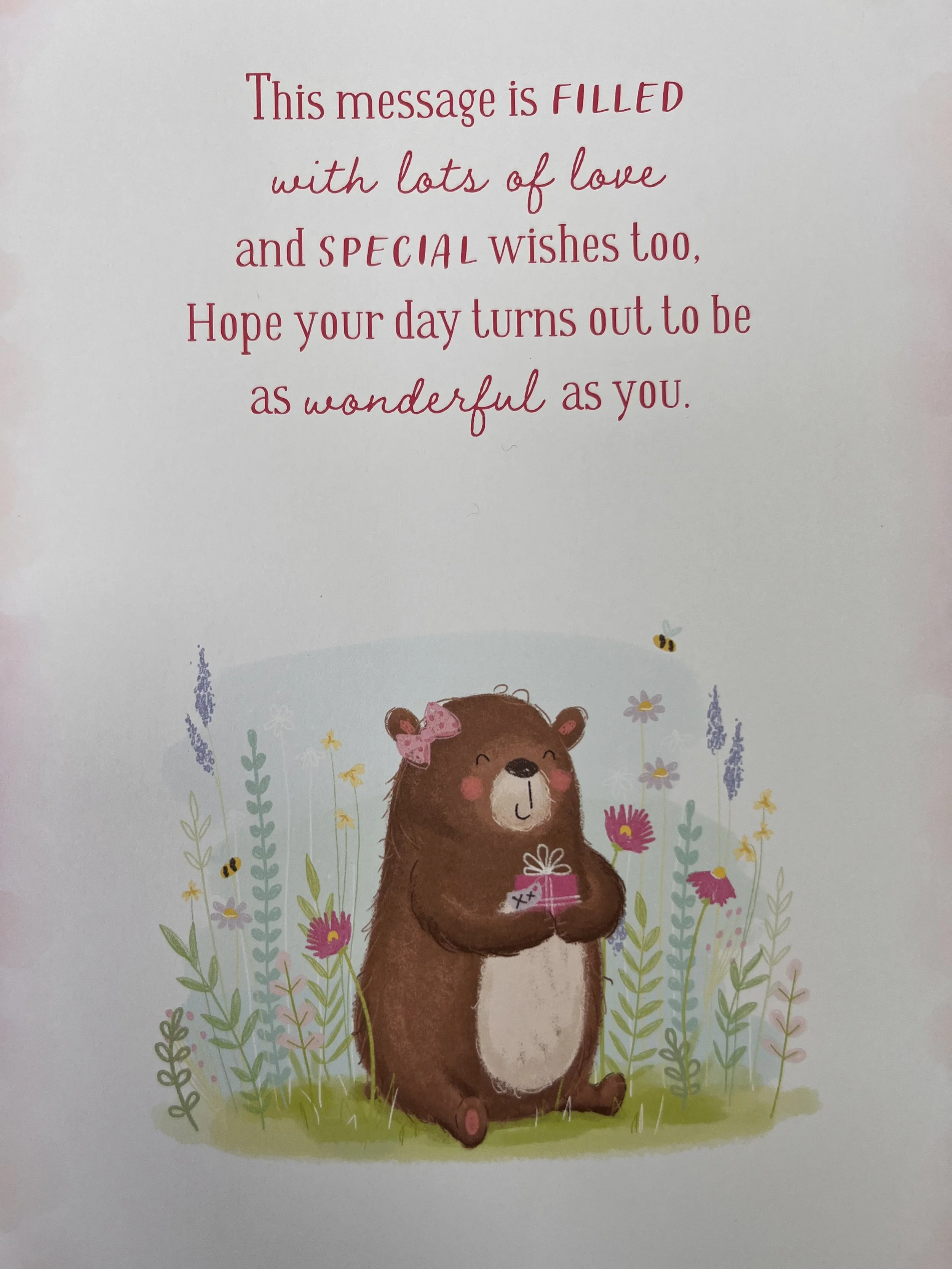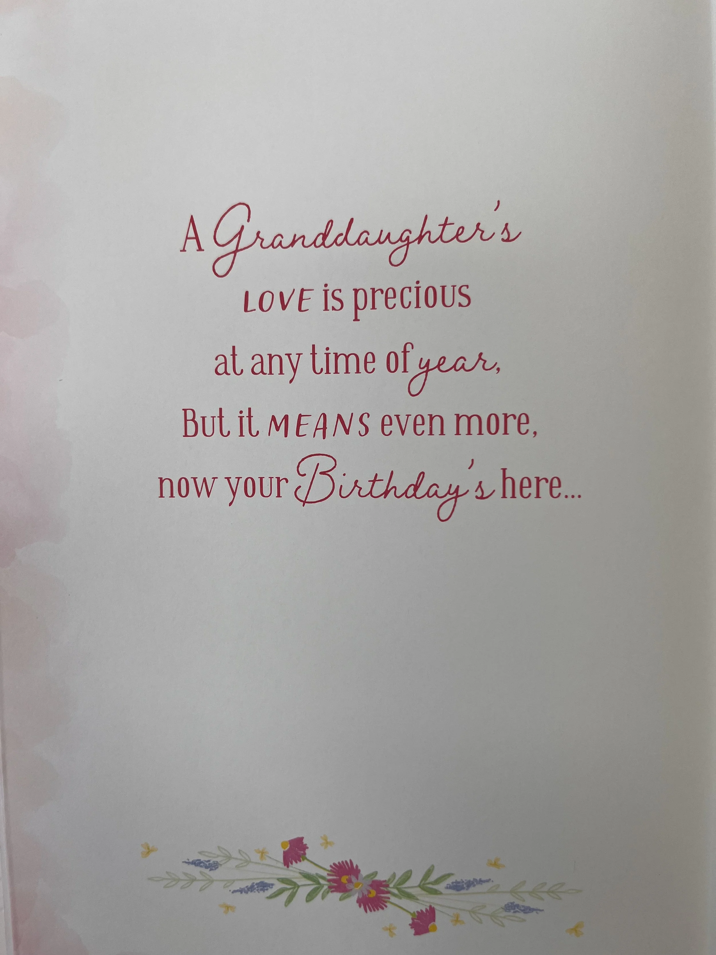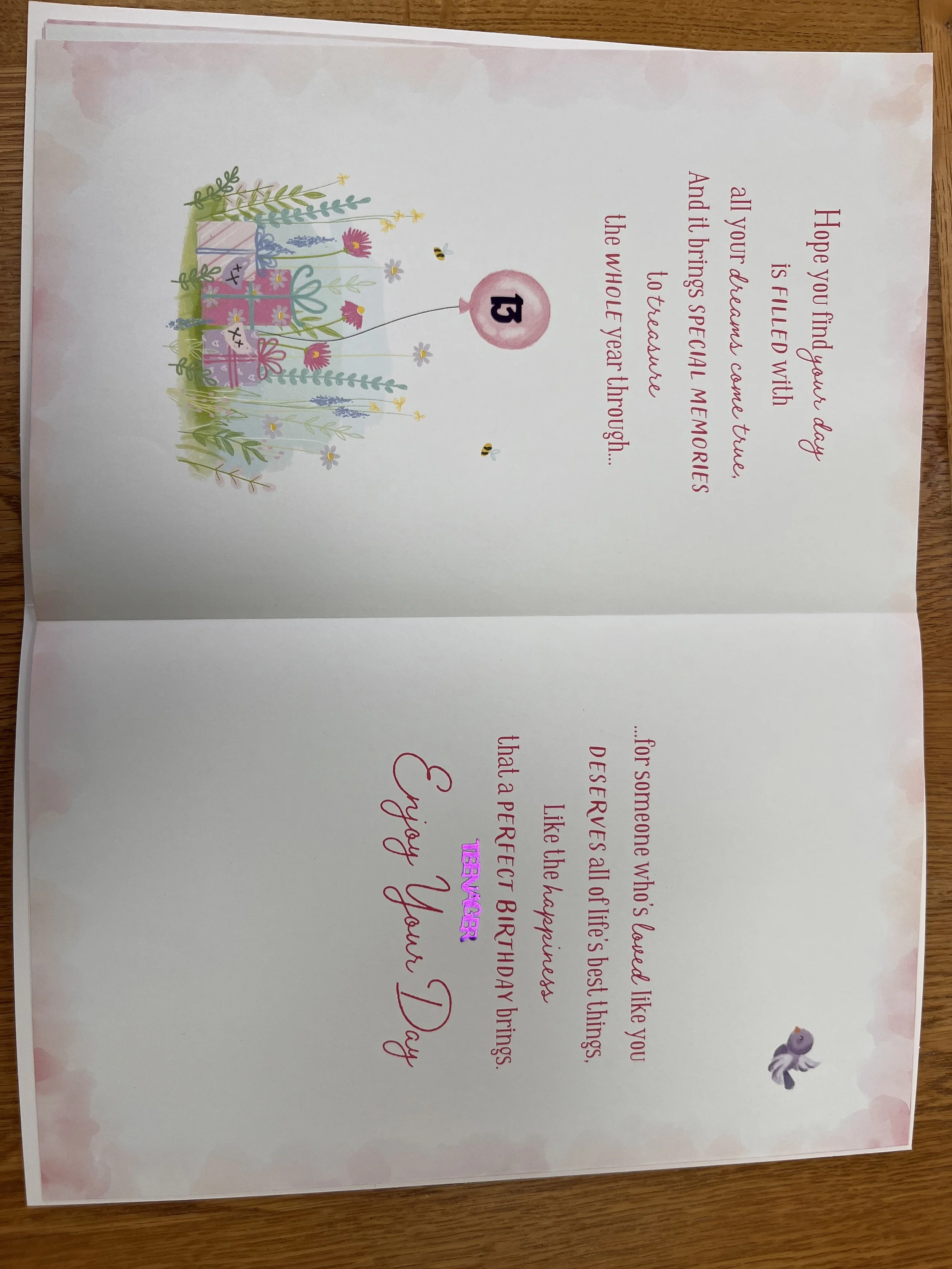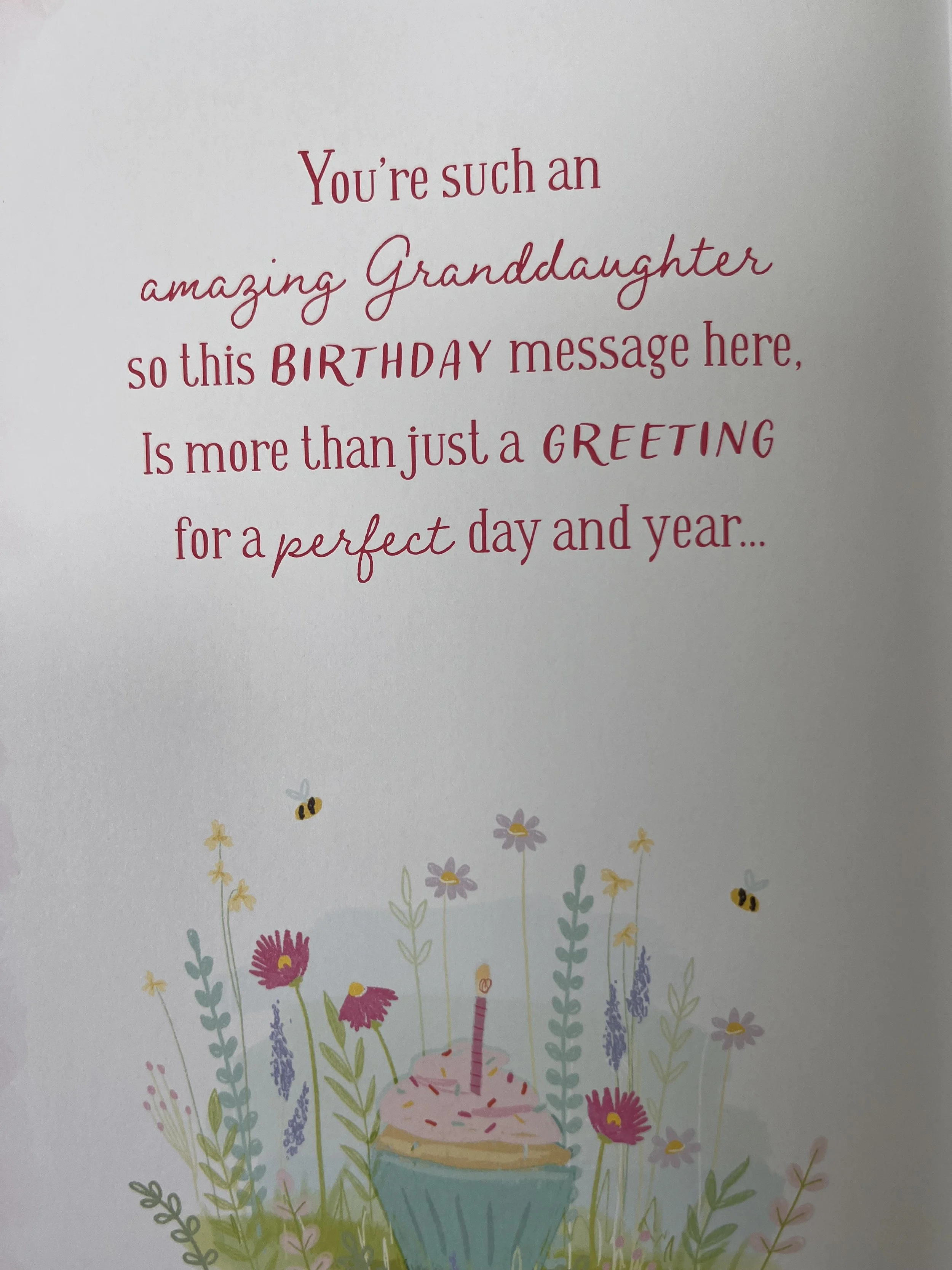 Granddaughter 13th Birthday Card design features a detachable badge for the Birthdaygirl to wear, flitter, diamanté effect attachments, foil and inside a full colour illustrated insert