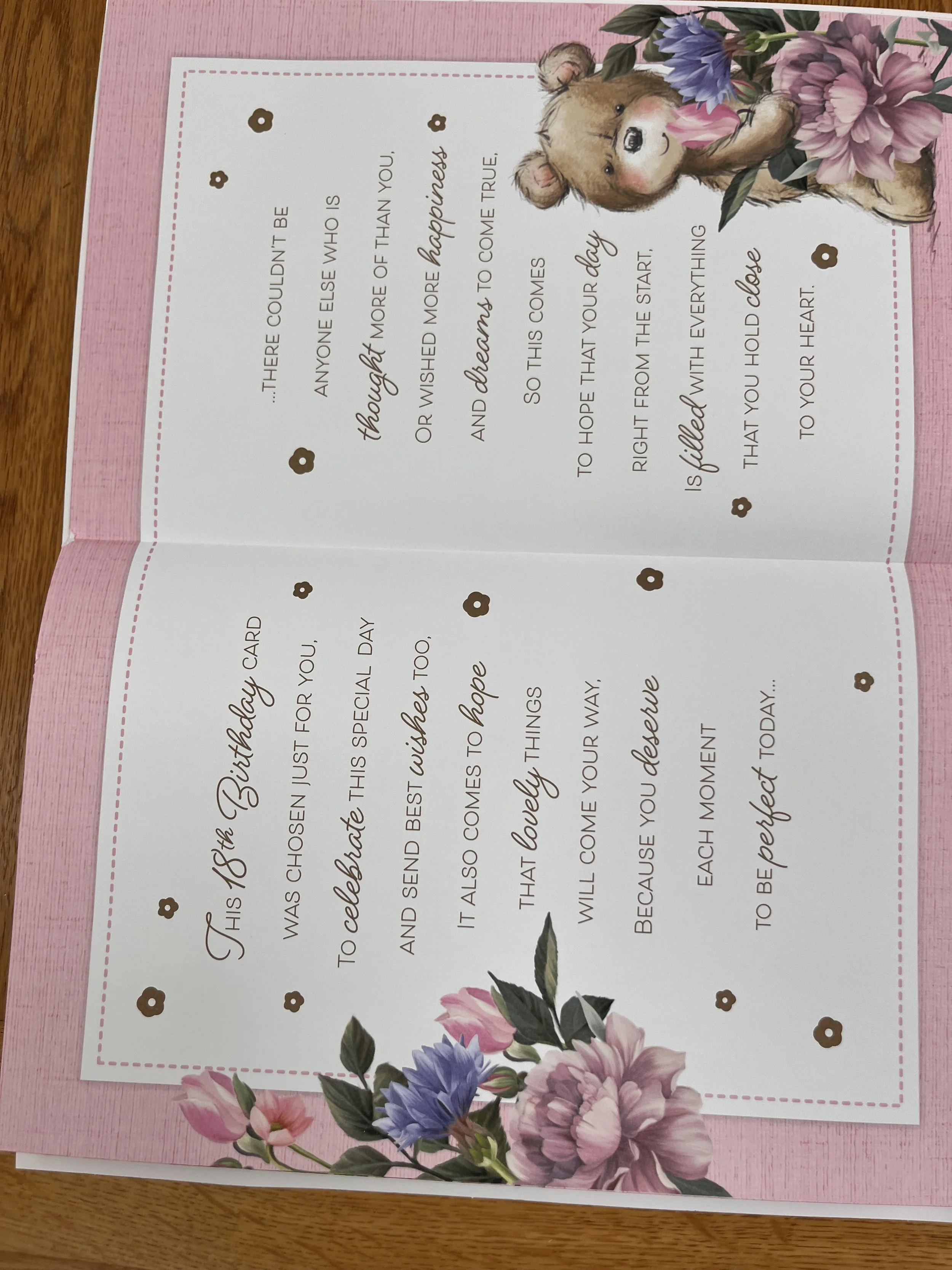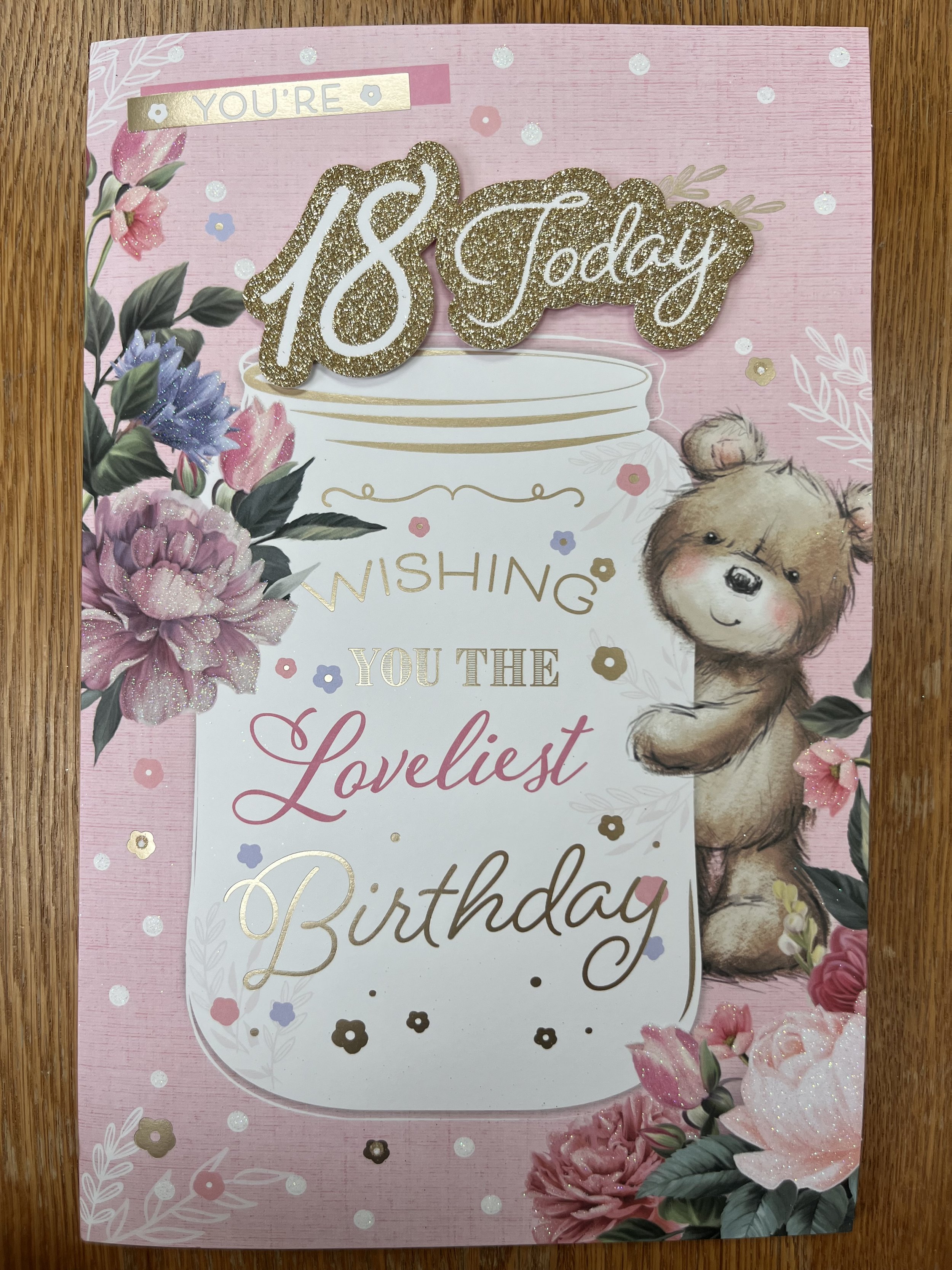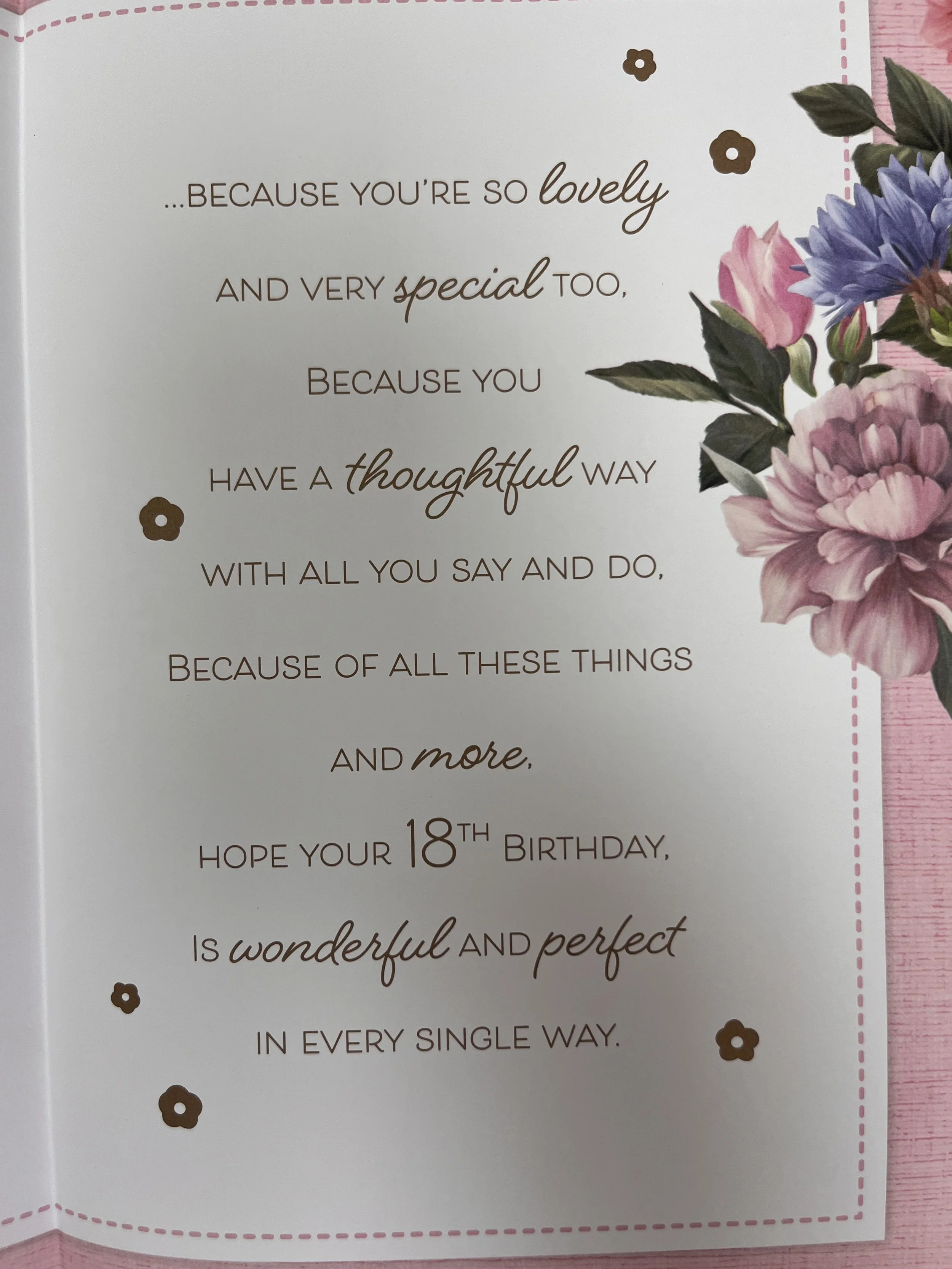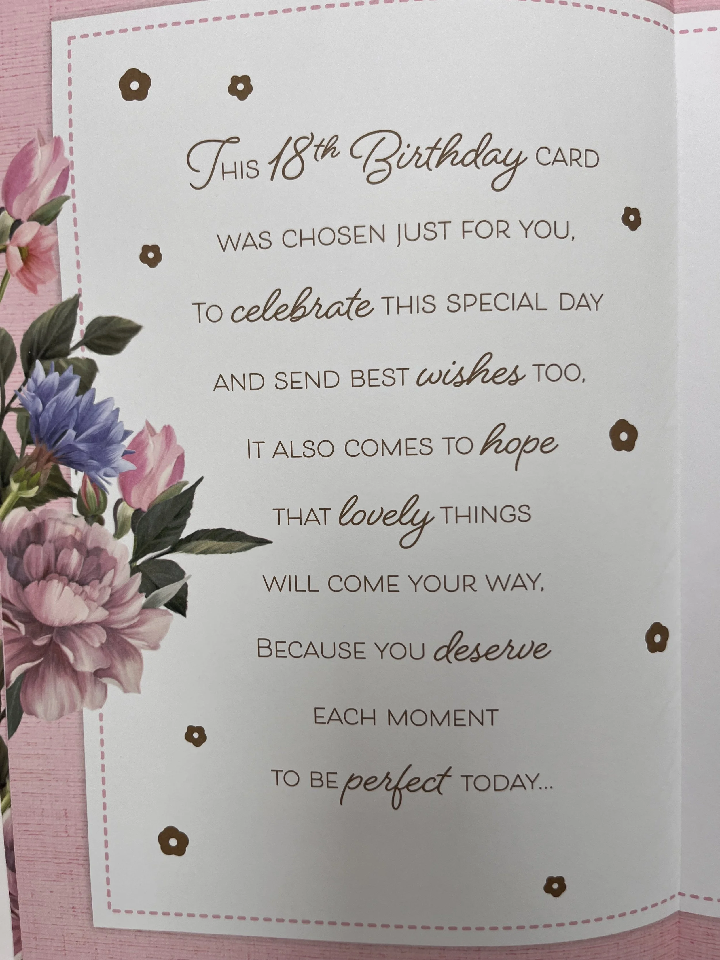 Girls 18th Birthday Card design features a shaped sparkly 3D attachment, effective foil, embossing, shaped edges and inside a colour illustrated insert with verse