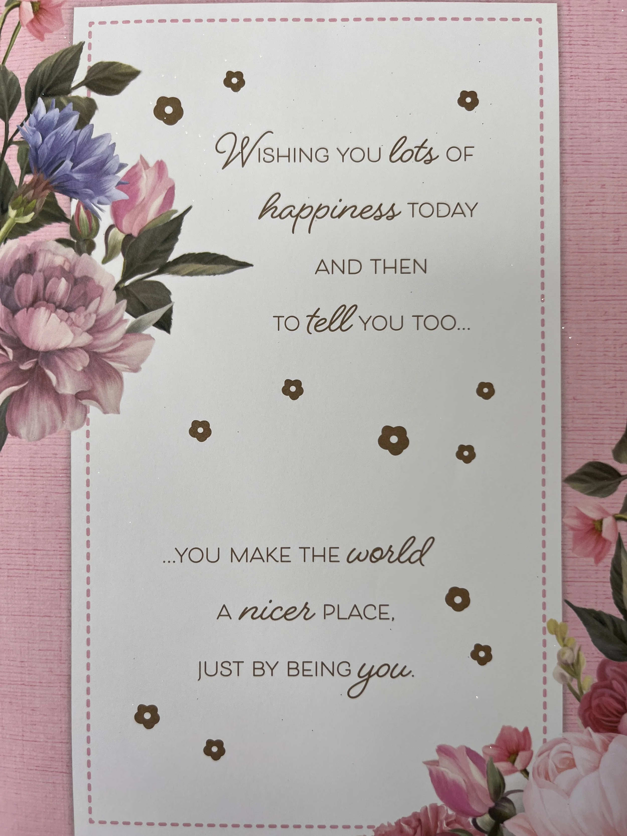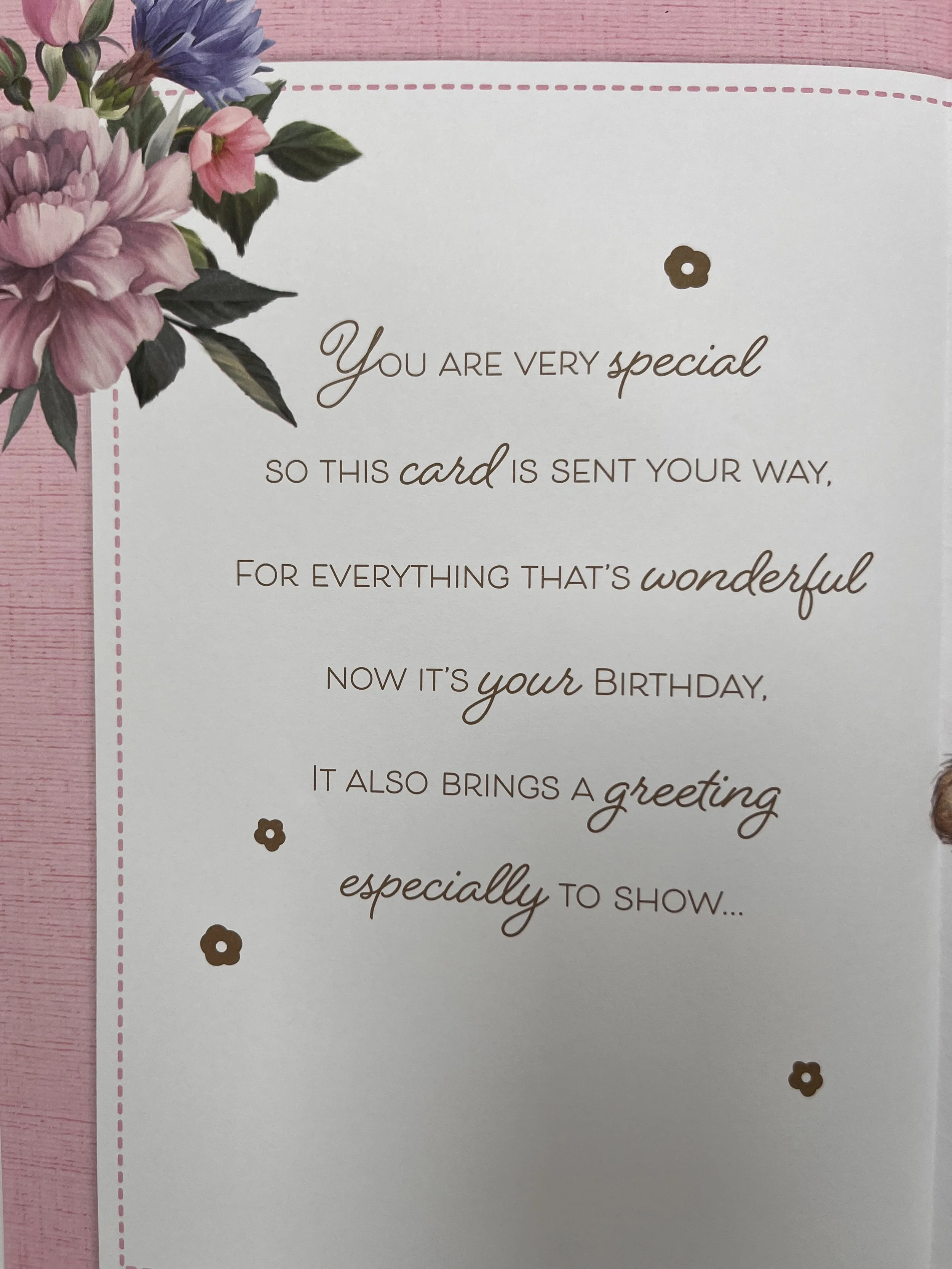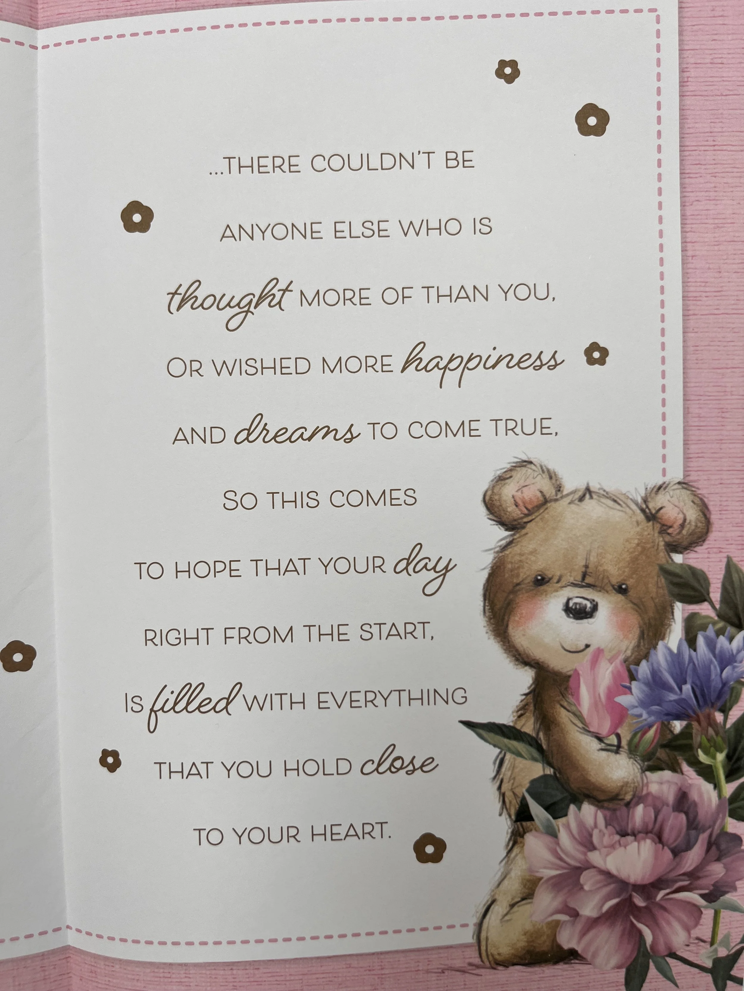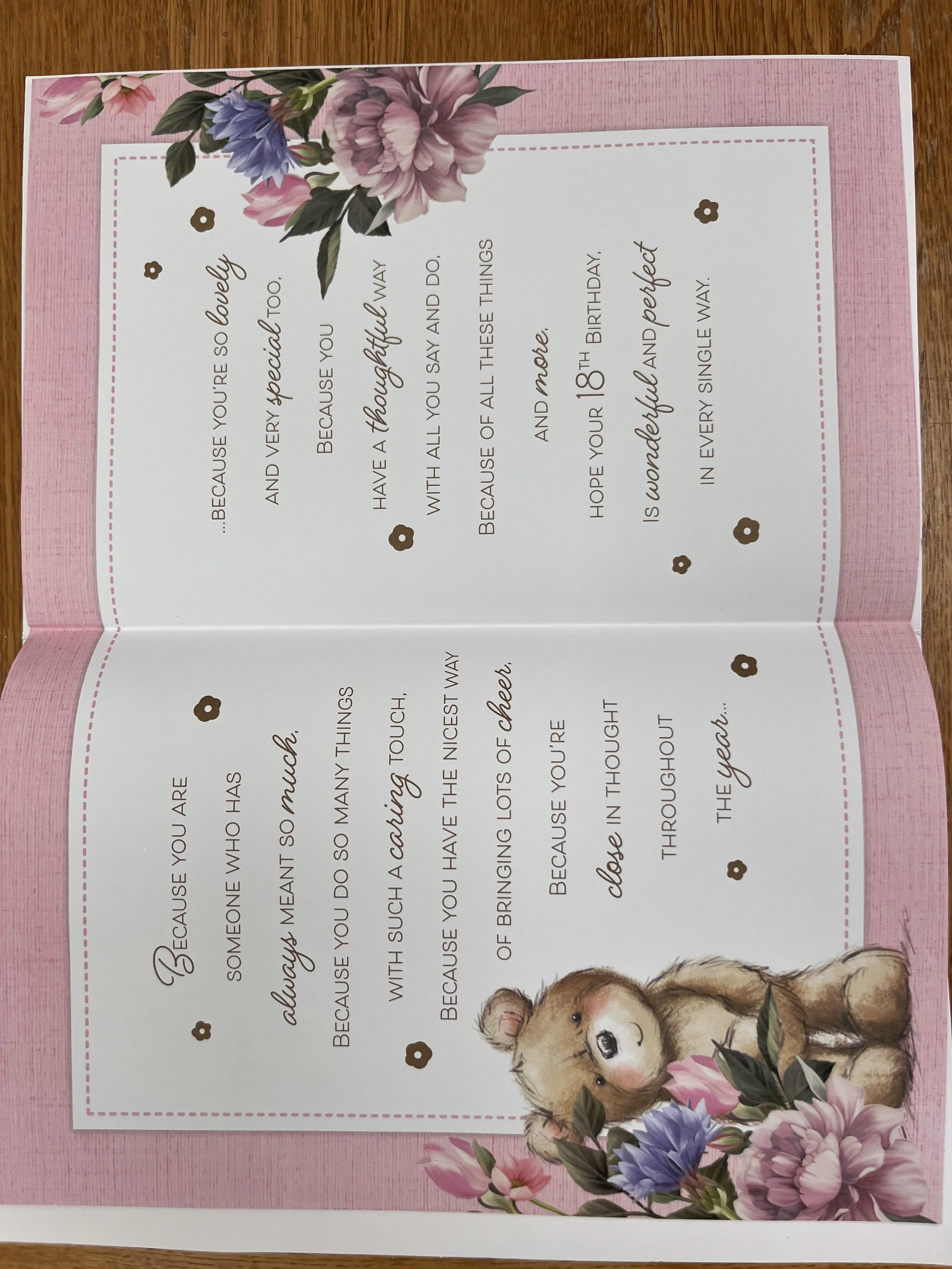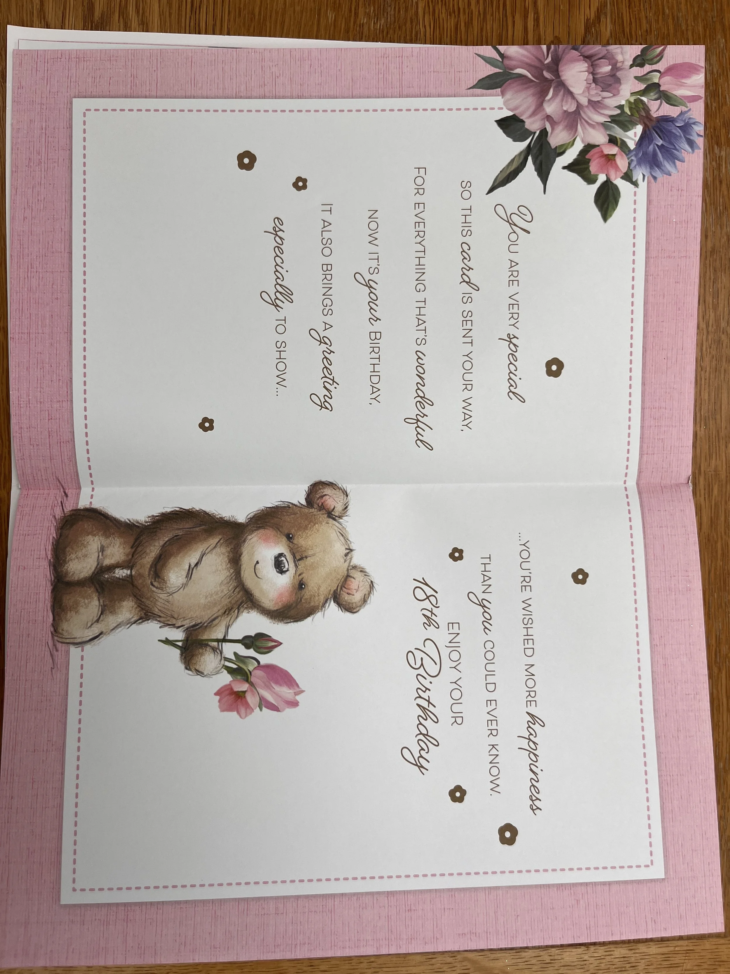 Girls 18th Birthday Card design features a shaped sparkly 3D attachment, effective foil, embossing, shaped edges and inside a colour illustrated insert with verse