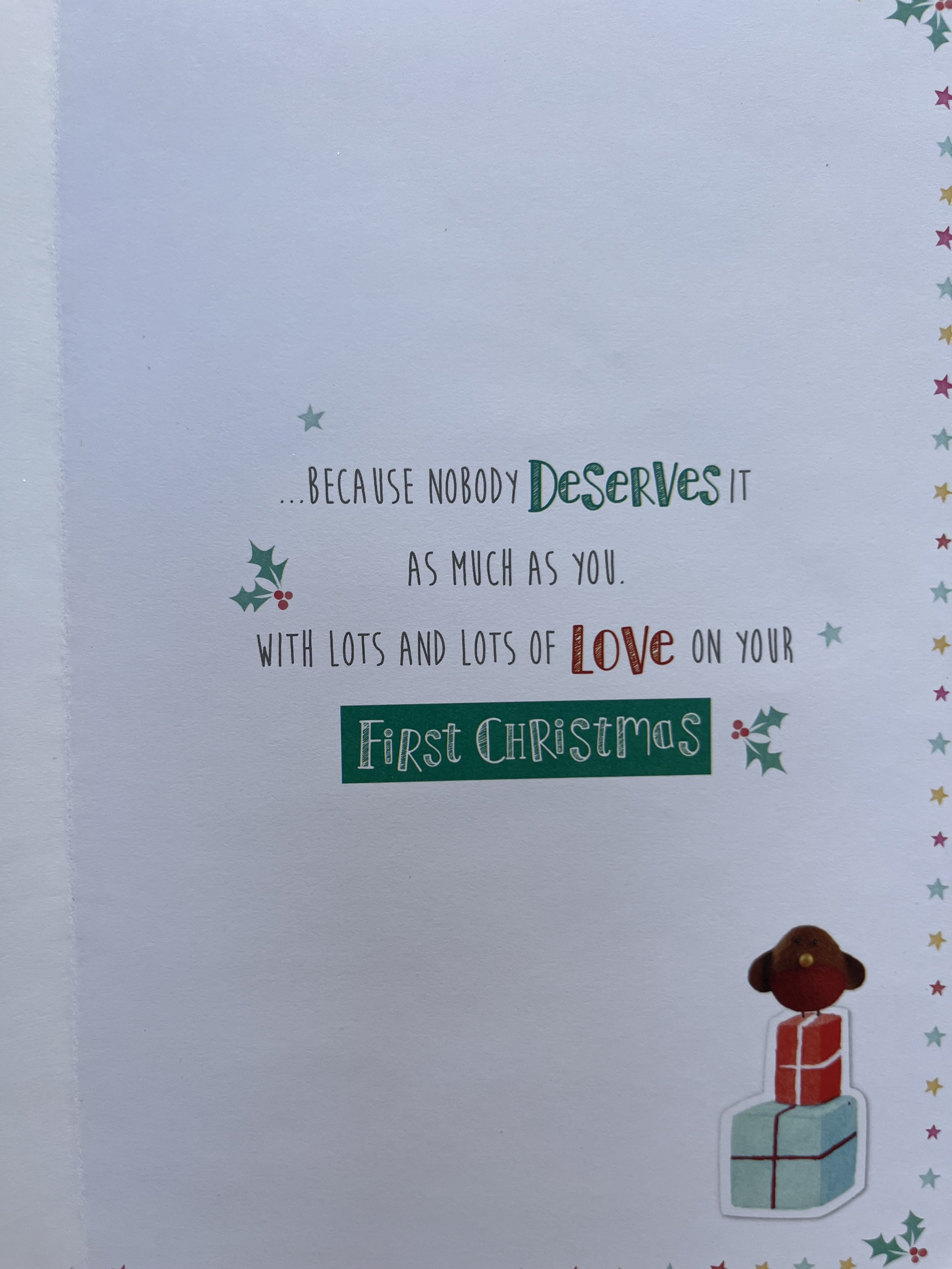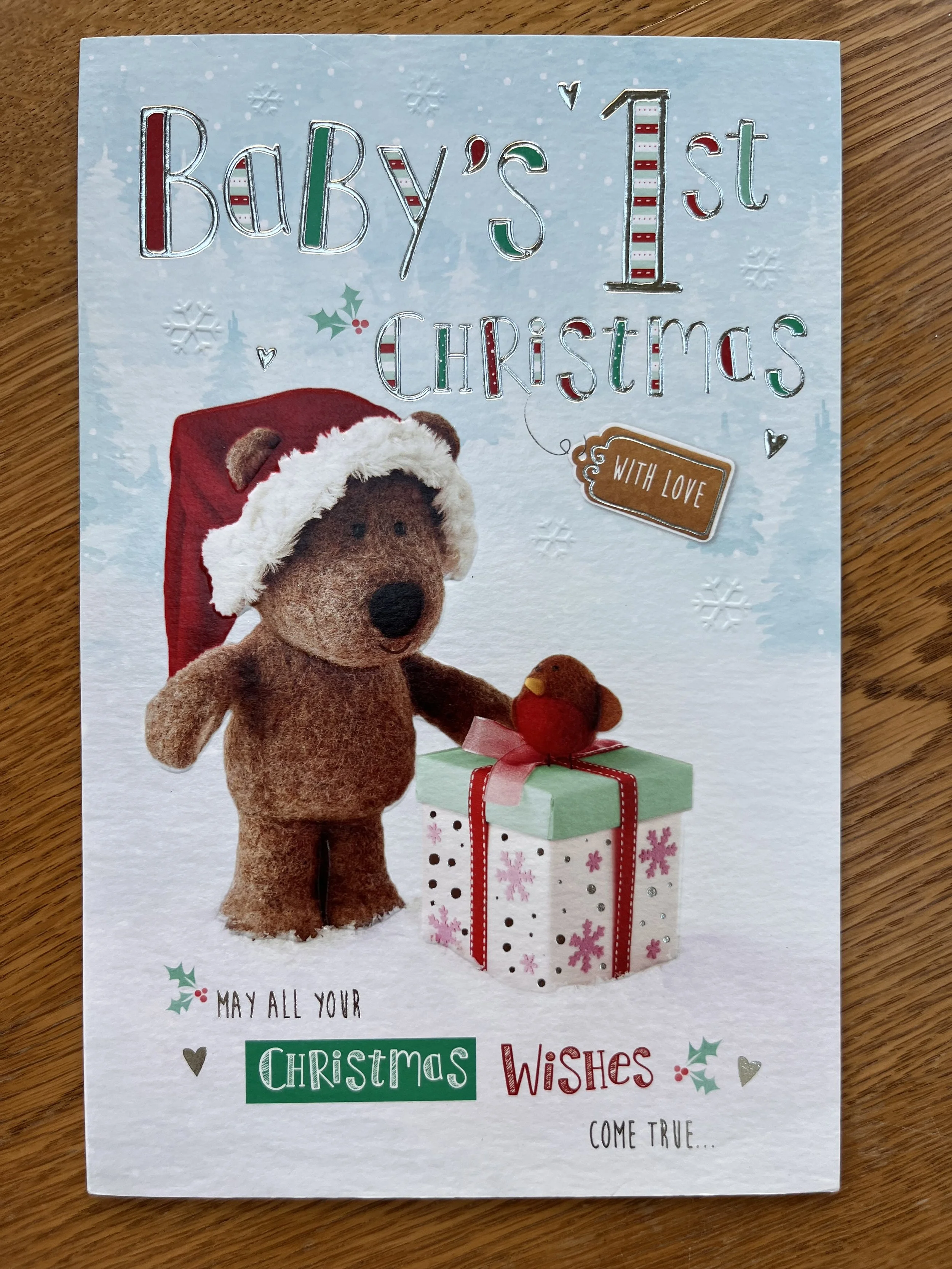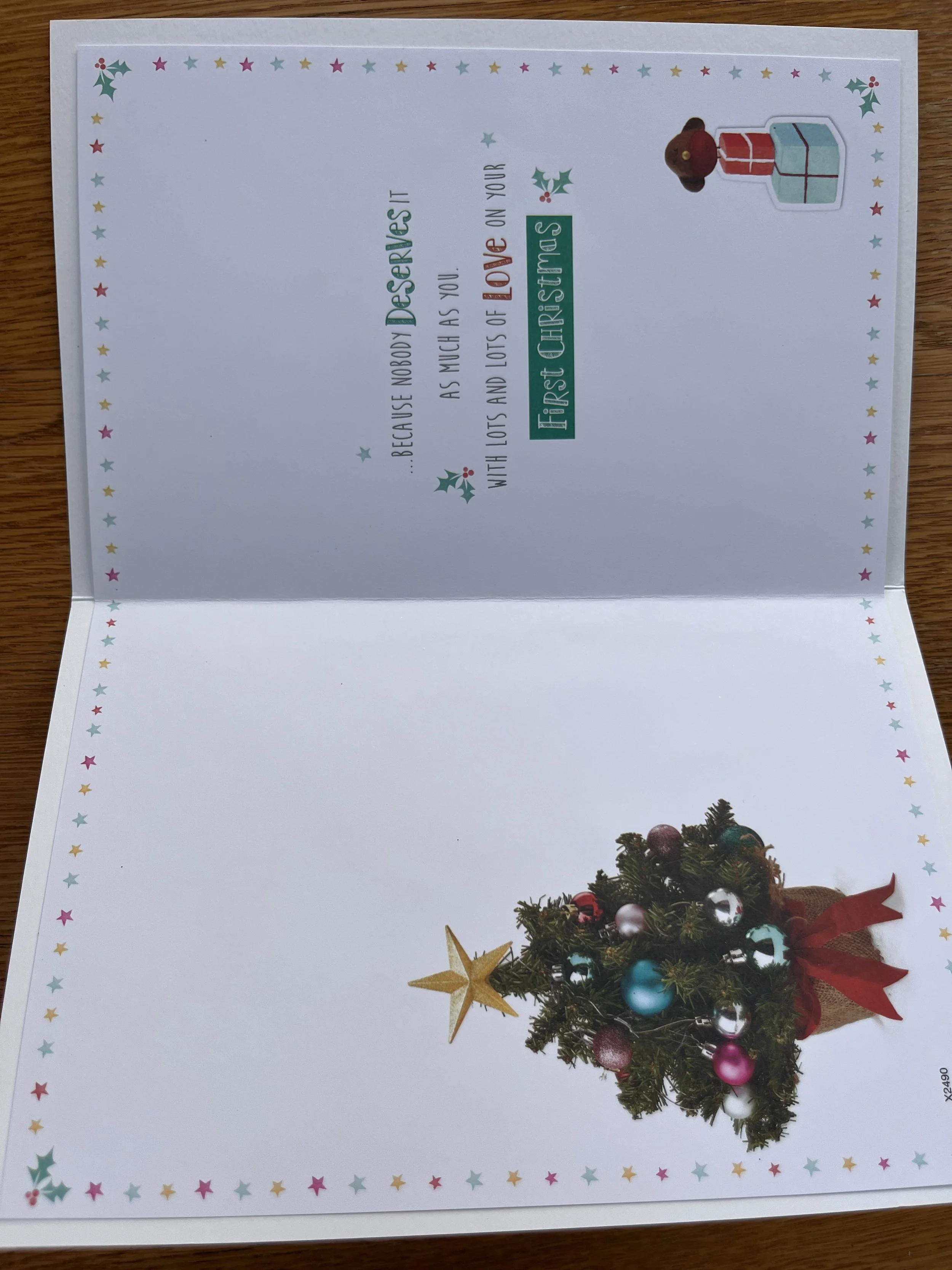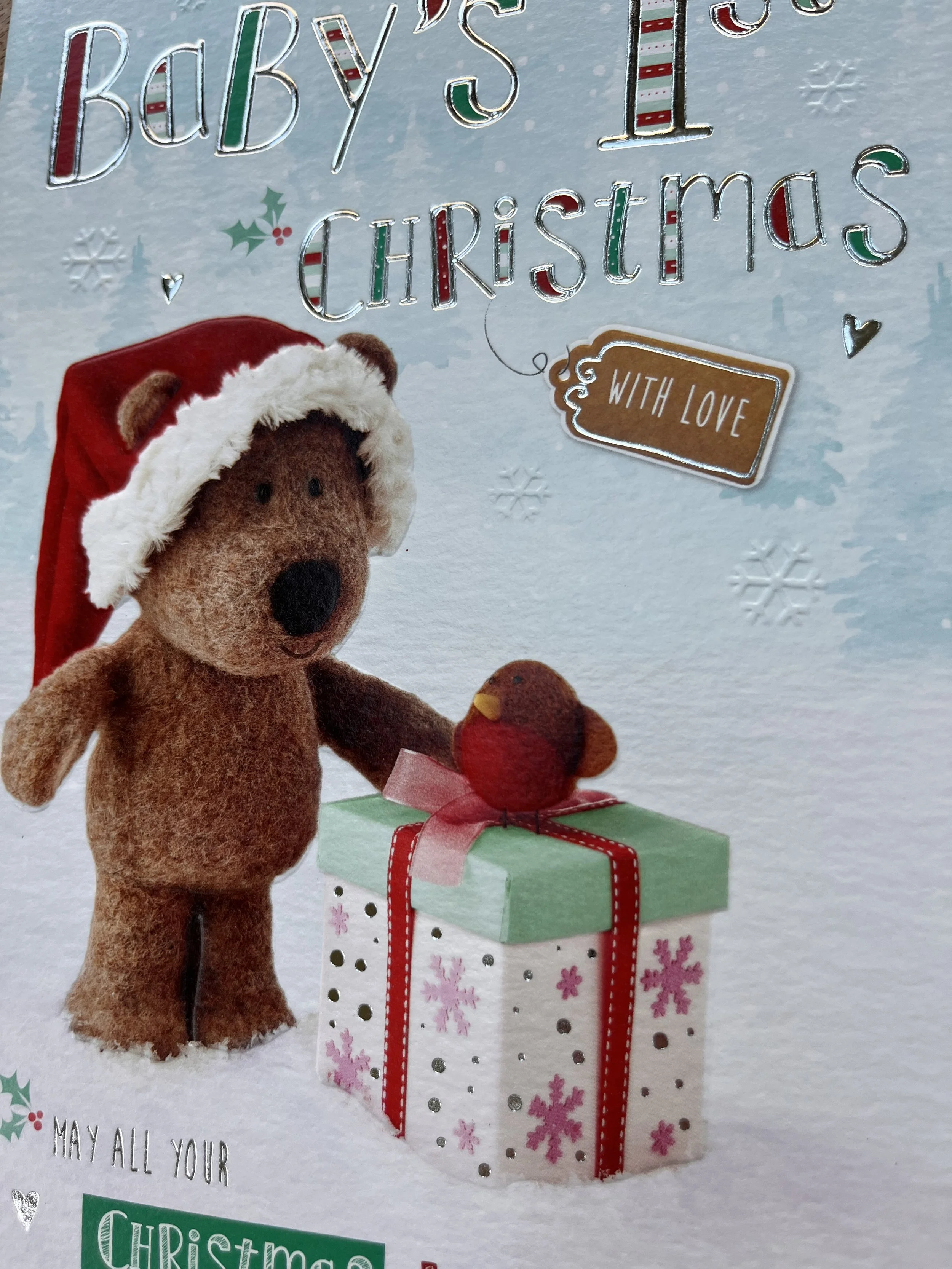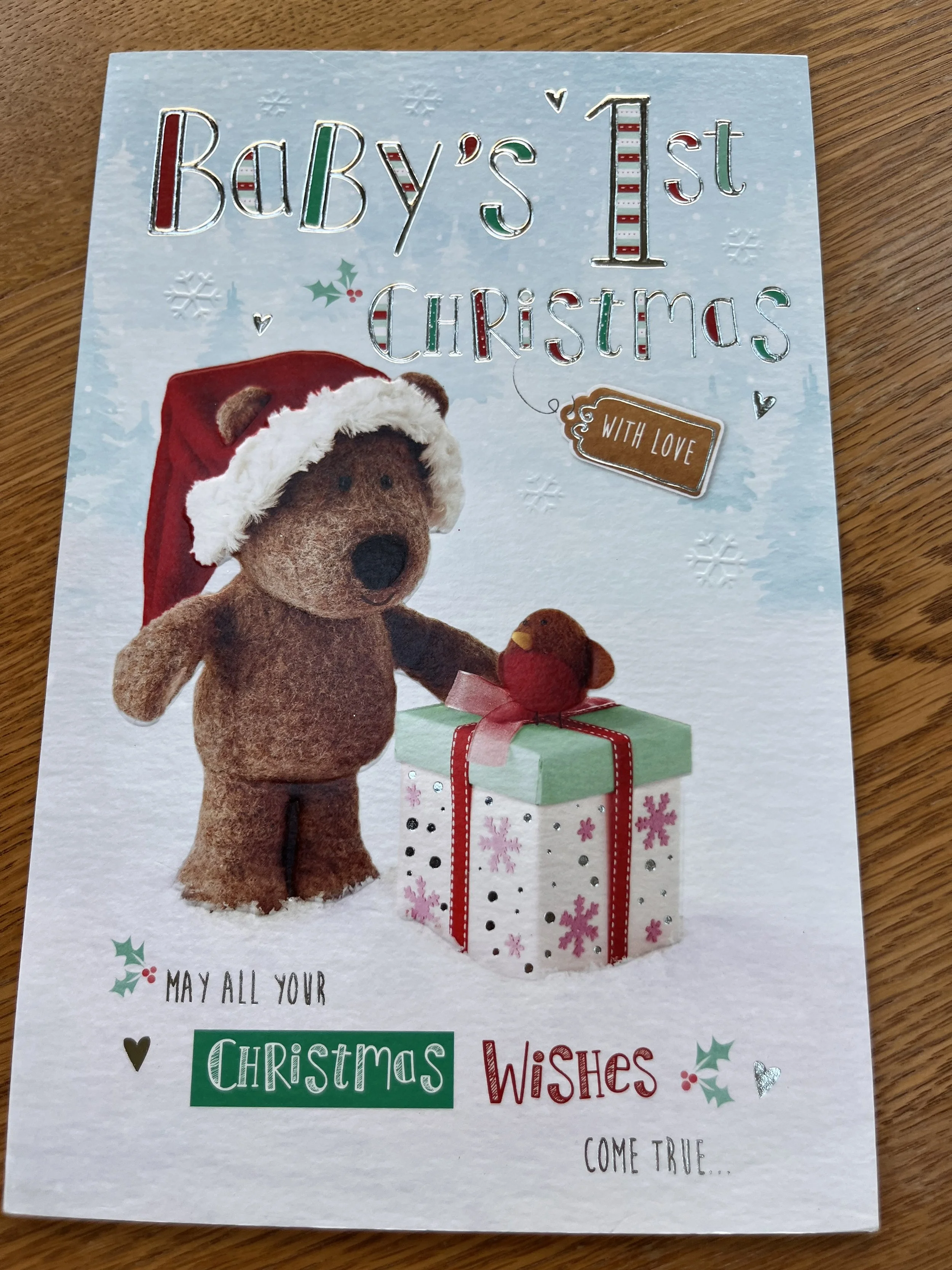 Special Baby’s 1st Christmas Card design features effective gold and red foiling, embossing, with heartfelt sentiment which continues inside on a full colour illustrated insert