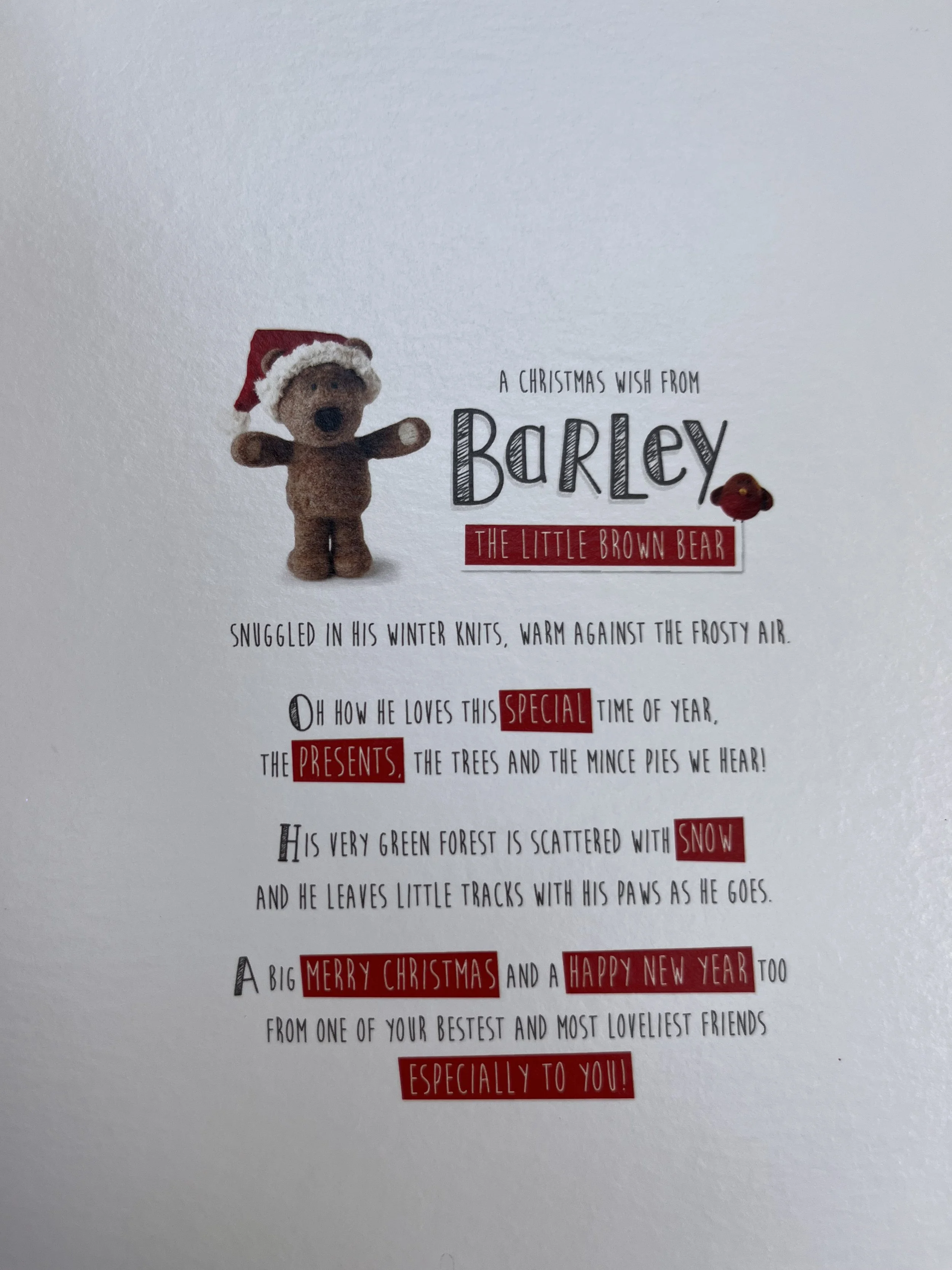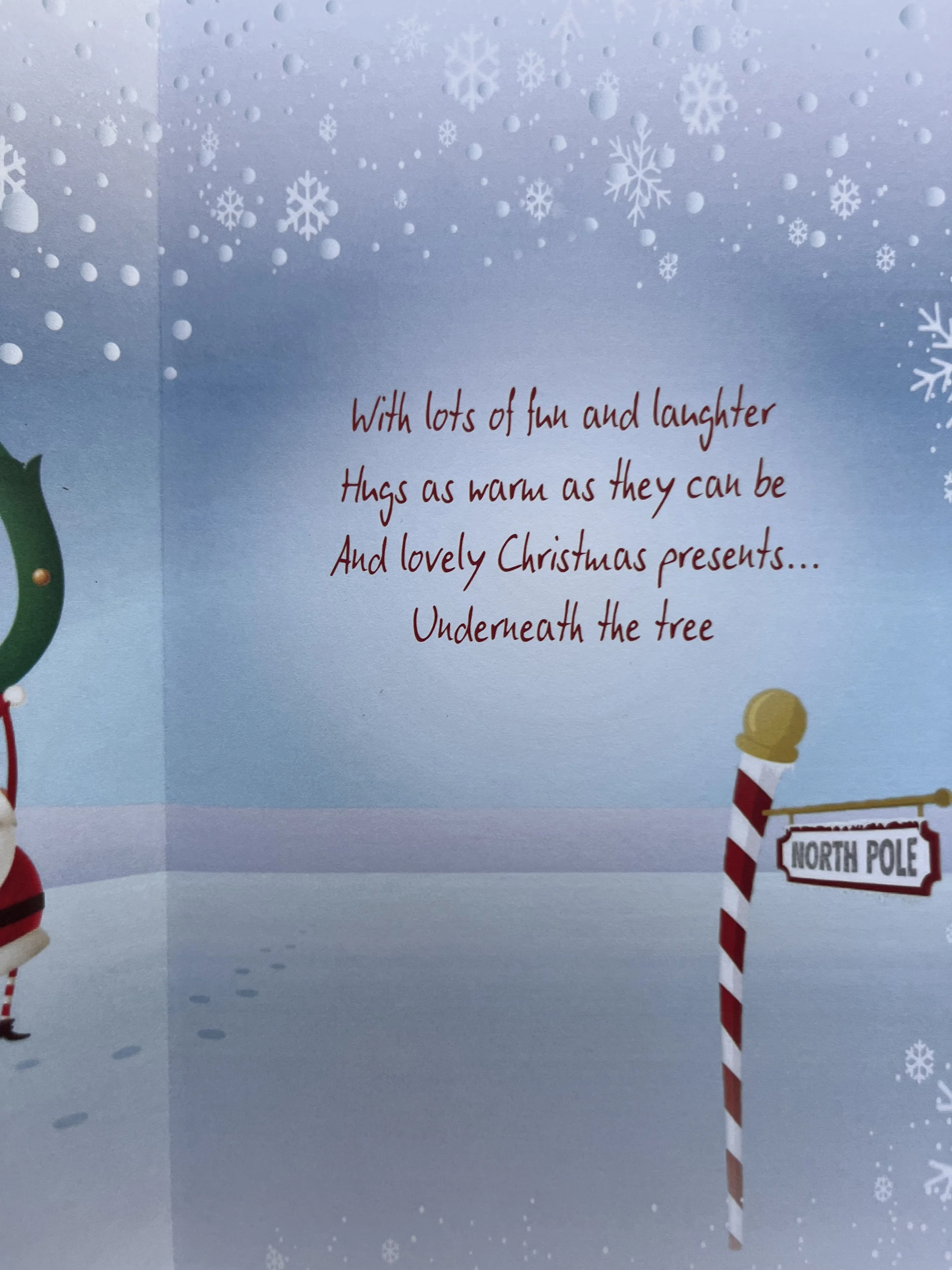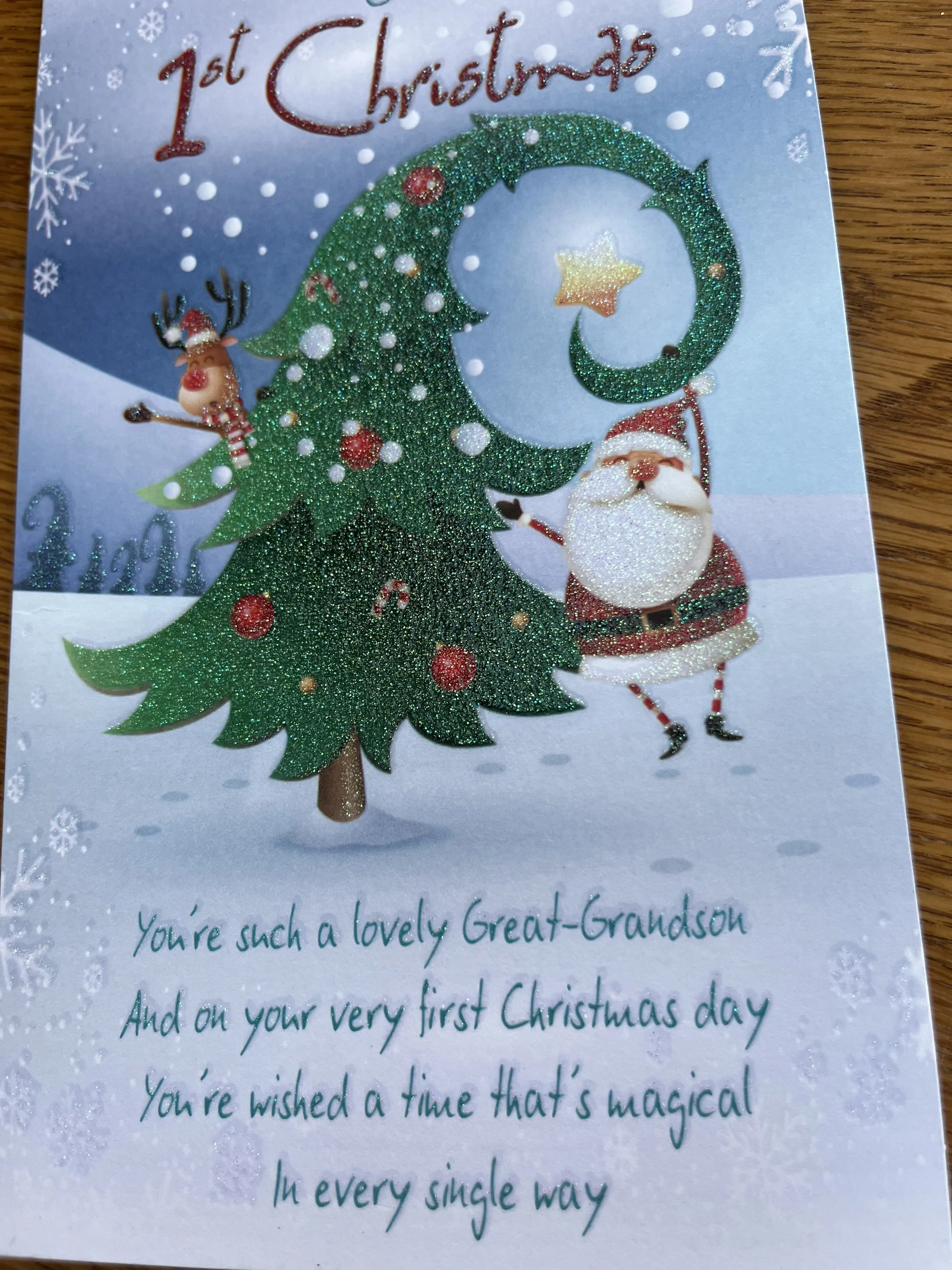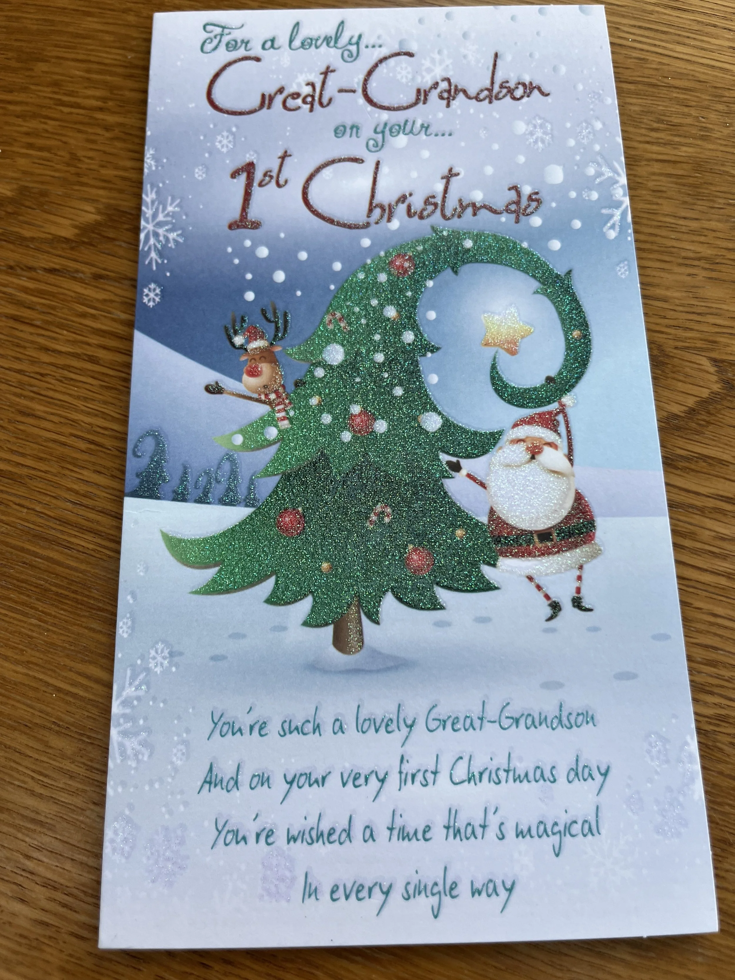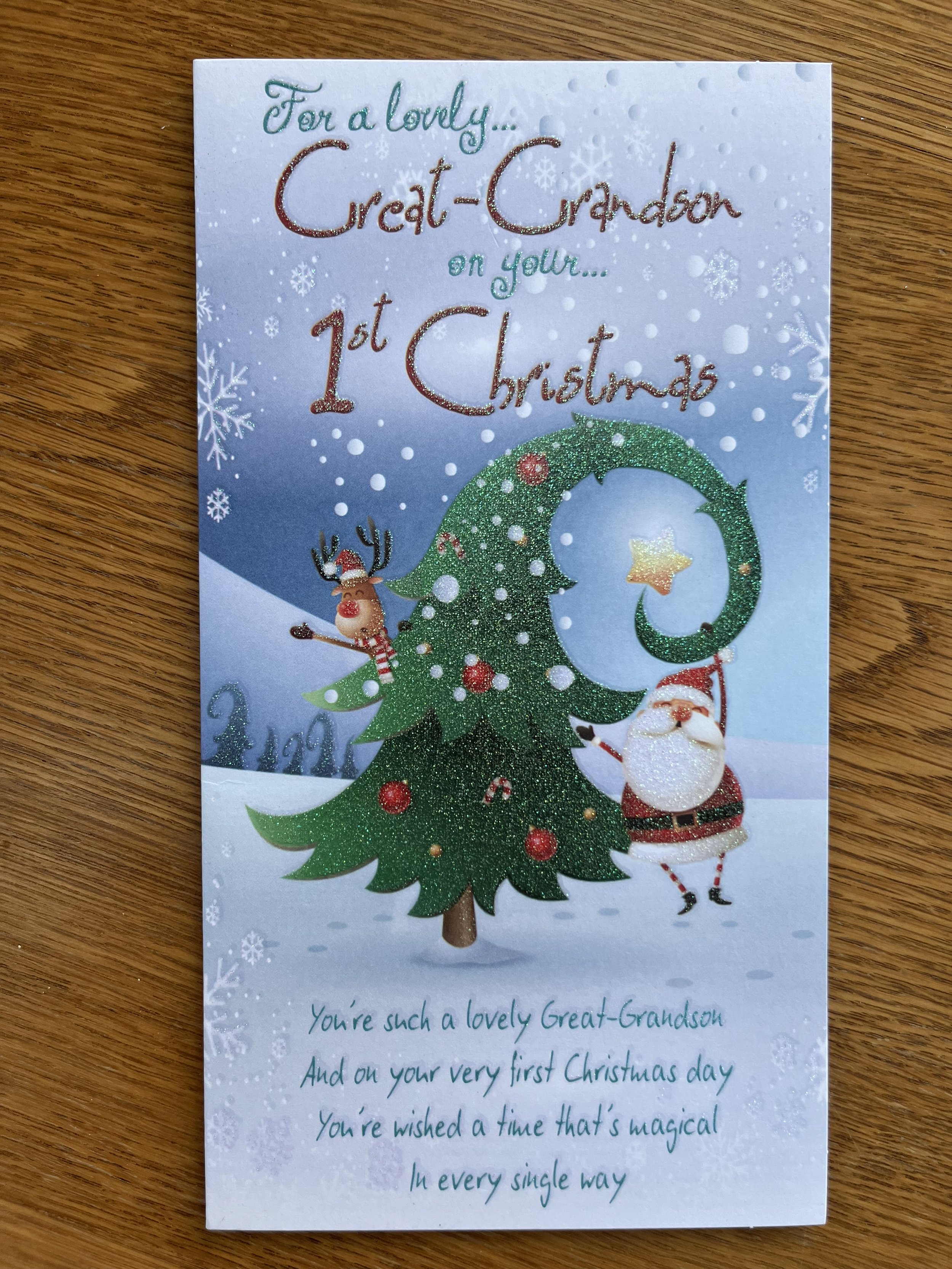 Special Baby’s 1st Christmas Card design features effective gold and red foiling, embossing, with heartfelt sentiment which continues inside on a full colour illustrated insert