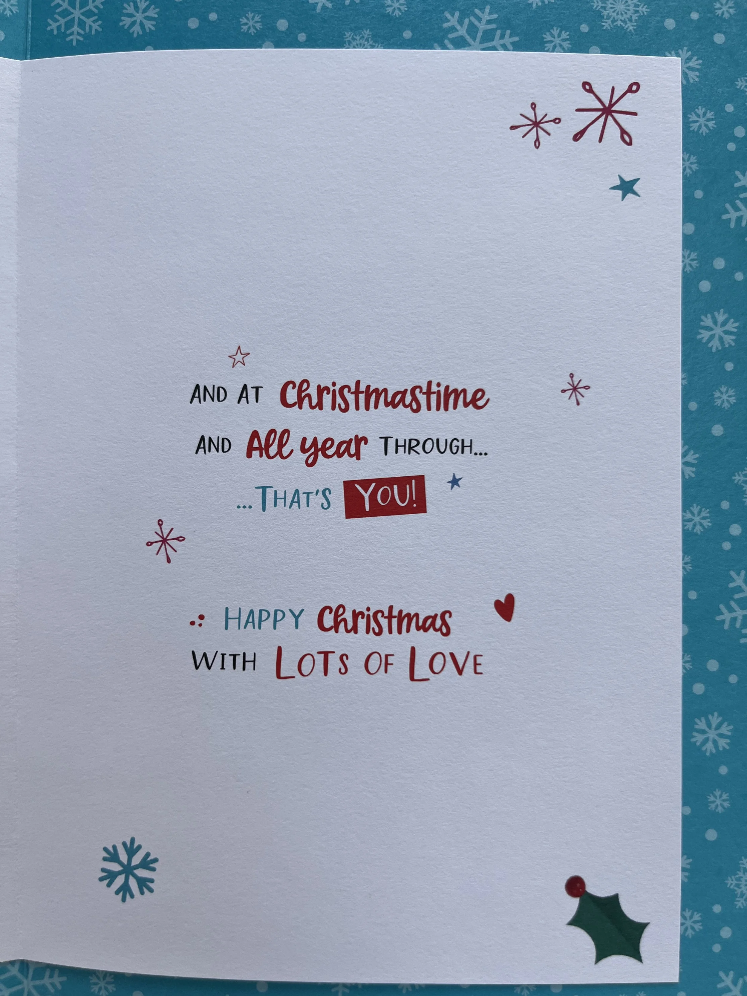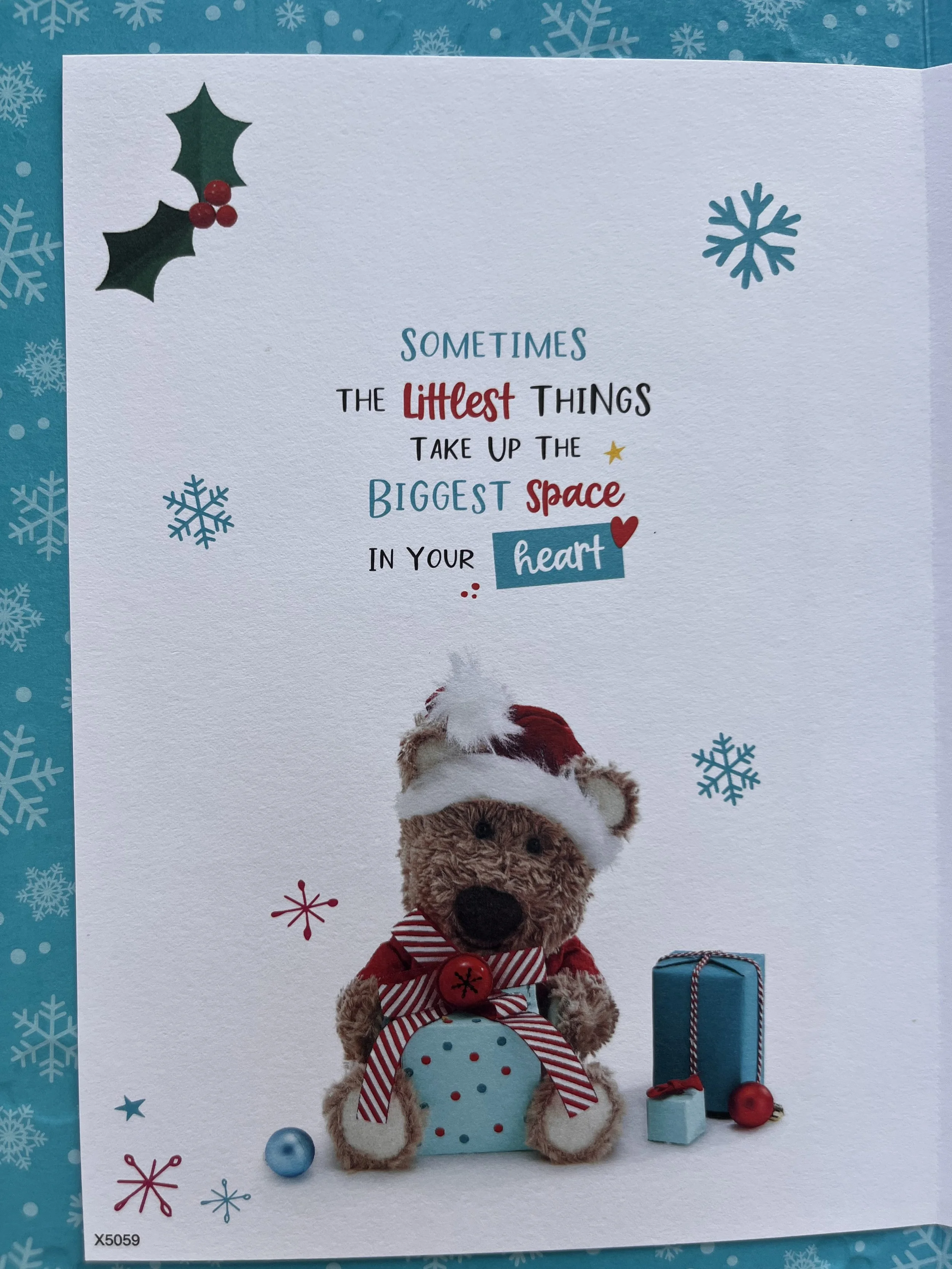 Great Grandson 1st Christmas card “Loving Words” design features encapsulated flitter with heartfelt sentiment that continues inside on a quality full colour illustrated insert