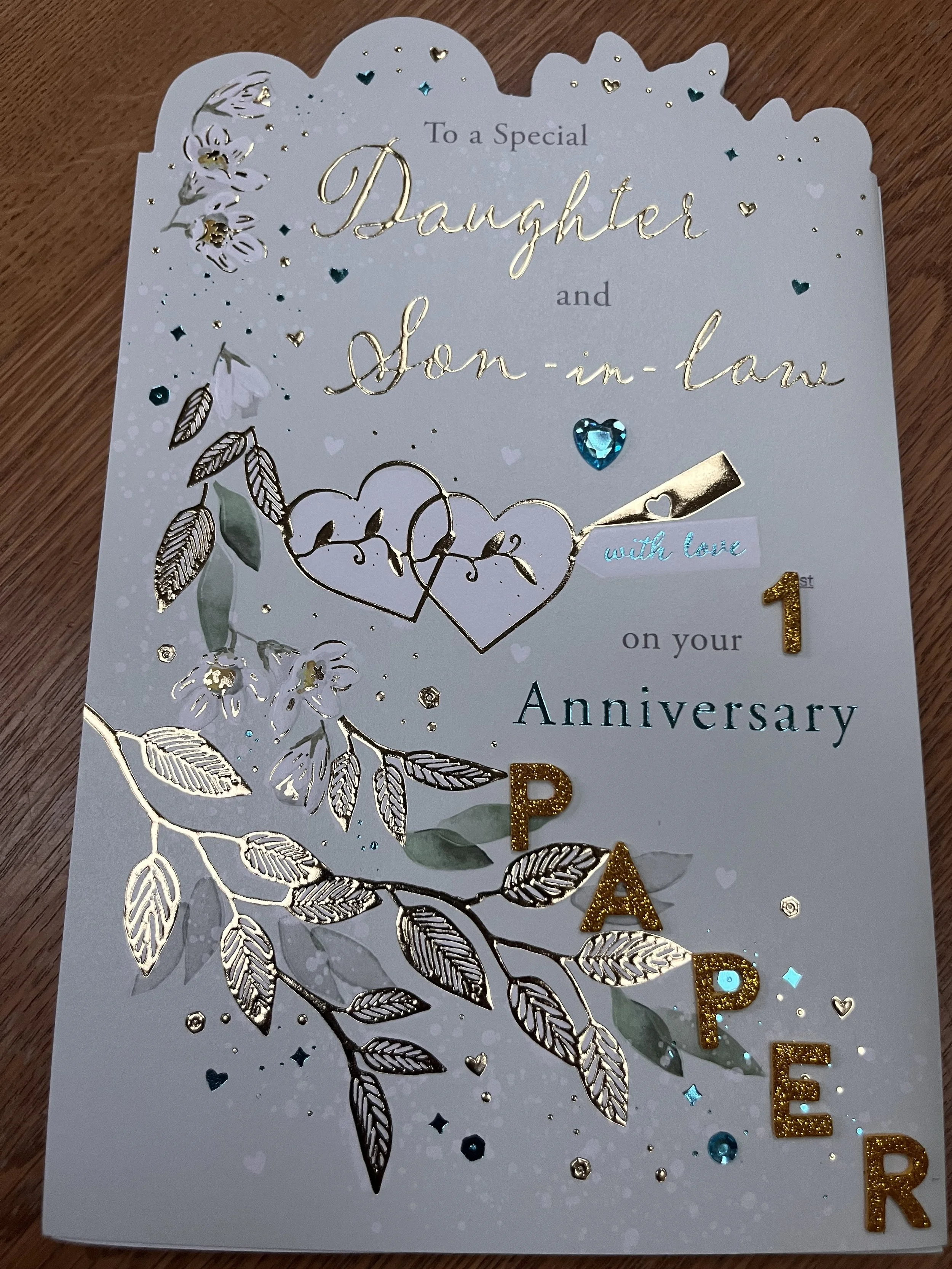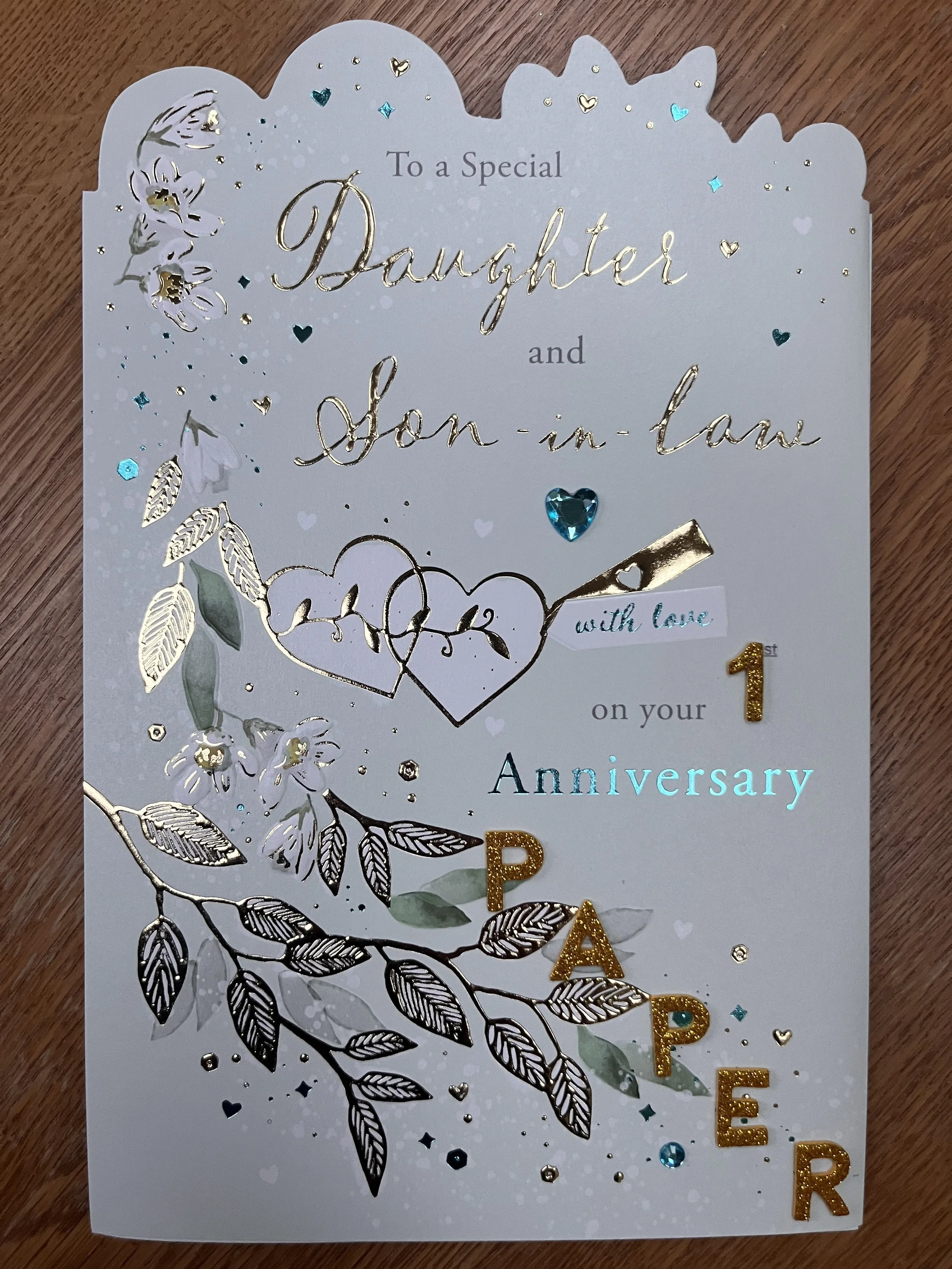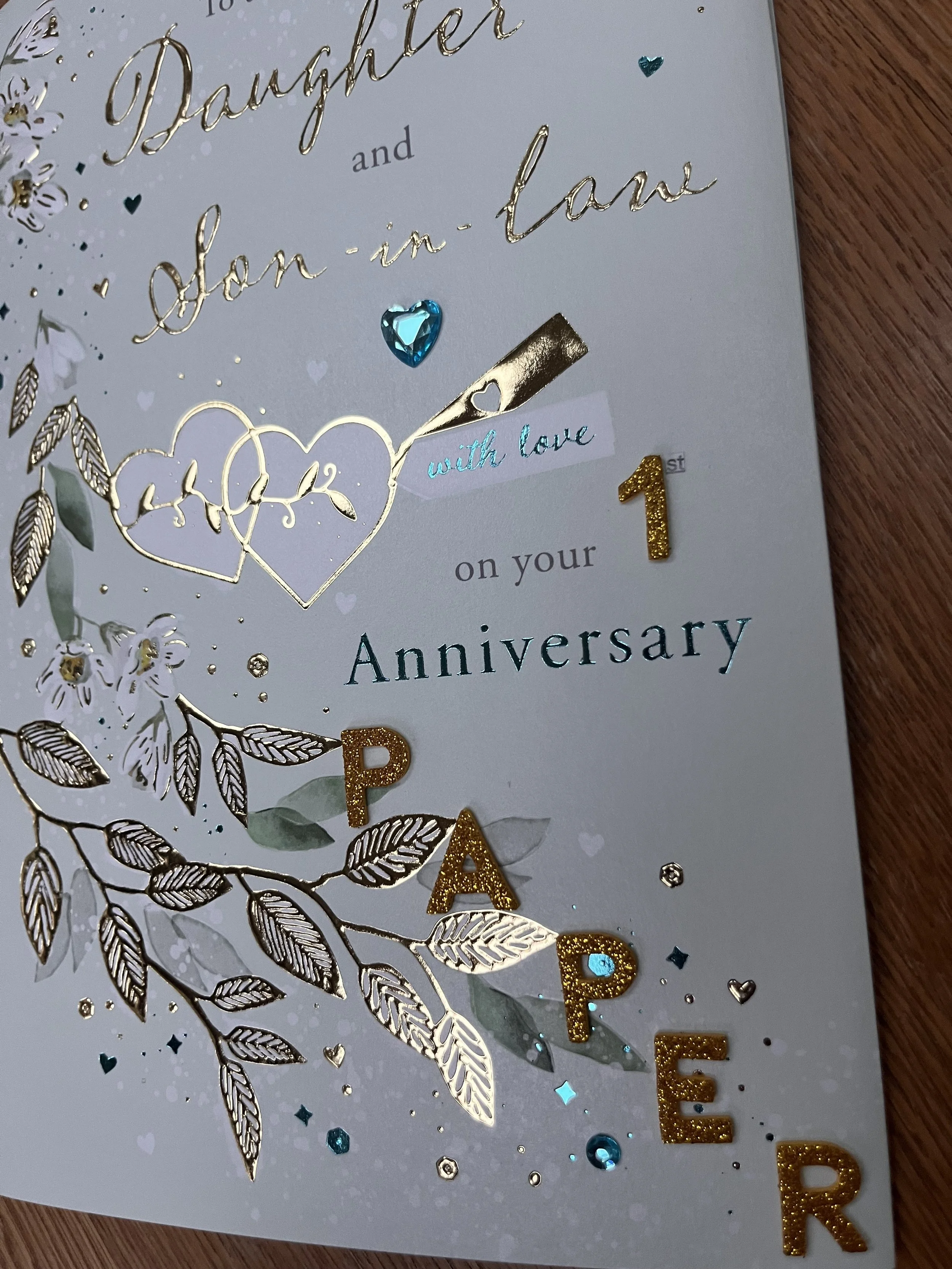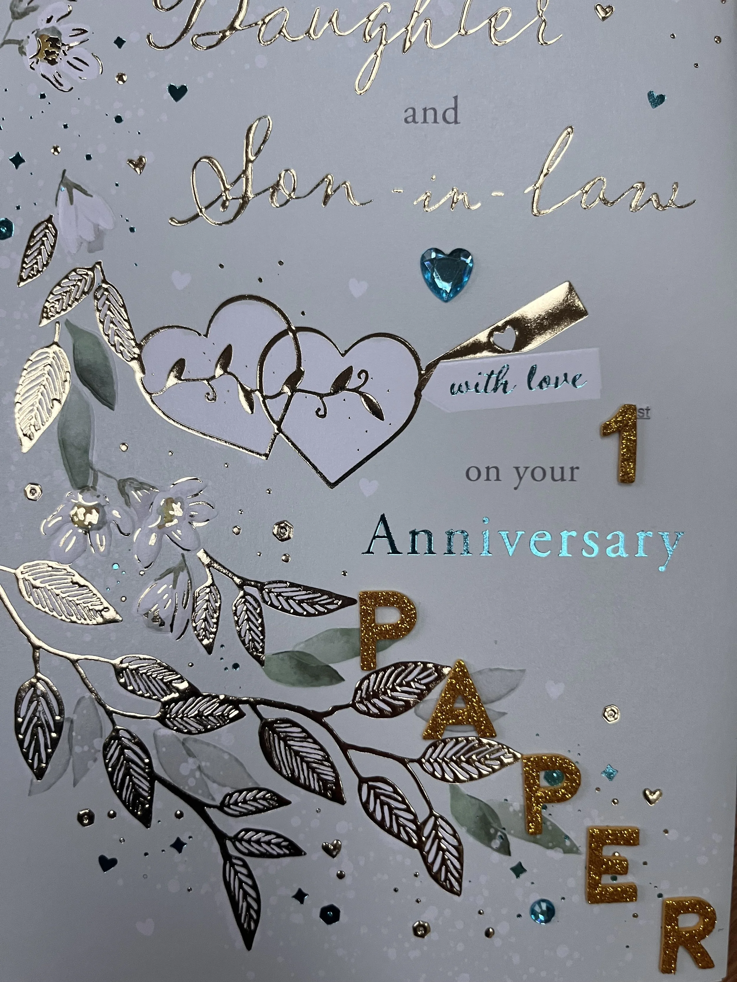 Daughter and Son in Law 1st Wedding Anniversary card is a Hand Finished design that features effective sparkly gold 3D attachments spelling “Paper” and “1st “ , delicate flitter and inside a full colour illustrated insert with heartfelt sentiment and foil attachment