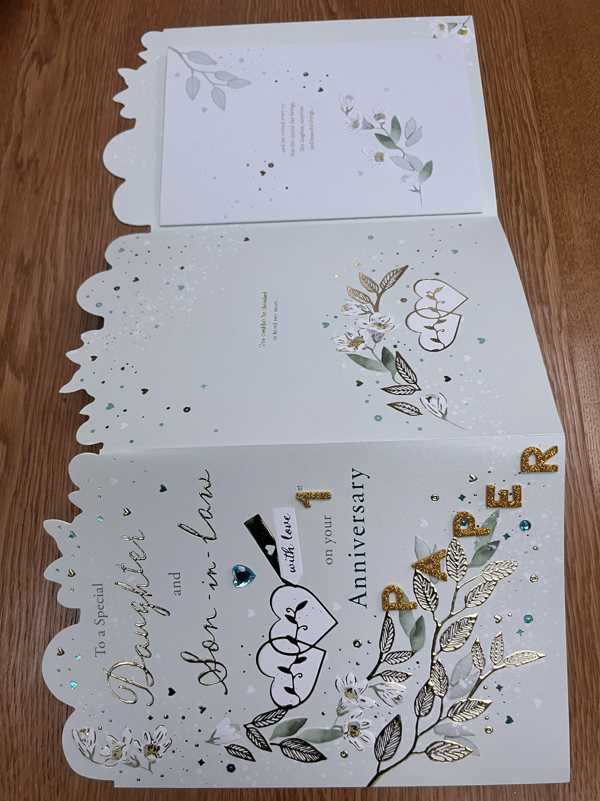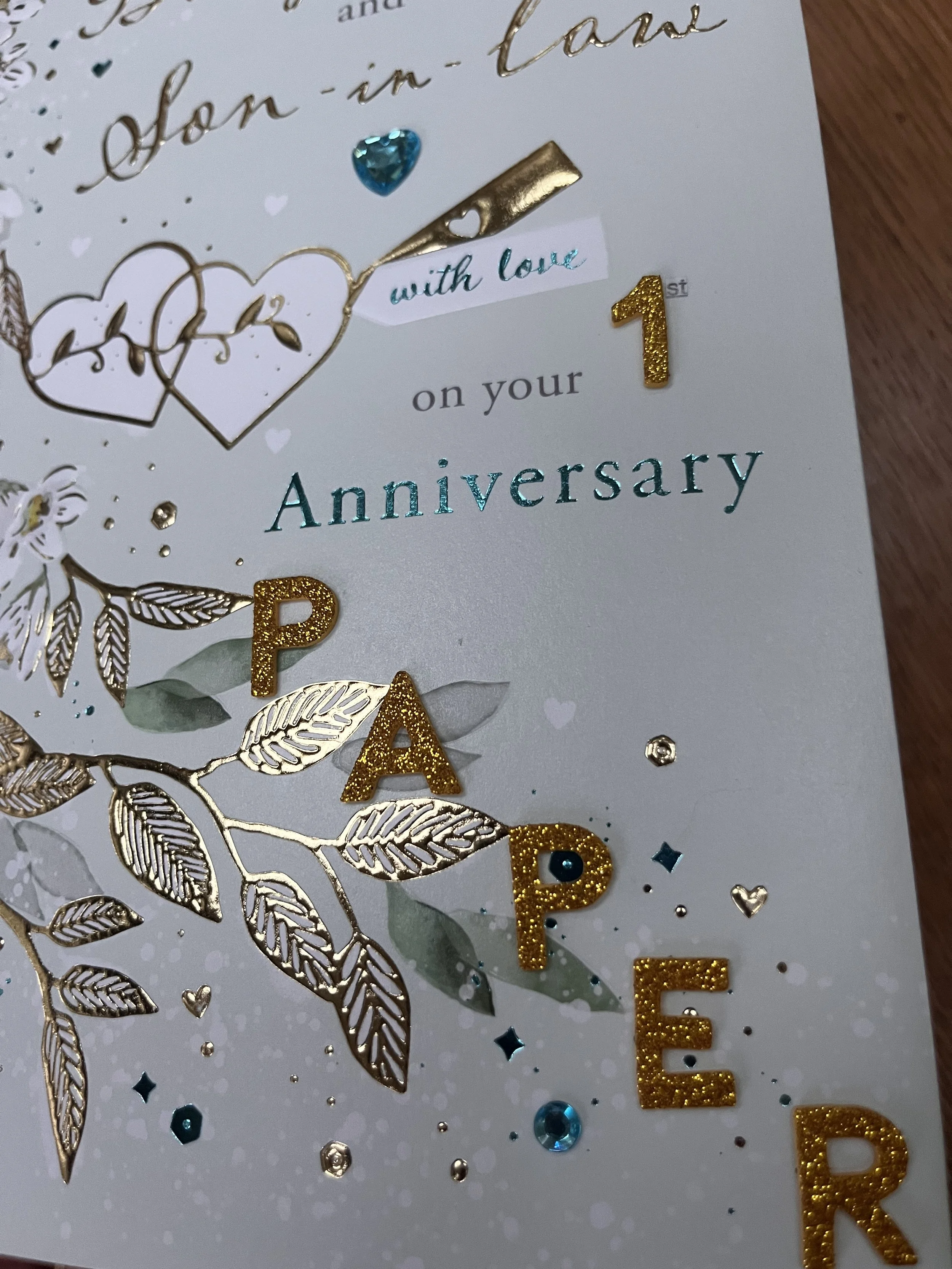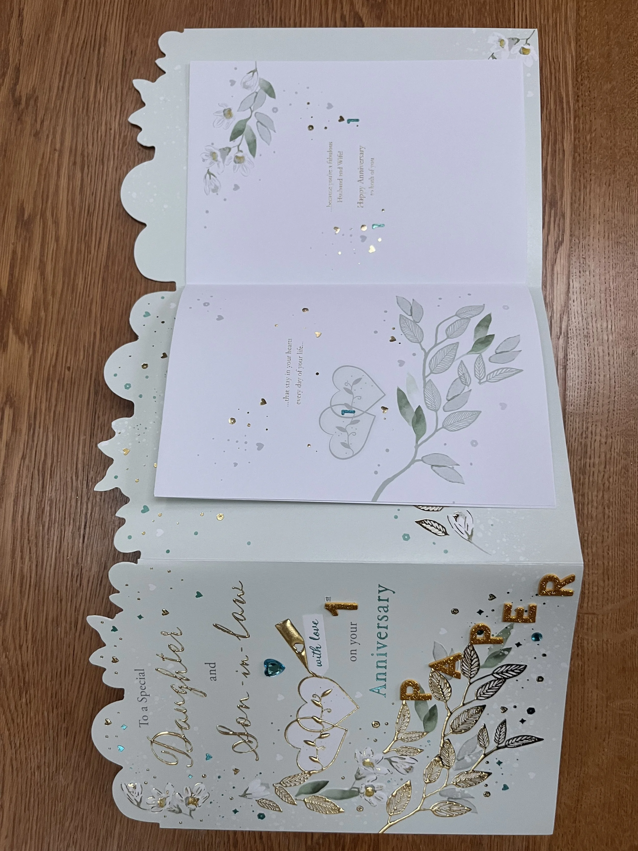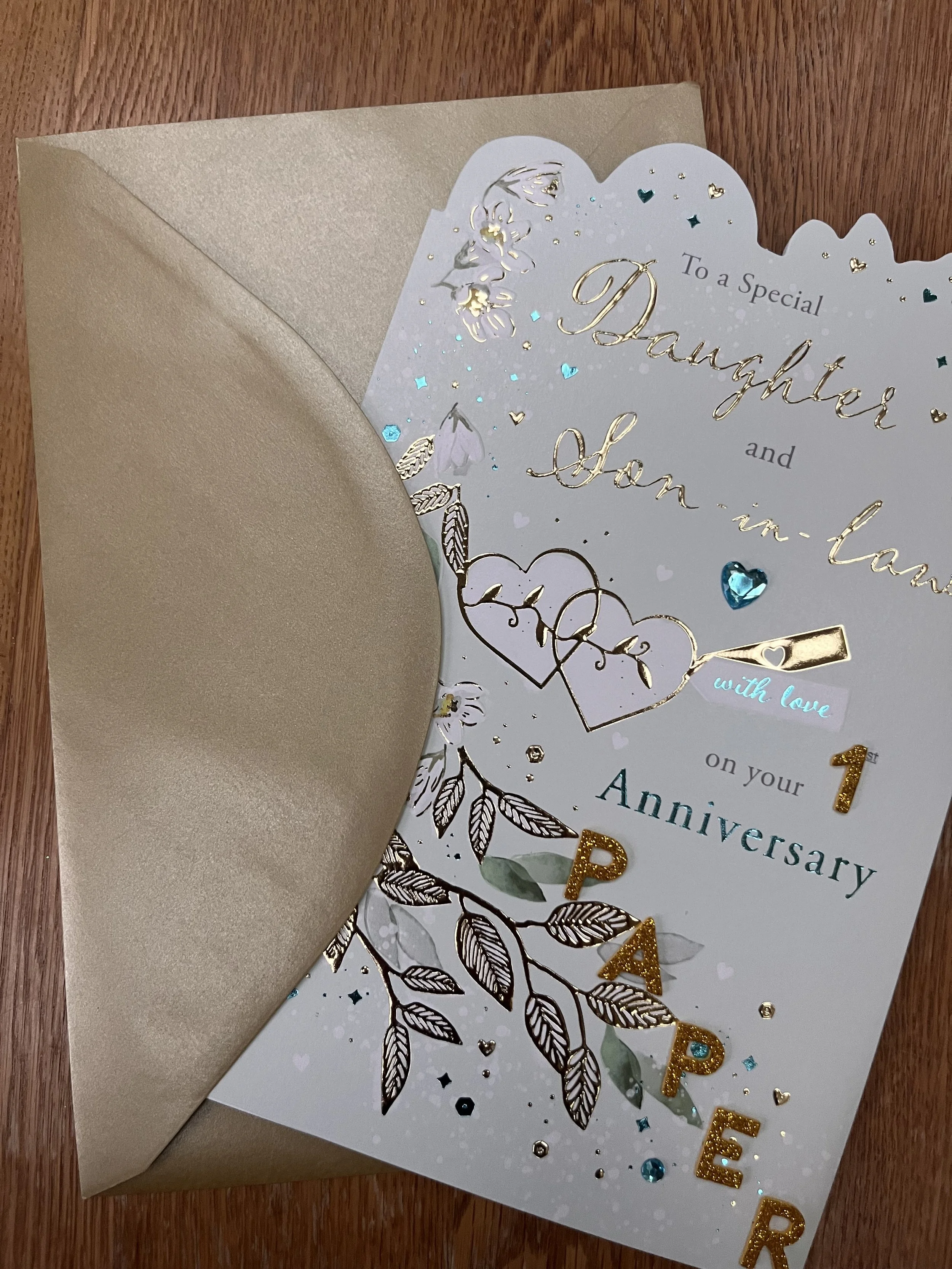 Daughter and Son in Law 1st Wedding Anniversary card is a Hand Finished design that features effective sparkly gold 3D attachments spelling “Paper” and “1st “ , delicate flitter and inside a full colour illustrated insert with heartfelt sentiment and foil attachment