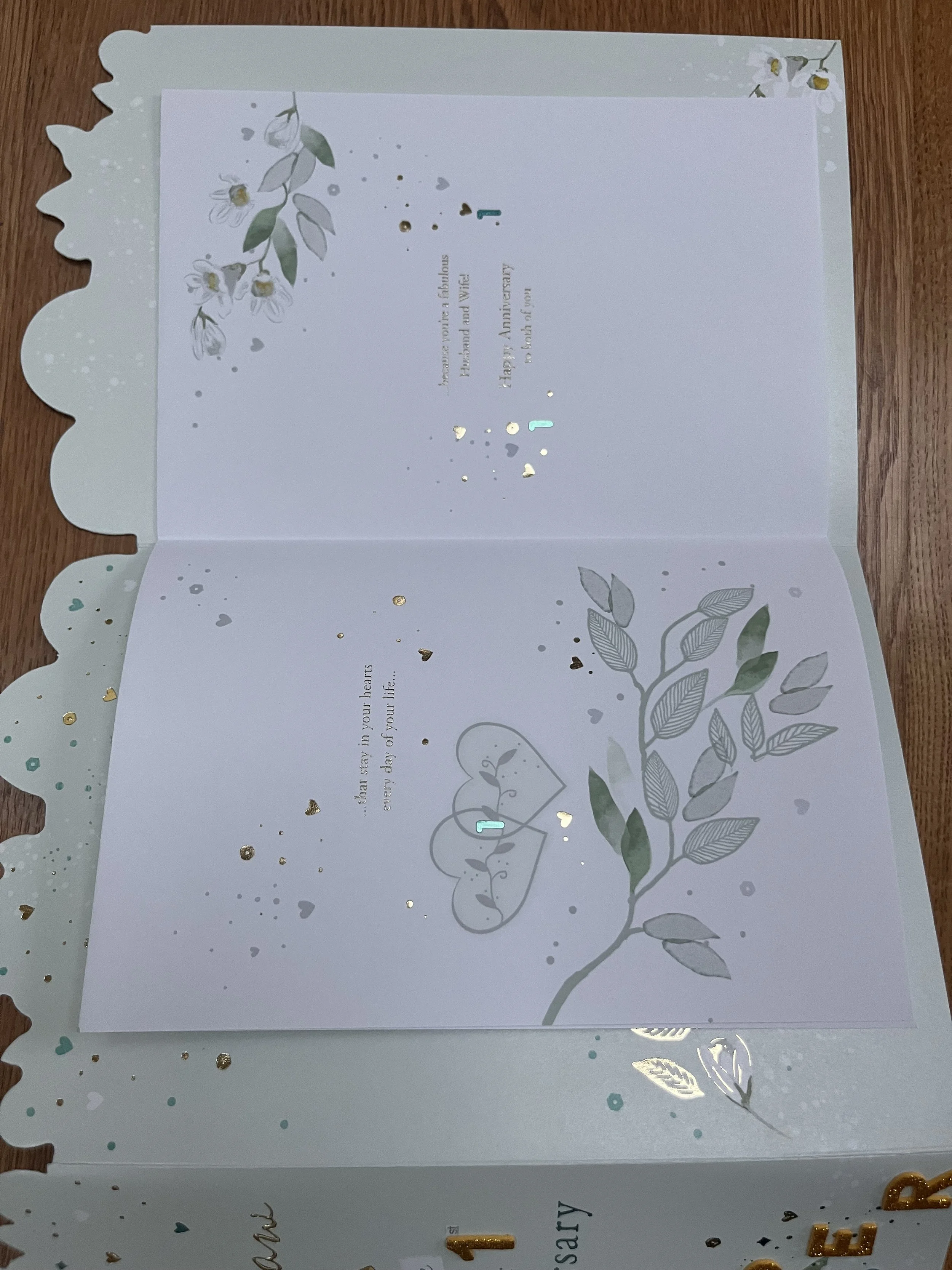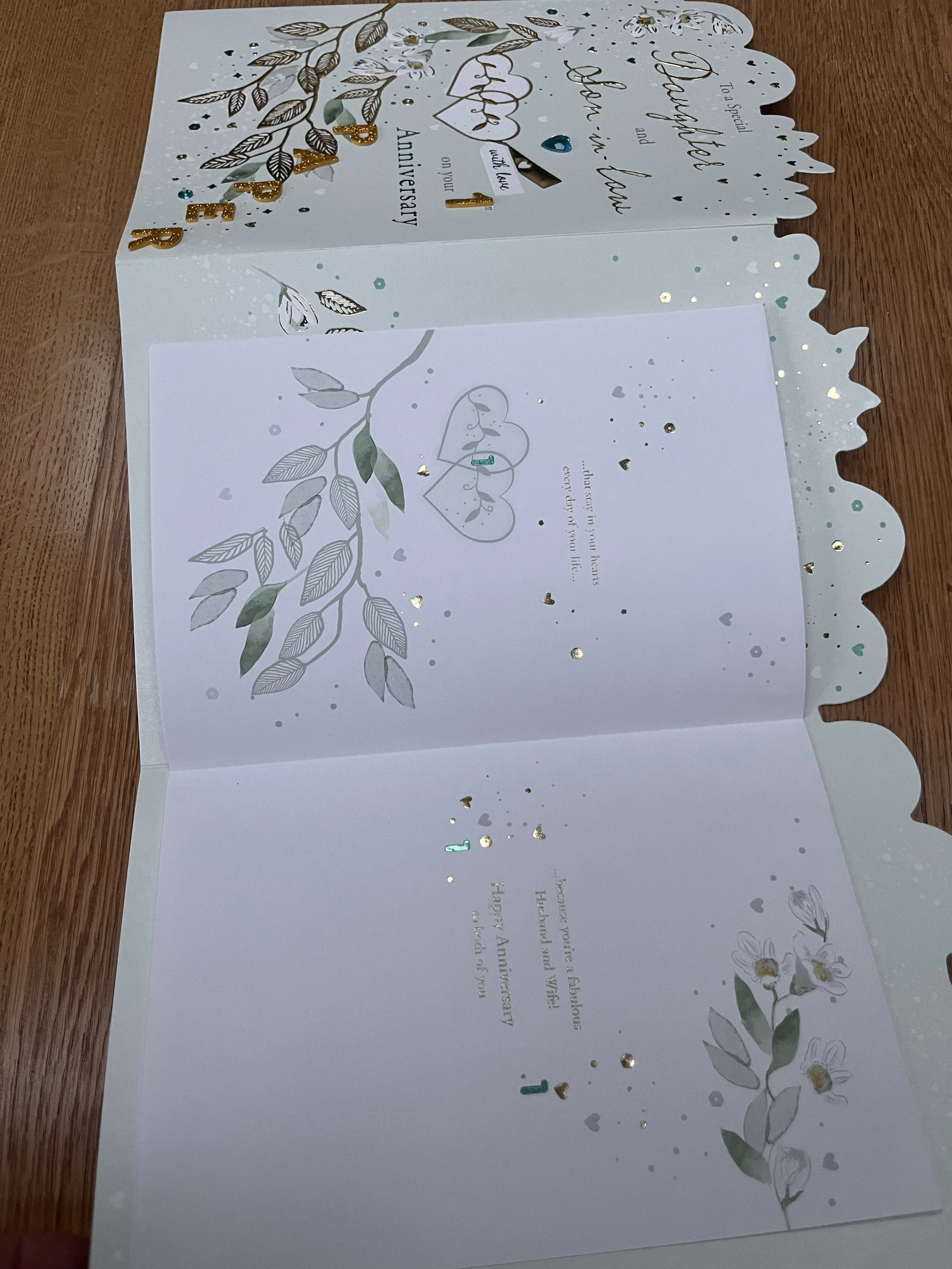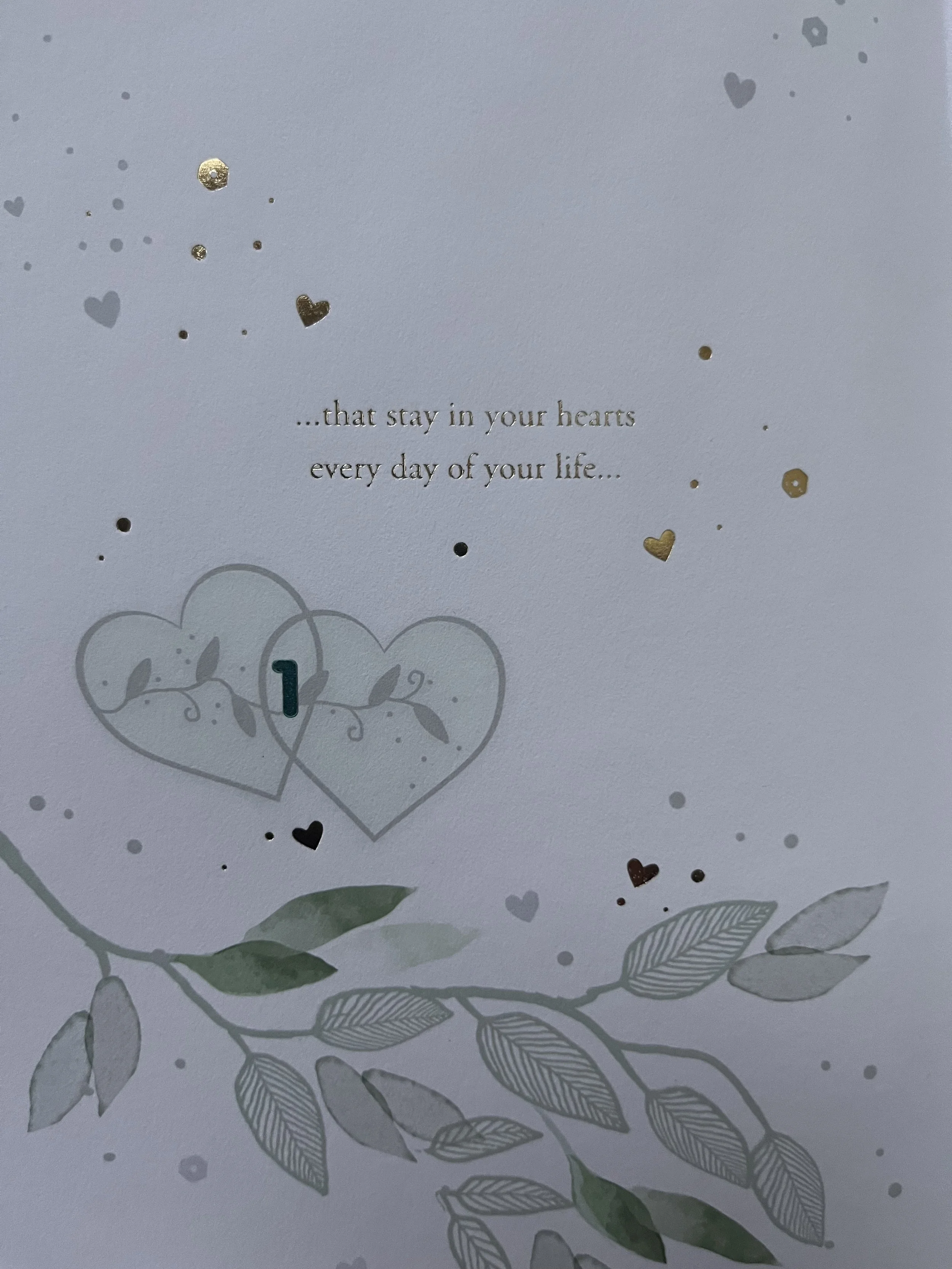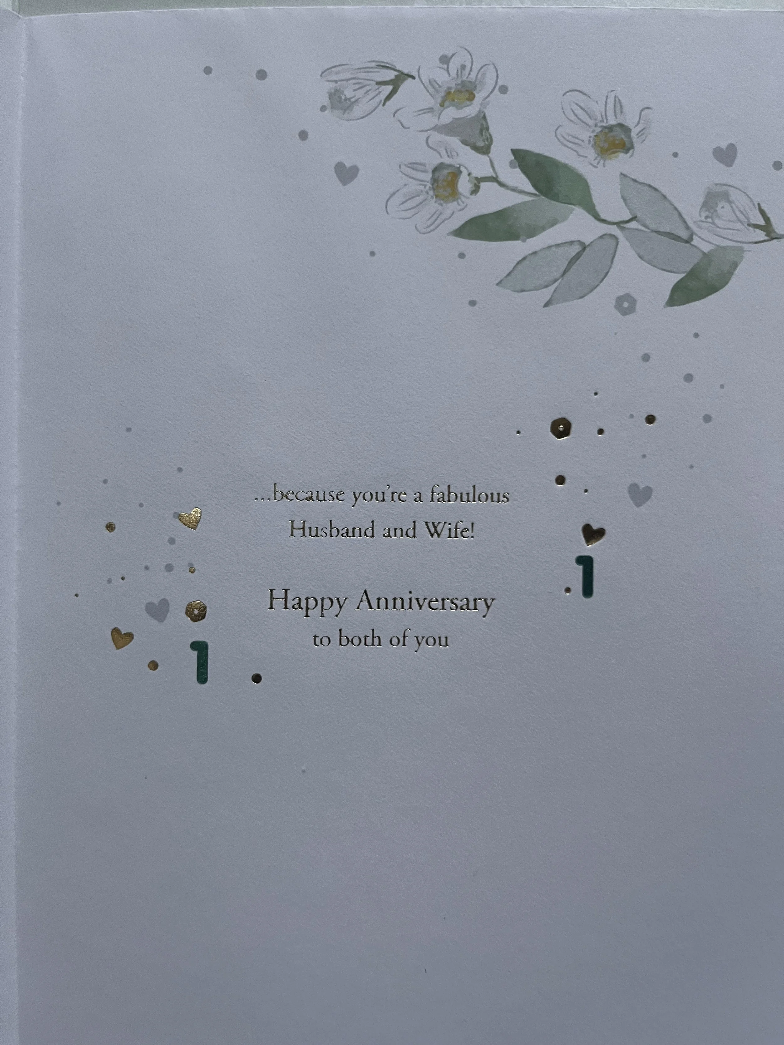 Daughter and Son in Law 1st Wedding Anniversary card is a Hand Finished design that features effective sparkly gold 3D attachments spelling “Paper” and “1st “ , delicate flitter and inside a full colour illustrated insert with heartfelt sentiment and foil attachment