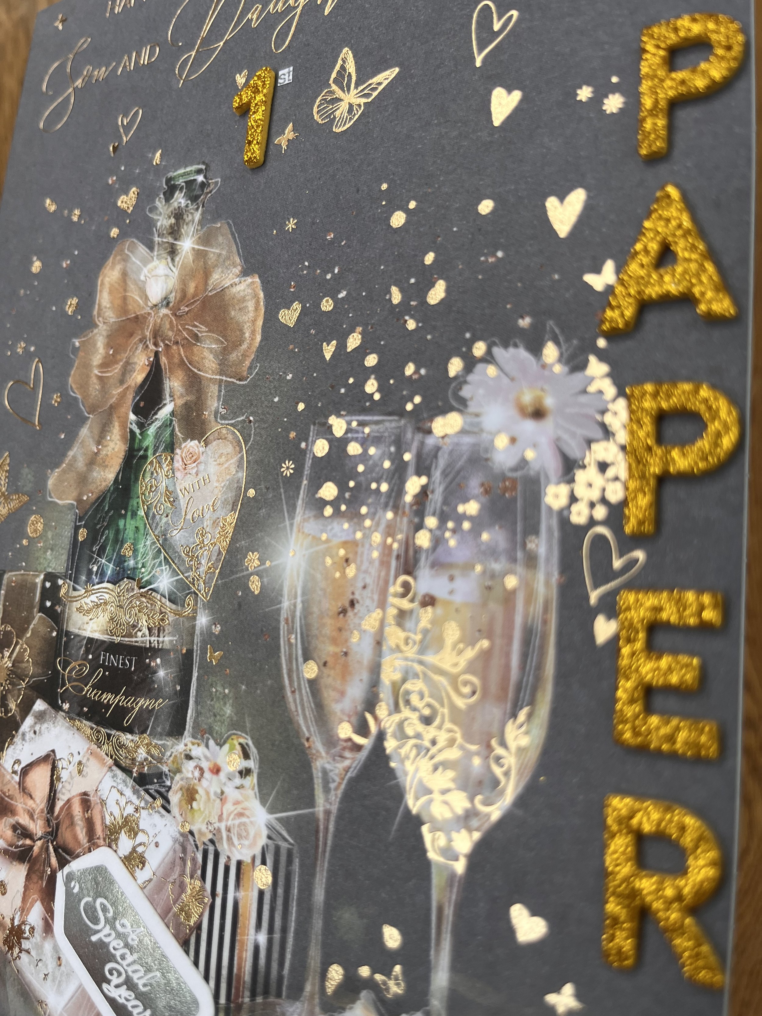 Son and Daughter-in-Law Paper Wedding anniversary card is a lovely HAND FINISHED design which has 3d sparkly embellishments, effective gold foiled and inside a colour illustrated insert with heartfelt Words and attachment - please see all photos 😍