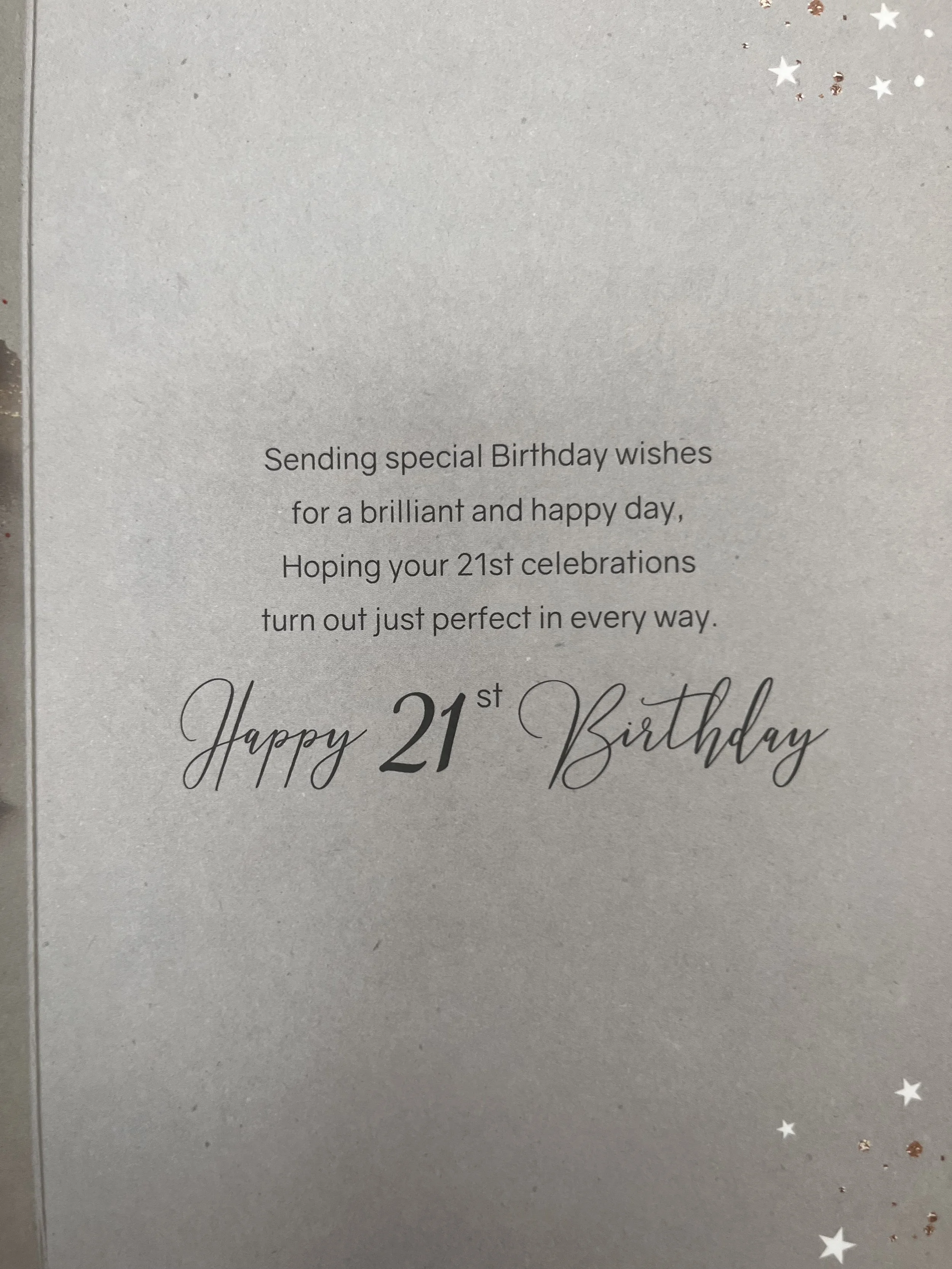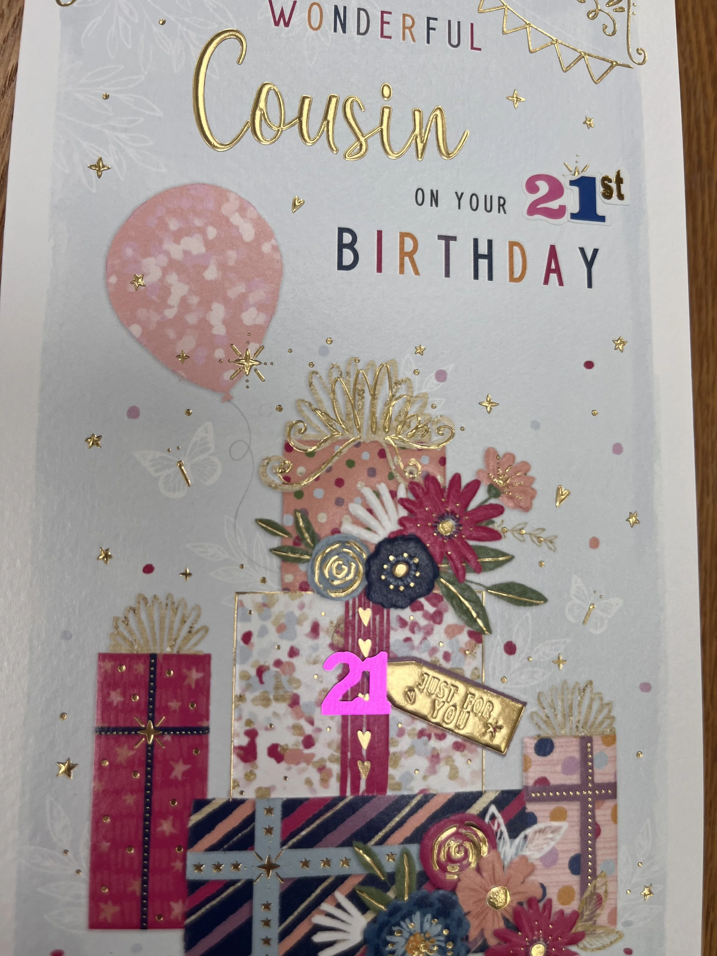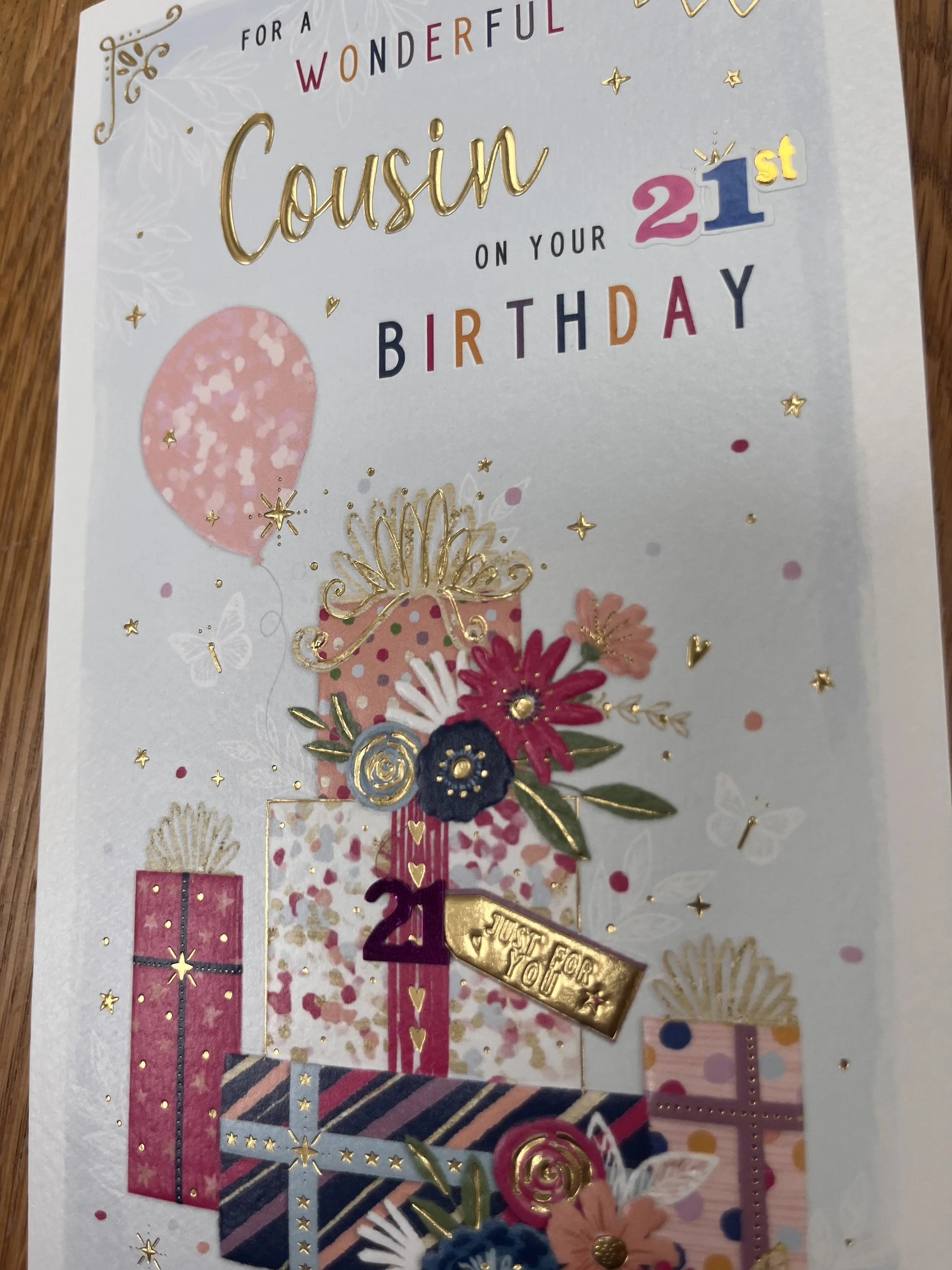 Cousin 21st Birthday Card design features effective gold foiling, hand finished with sparkly gold colour “21” 3D embellishments and inside a full colour illustrated insert with a slightly raised gold foiled white 21 attachment