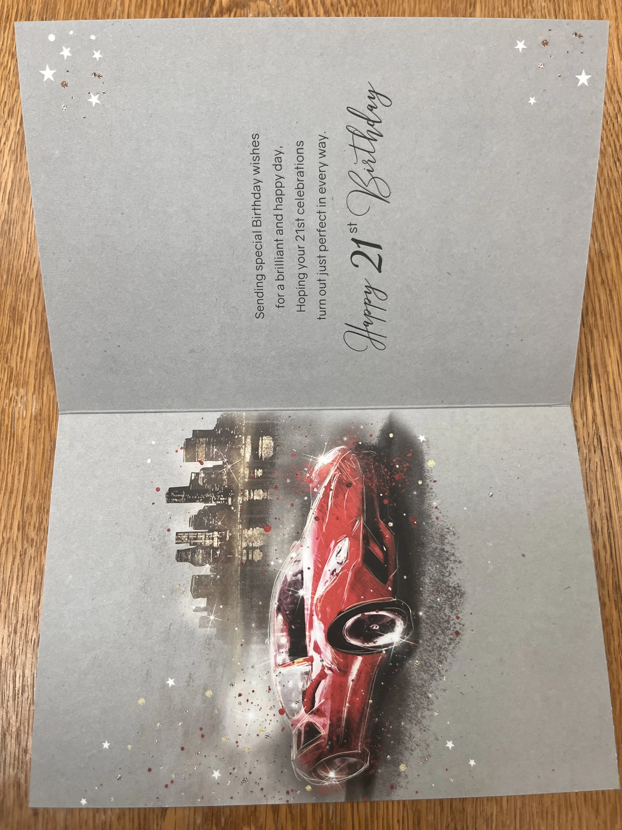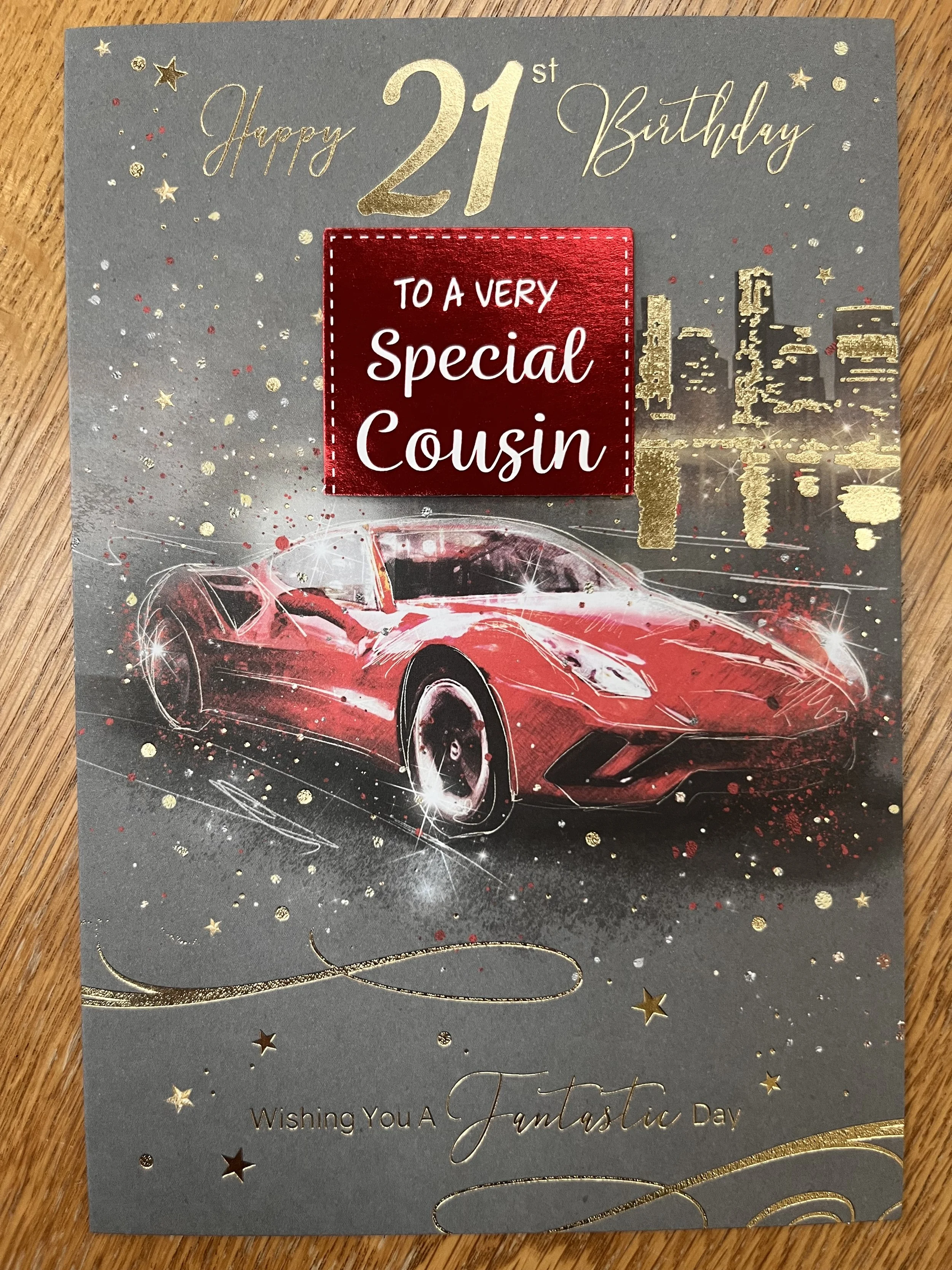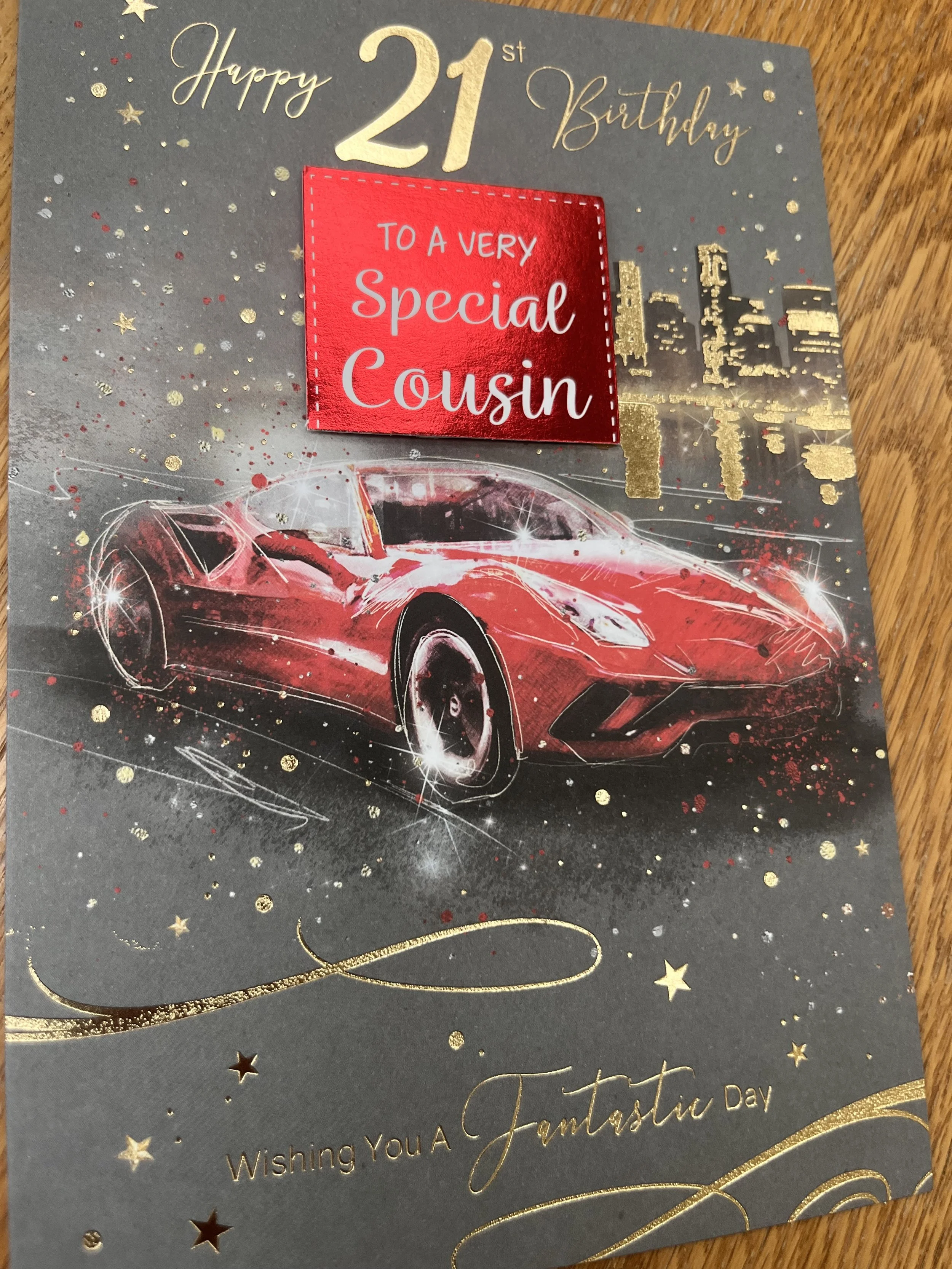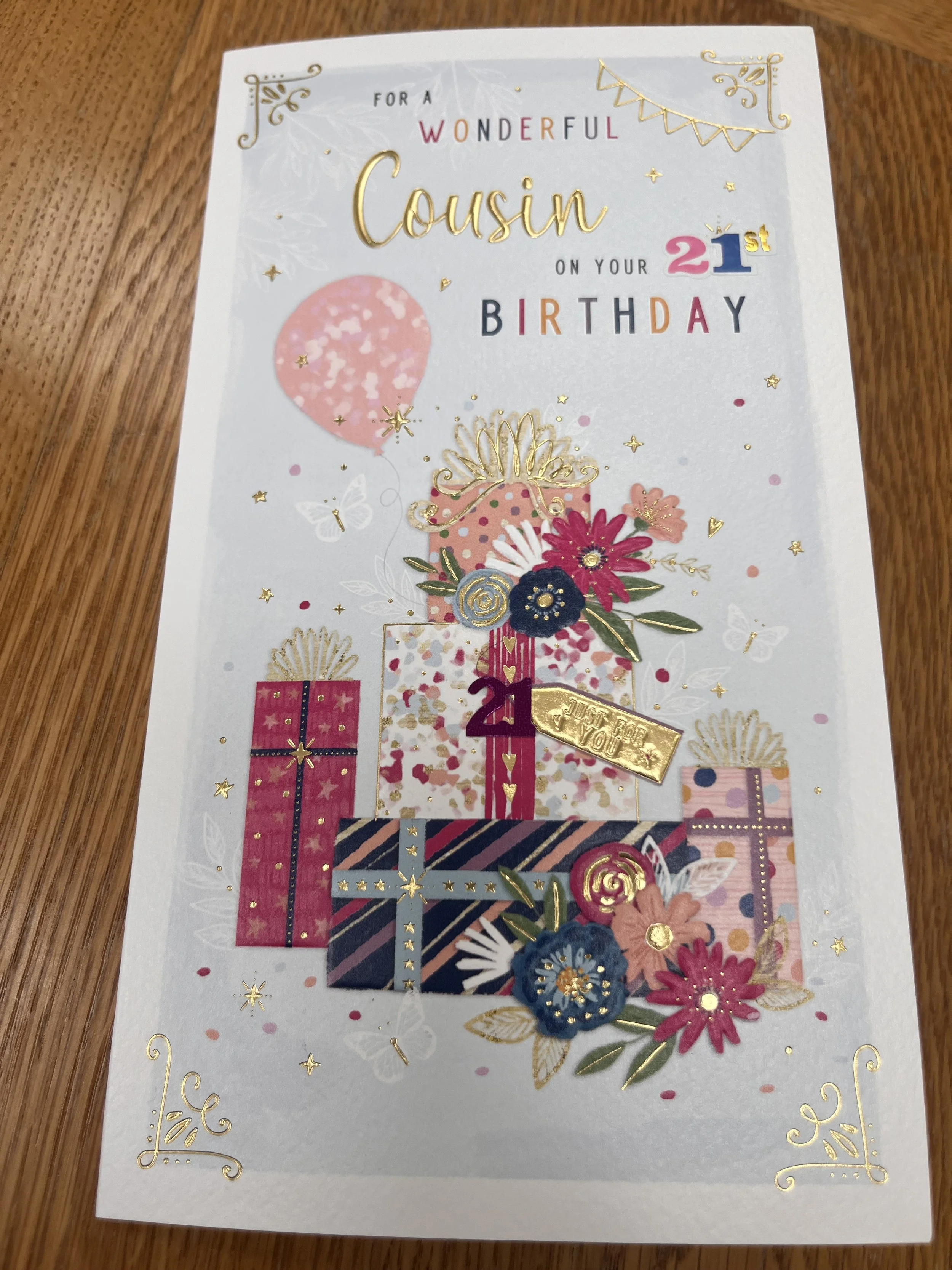 Cousin 21st Birthday Card design features effective gold foiling, hand finished with sparkly gold colour “21” 3D embellishments and inside a full colour illustrated insert with a slightly raised gold foiled white 21 attachment