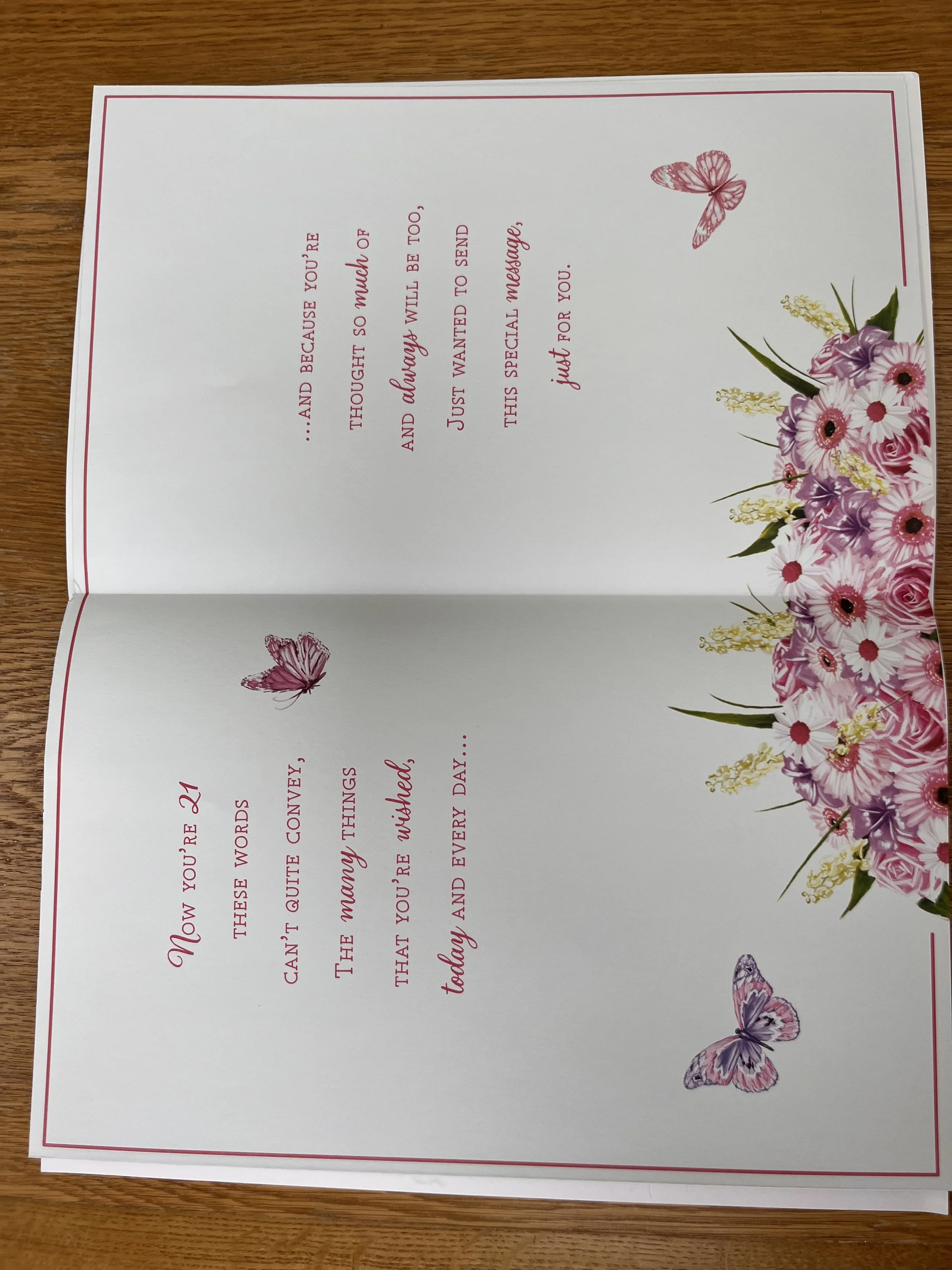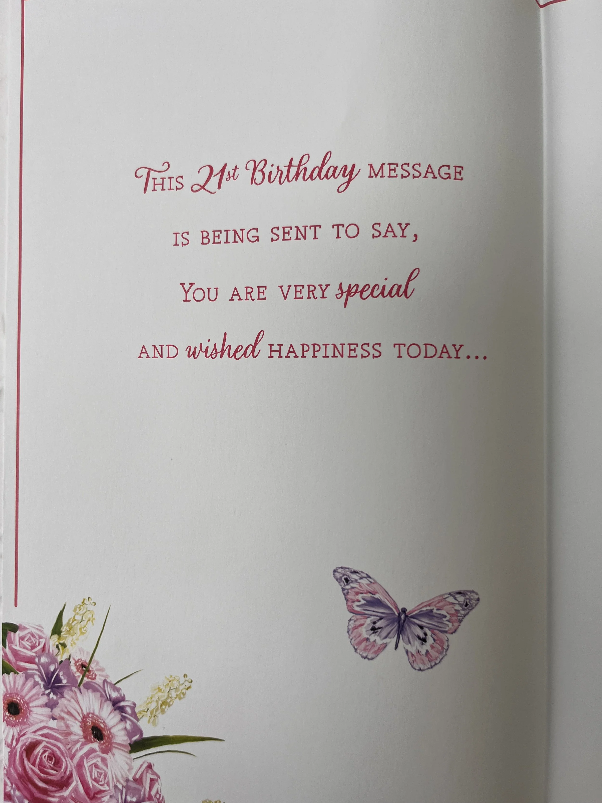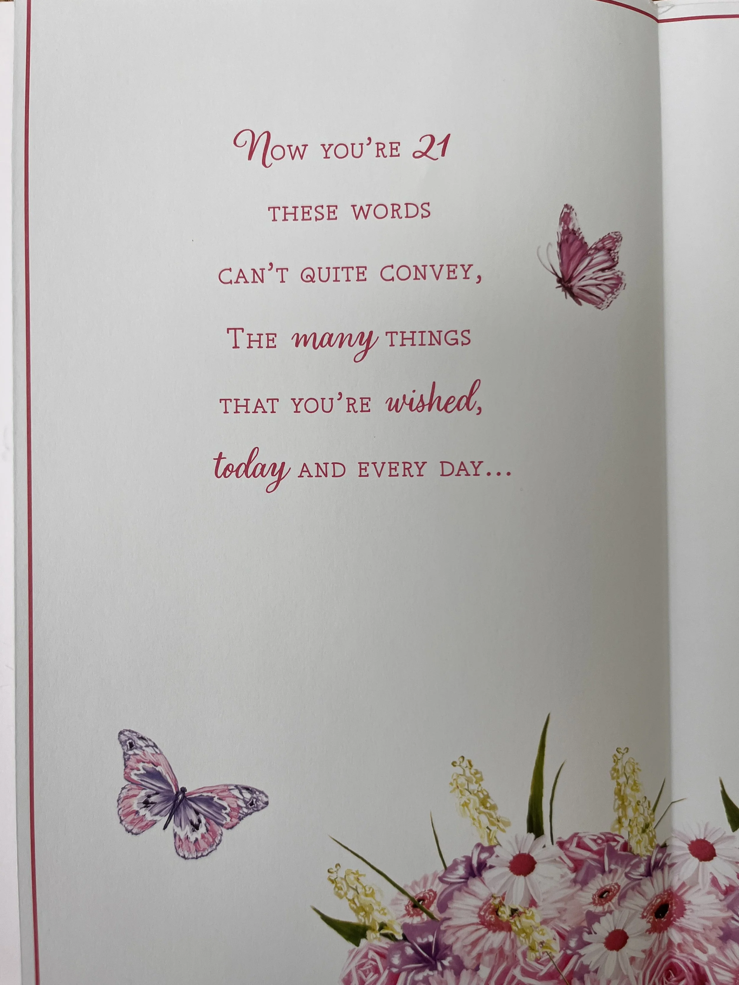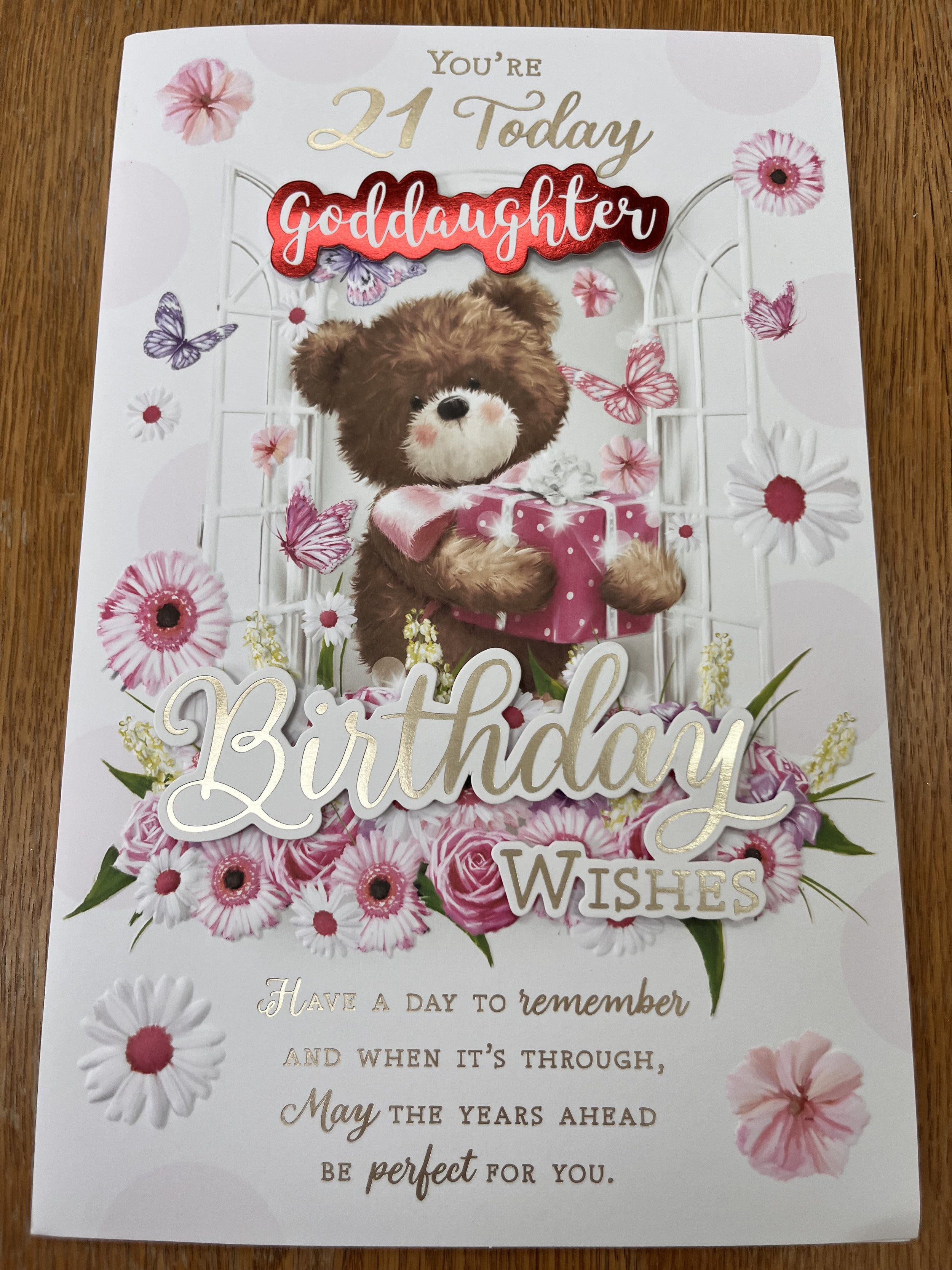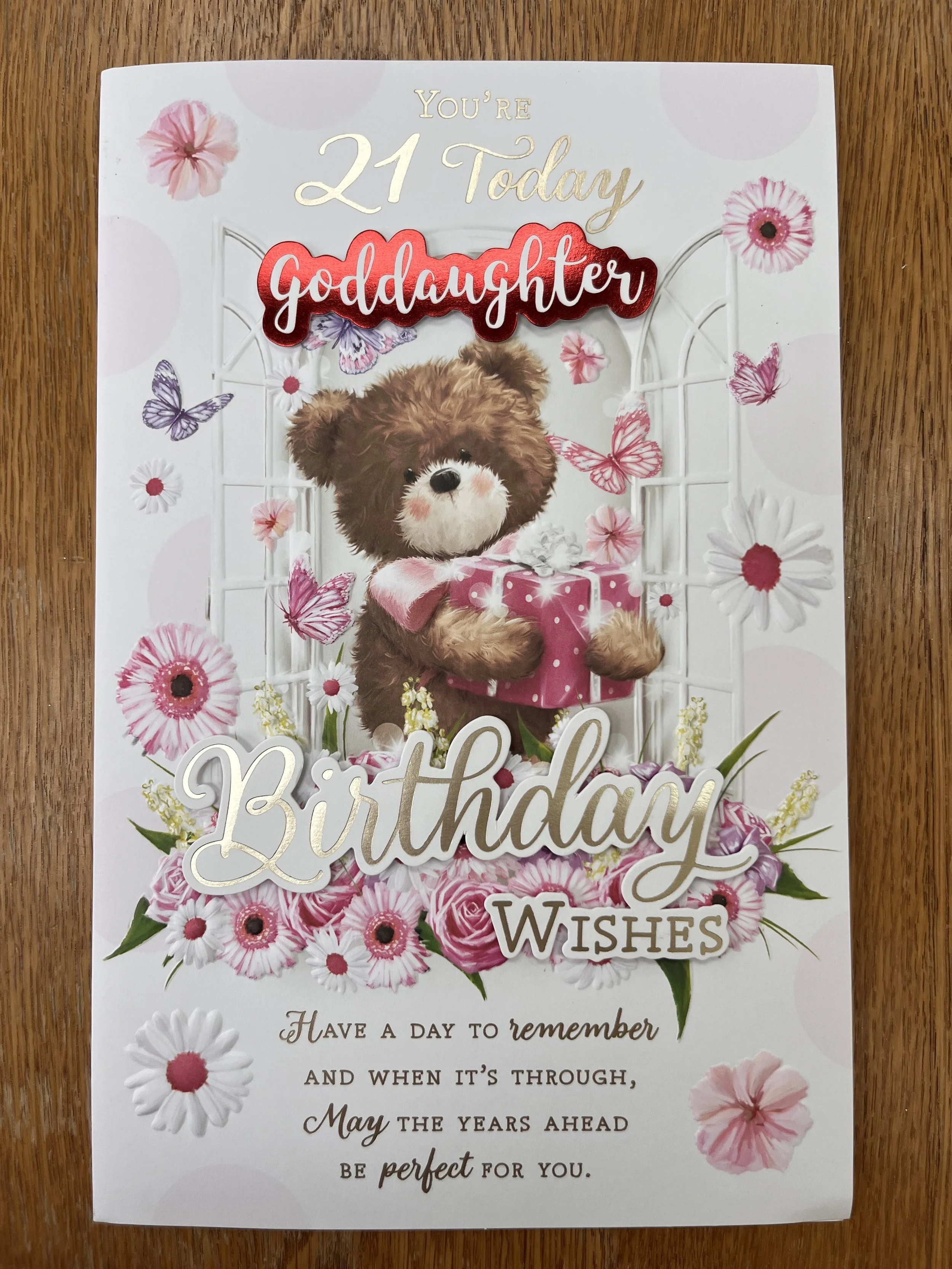 Goddaughter 21st Birthday Card design features attachments, effective foil and inside a lovely full colour illustrated insert with heartfelt sentiment