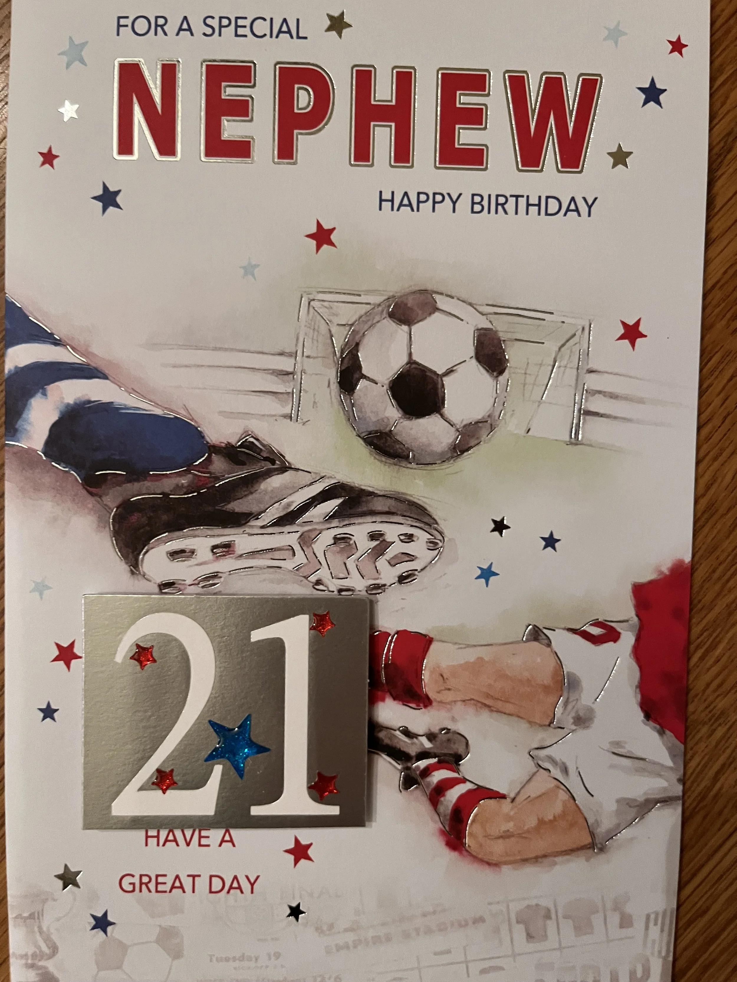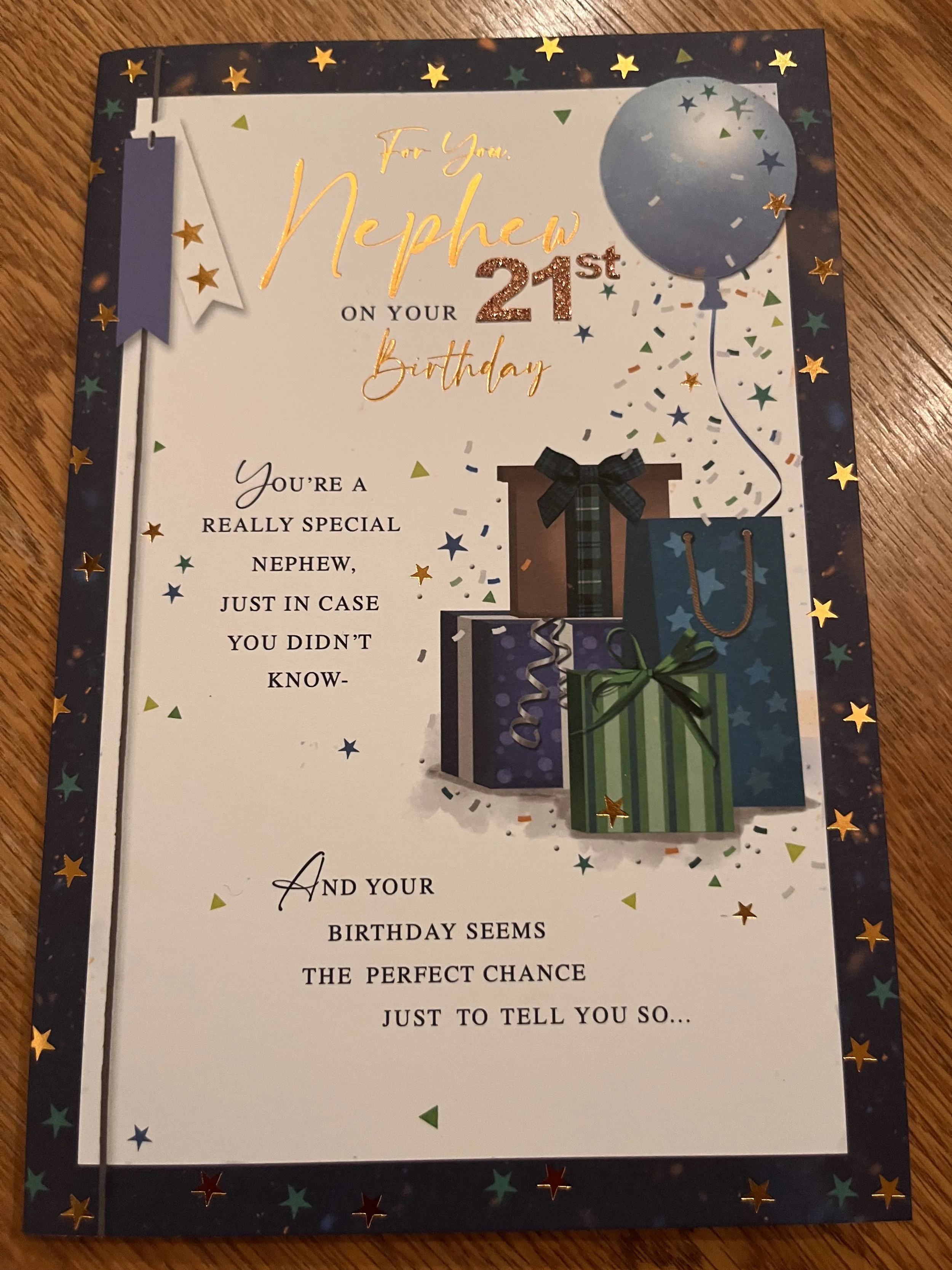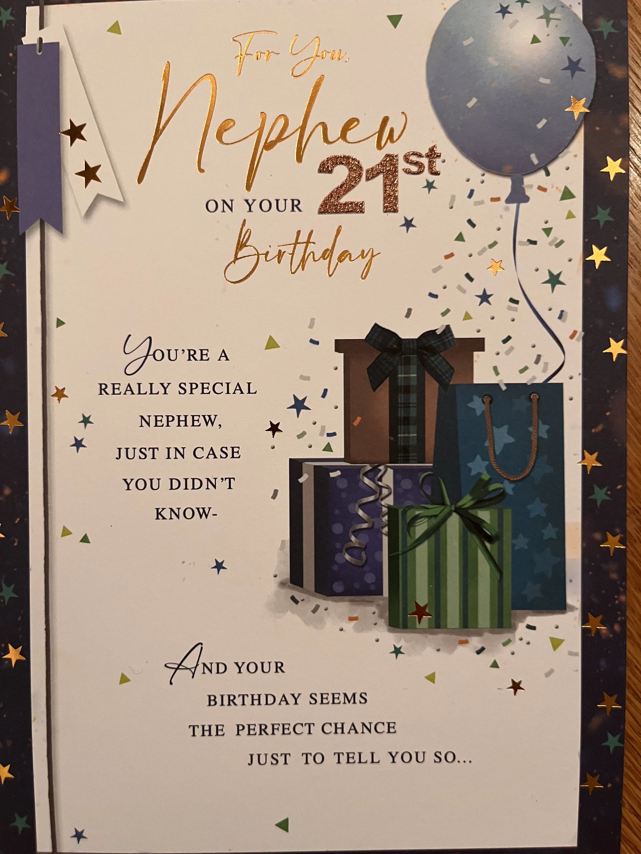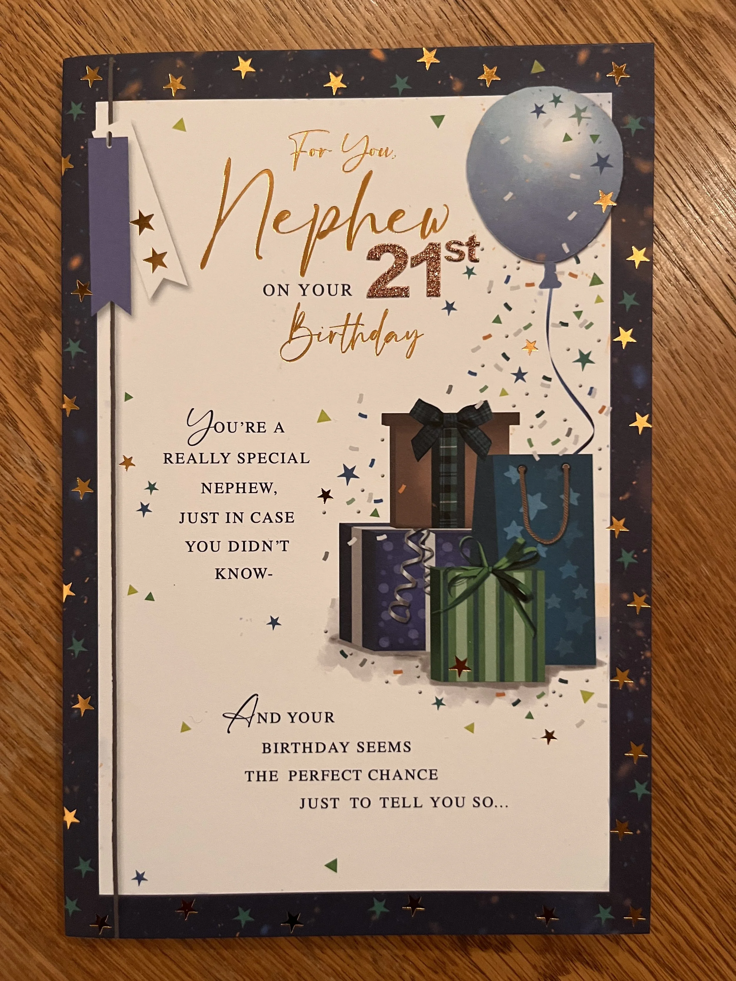 Nephew 21st Birthday Card is a fab design that has effective blue foiling and HAND FINISHED with a 3D attachment, 2 star embellishments and inside a verse with full colour illustrations