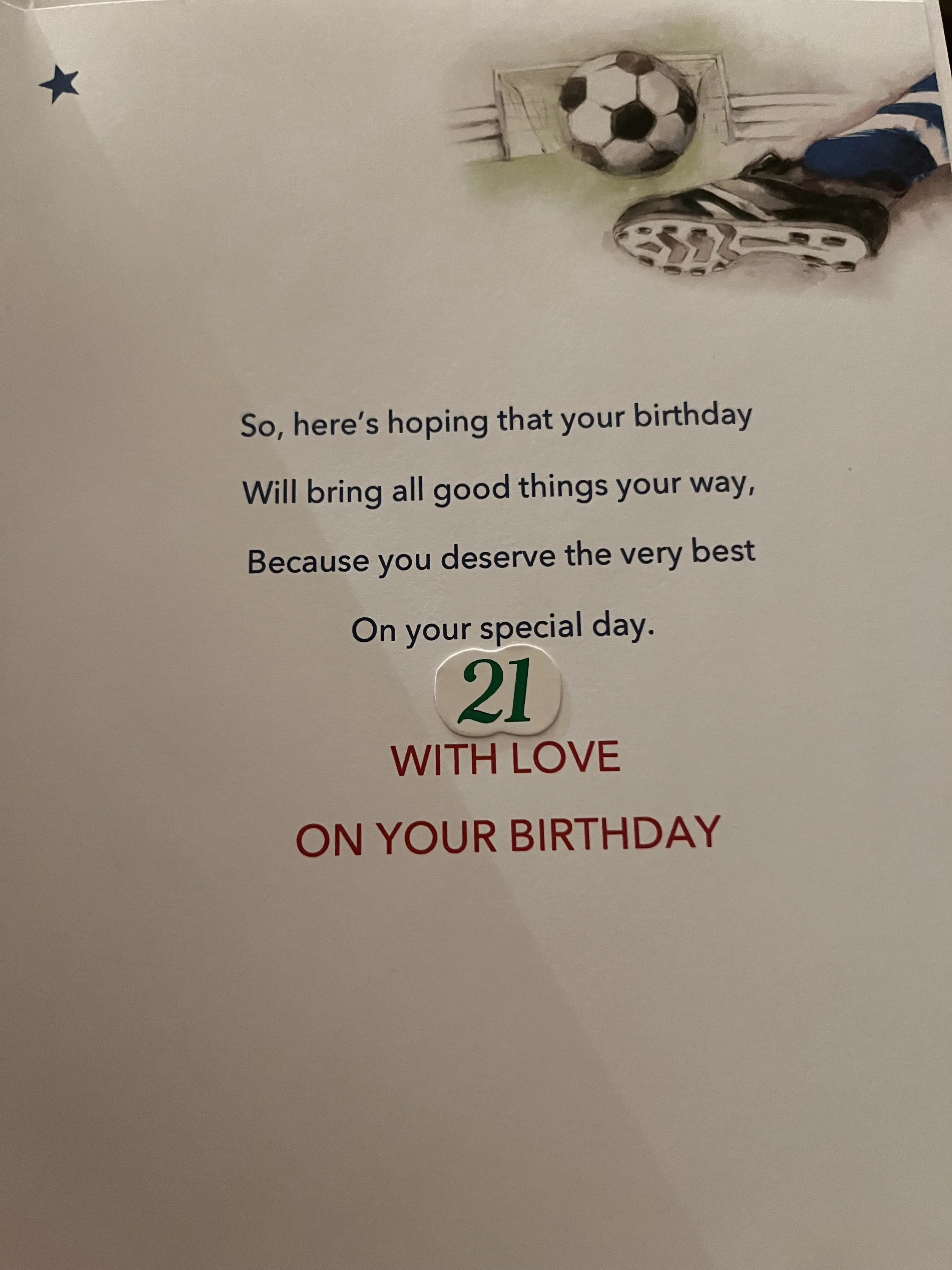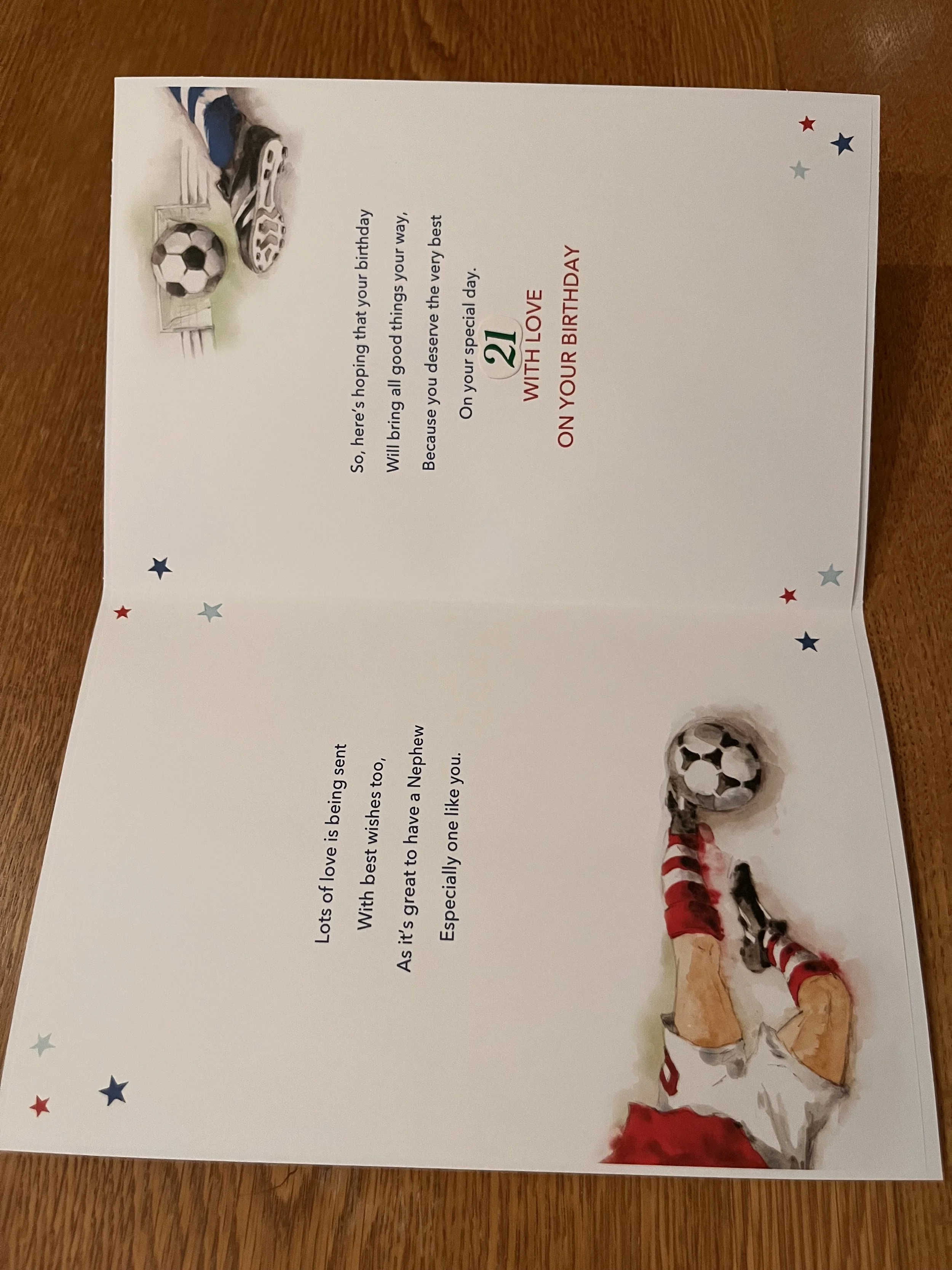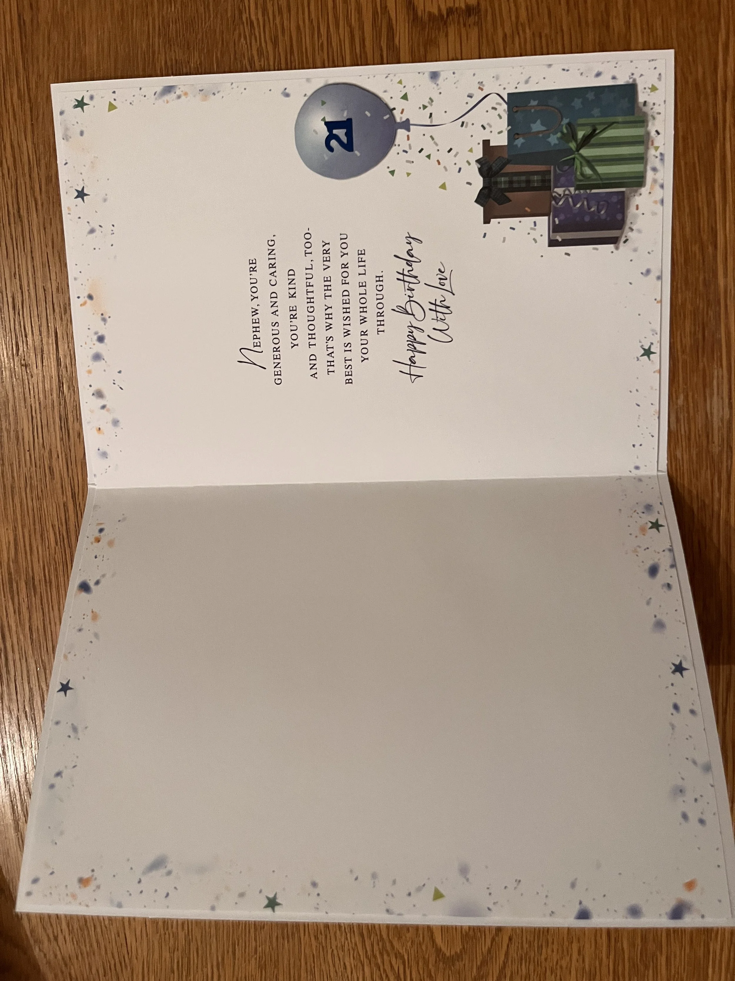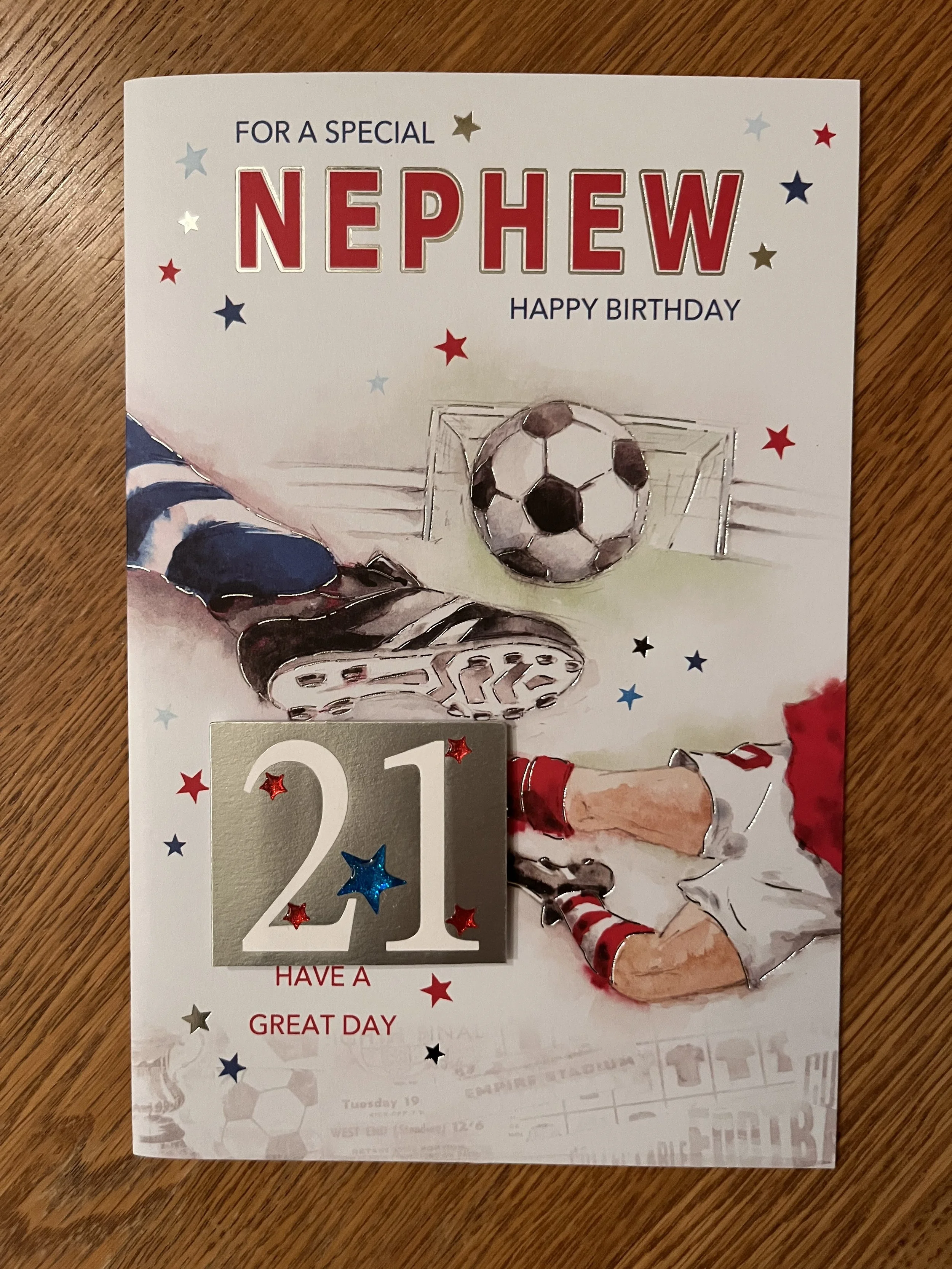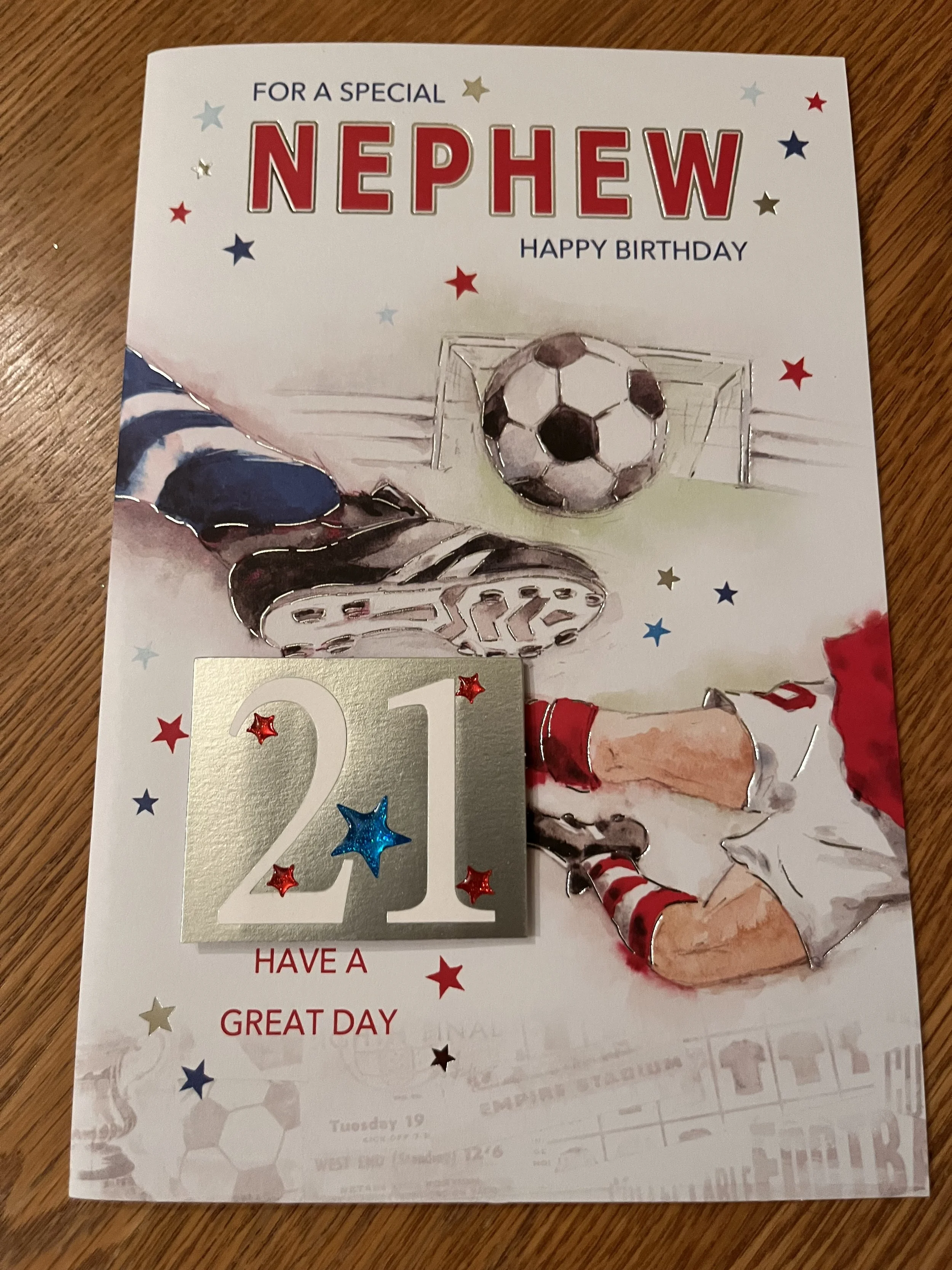 Nephew 21st Birthday Card is a fab design that has effective blue foiling and HAND FINISHED with a 3D attachment, 2 star embellishments and inside a verse with full colour illustrations