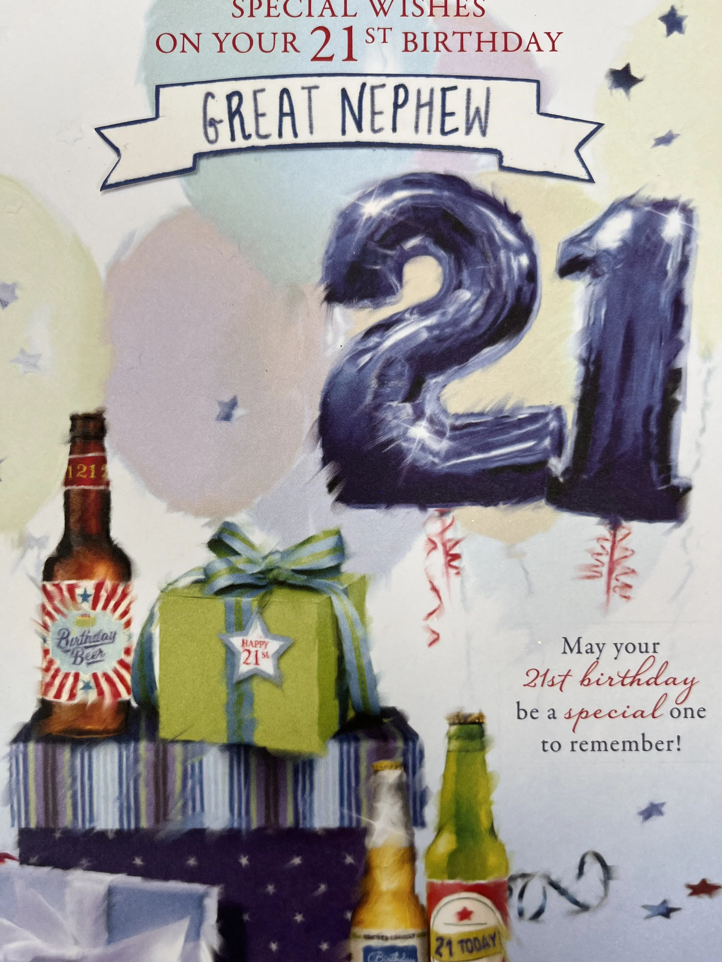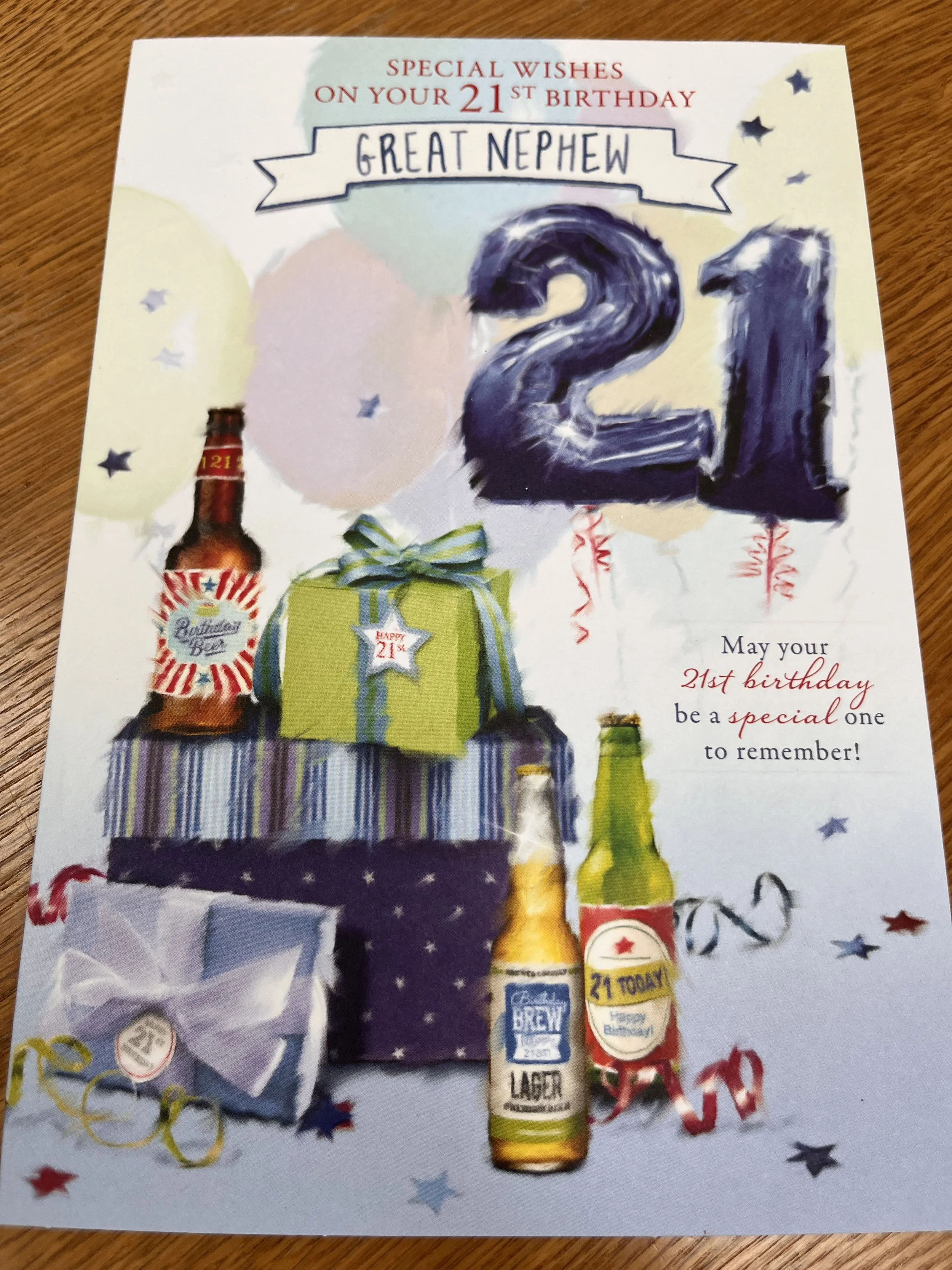 Standard postage if mailing this Great Nephew 21st Birthday card