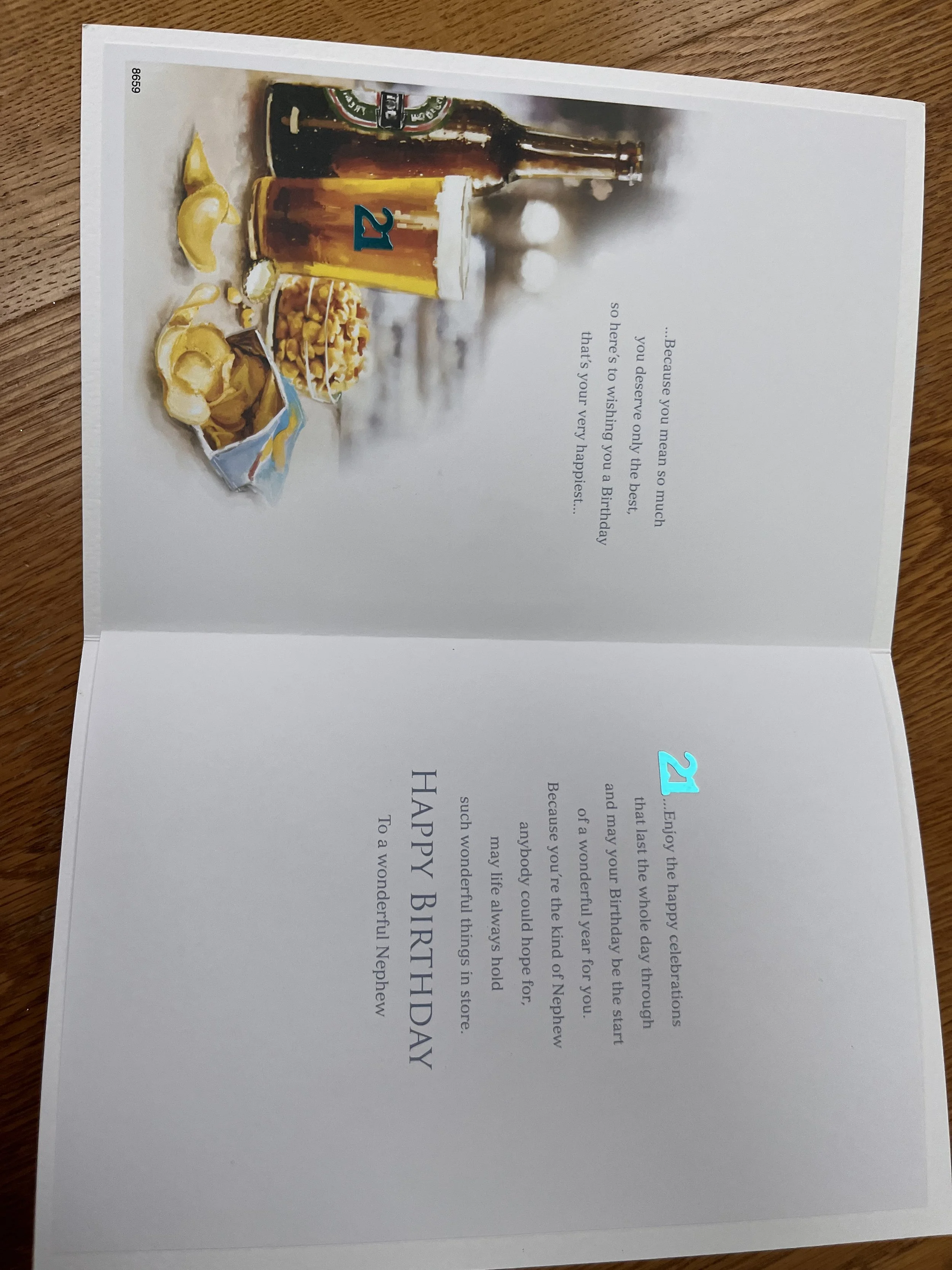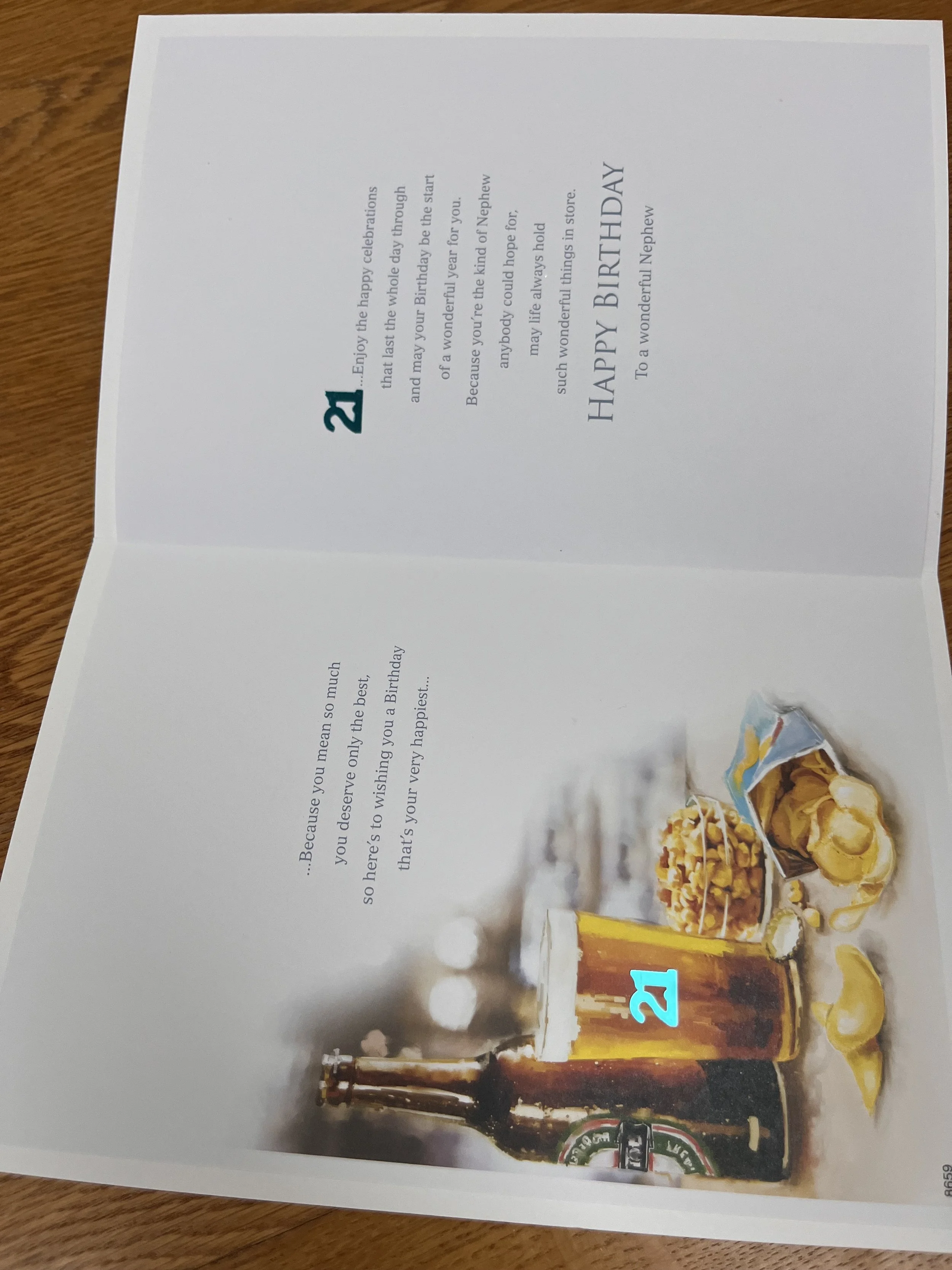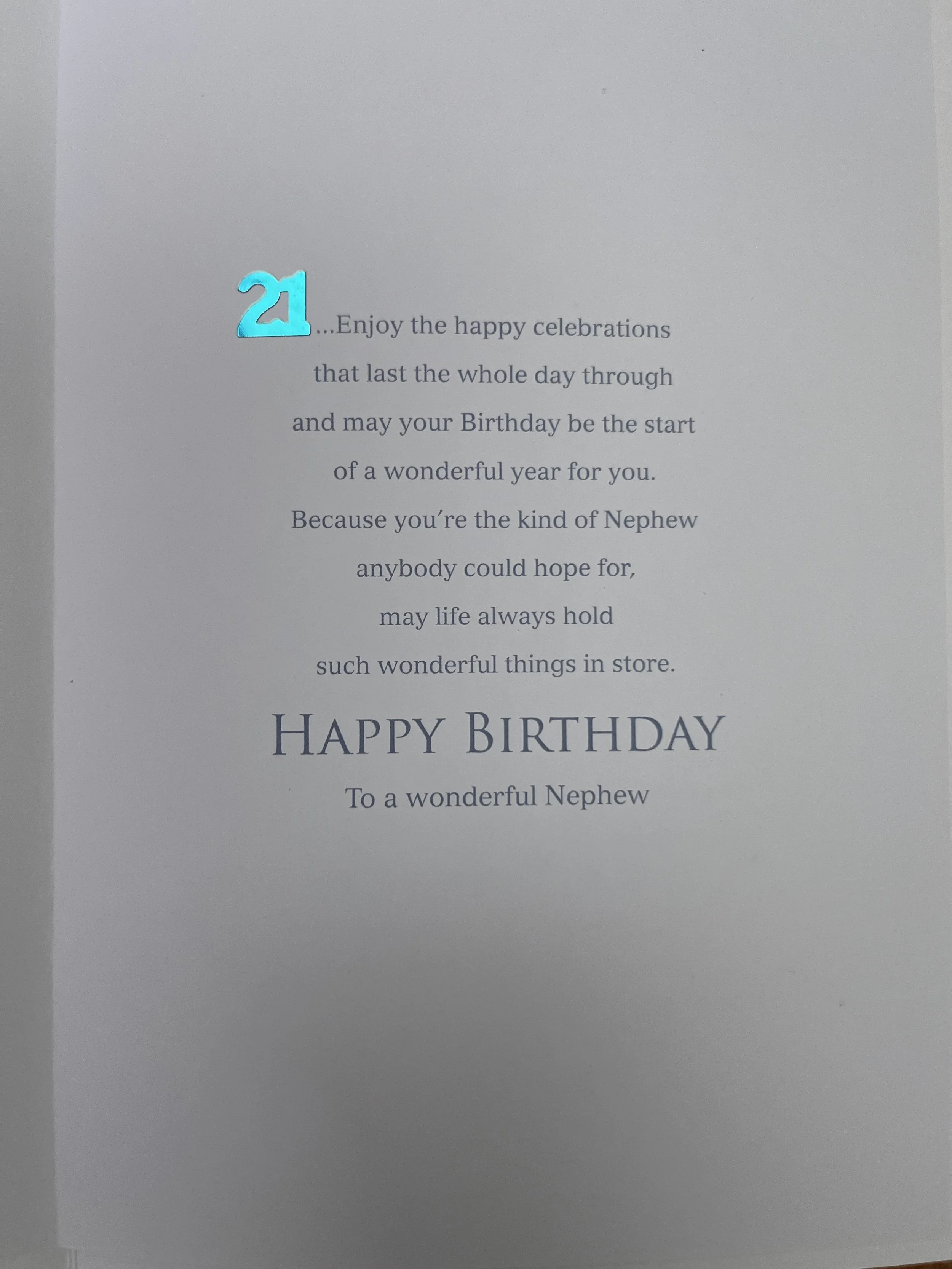 Standard 1st or 2nd class postage required if mailing this Nephew 21st Birthday Card