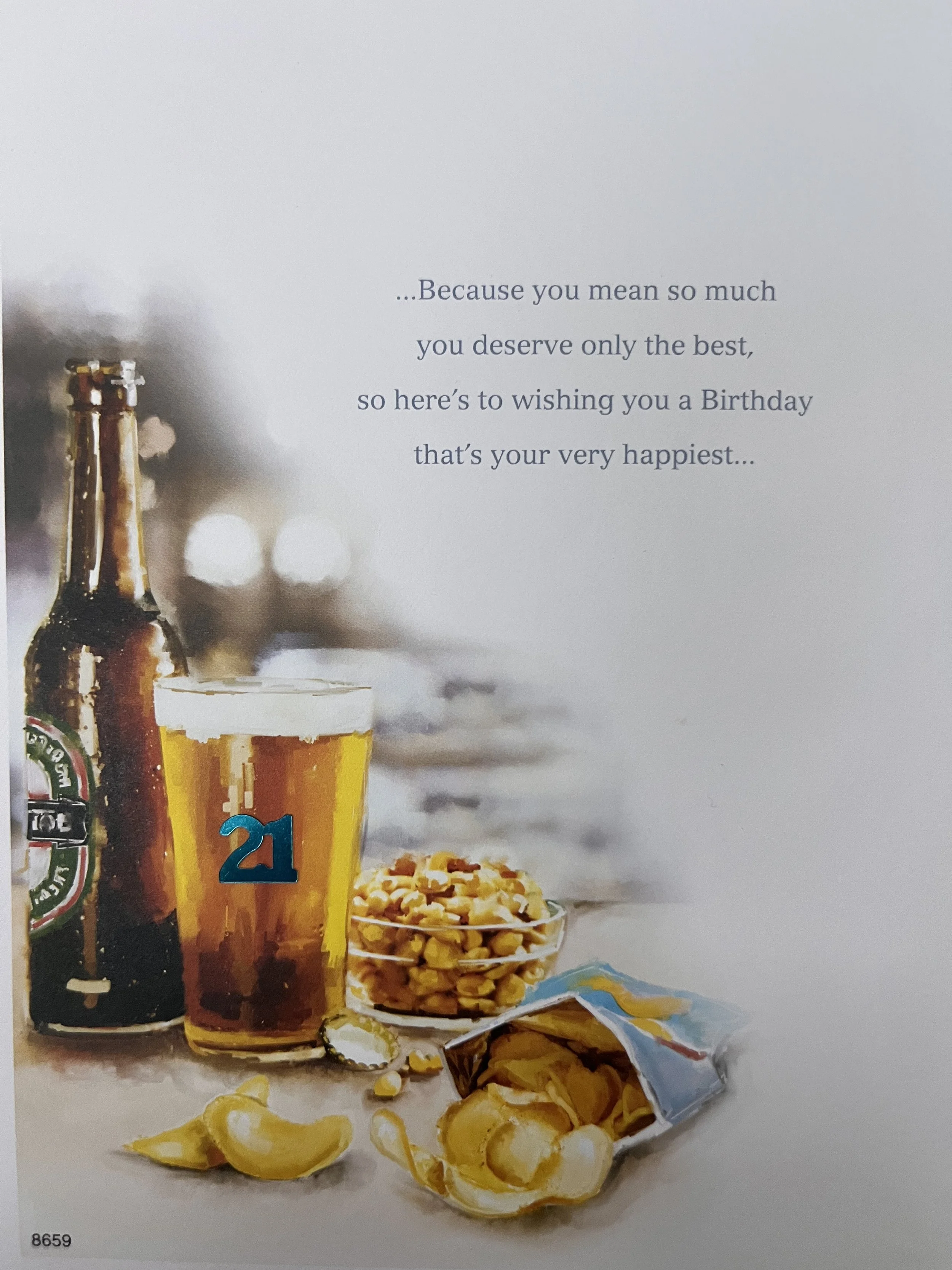 Nephew 21st Birthday Card design features foiling, an attachment, embossing and heartfelt words inside a full colour illustrated insert with attachments