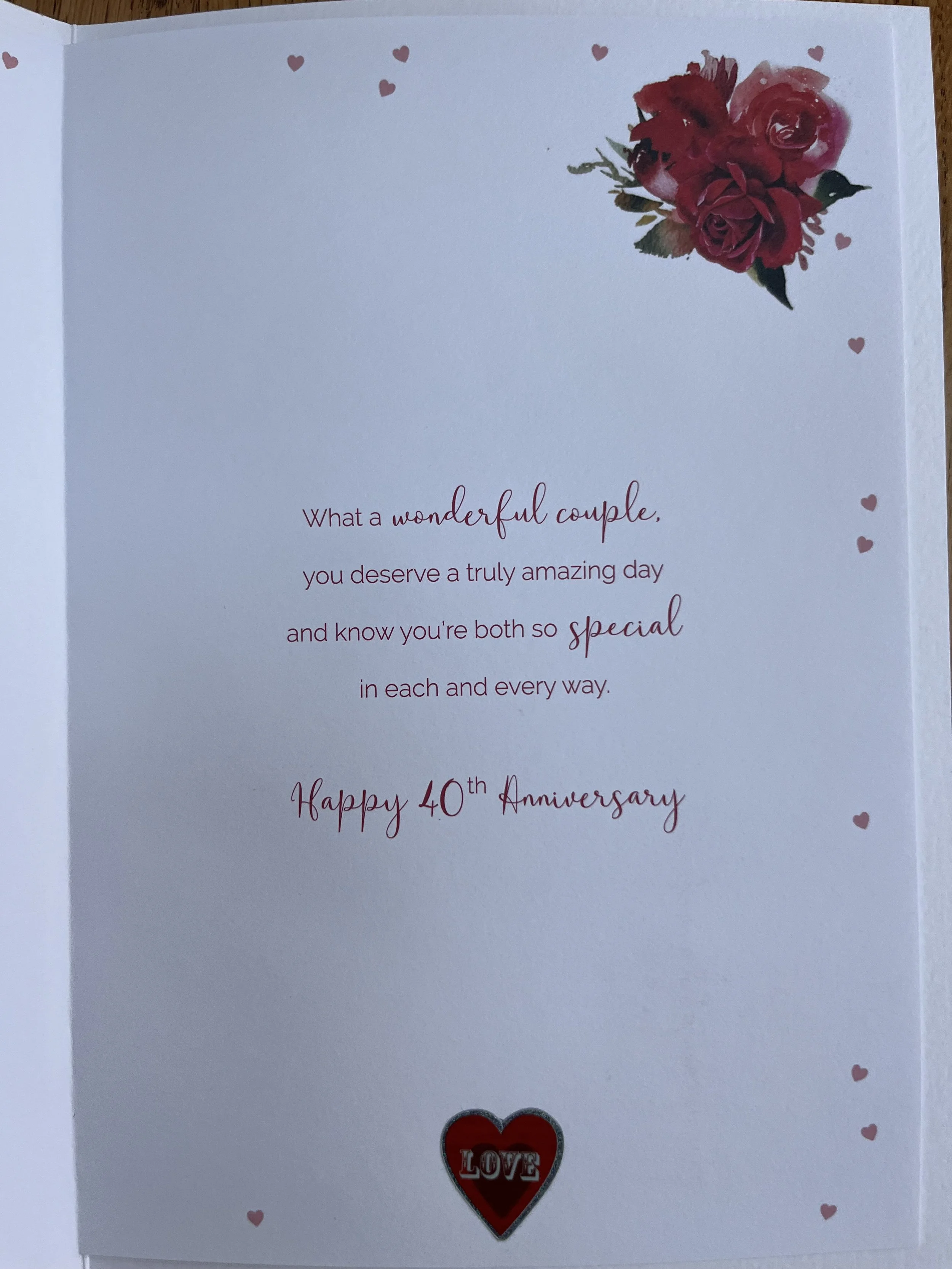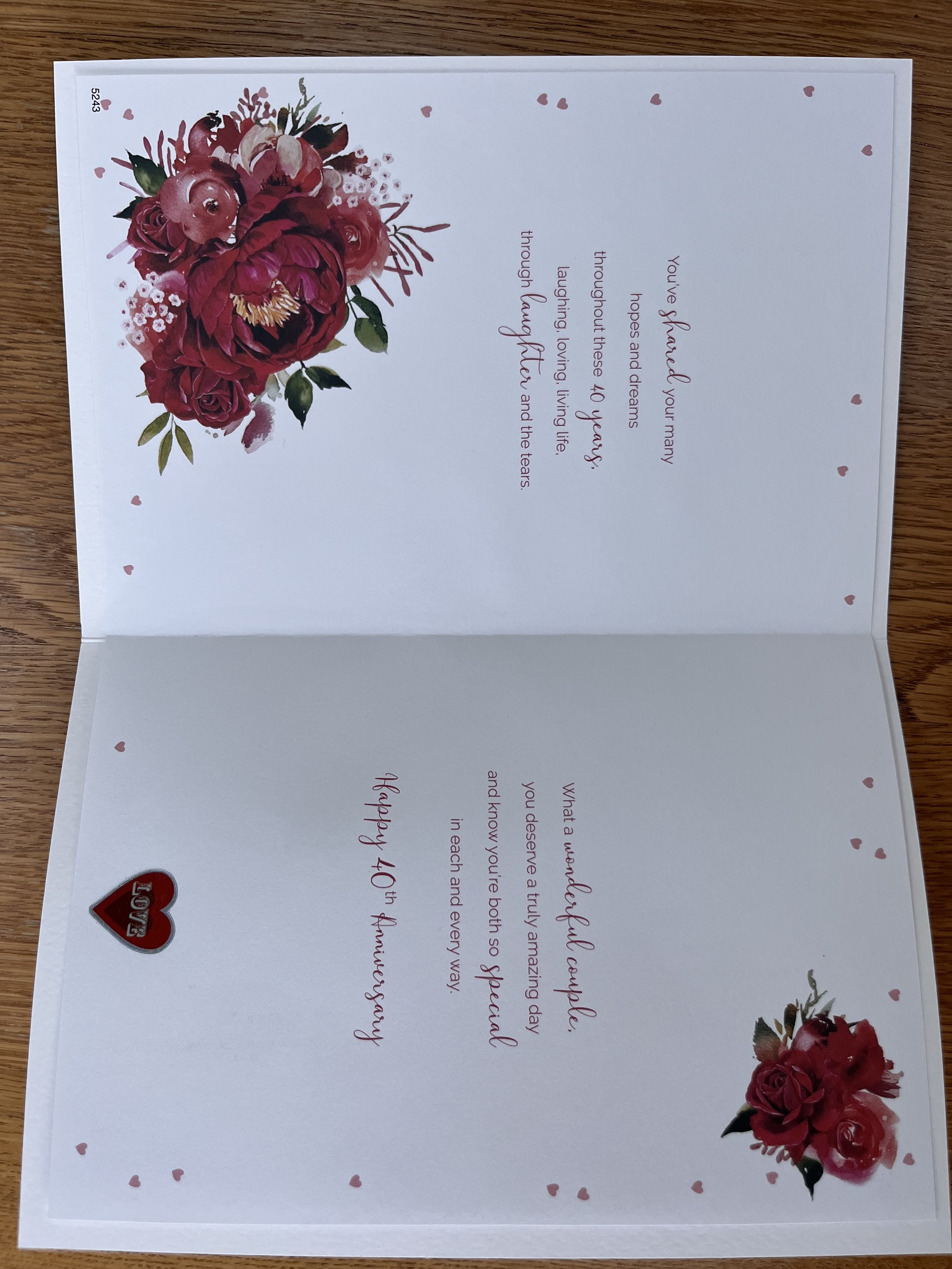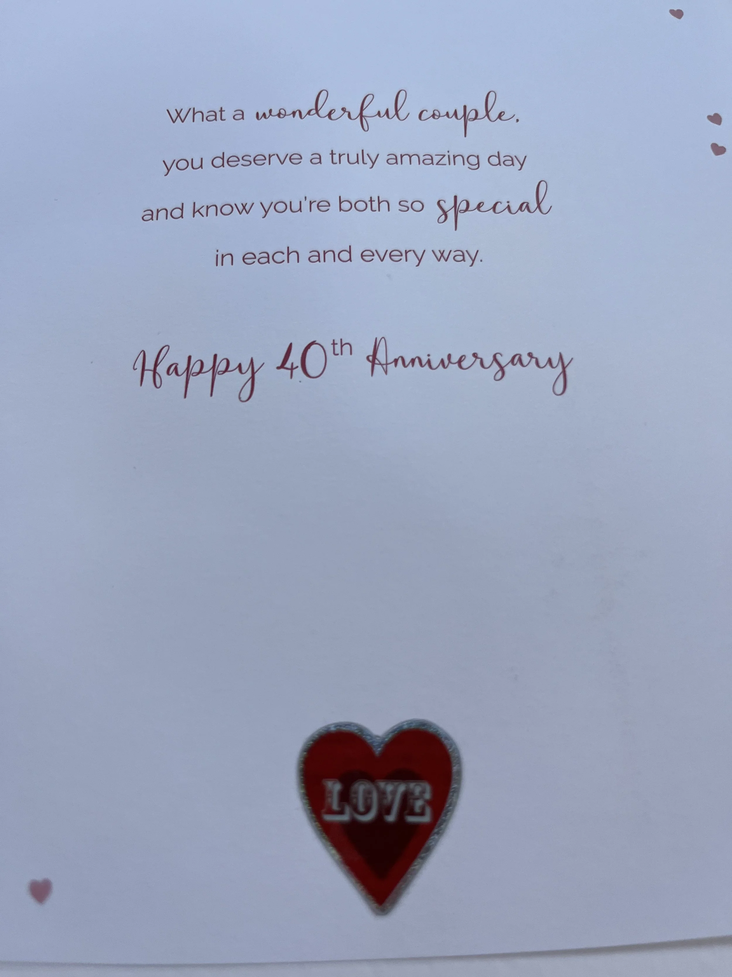 Daughter and Son in Law Ruby/ 40th Anniversary is a LARGE Hand Finished card featuring 3D attachments, red foil, flitter, fabric red ribbons and Inside a colour illustrated insert