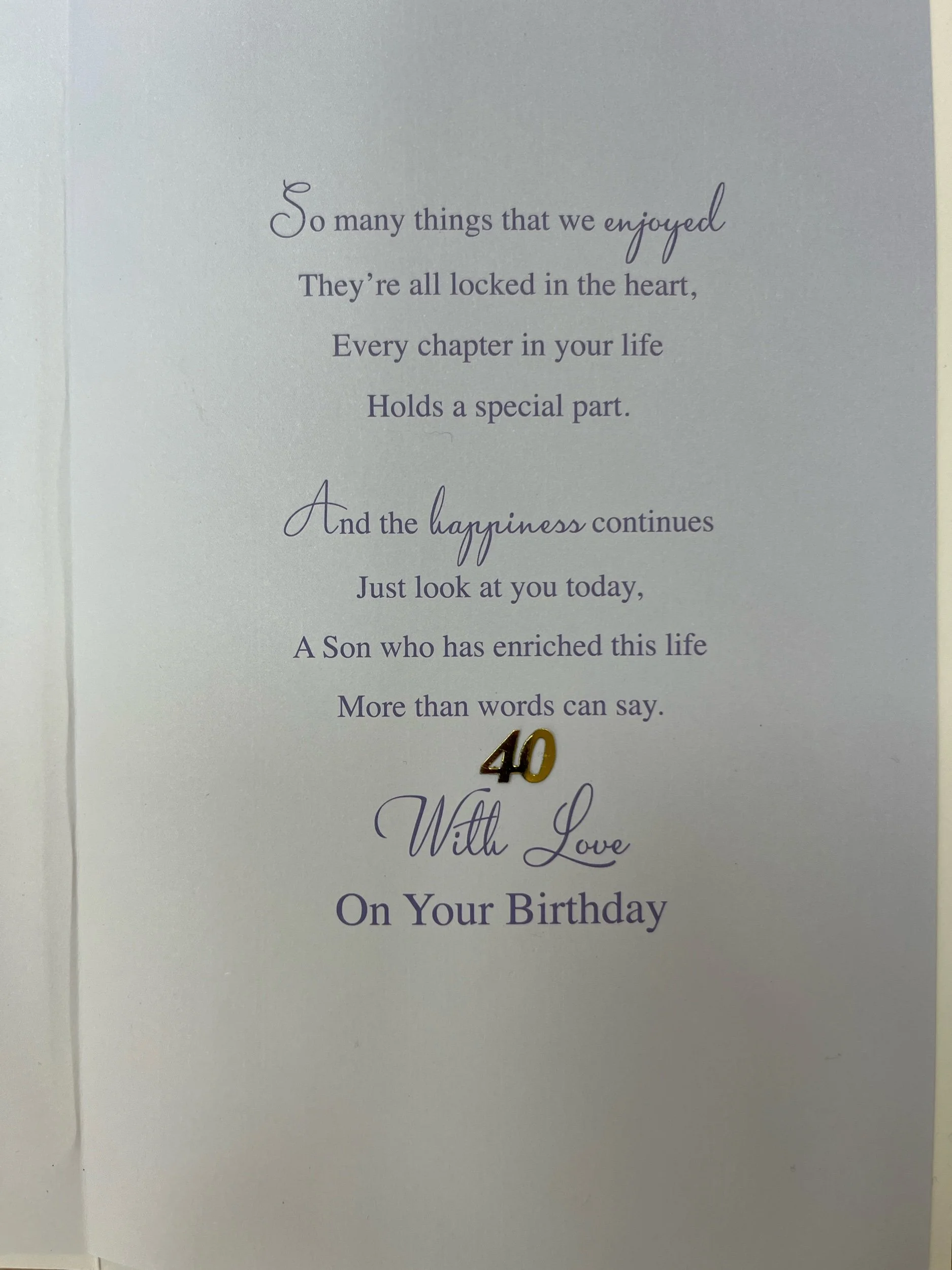 Special Son 40th Birthday card is a HAND FINISHED design that features a detachable credit card style, keepsake card with heartfelt words, a 3D sparkly blue 40 Today embellishment , effective gold foiling and inside a full colour illustrated insert with "Loving Words" and gold foiled 40 attachments - as shown on photos 😍