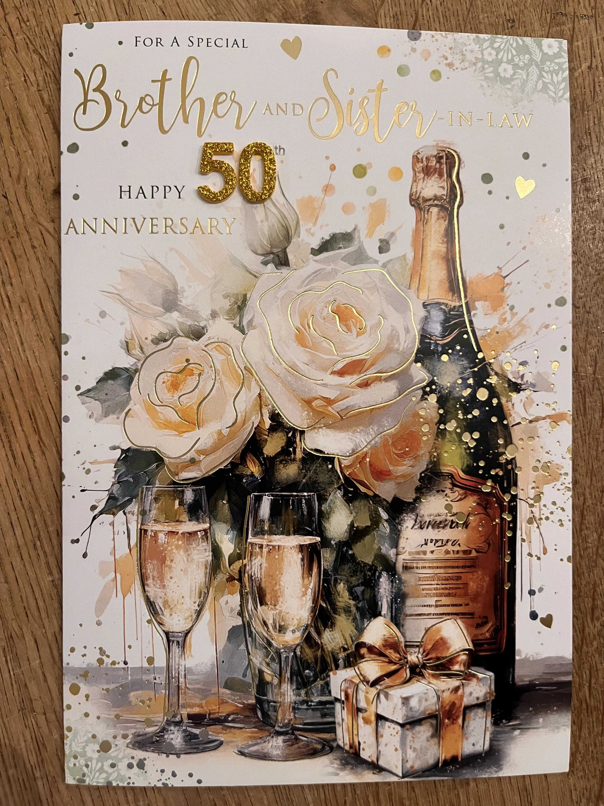 Brother and Sister in Law 50th anniversary card is a HAND FINISHED design which has sparkly gold 3d attachments, very effective gold foil and inside a full colour illustrated insert with verse