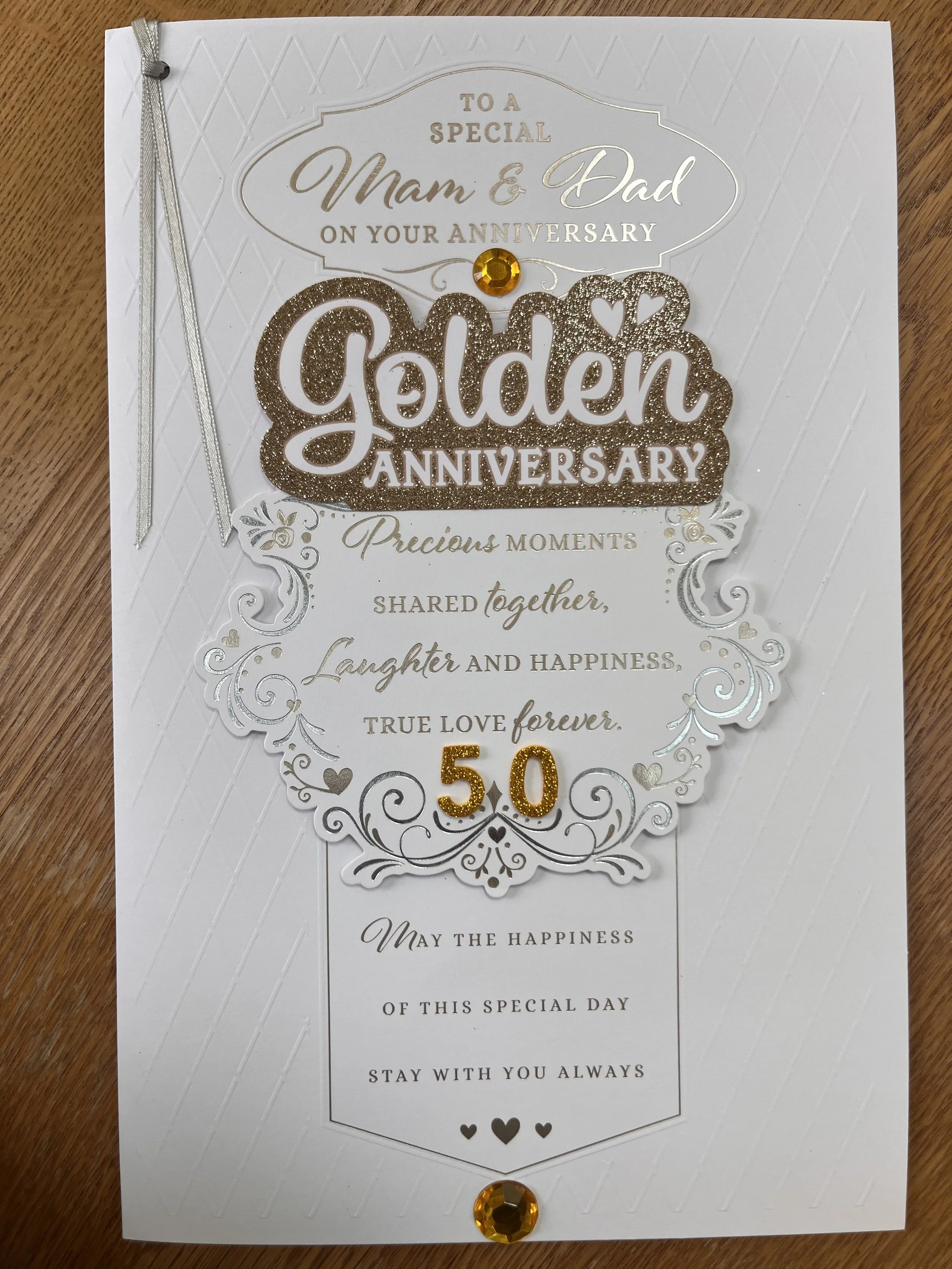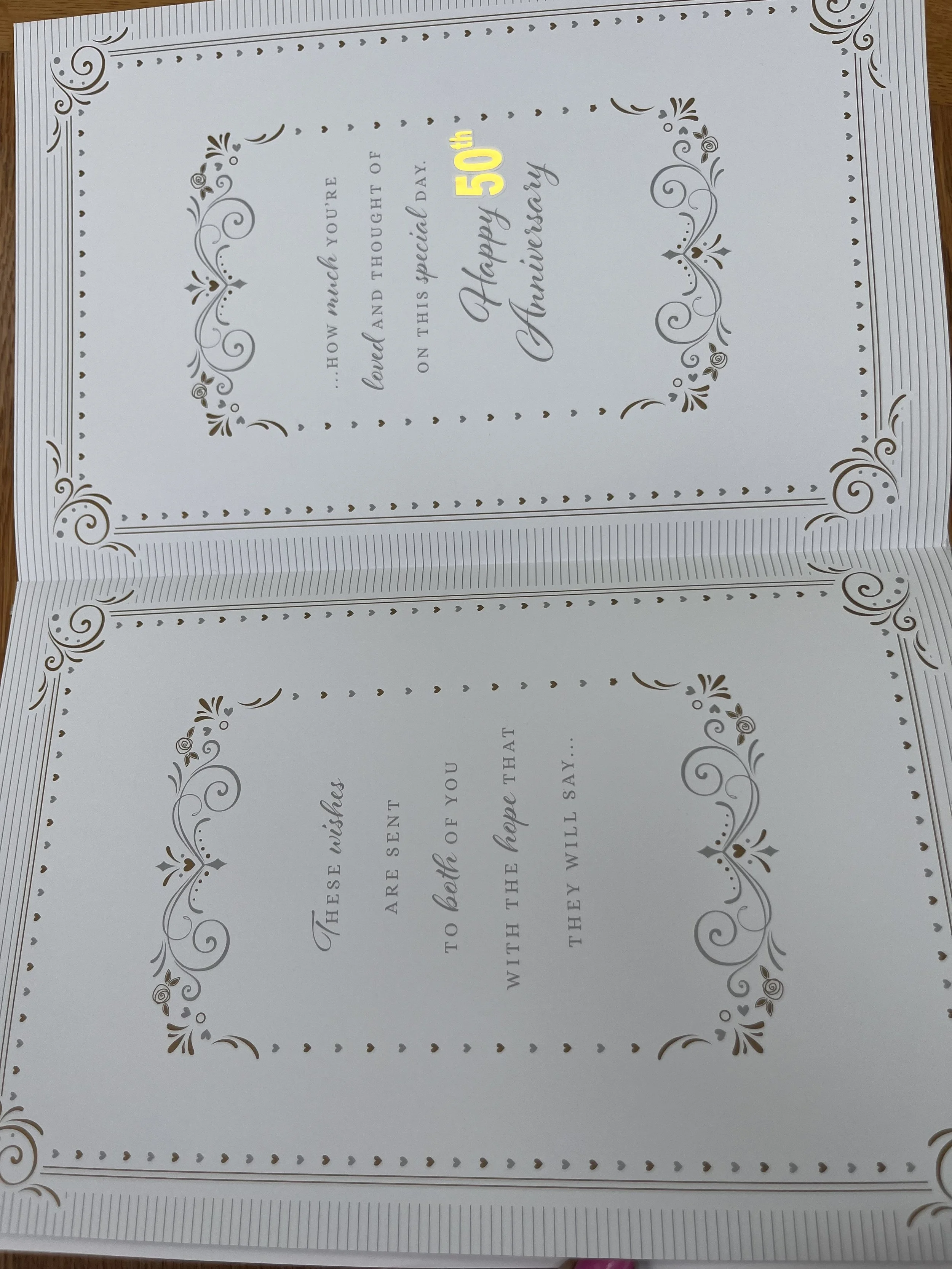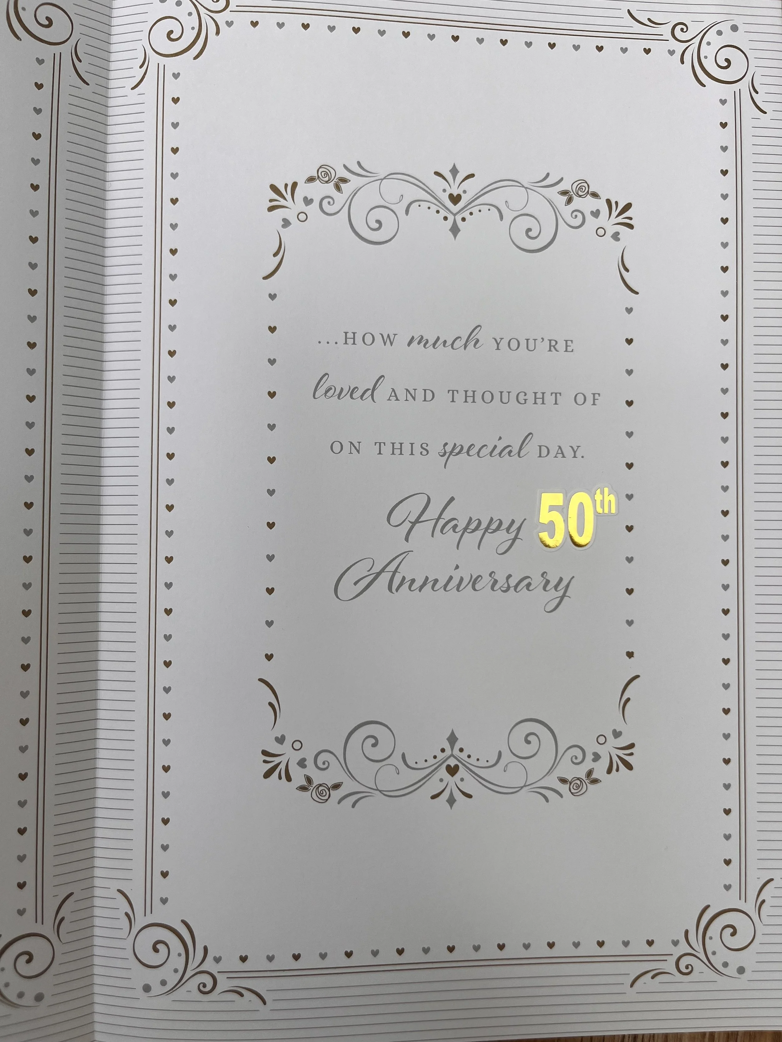 Mum and Dad Golden Anniversary card design features effective foil on a lovely design that continues inside on a full colour illustrated insert with heartfelt sentiment