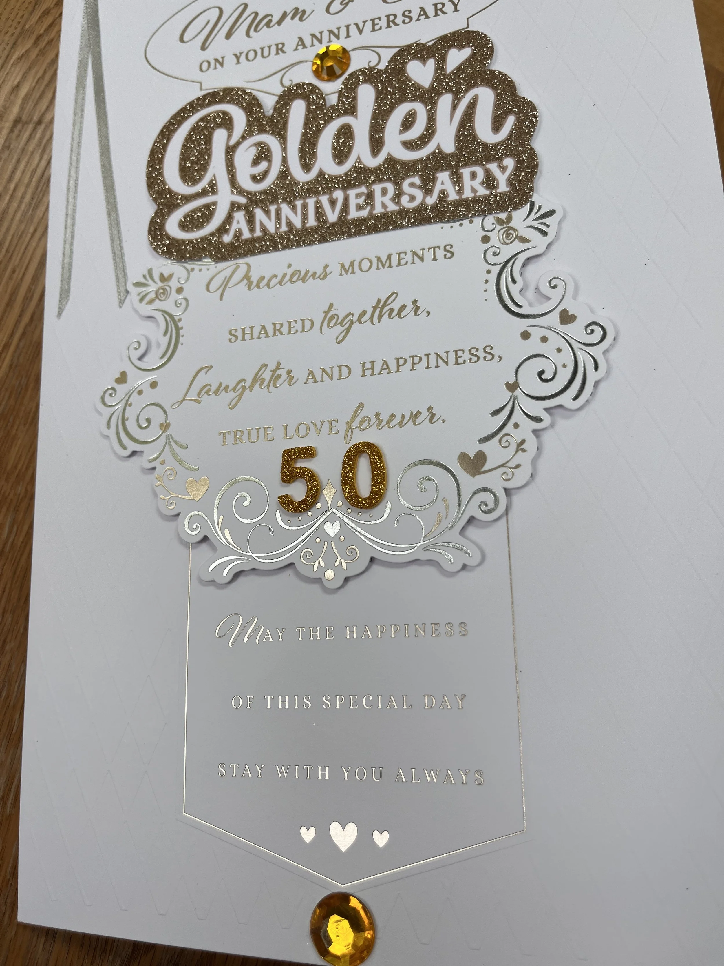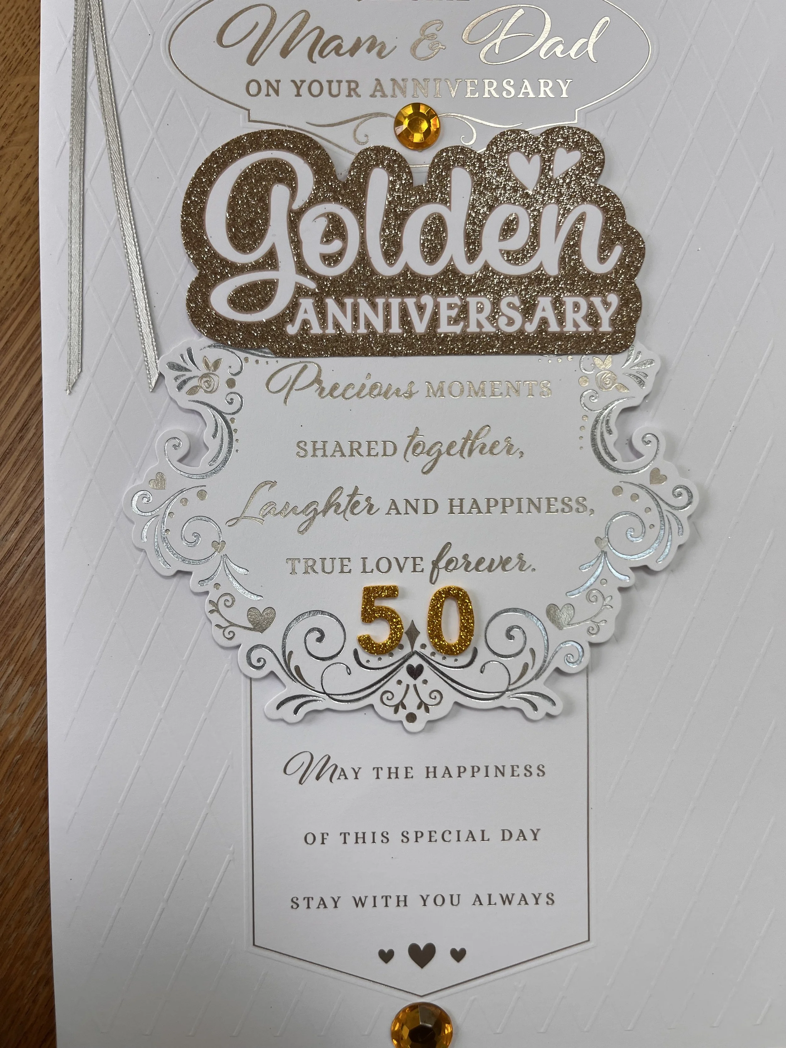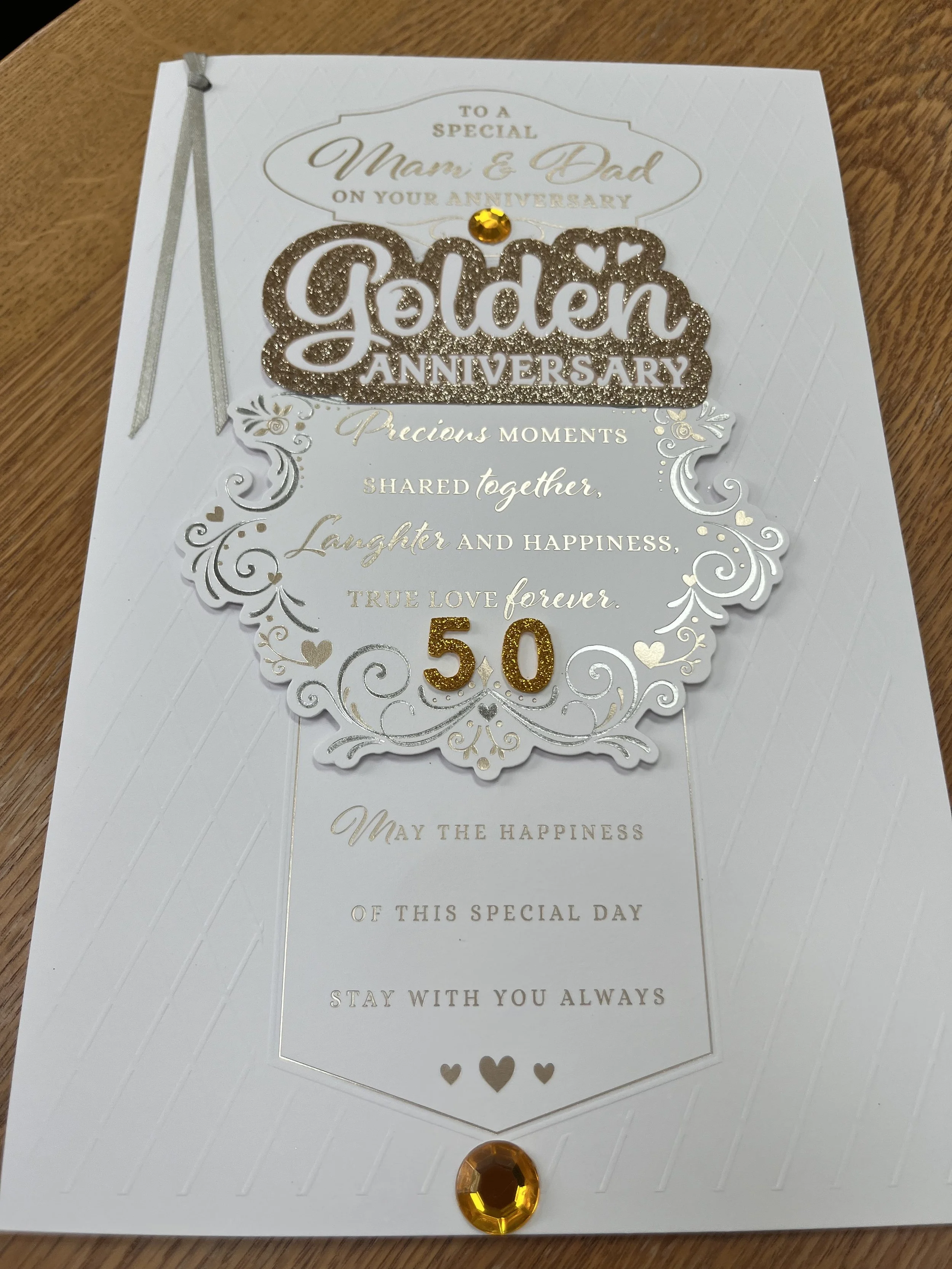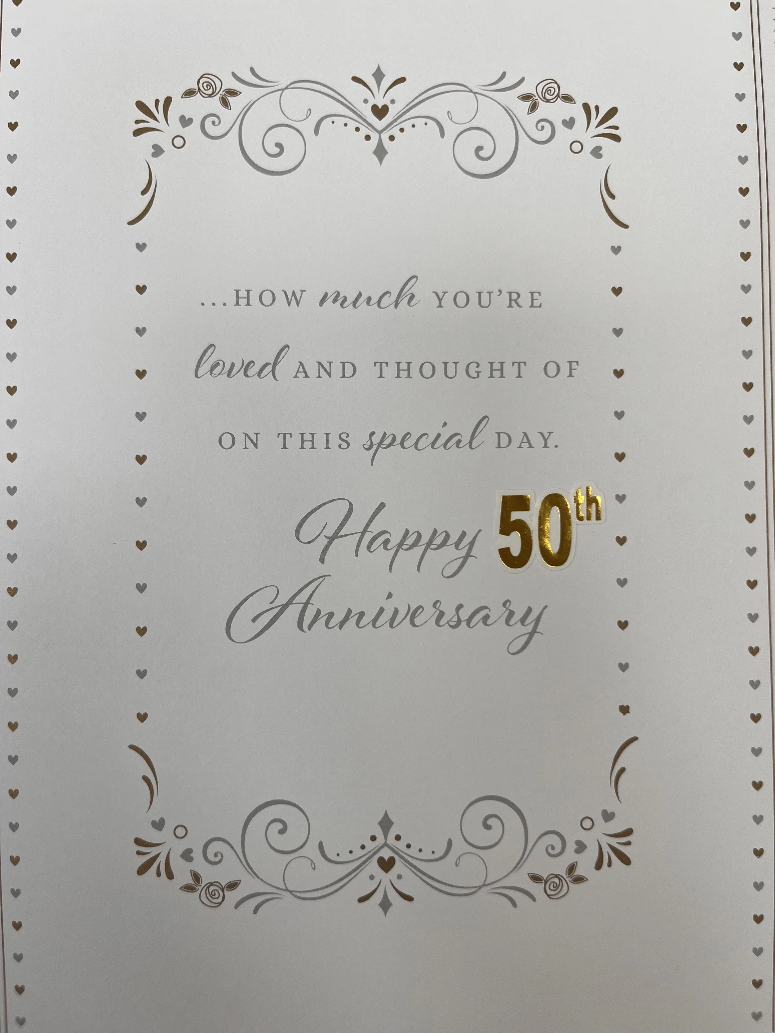 Mum and Dad Golden Anniversary card design features effective foil on a lovely design that continues inside on a full colour illustrated insert with heartfelt sentiment