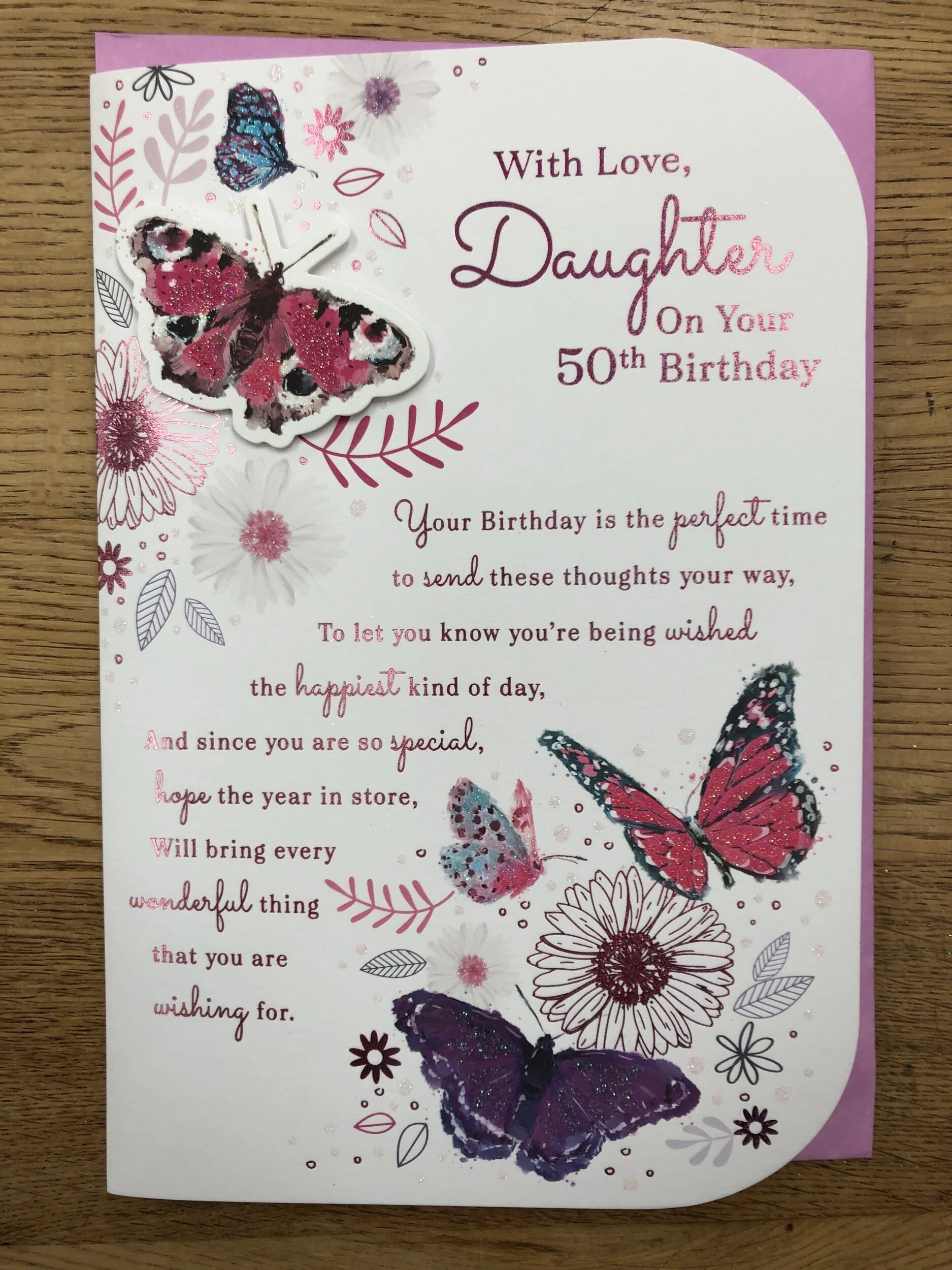 Special Daughter 50th Birthday card is an extra special book type of design, HAND FINISHED and features a sparkly black 3D embellishment, a 3D butterflies attachment, effective foiling, effective flittering and inside are 7 pages of Loving Words on full colour illustrated inserts with a foiled attachment on the last page - fabulous card 😍