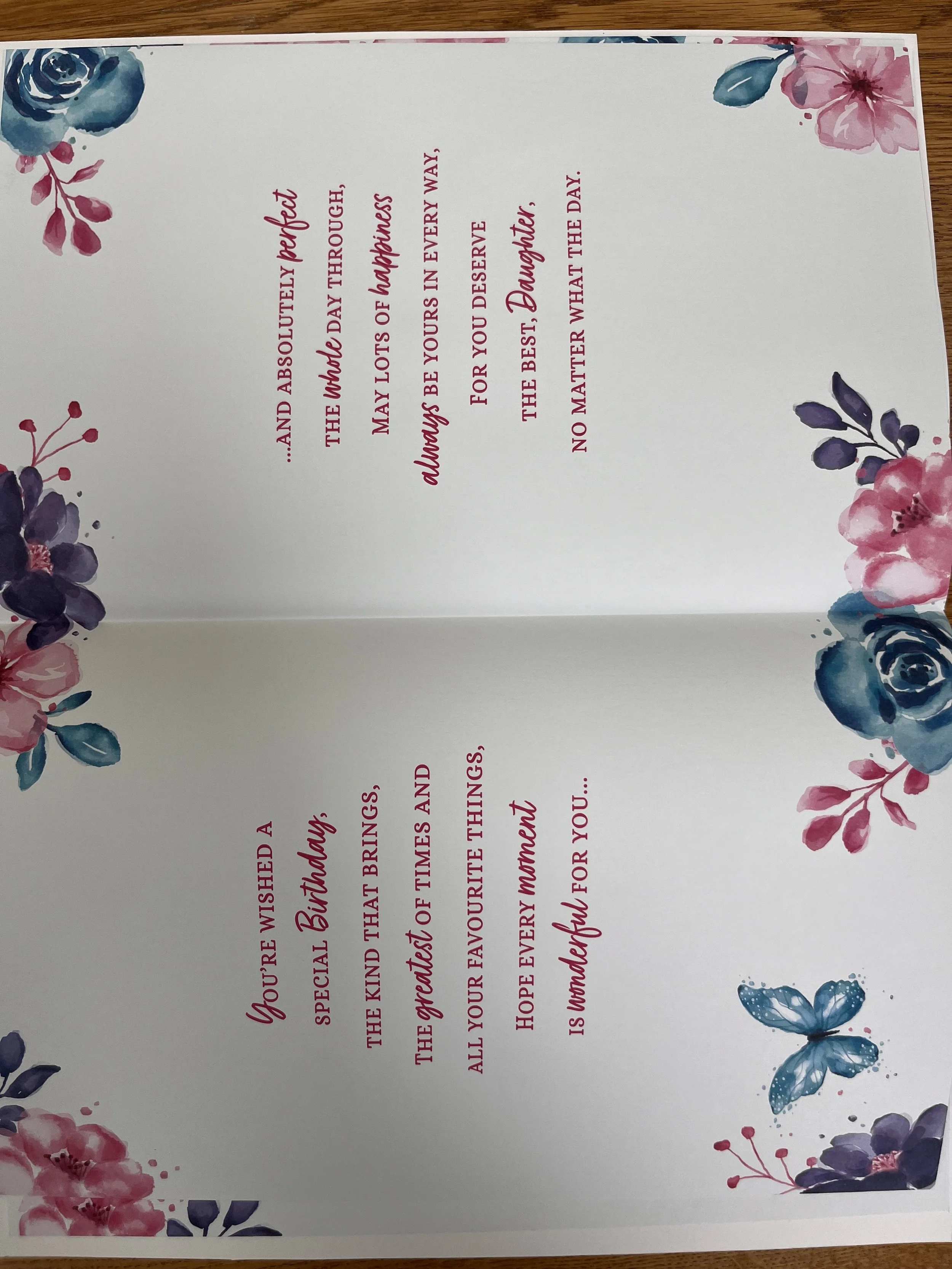 Special Daughter 50th birthday card is a unique, extra special HAND FINISHED book type of design that features a sparkly 3D embellishment, a 3D butterflies attachment, effective foiled, effective flitter and inside are 7 pages of Loving Words on full colour illustrated inserts with a foiled attachment on the last page - fabulous card 😍