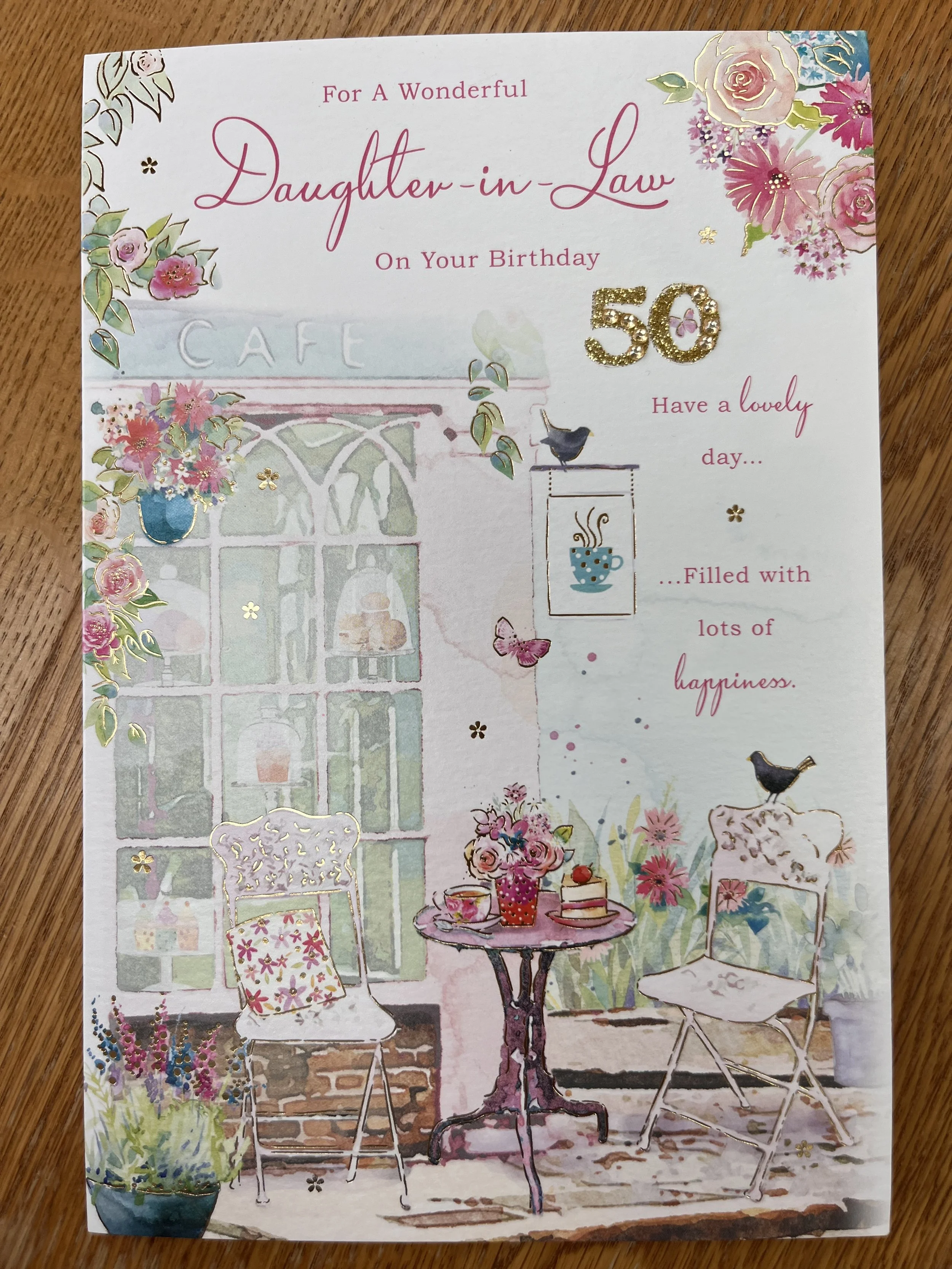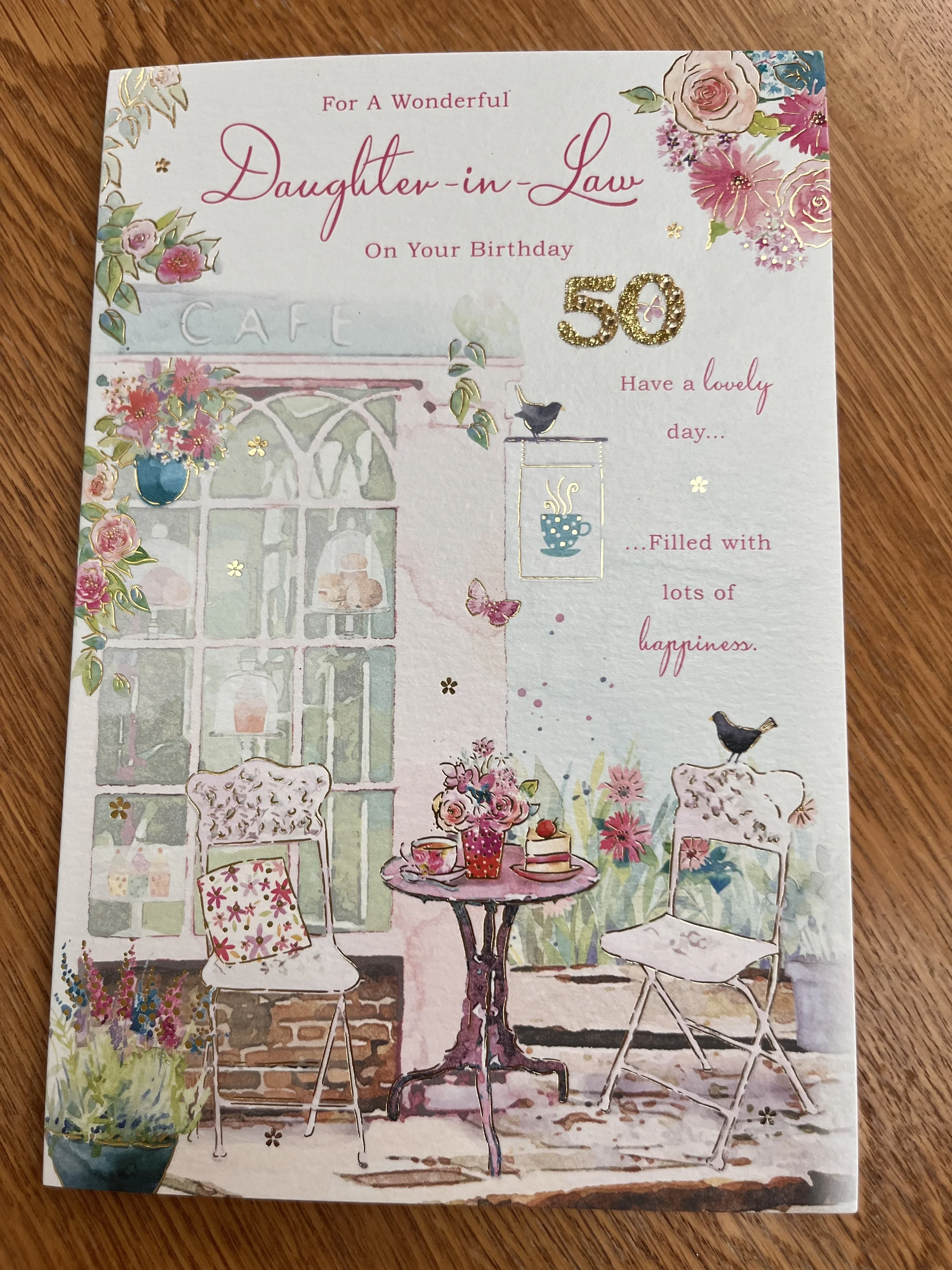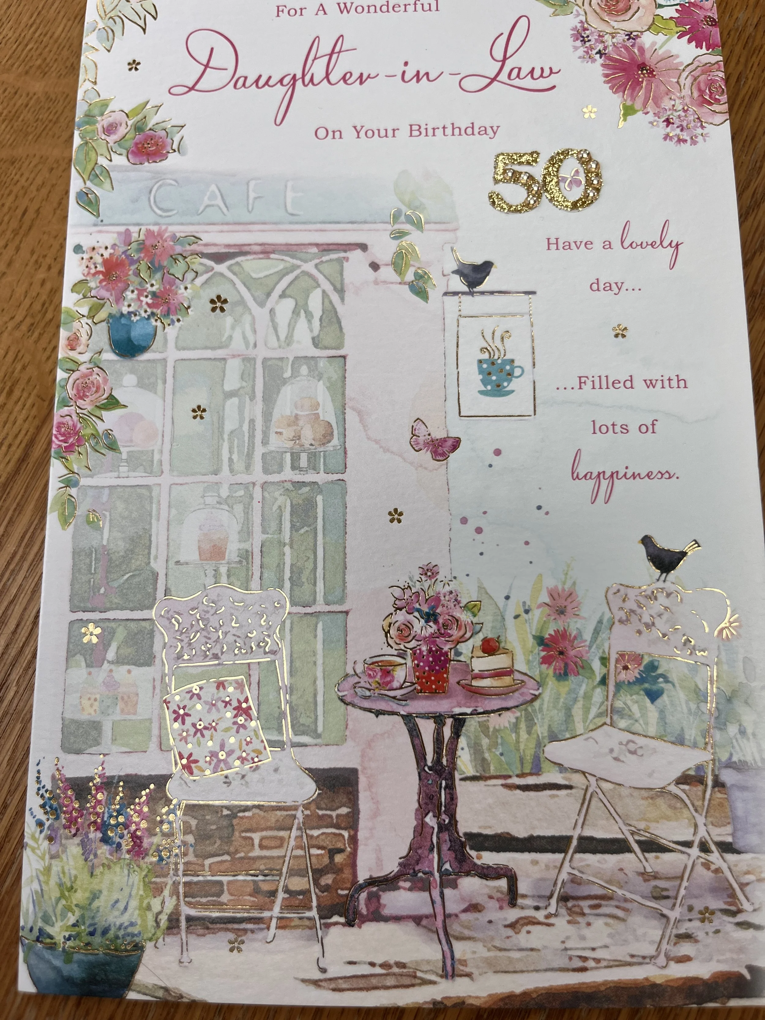 Daughter-in-law 50th Birthday Card is a HAND FINISHED design that features effective foil, an attachment, embossing and inside a full colour illustrated insert