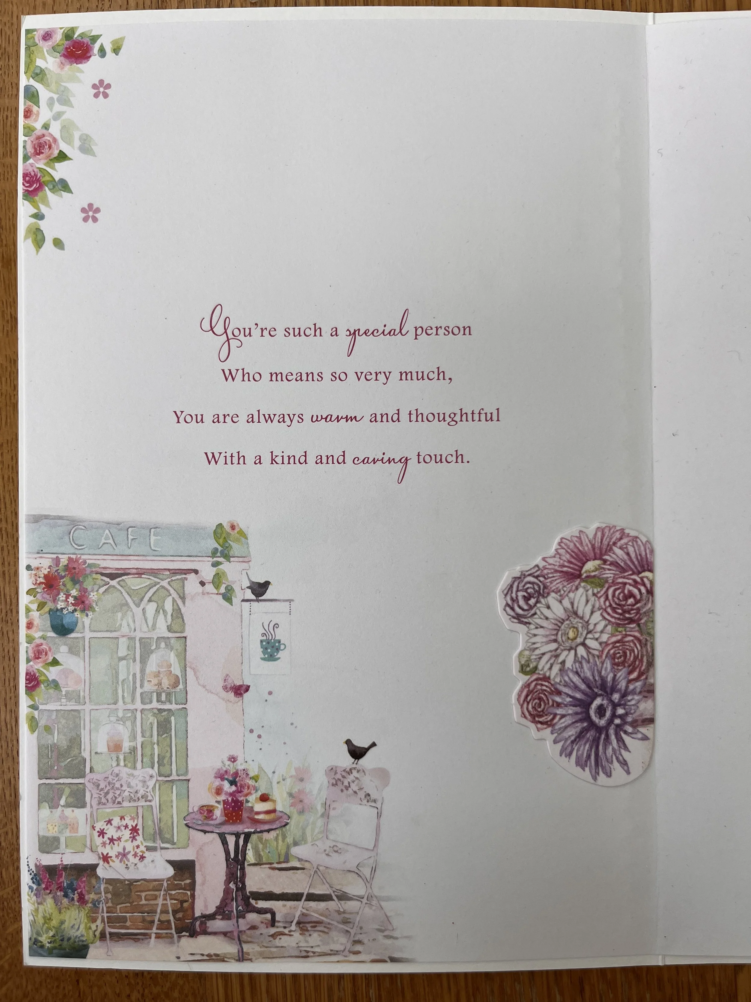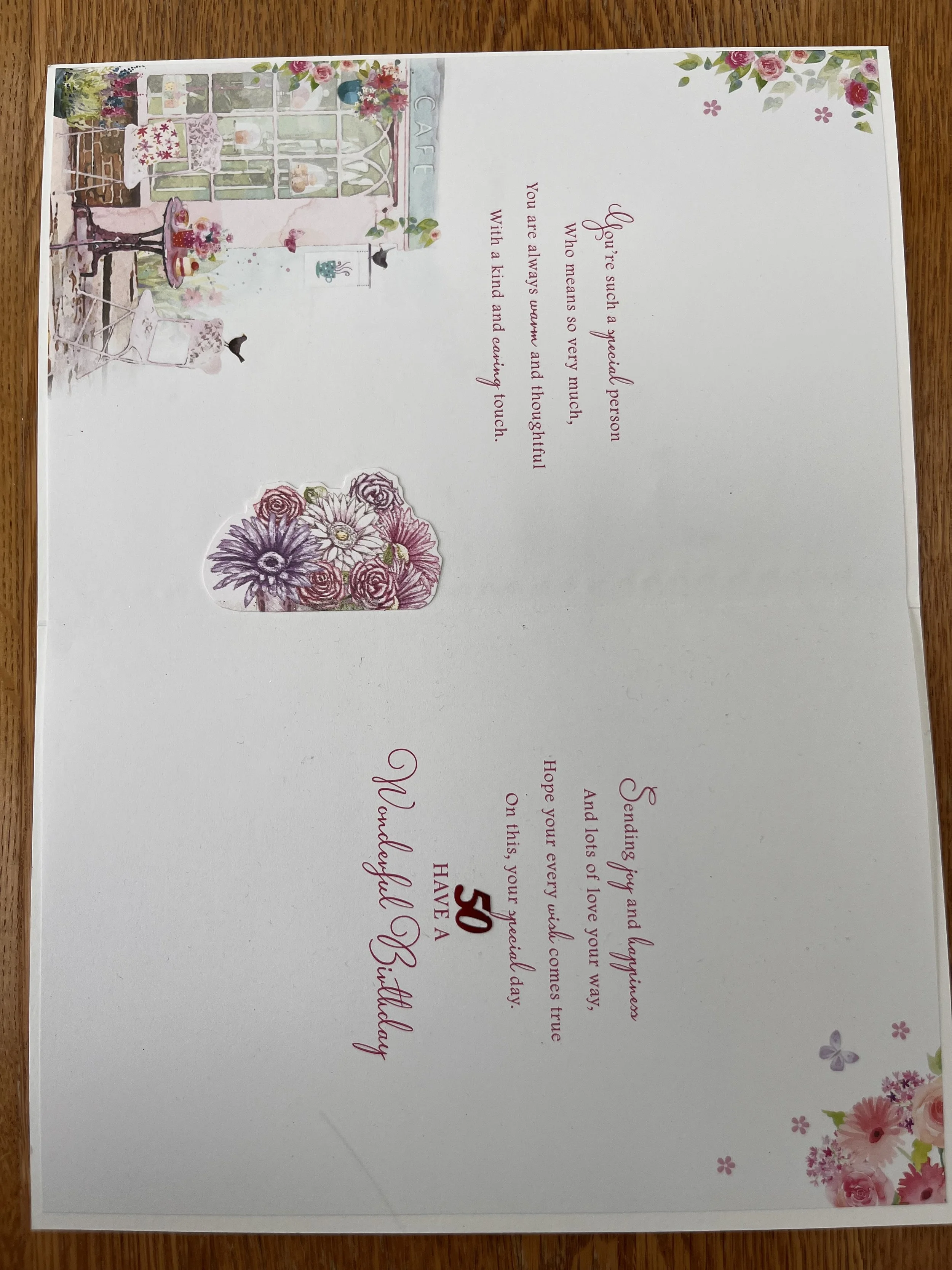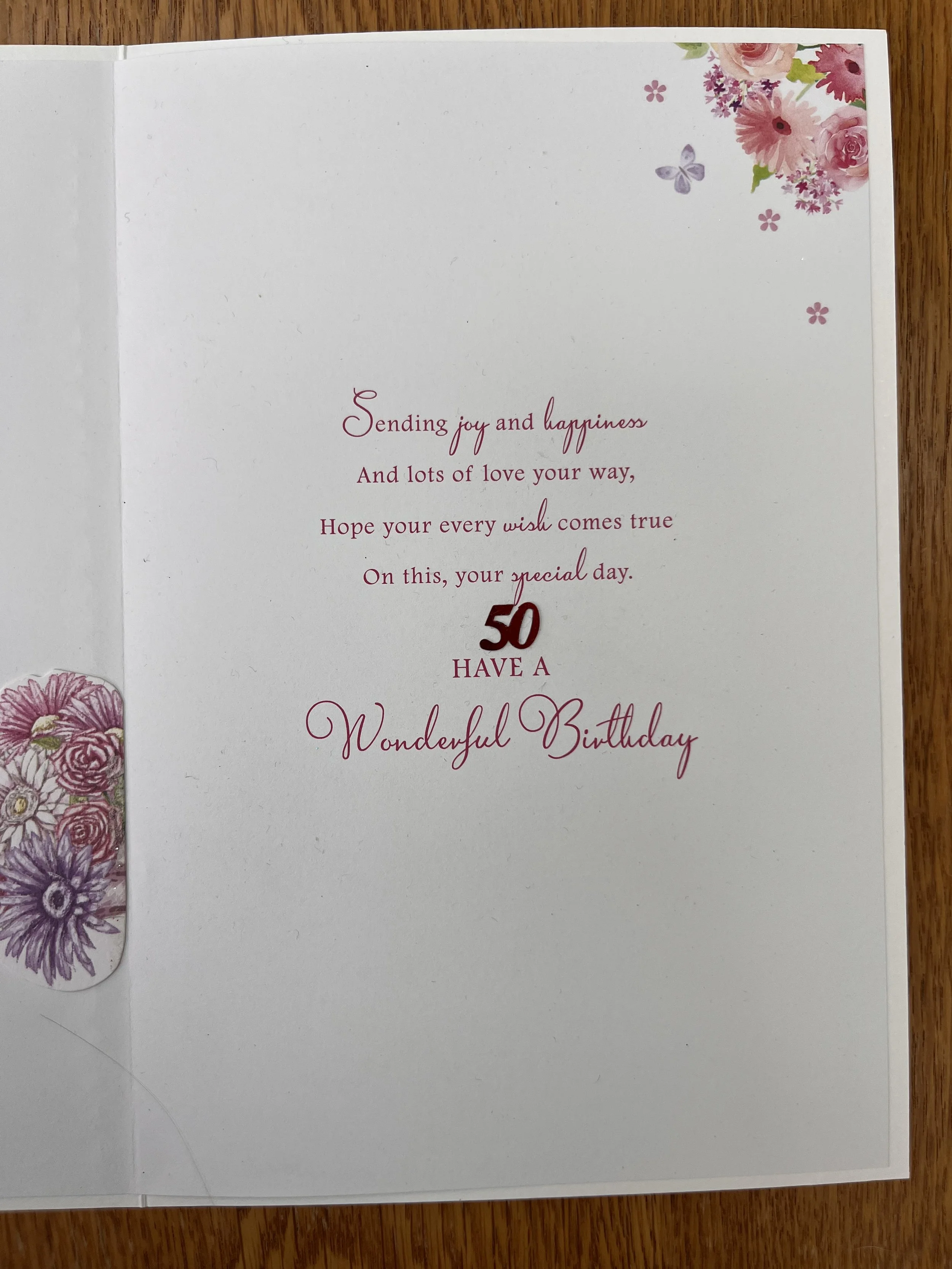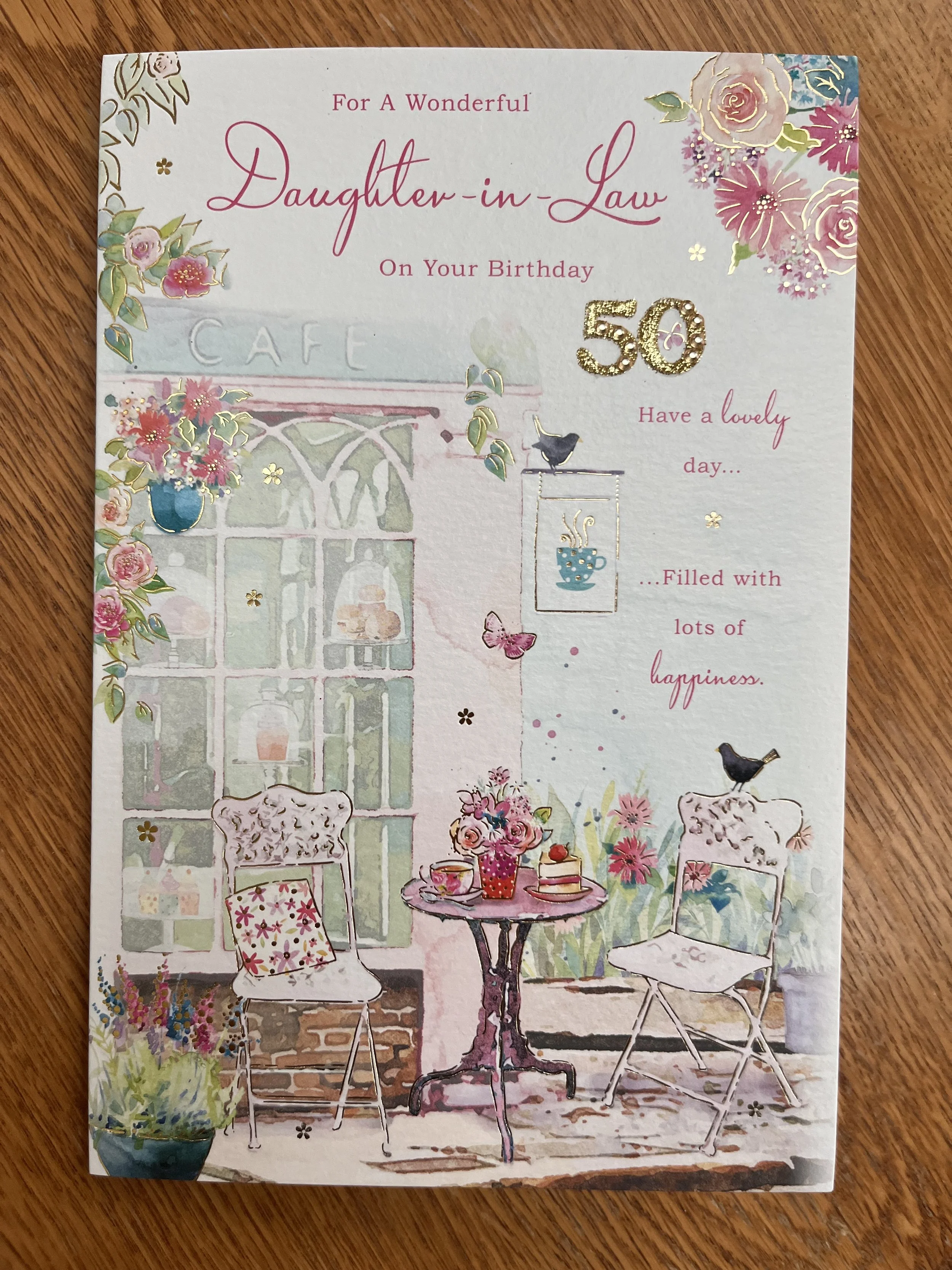Daughter-in-law 50th Birthday Card is a HAND FINISHED design that features effective foil, an attachment, embossing and inside a full colour illustrated insert