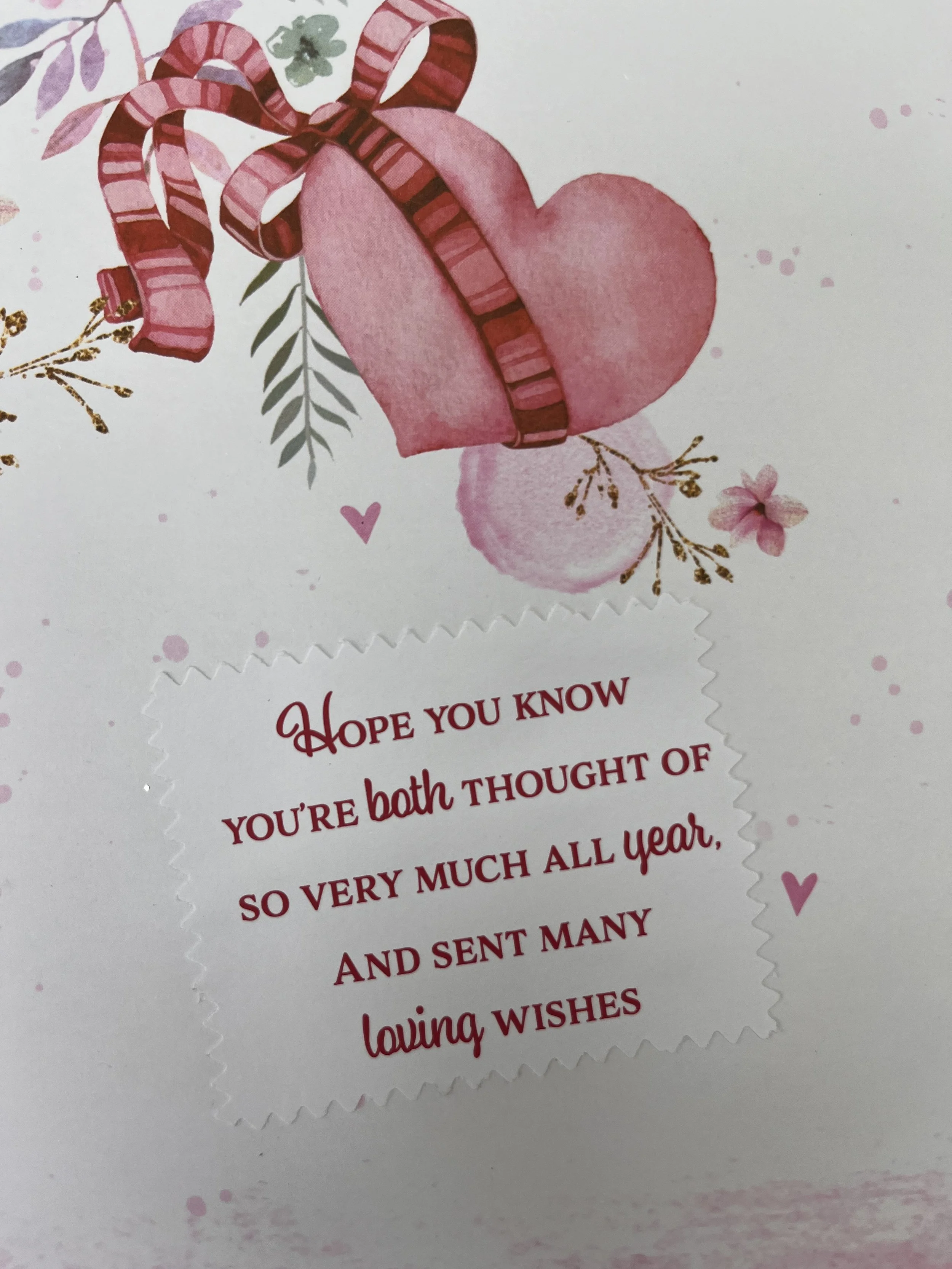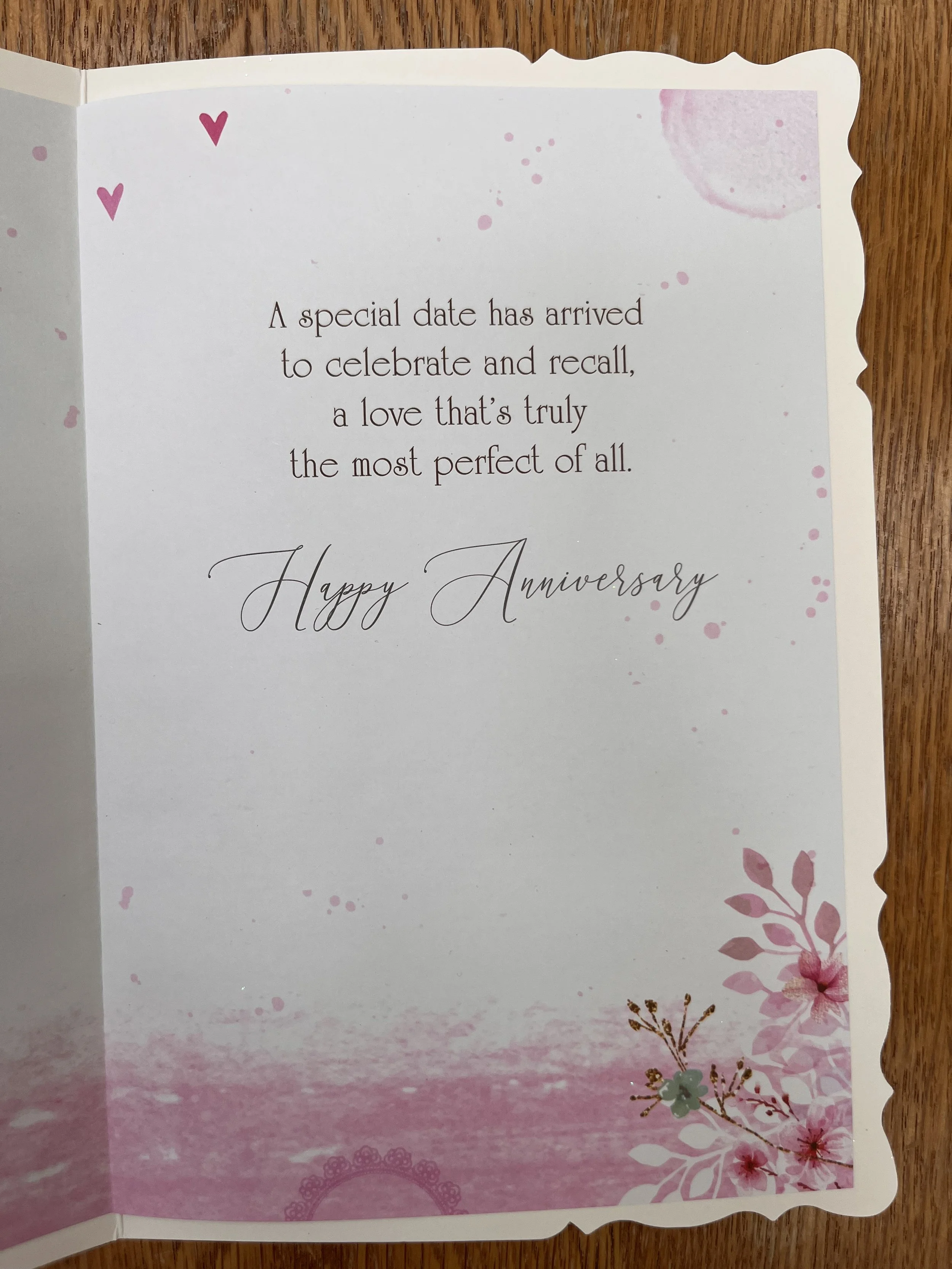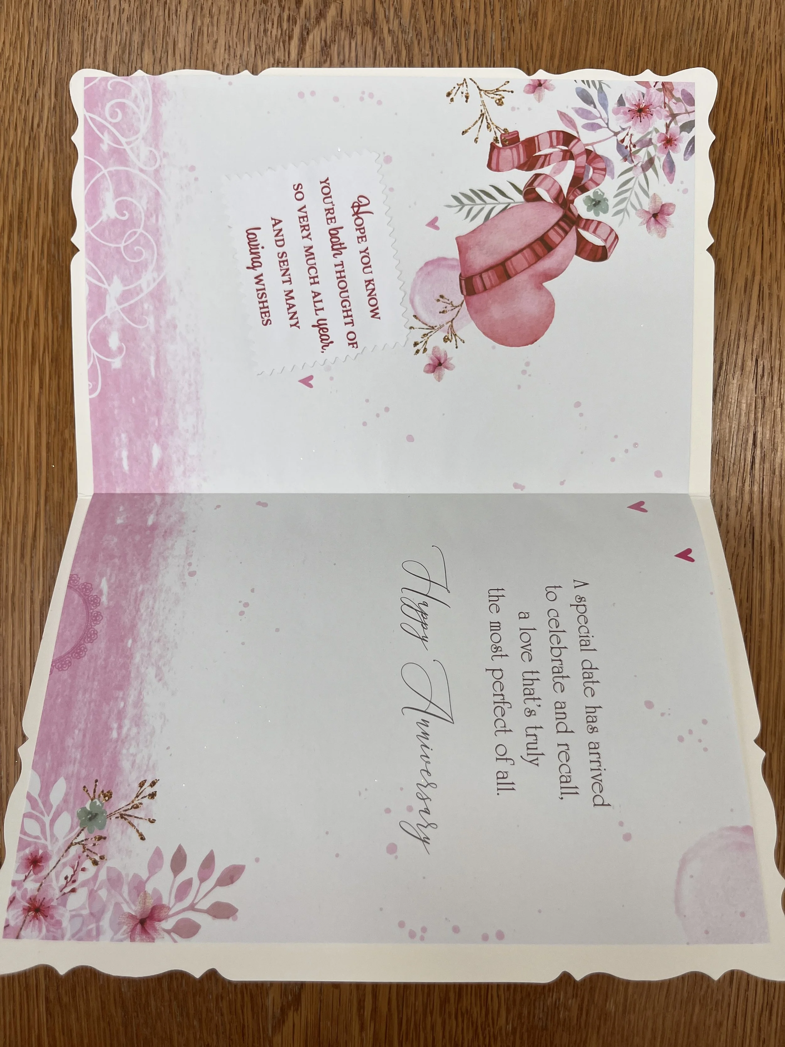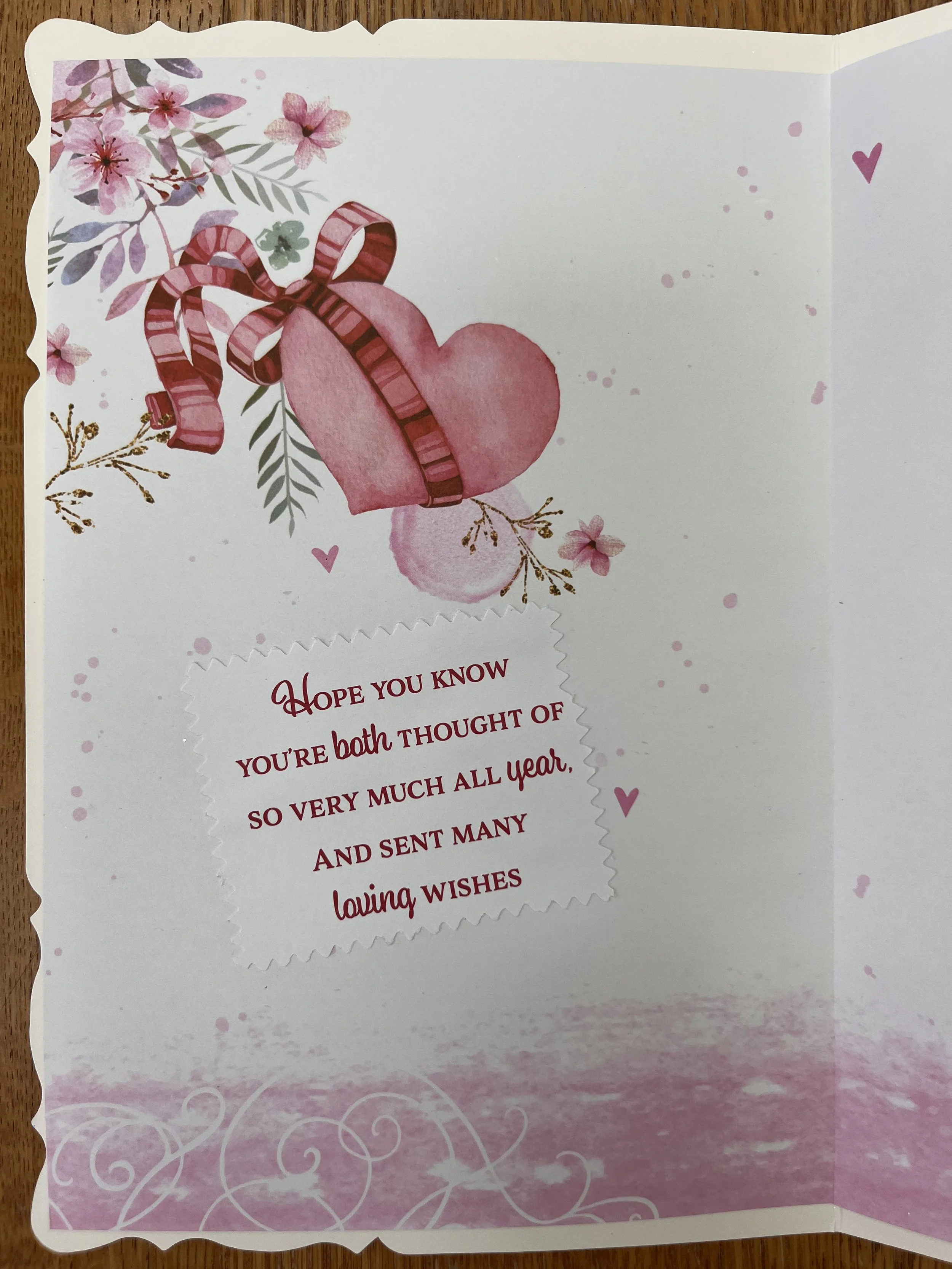 Diamond Wedding Anniversary card “|Loving Words “ design features scalloped edging, encapsulated flitter on unique photographic imagery, hand finished with a 3D attachment, with "Loving Words" that continue inside on a top quality insert