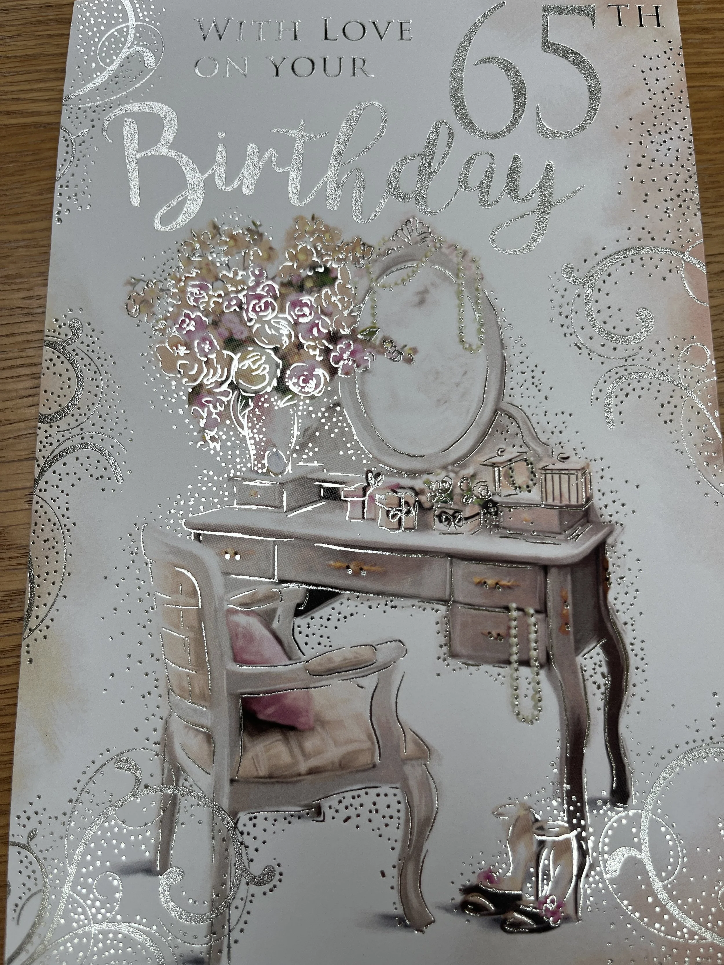 Ladies 65th Birthday Card features effective silver foiling and a full colour illustrated insert inside