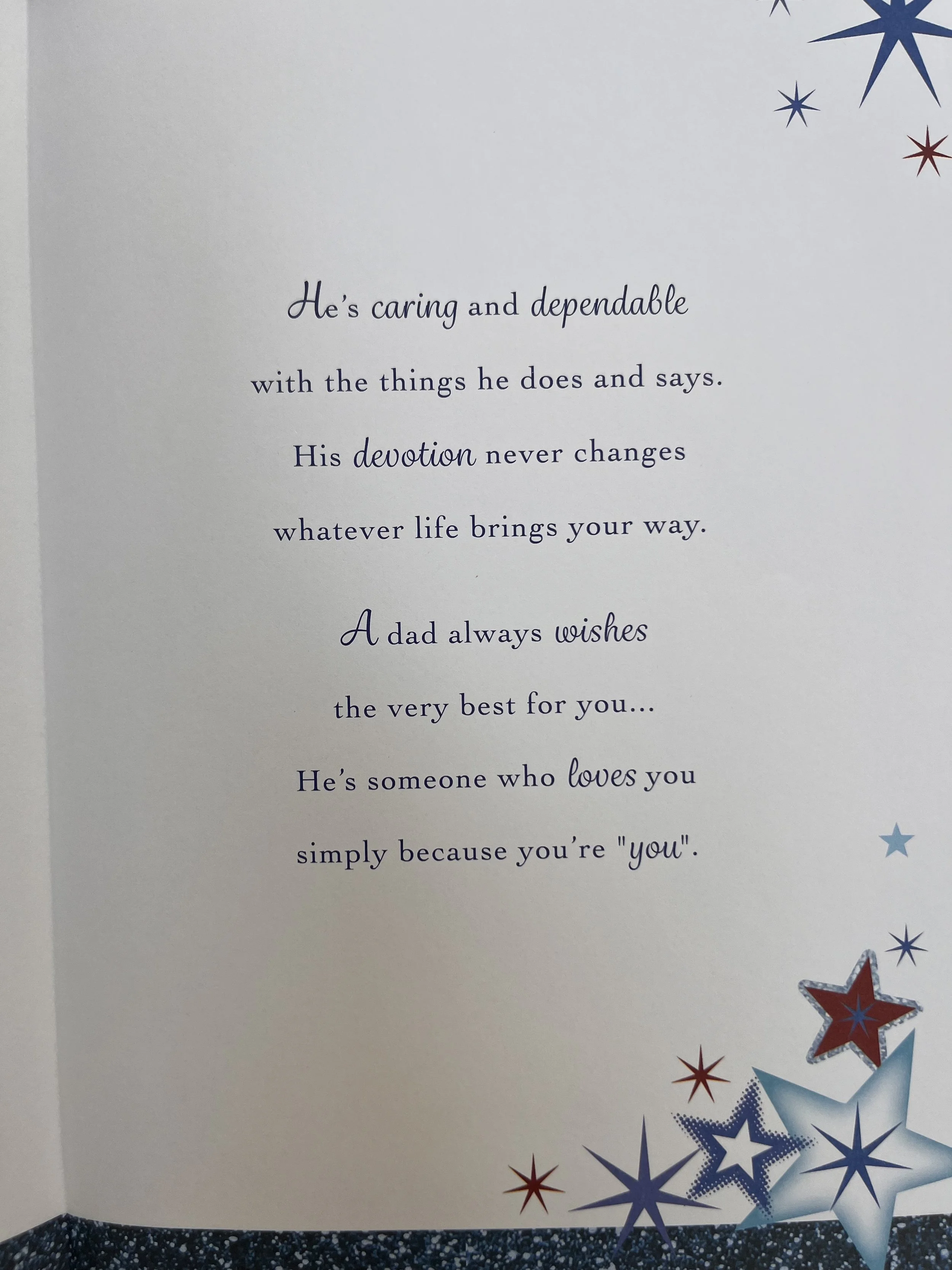 Dad 65th Birthday card is an extra special book style of design, unique as it’s HAND FINISHED and features a sparkly blue 65th embellishment, a 3D attachment, effective foiled, embossing, a 3d star shaped embellishment and Inside 7 pages of Loving Words on full colour illustrated inserts and a foiled attachment on the last page