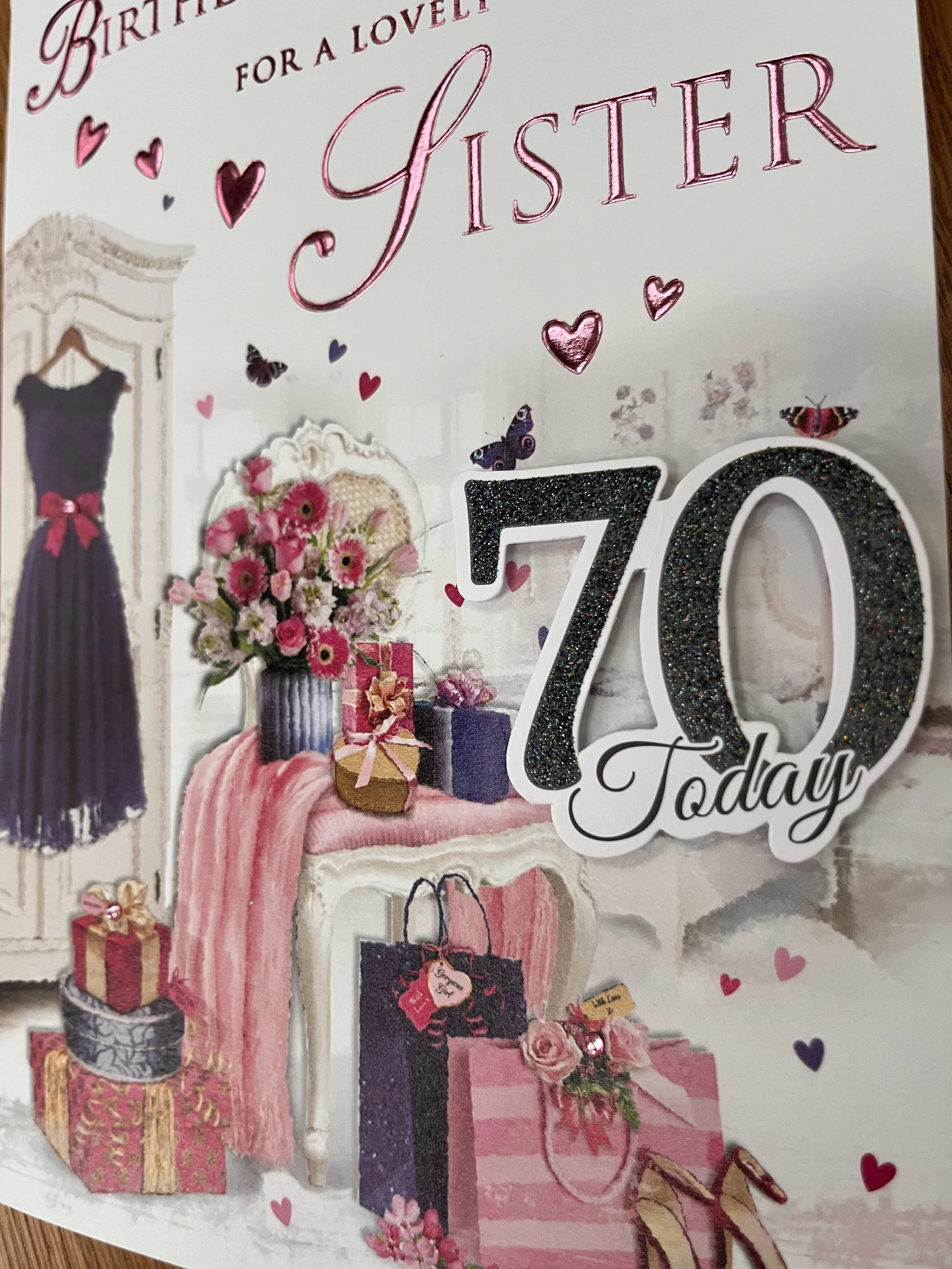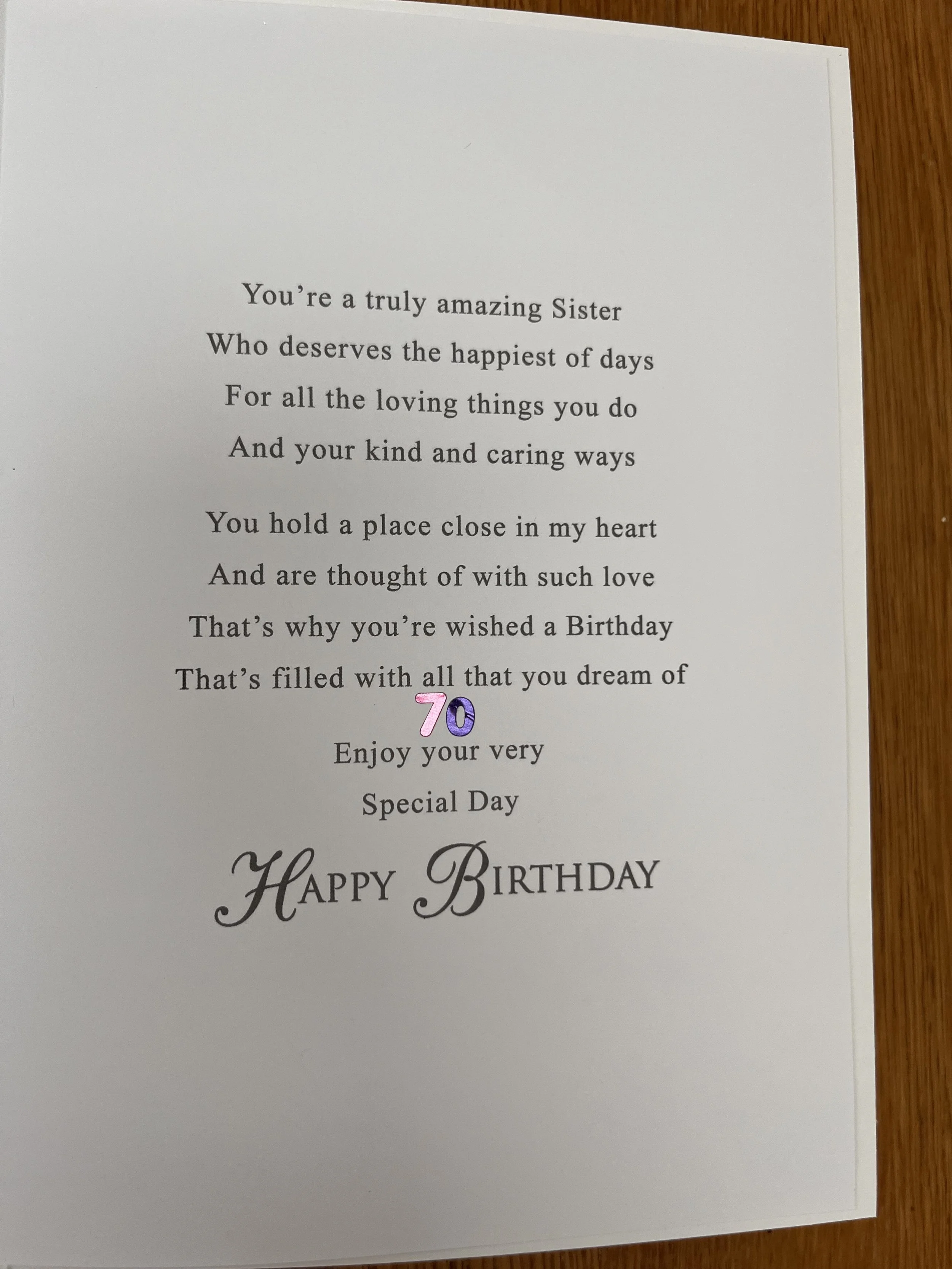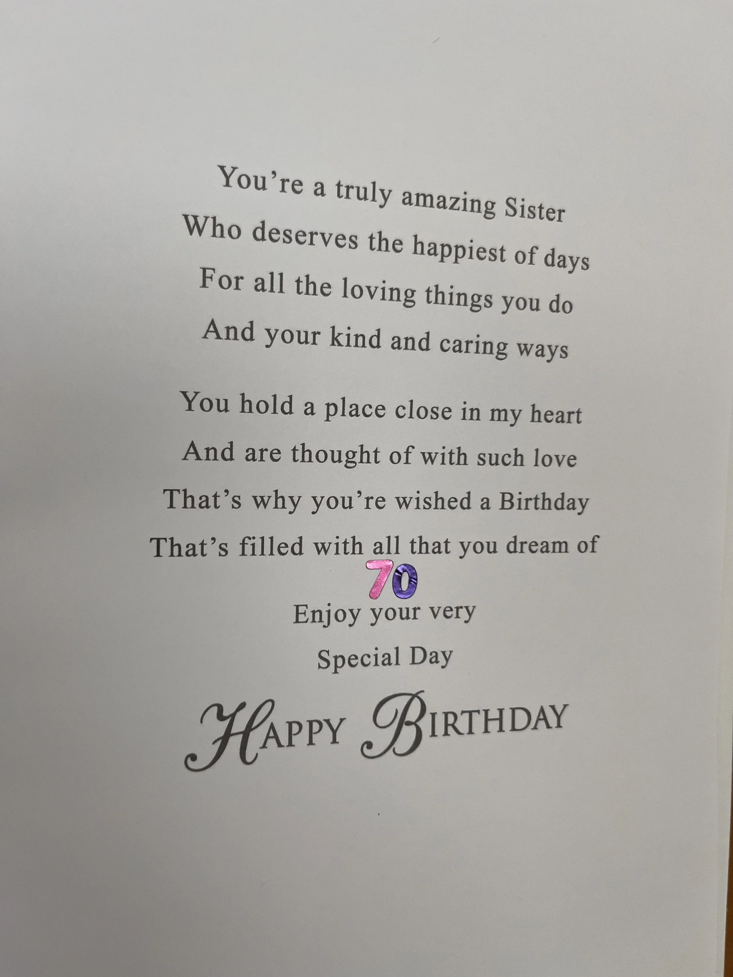 Sister 70th Birthday Card is an extra special, unique, HAND FINISHED book type of design that features a foiled 3D 70 embellishment, effective foil, a 3D floral attachment and Inside 7 pages of "Loving Words" on top quality , full colour illustrated inserts with a foil attachment on the last page - as shown in photos 😊
