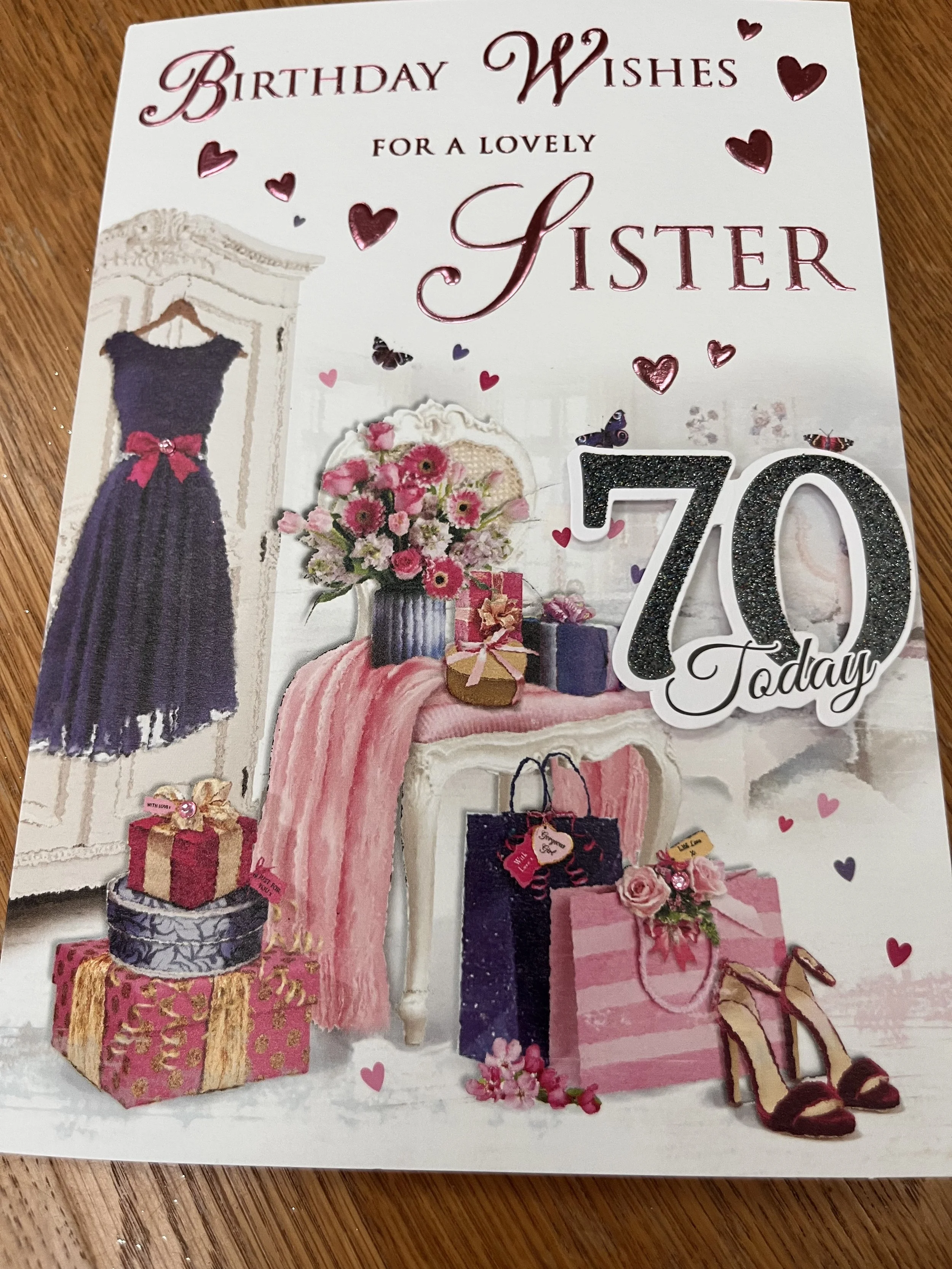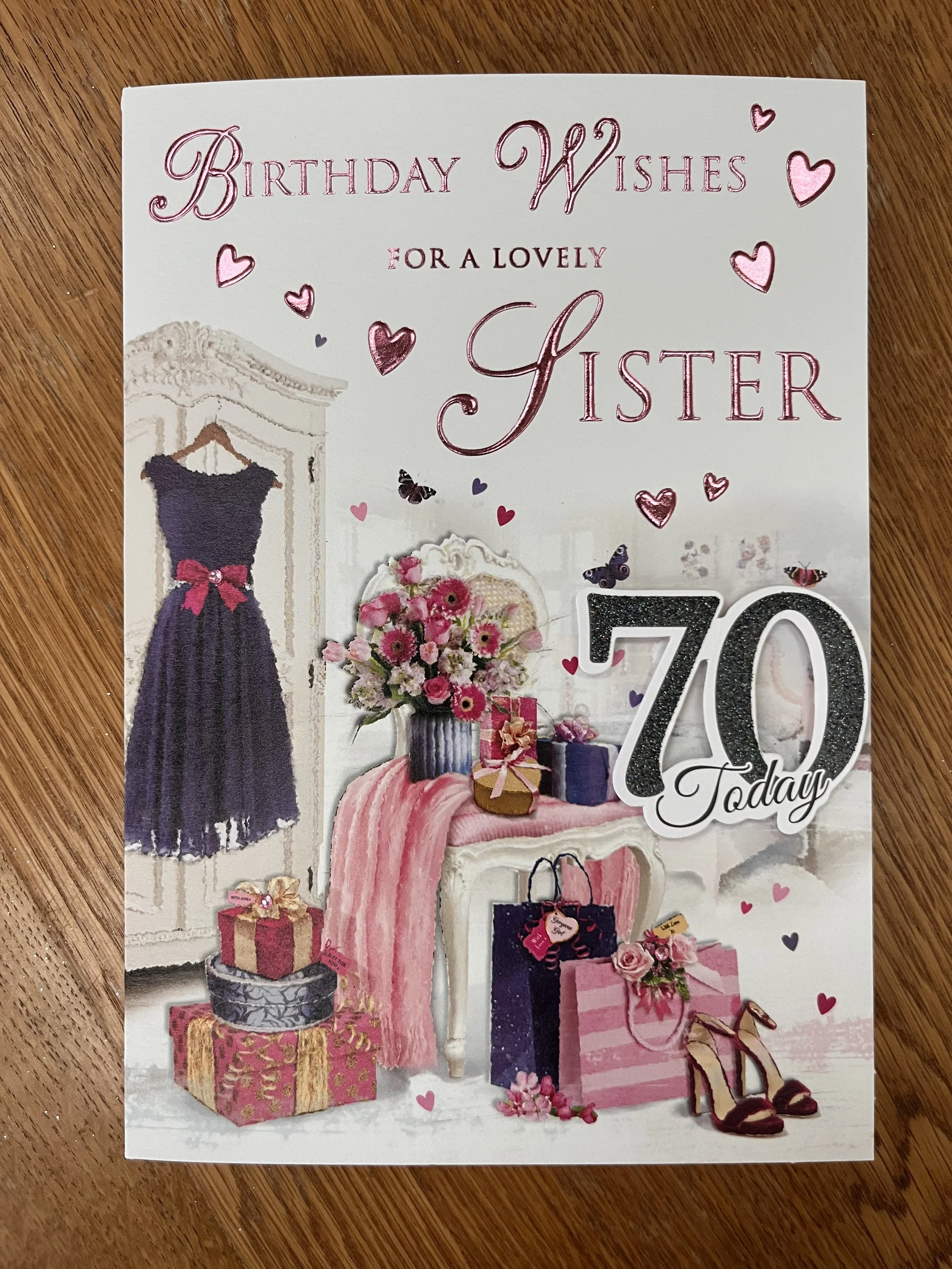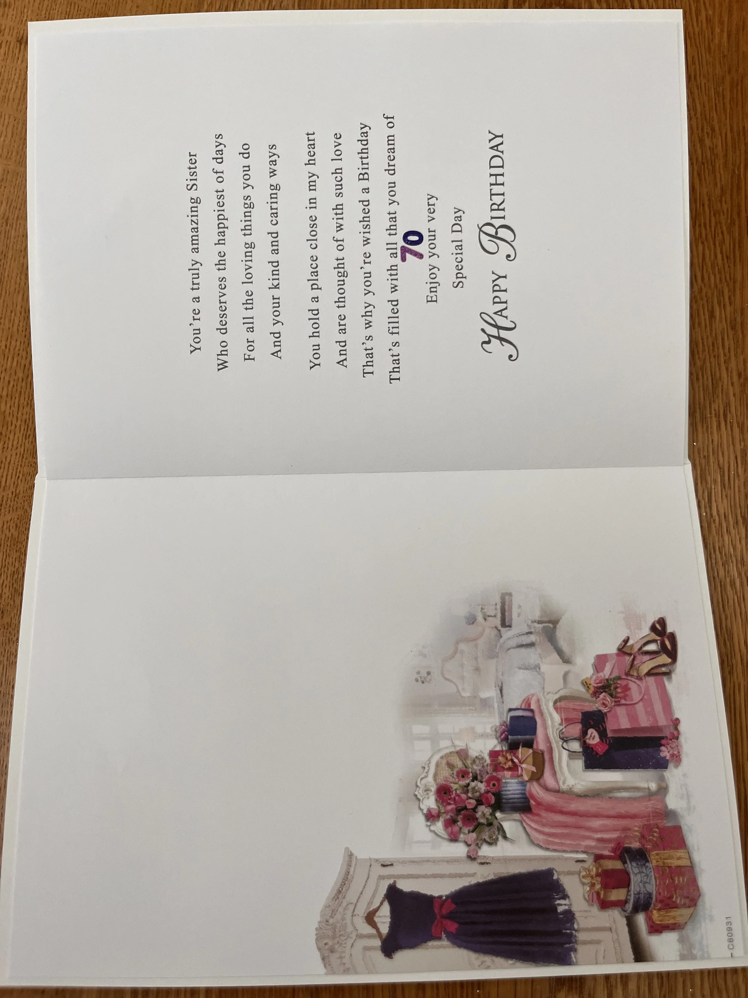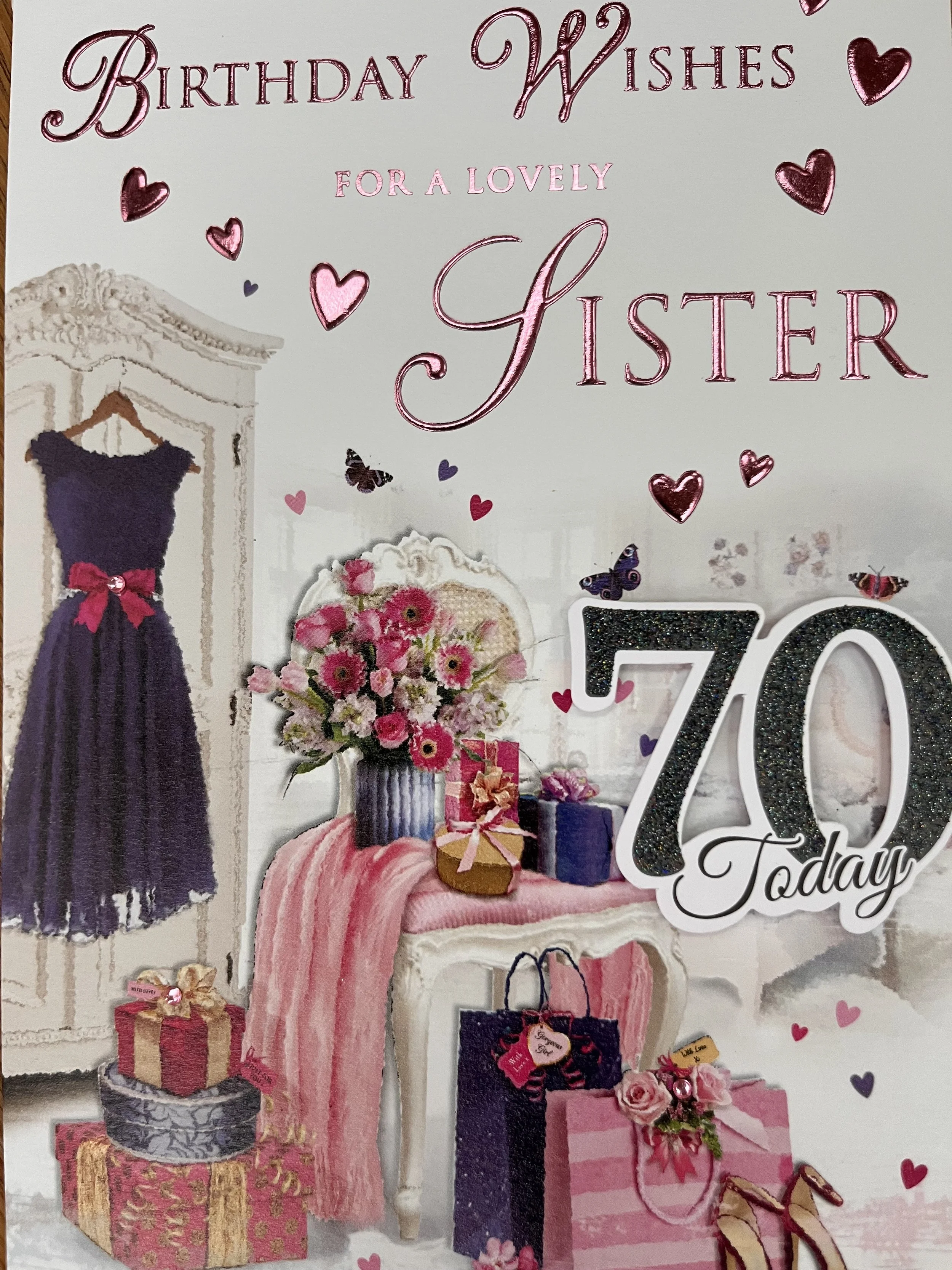 Sister 70th Birthday Card is an extra special, unique, HAND FINISHED book type of design that features a foiled 3D 70 embellishment, effective foil, a 3D floral attachment and Inside 7 pages of "Loving Words" on top quality , full colour illustrated inserts with a foil attachment on the last page - as shown in photos 😊
