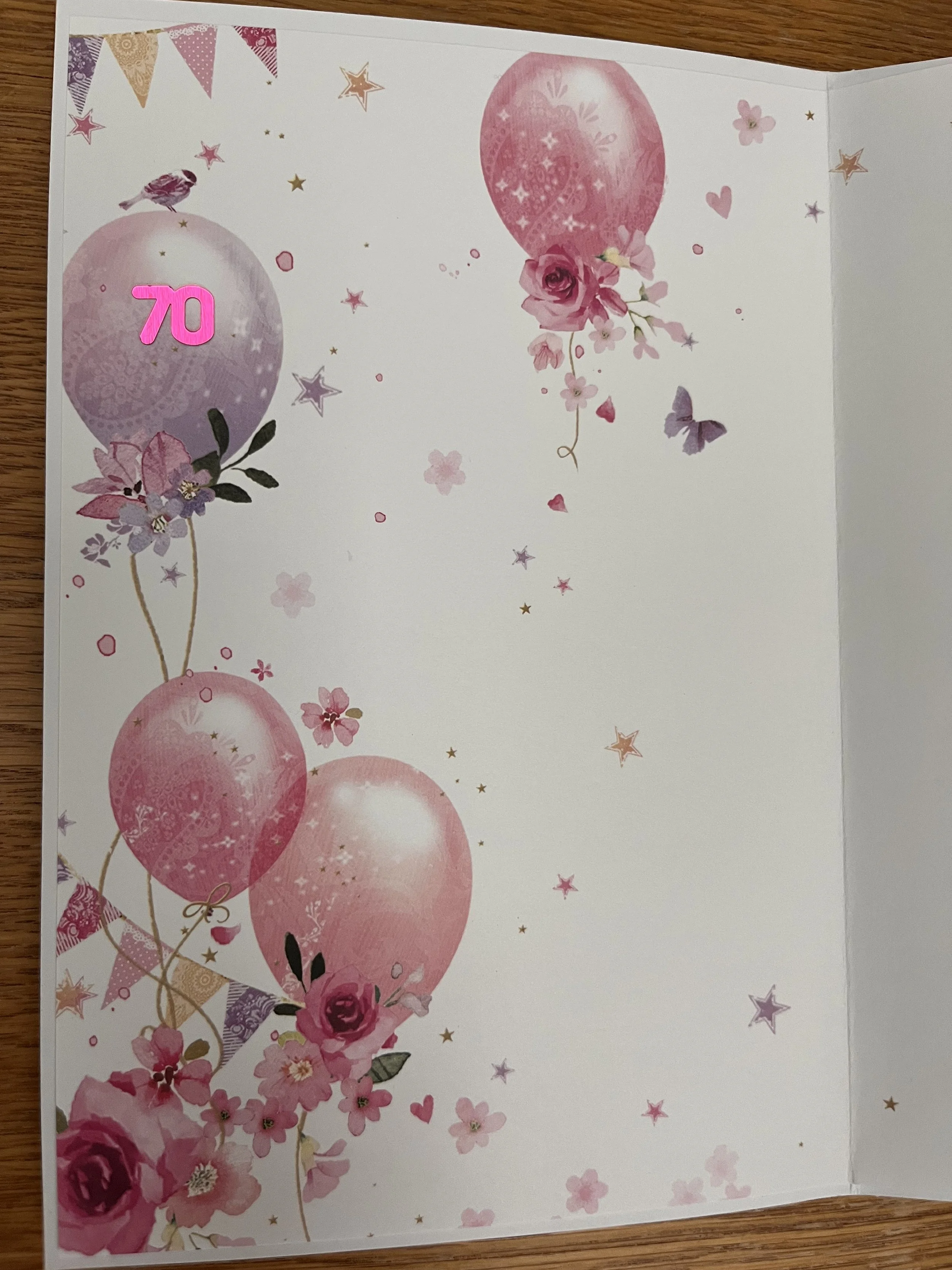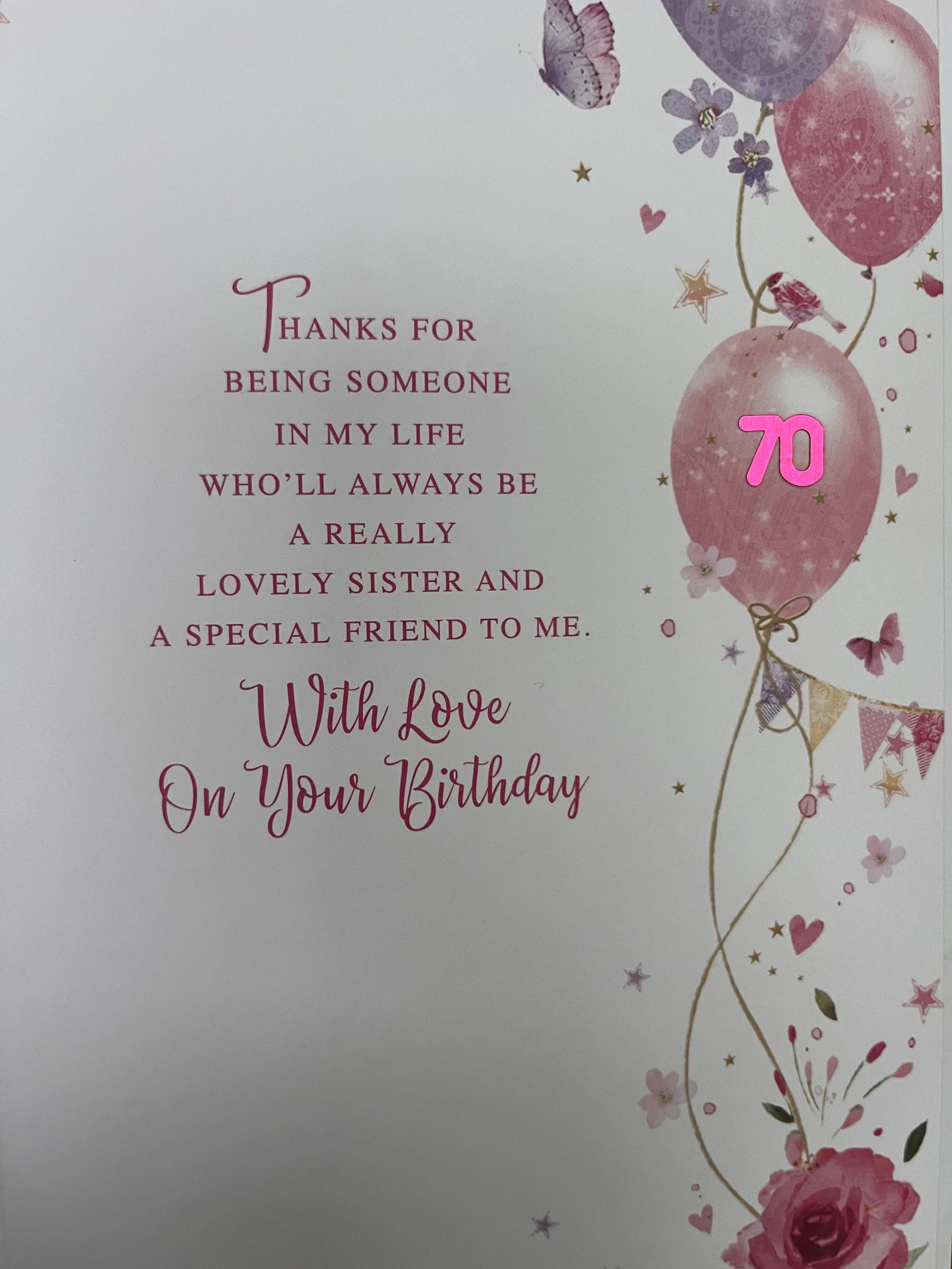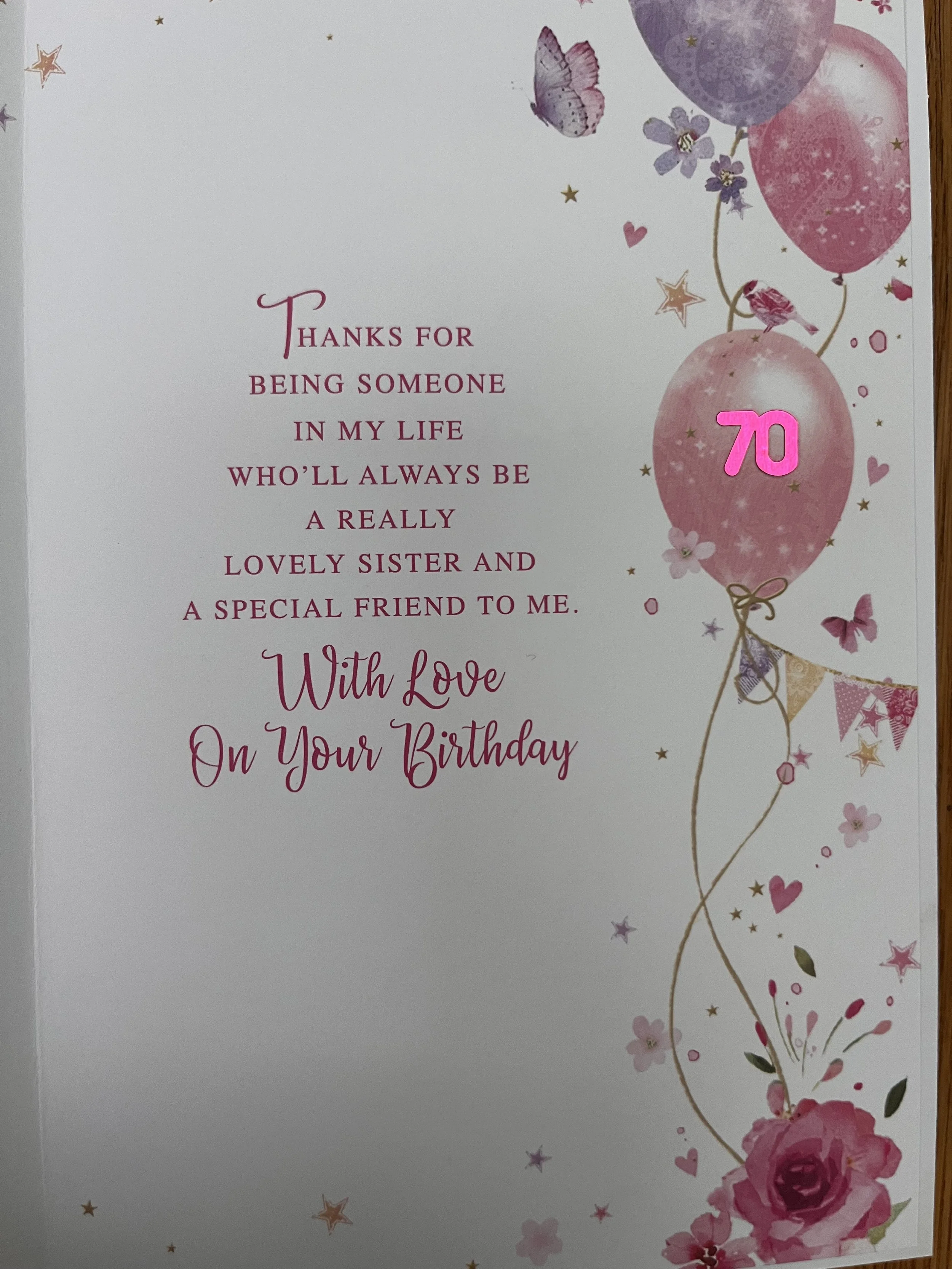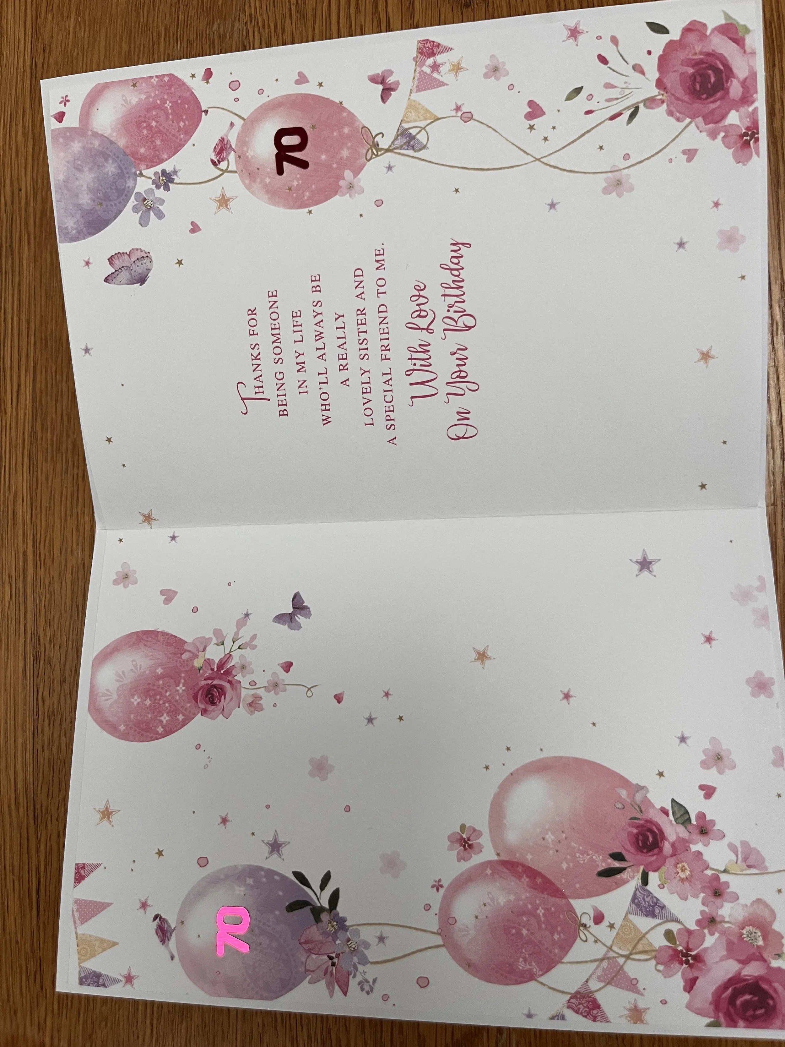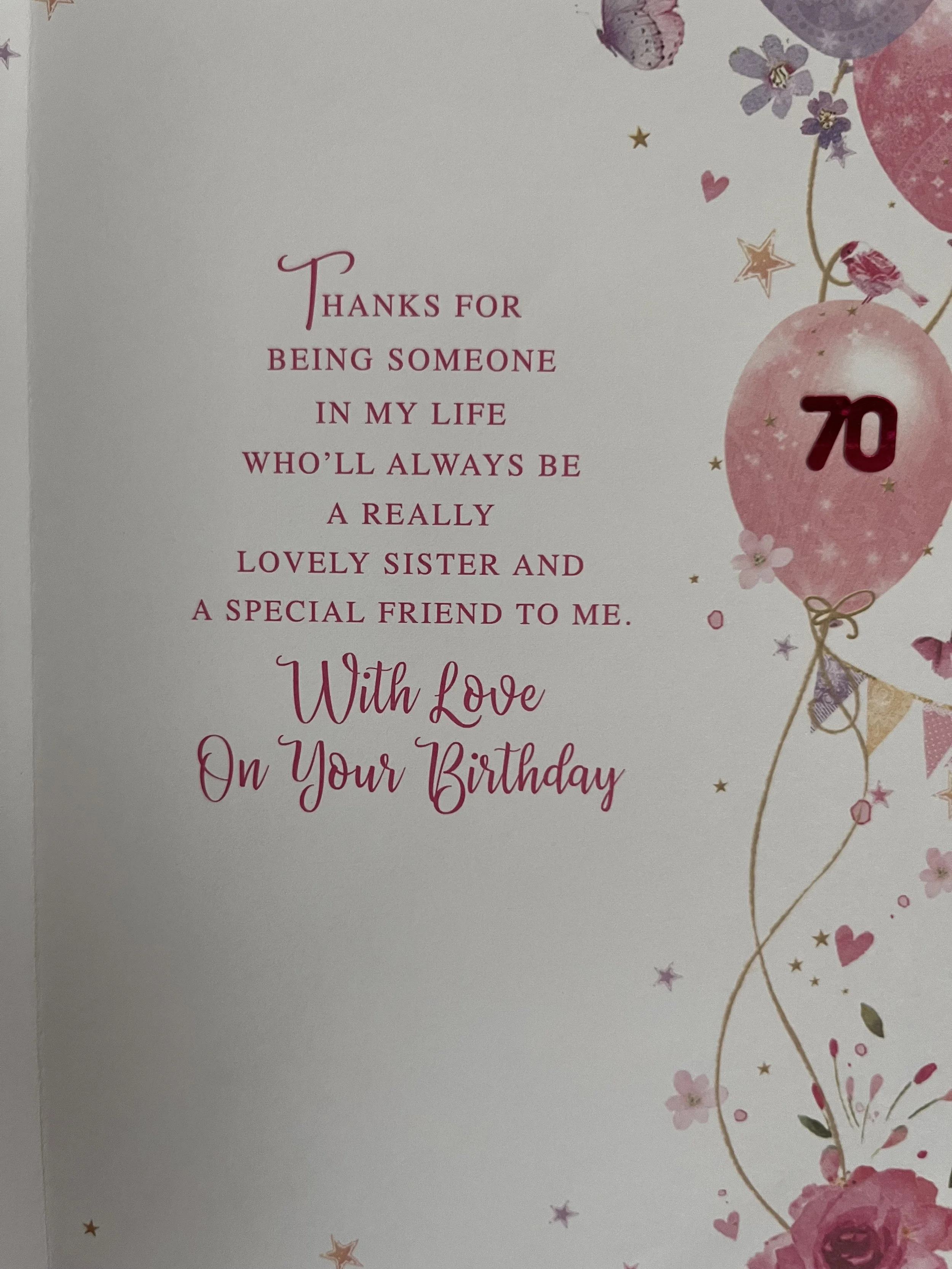 Sister 70th Birthday card is an extra special, unique, Hand Finished book type of design that features a foiled 3D 70 embellishment, effective foil, a 3D floral attachment and Inside 7 pages of "Loving Words" on top quality , full colour illustrated inserts with a foil attachment on the last page - as shown in photos 😊
