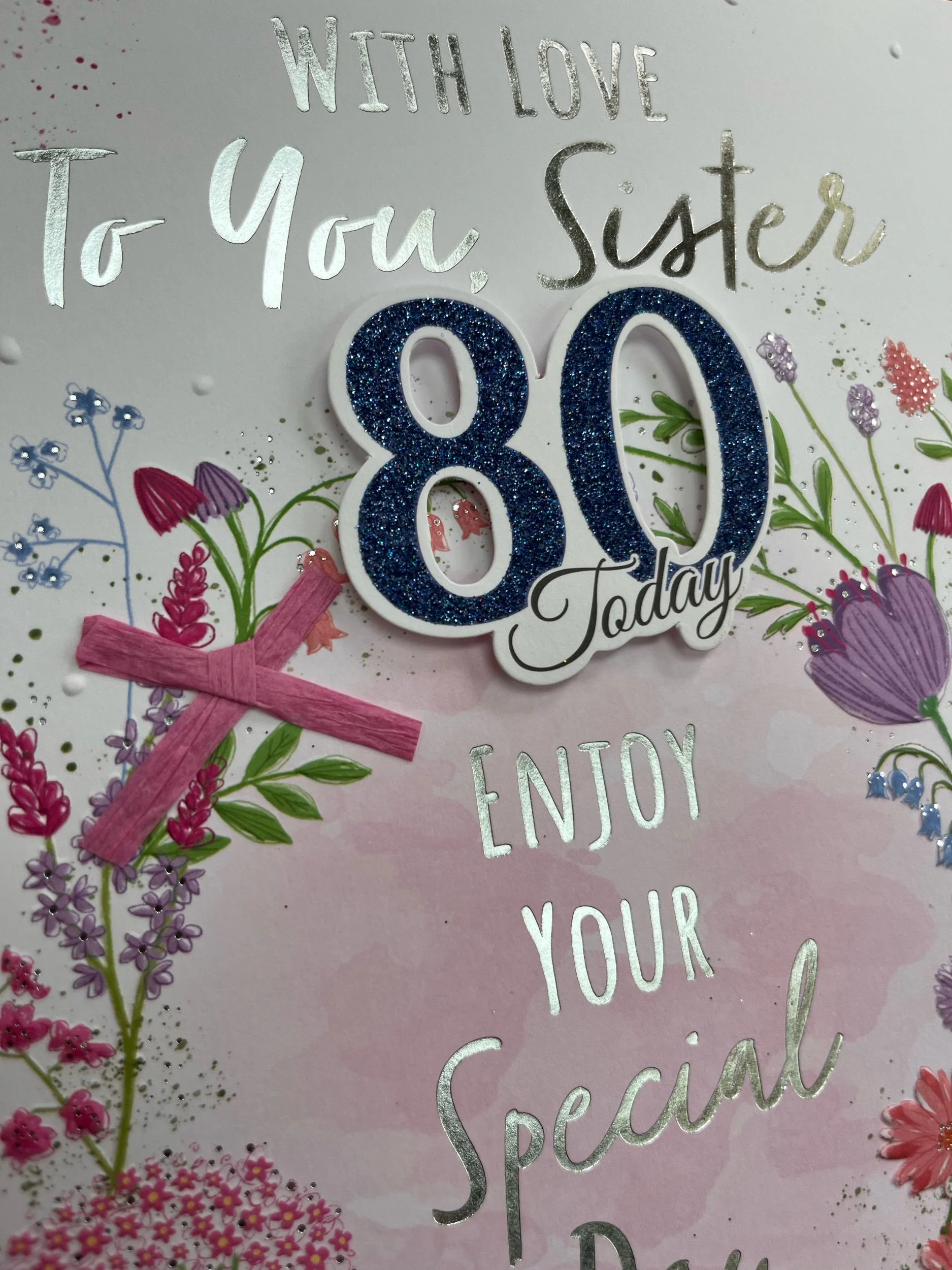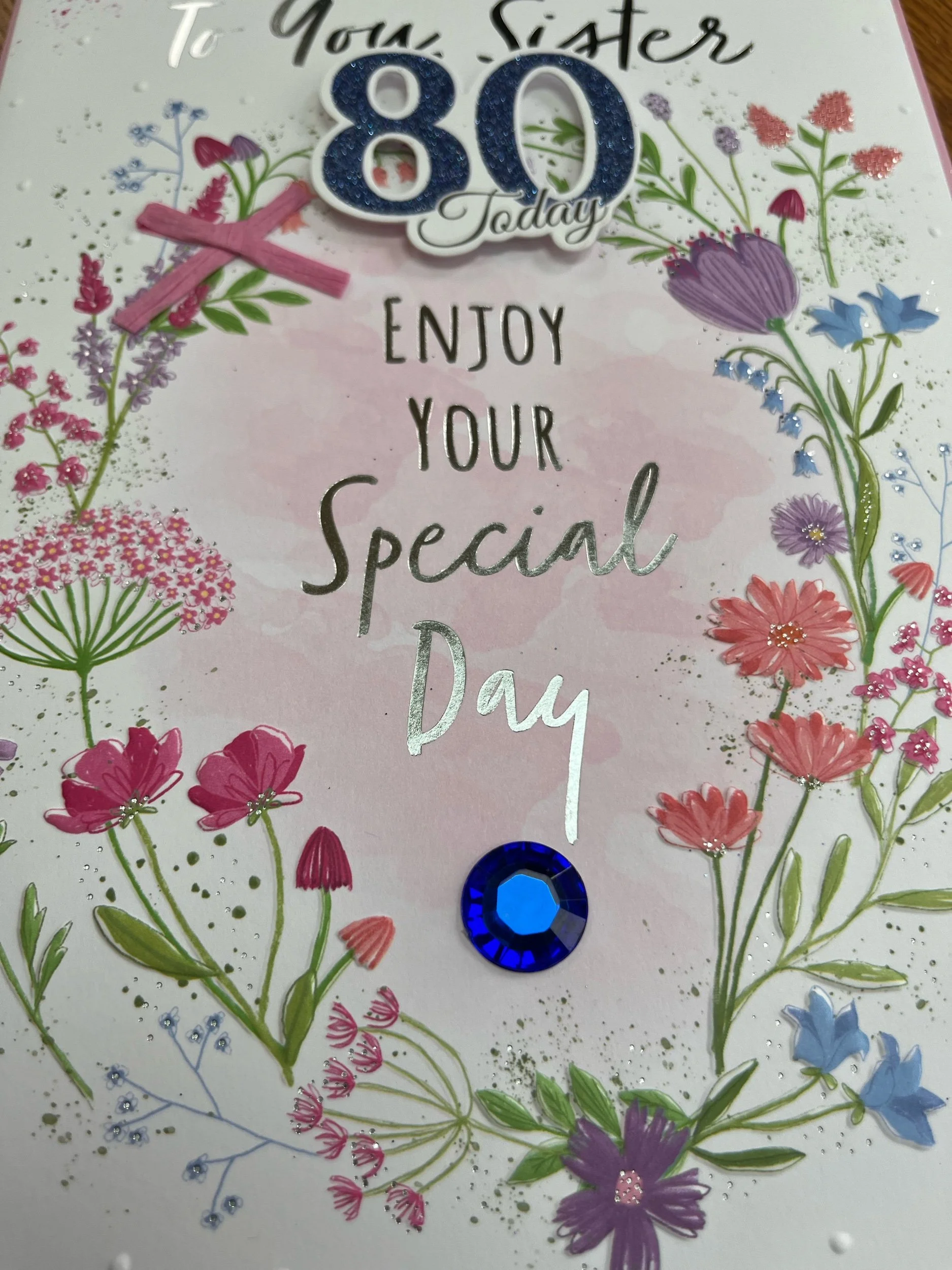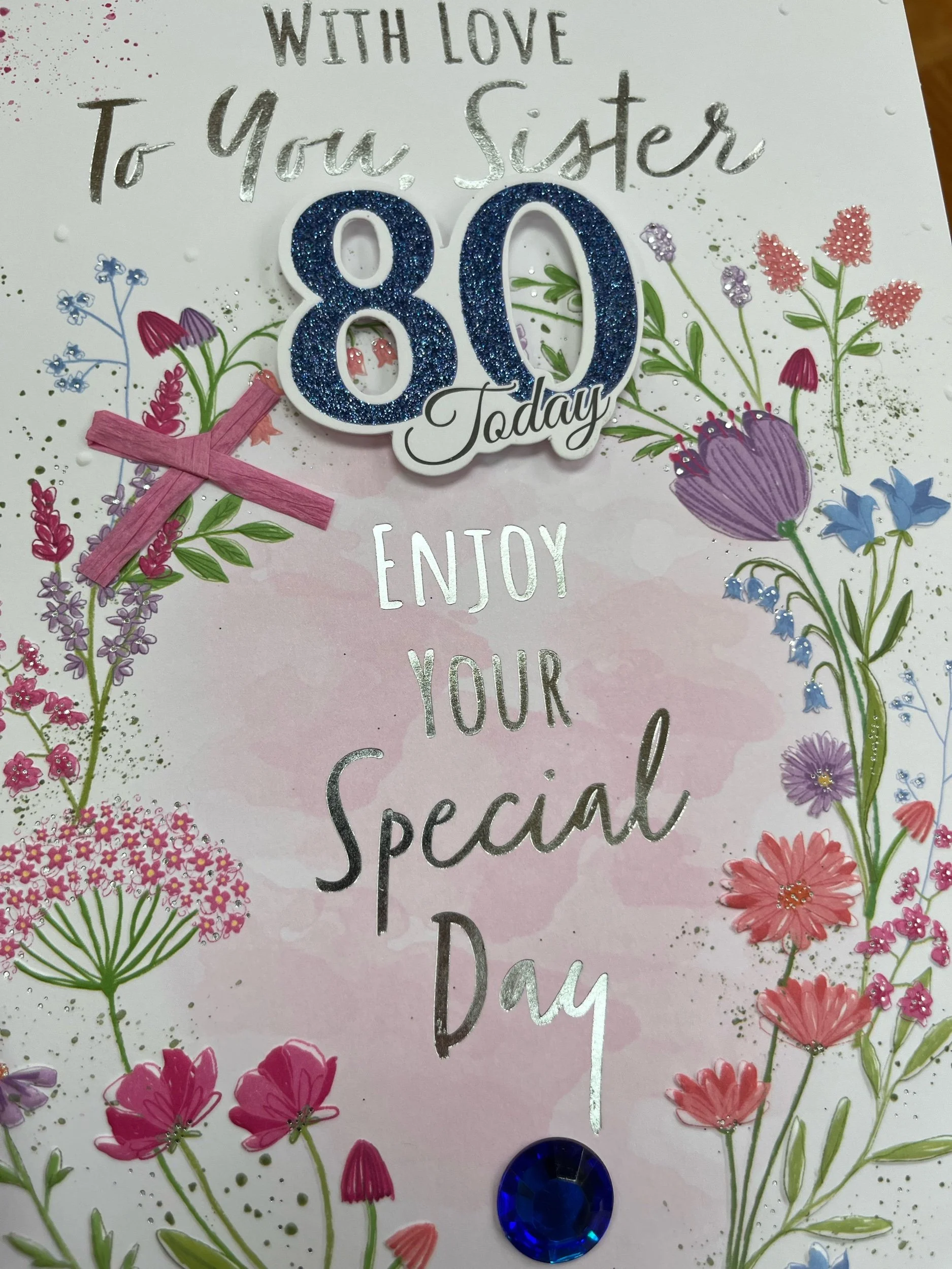 Sister 80th Birthday card Art Deco design is HAND FINISHED and features a shaped gold 3D attachment, diamanté effect embellishments, effective gold flittering and gold foiling , a 3D sparkly gold 80 embellishment and inside a full coloured insert with short but sweet verse and a gold foiled card attachment