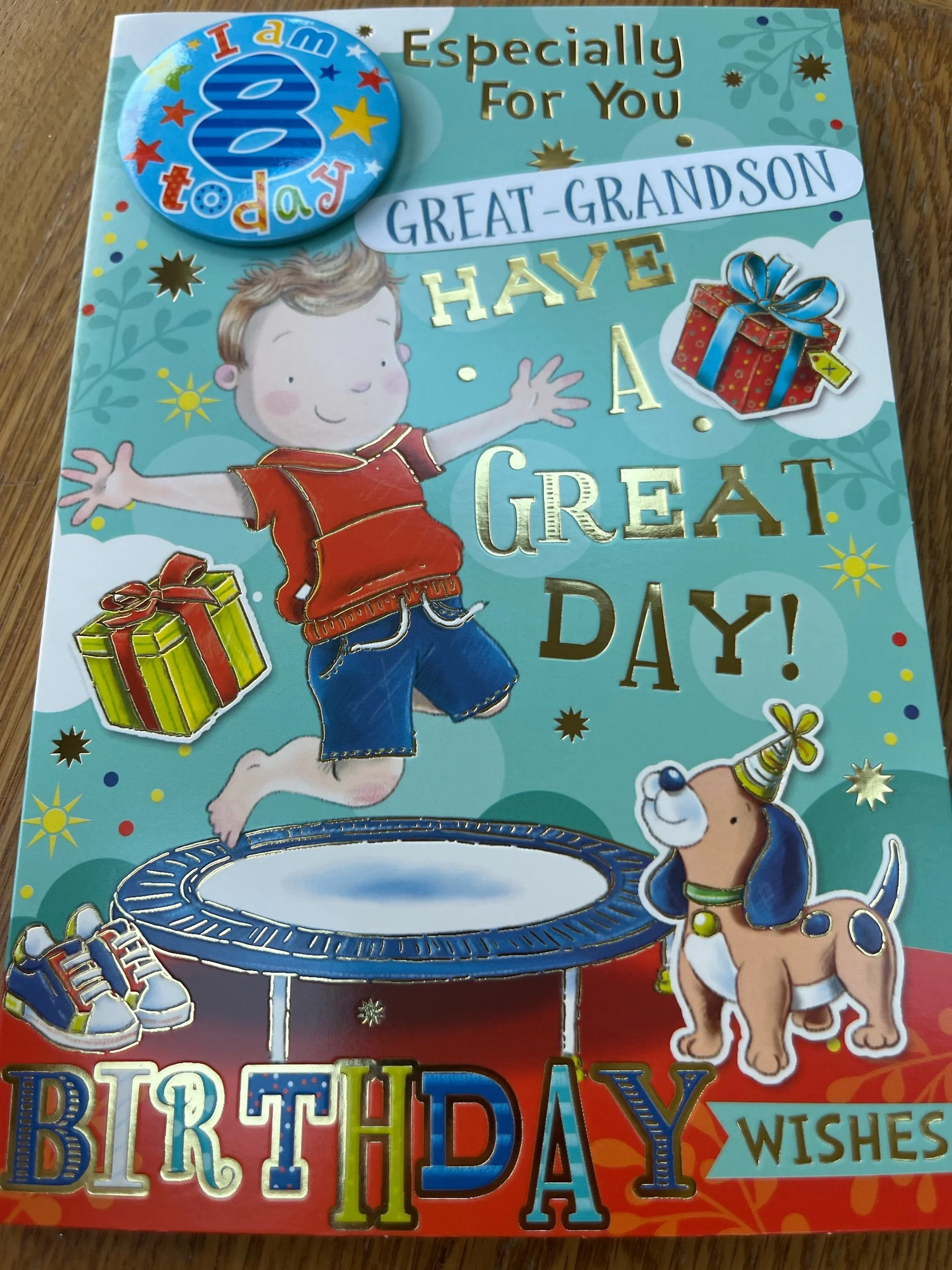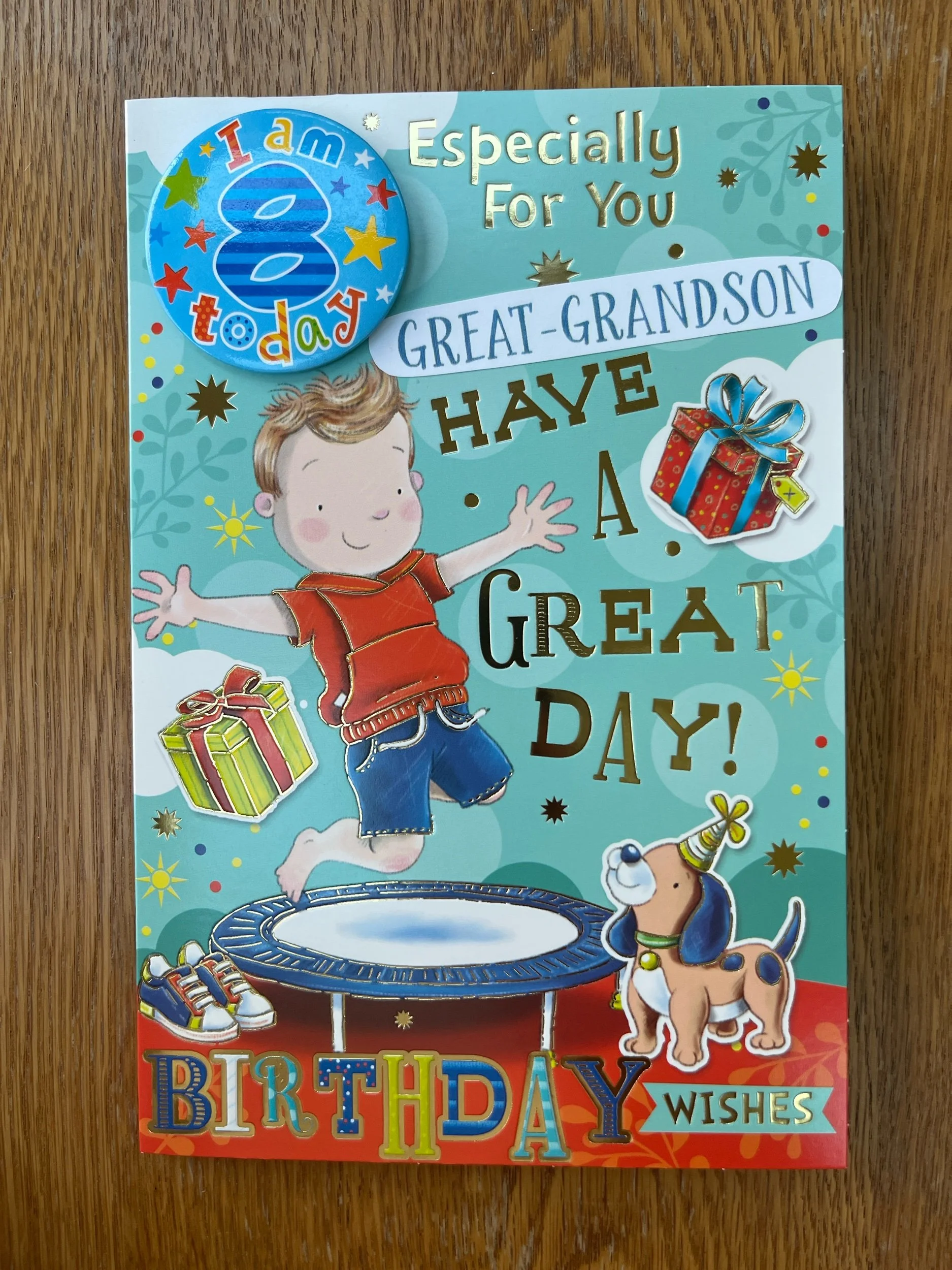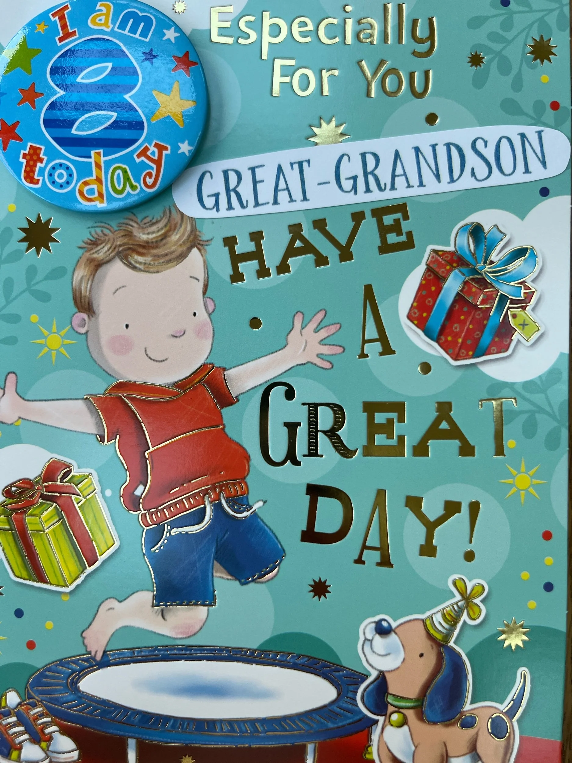 Great Grandson 8th Birthday Card features a Detachable badge for the Birthday boy to wear, foil and inside a full colour illustration insert