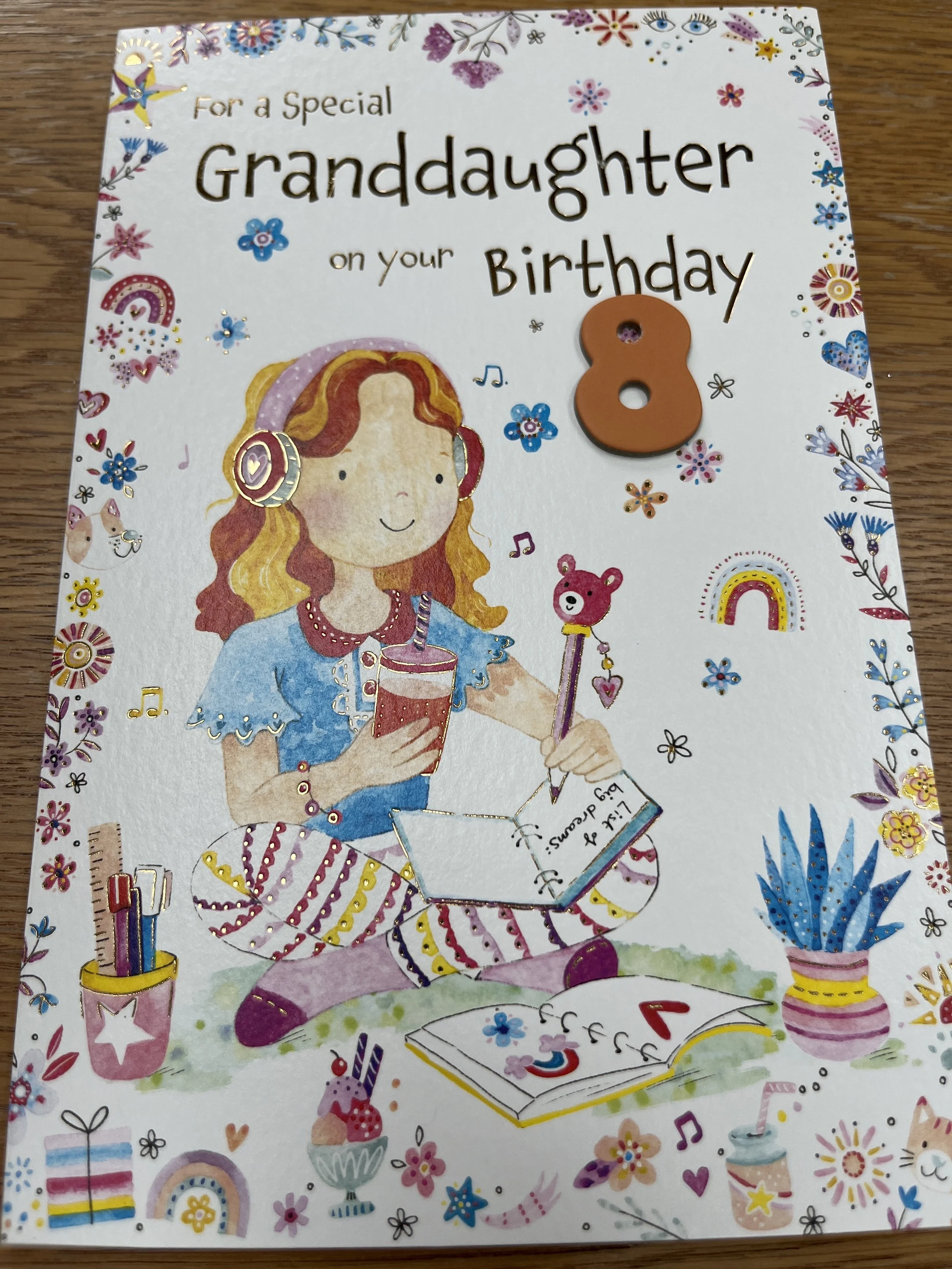 Granddaughter 8th Birthday card design features effective gold foiling , HAND FINISHED with a 3D attachment and inside a full colour illustrated insert with heartfelt words
