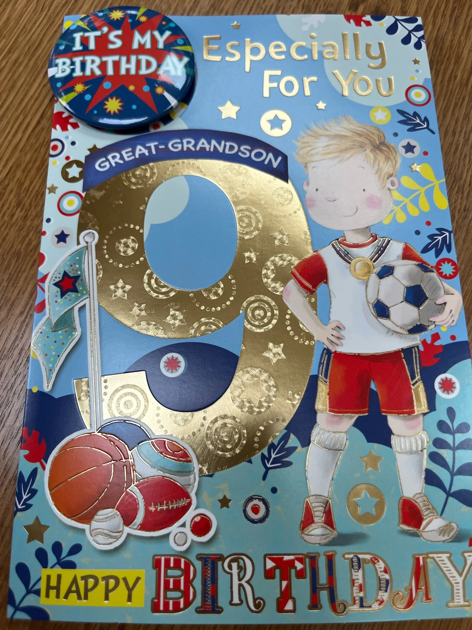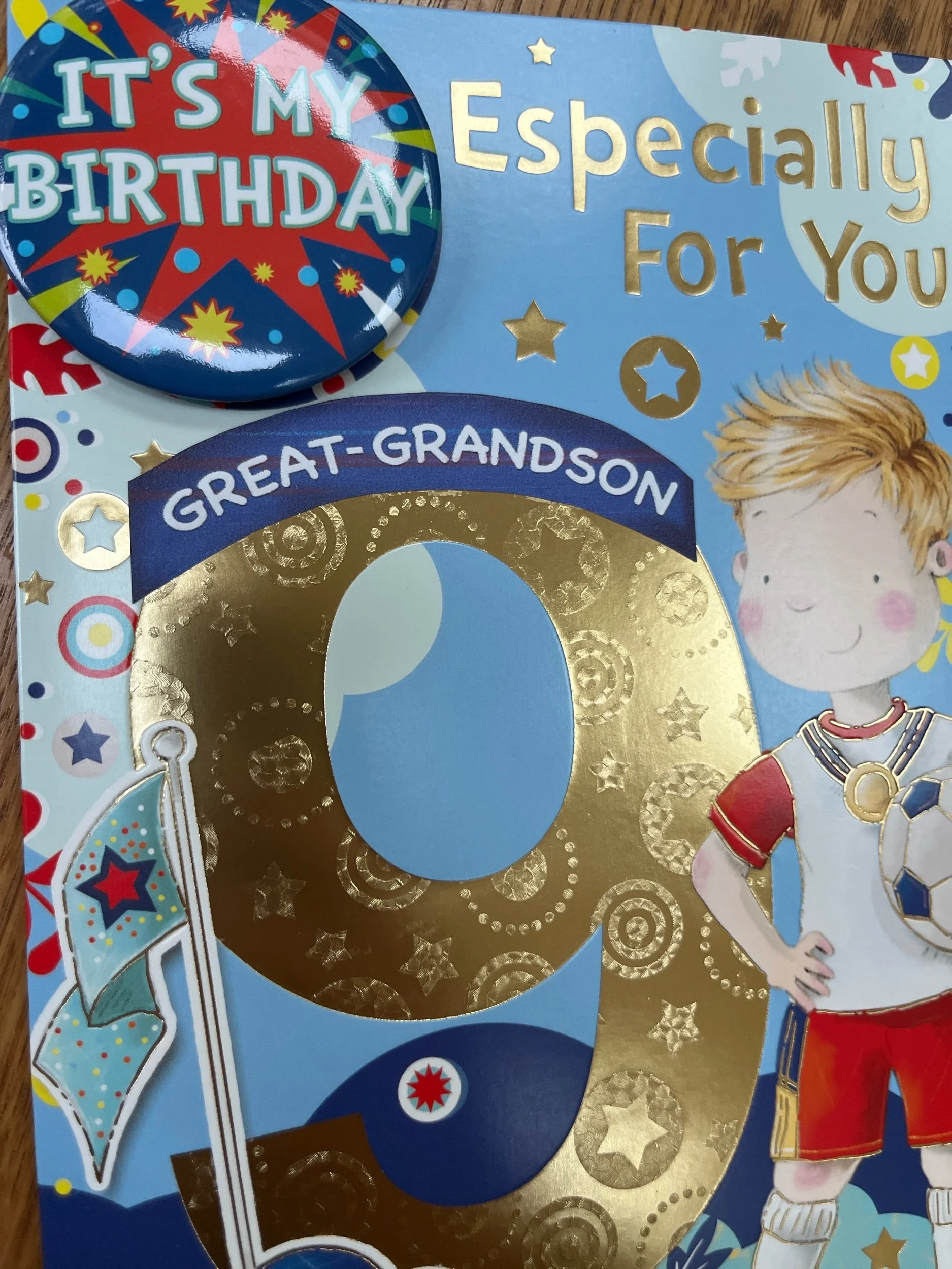 Great Grandson 9th Birthday card design features Happy 9th Birthday badge for the Birthday boy to wear and and inside a full colour insert