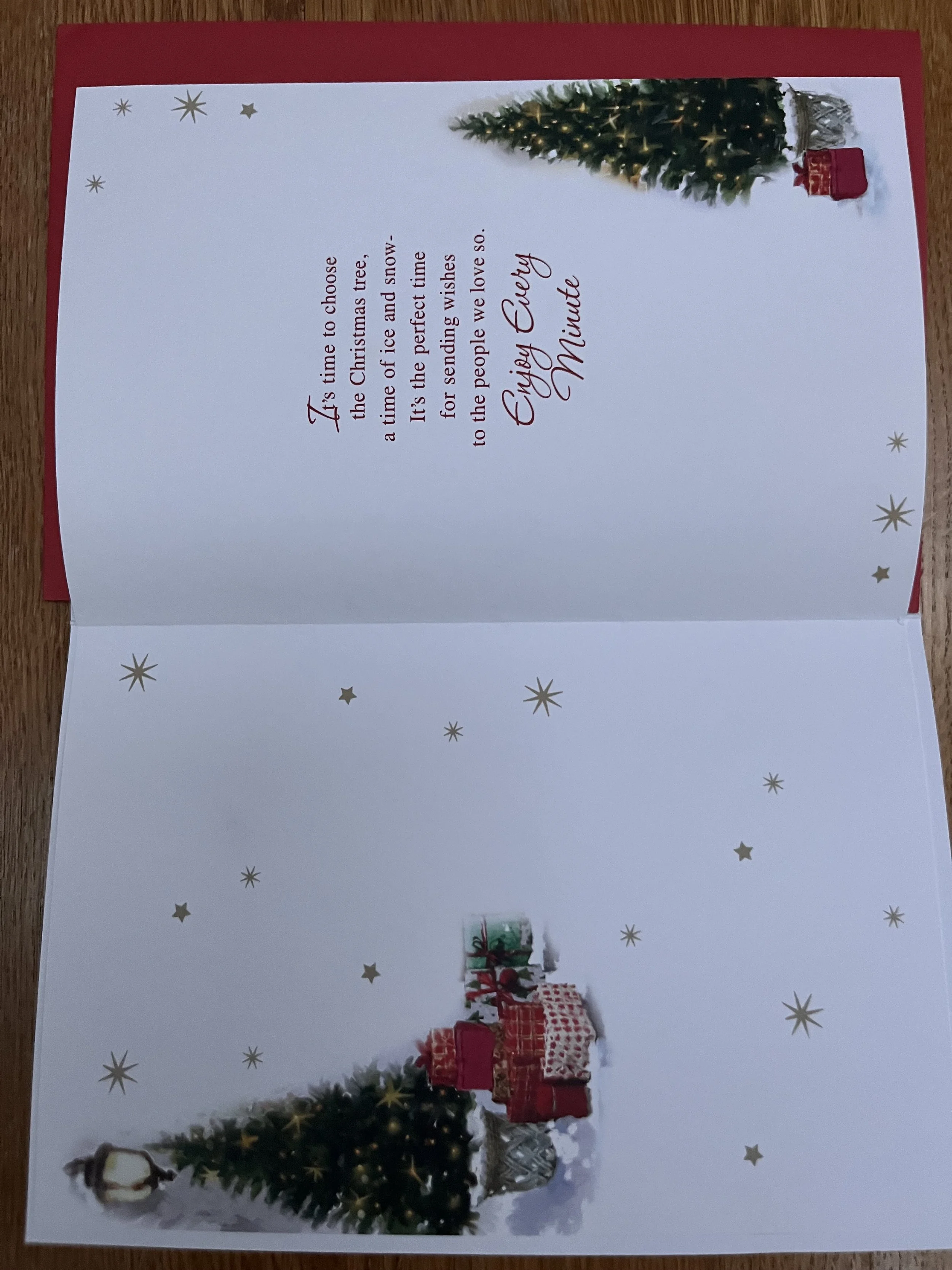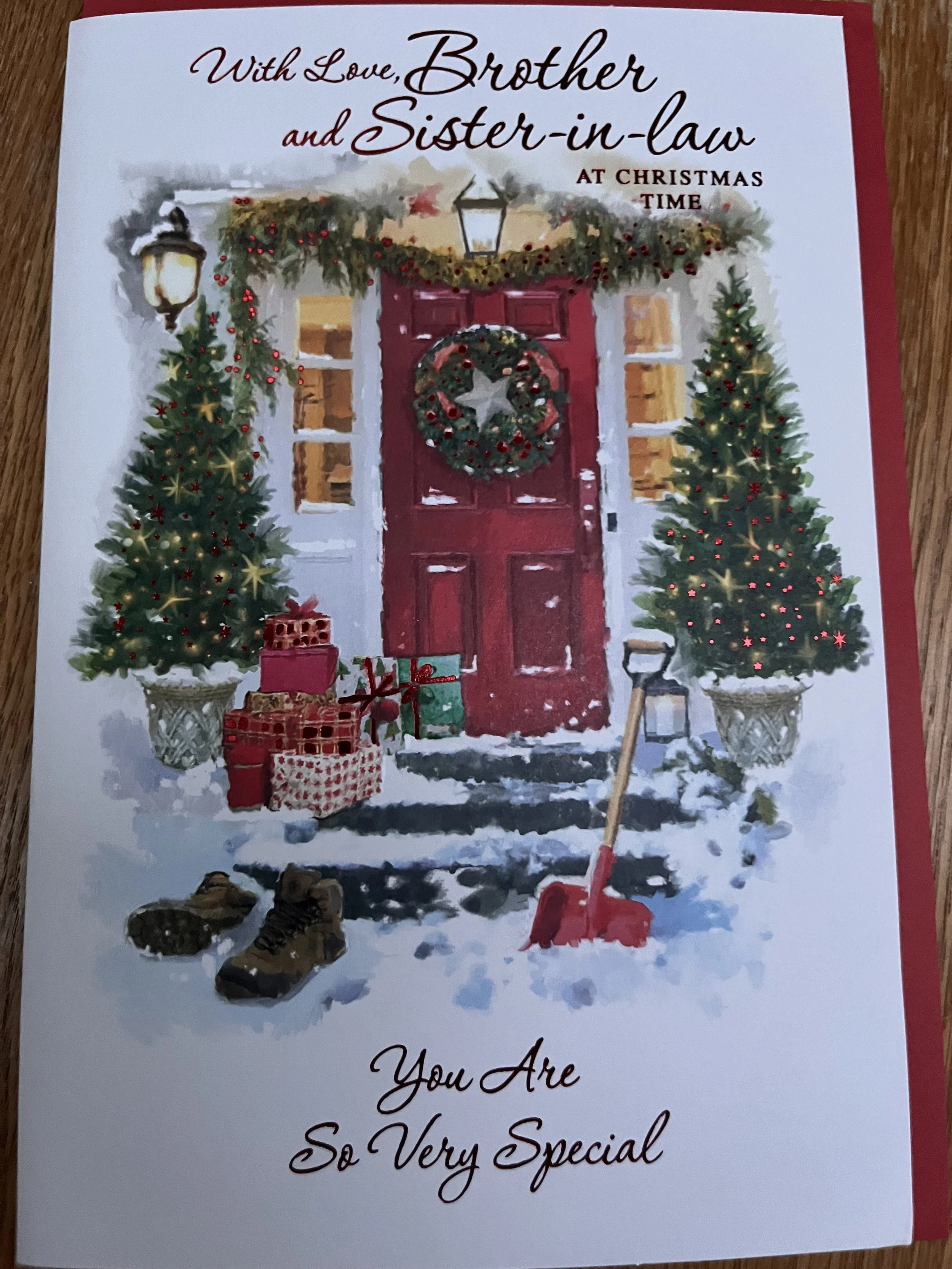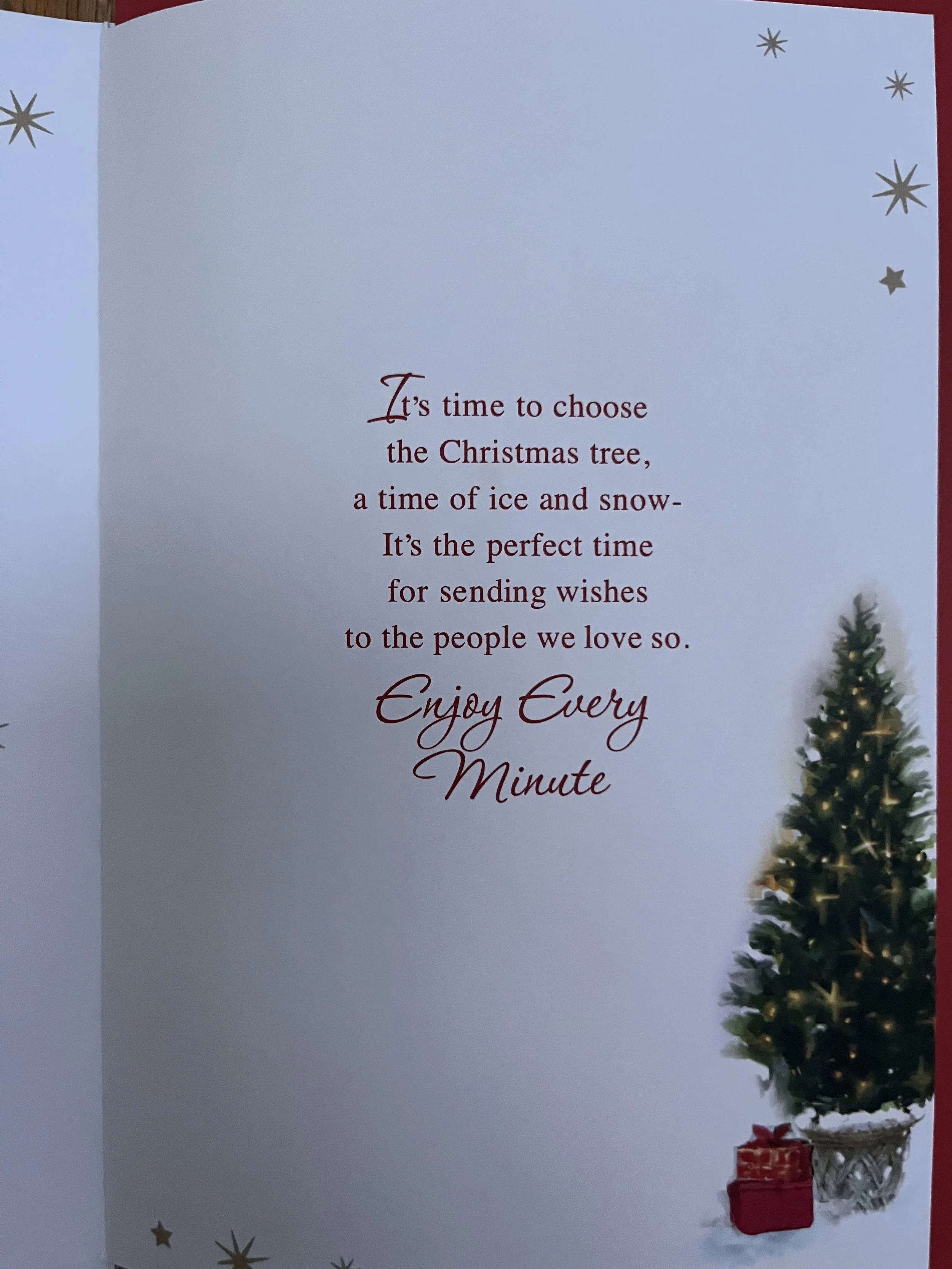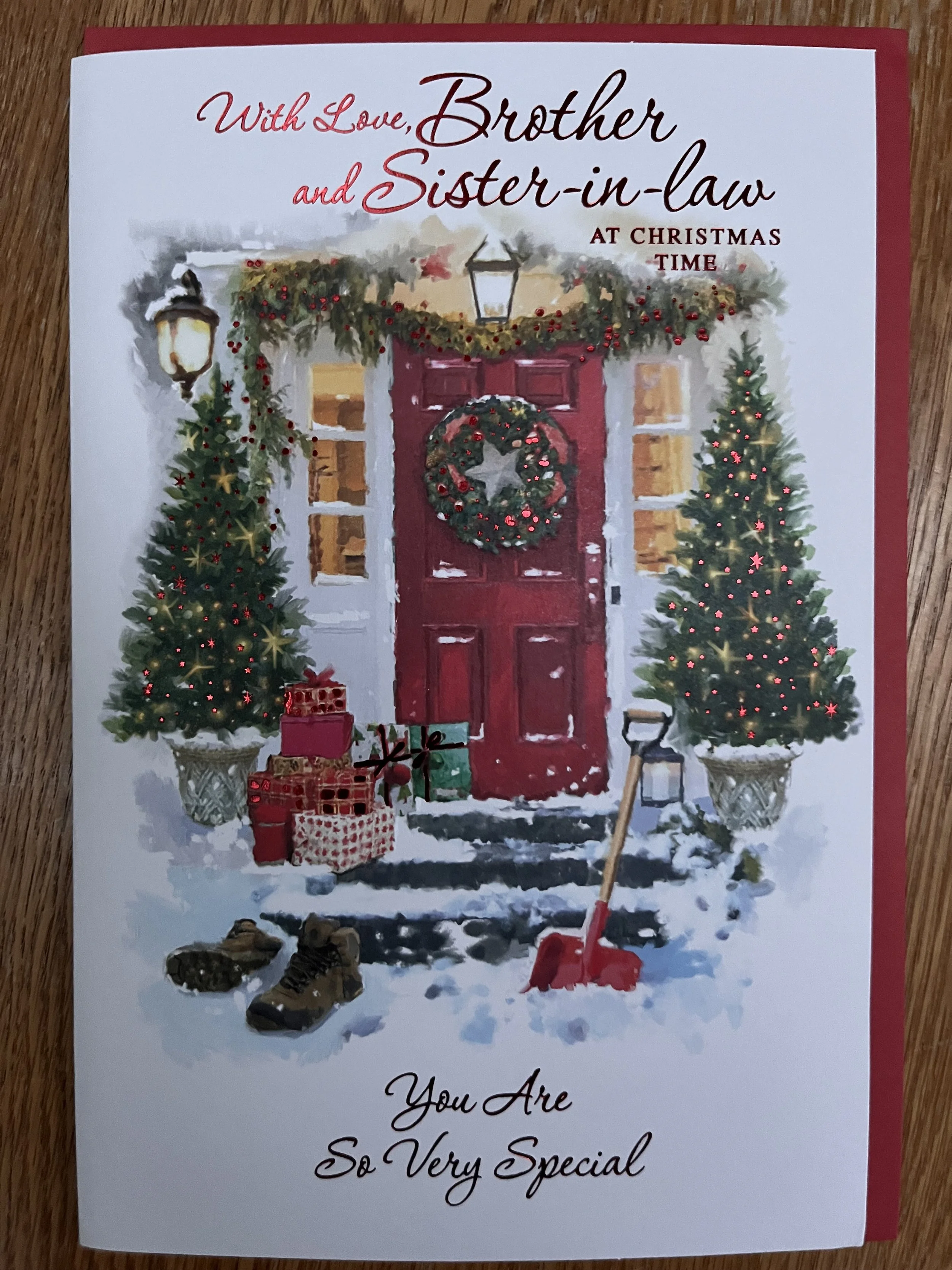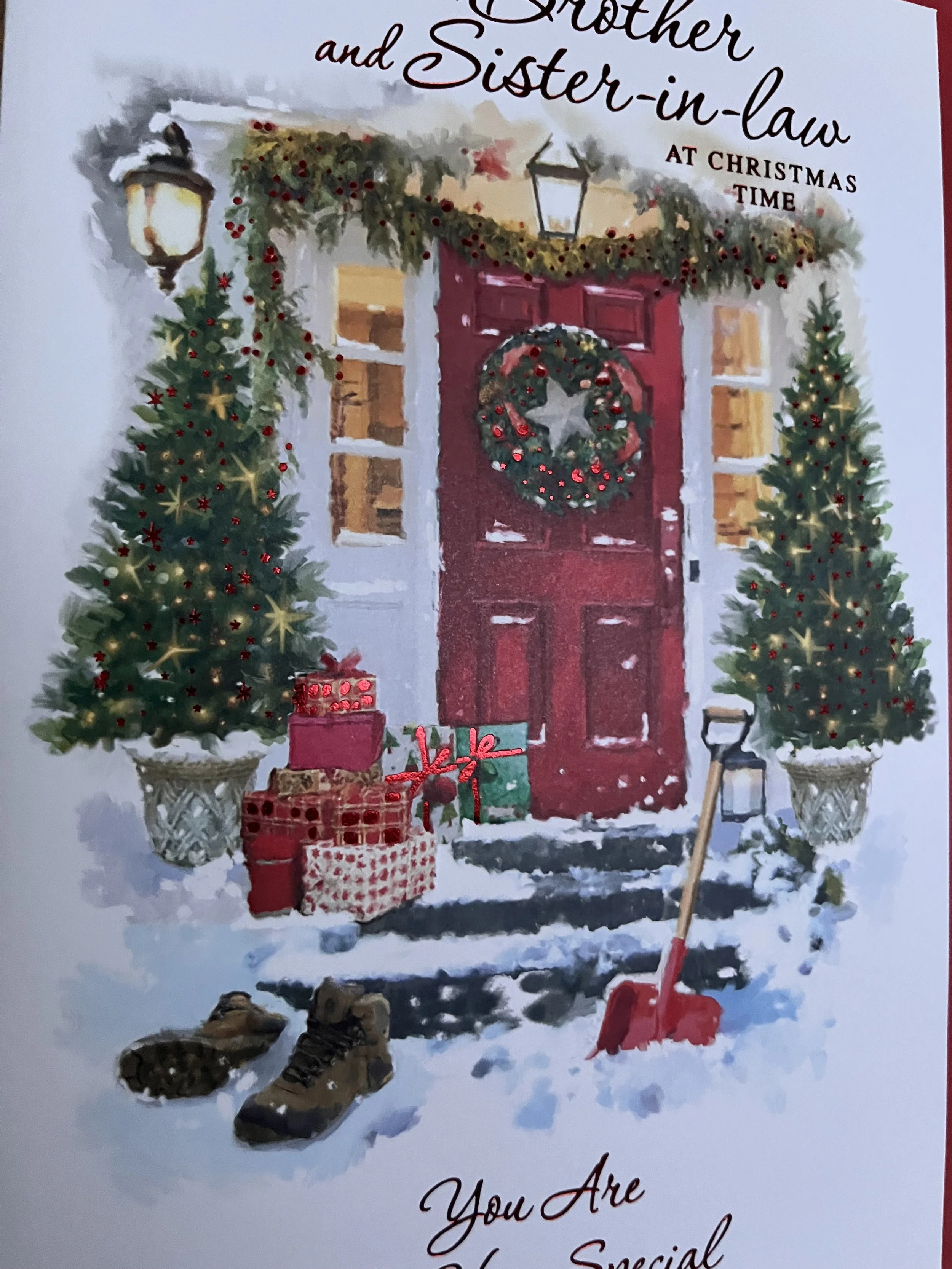 Brother and Sister in Law Christmas card cute design features very effective red foiling with heartfelt words that continue inside on a full colour illustrated insert