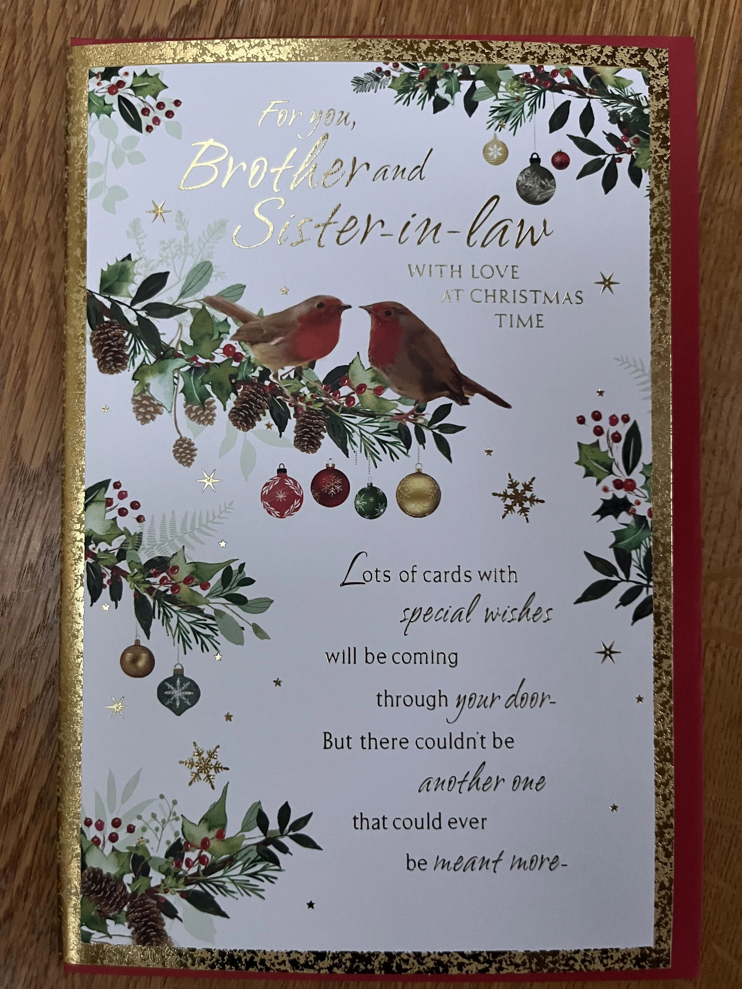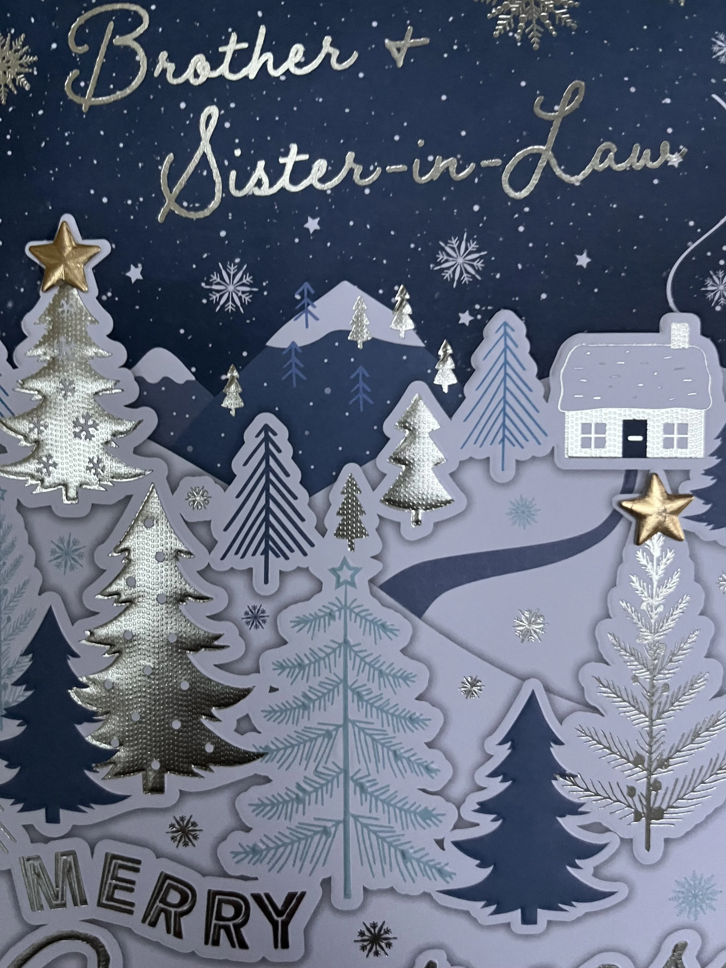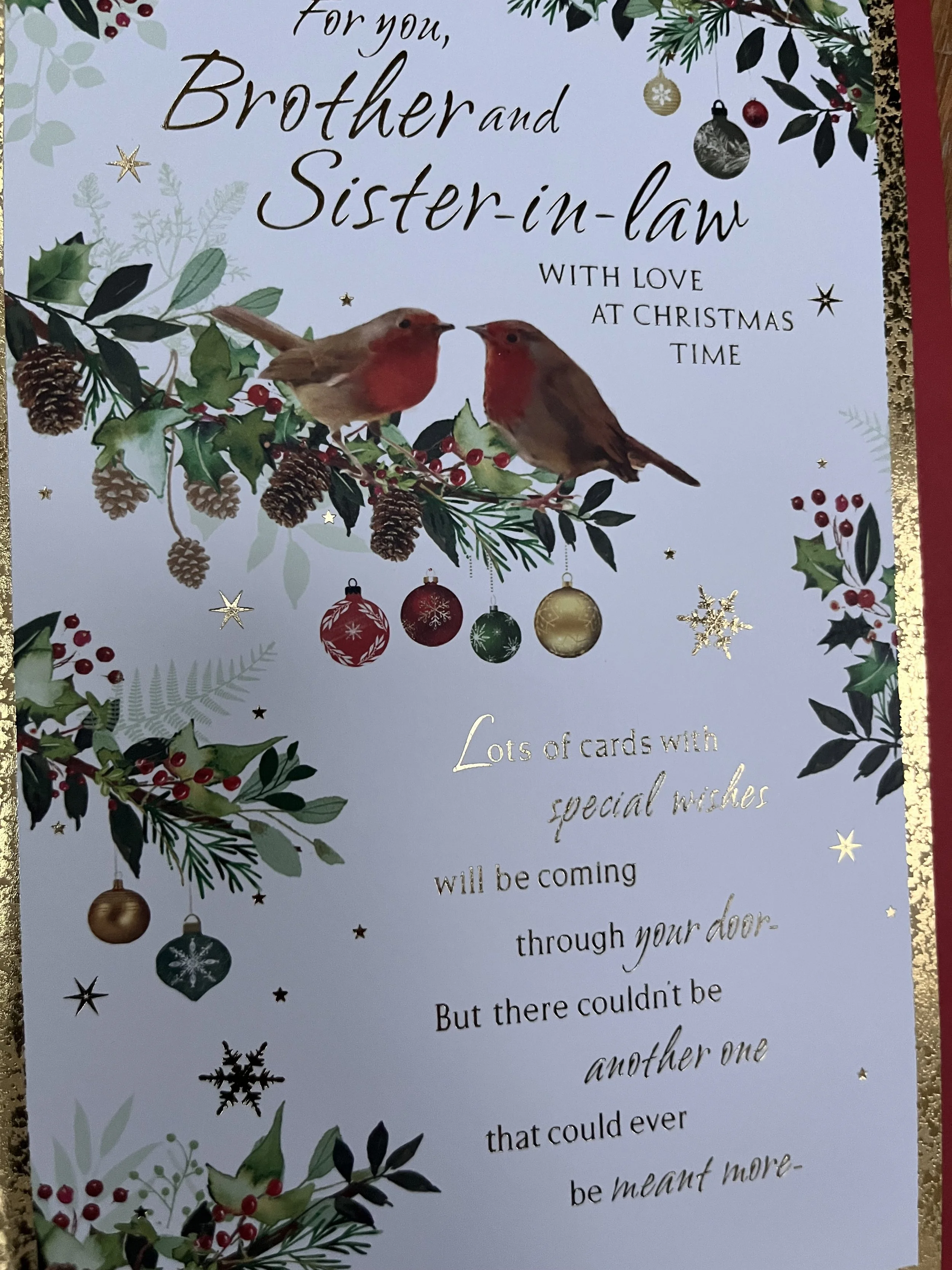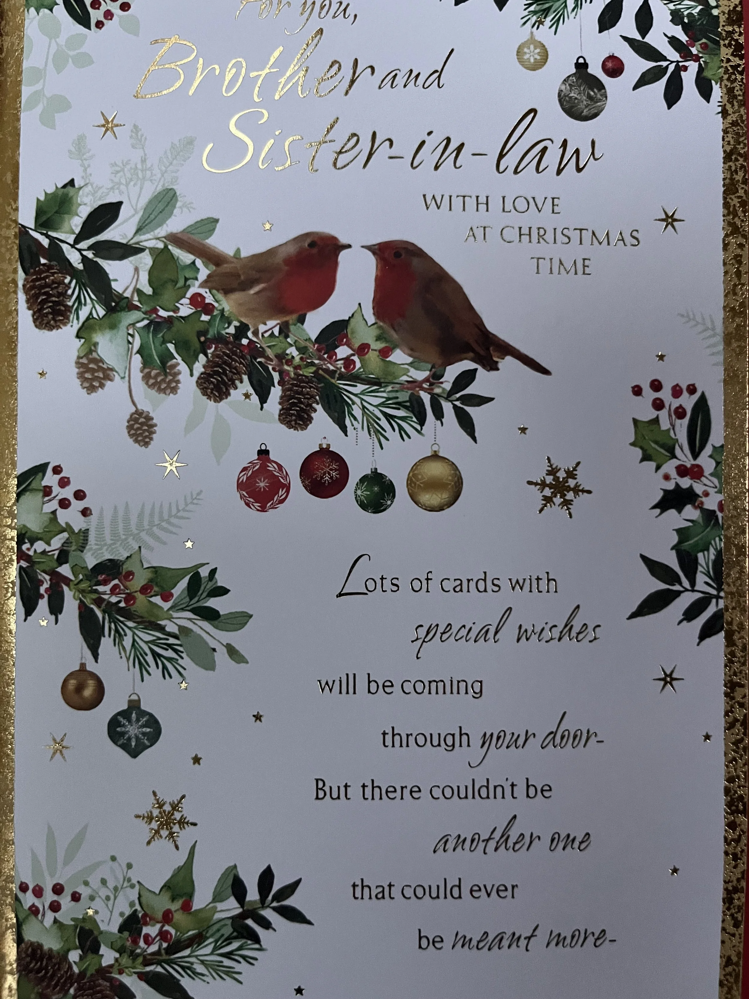 Brother and Sister in Law Christmas card cute design features very effective gold foiling with heartfelt words that continue inside on a full colour illustrated insert
