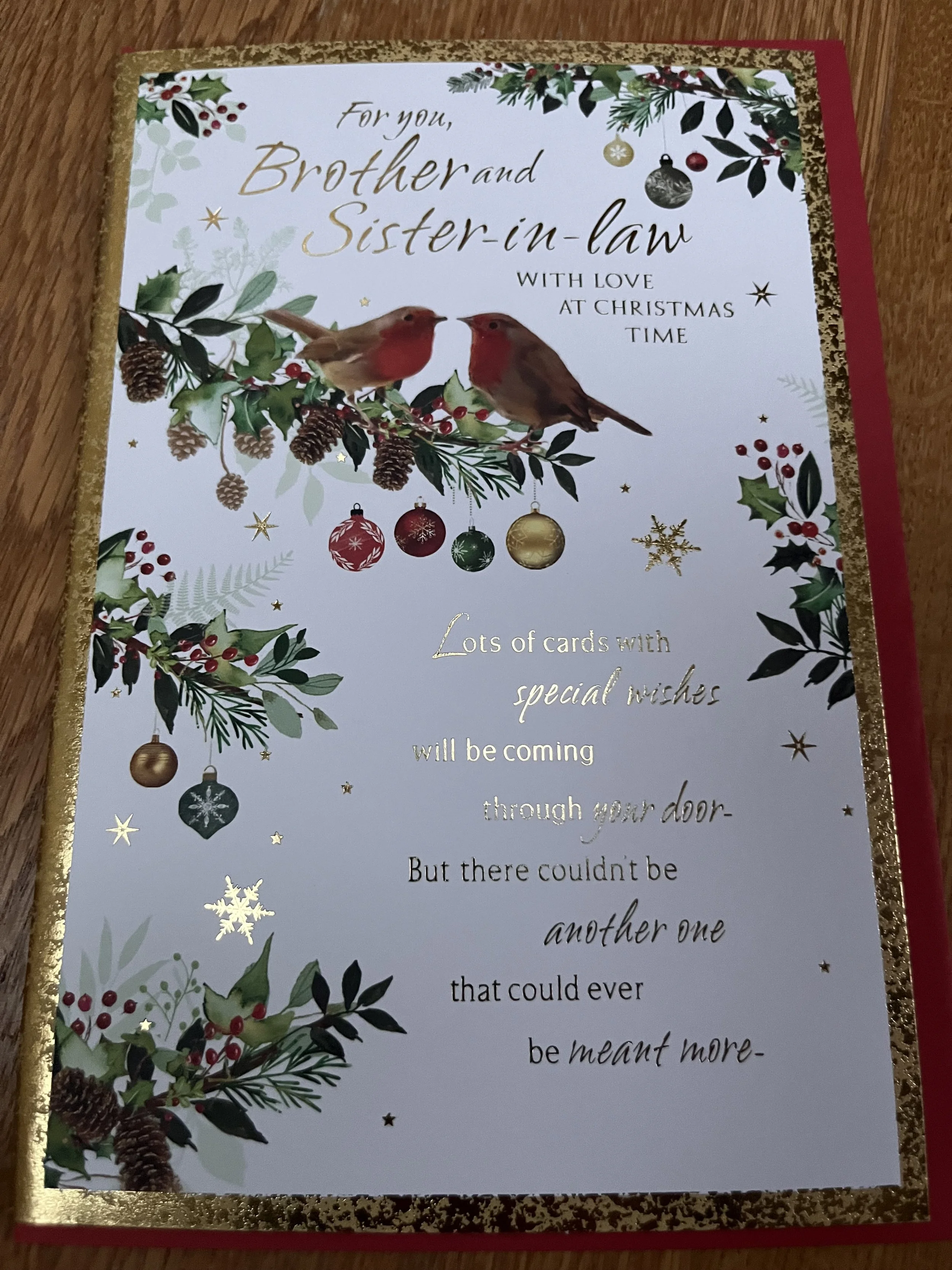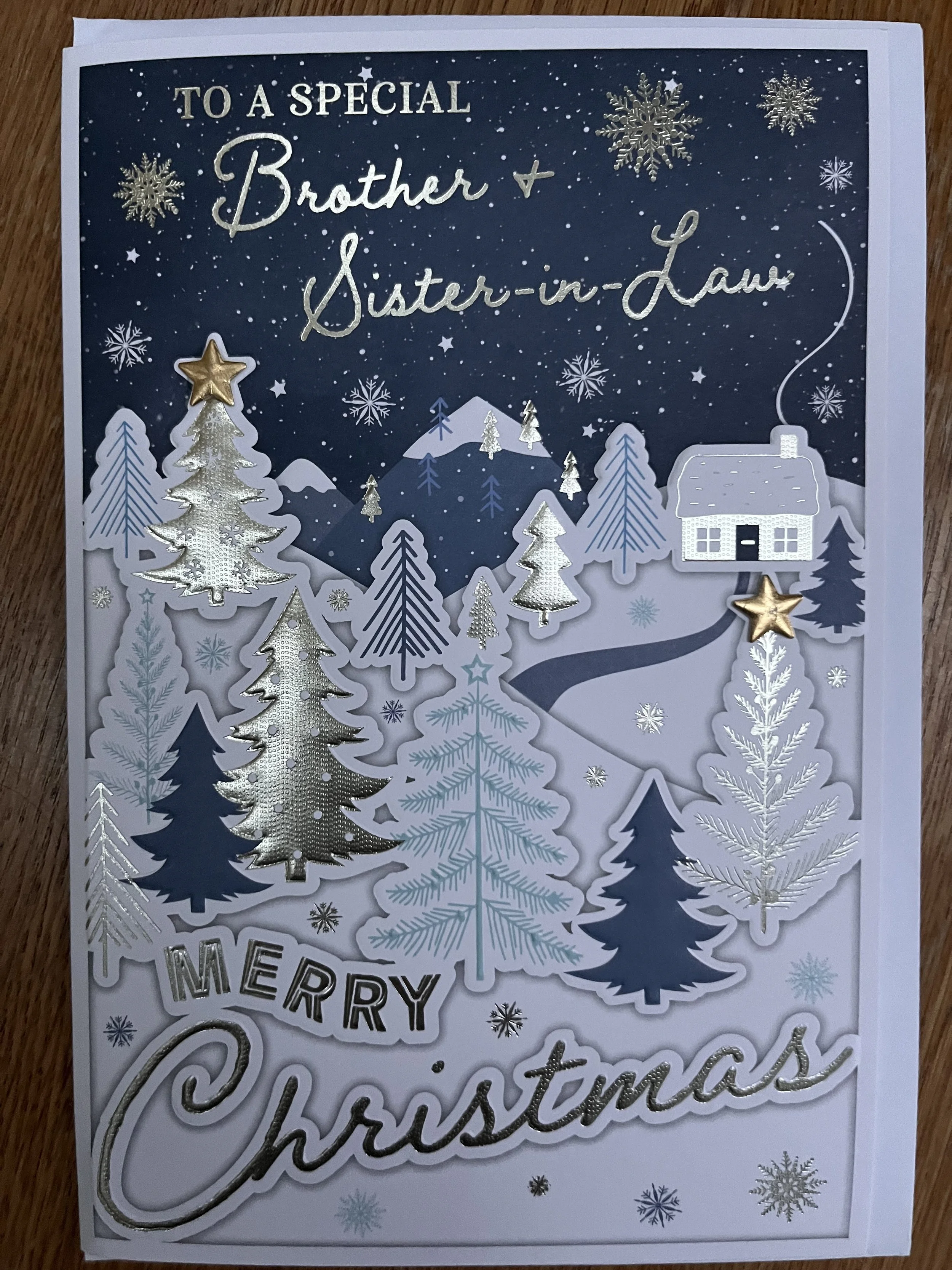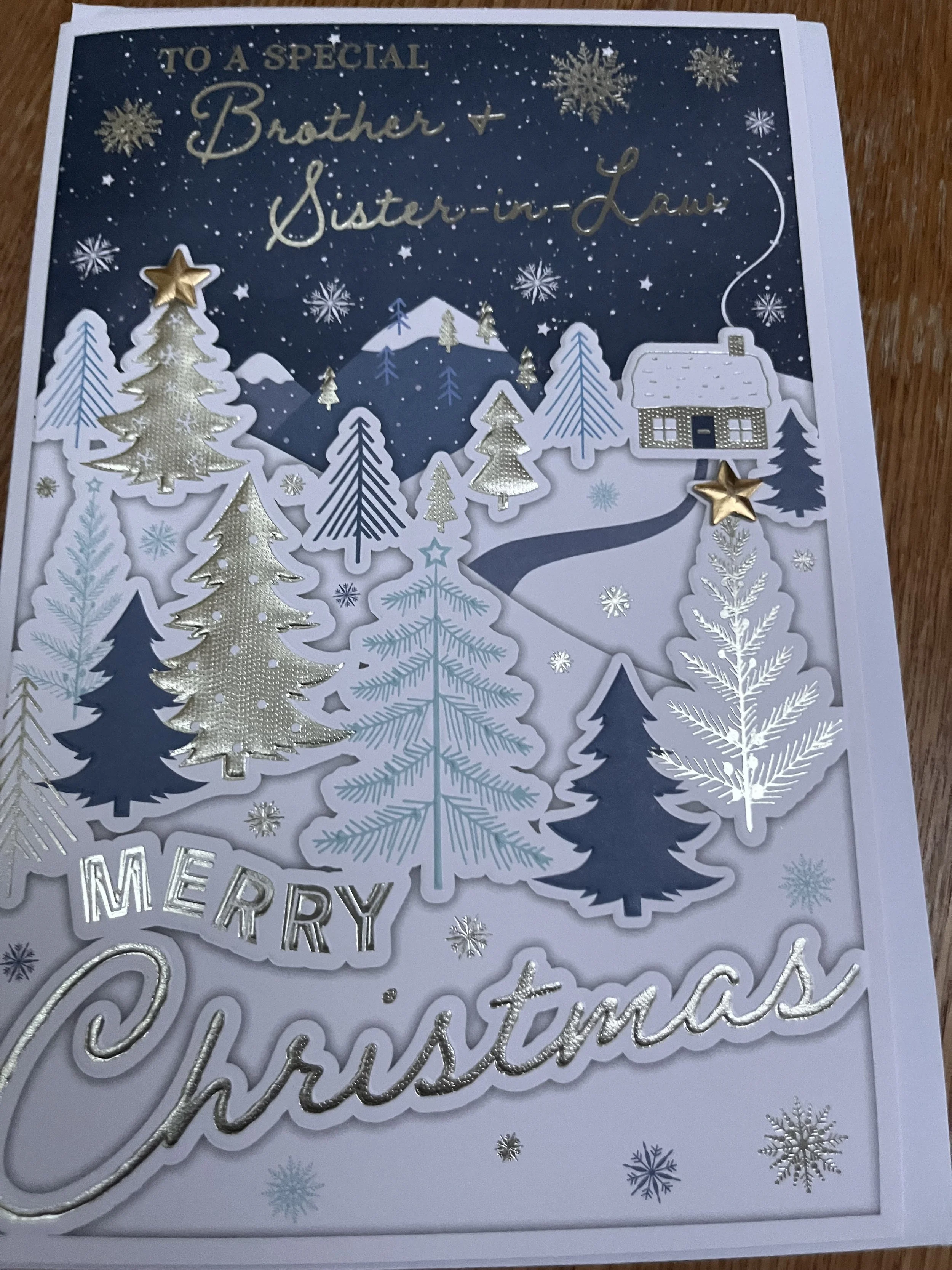 Brother and Sister in Law Christmas card cute design features very effective gold foiling with heartfelt words that continue inside on a full colour illustrated insert