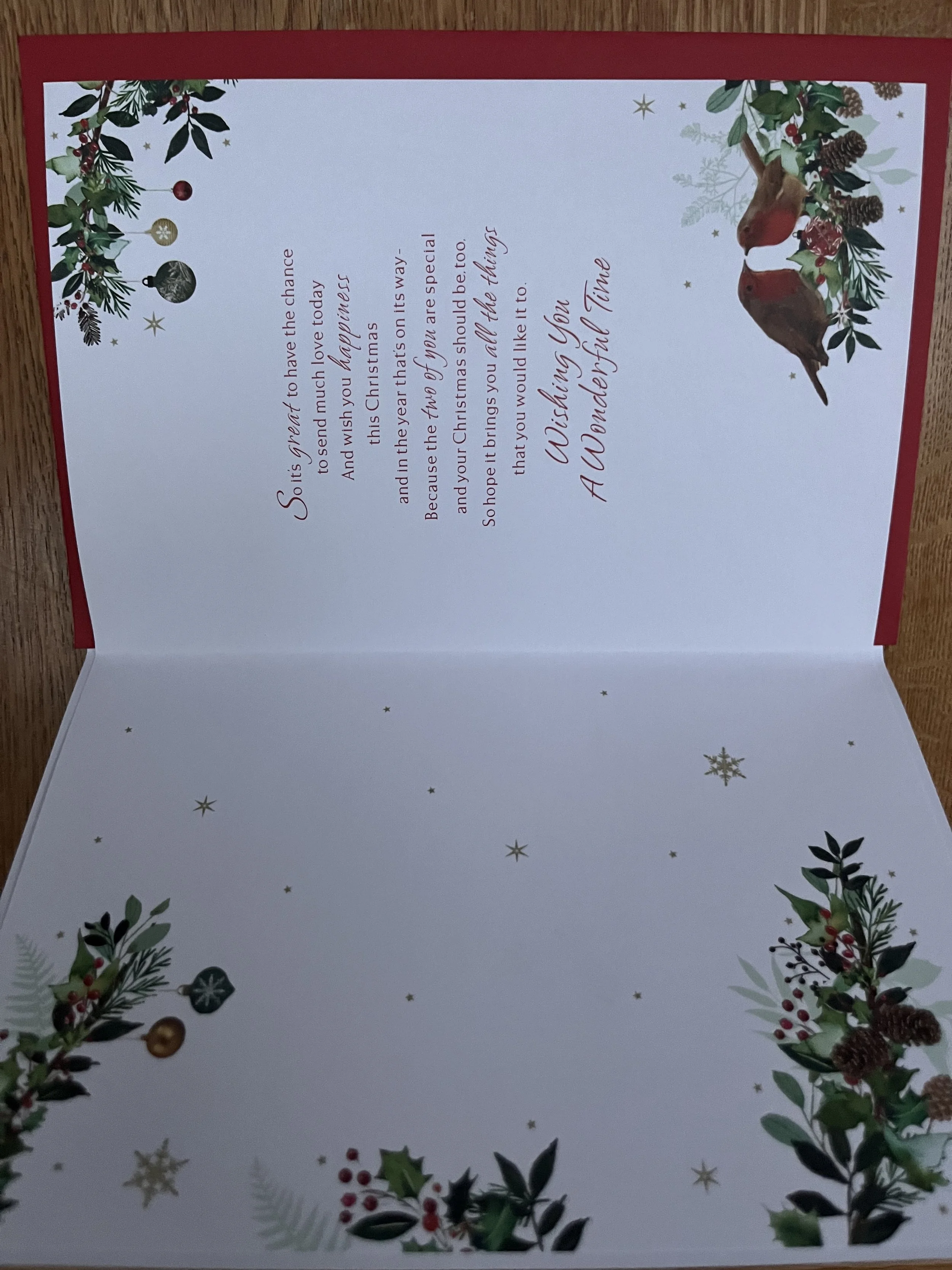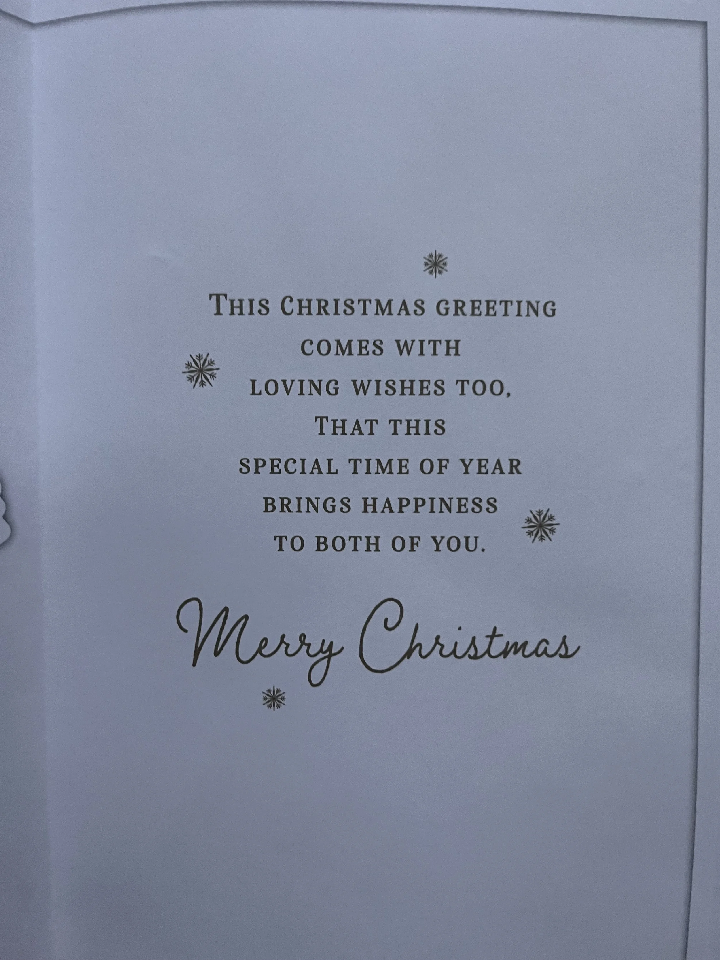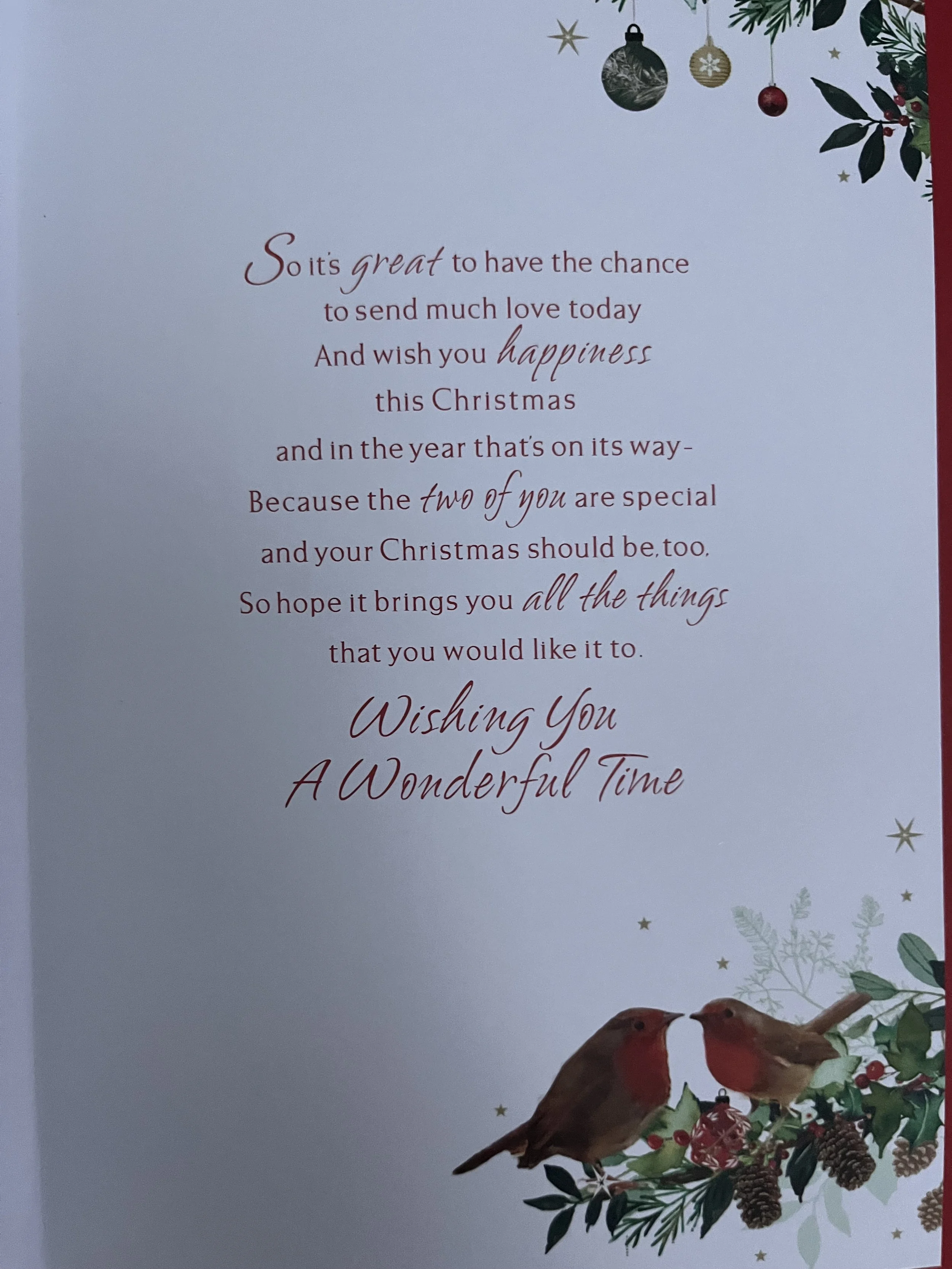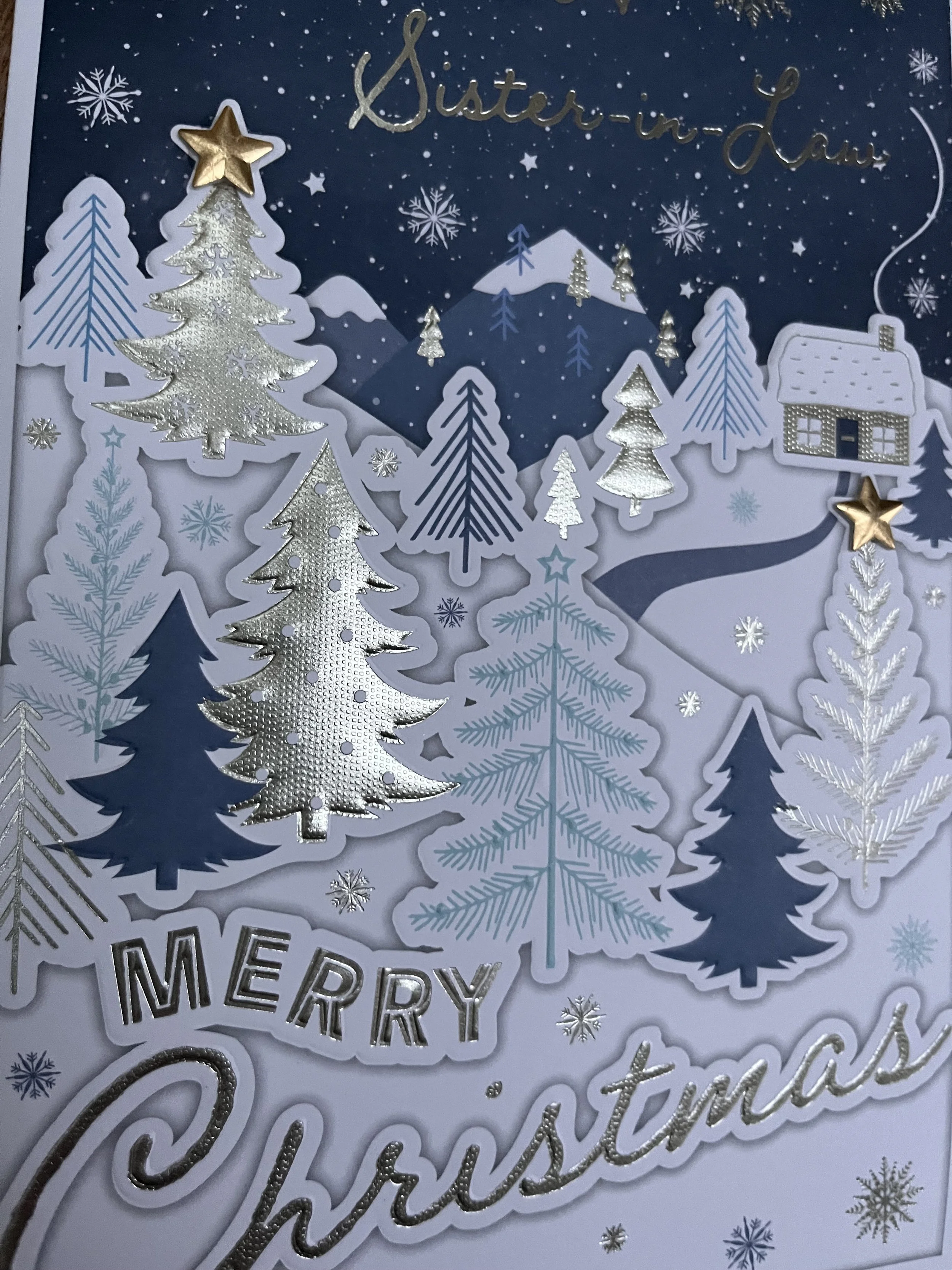 Brother and Sister in Law Christmas card cute design features very effective gold foiling with heartfelt words that continue inside on a full colour illustrated insert
