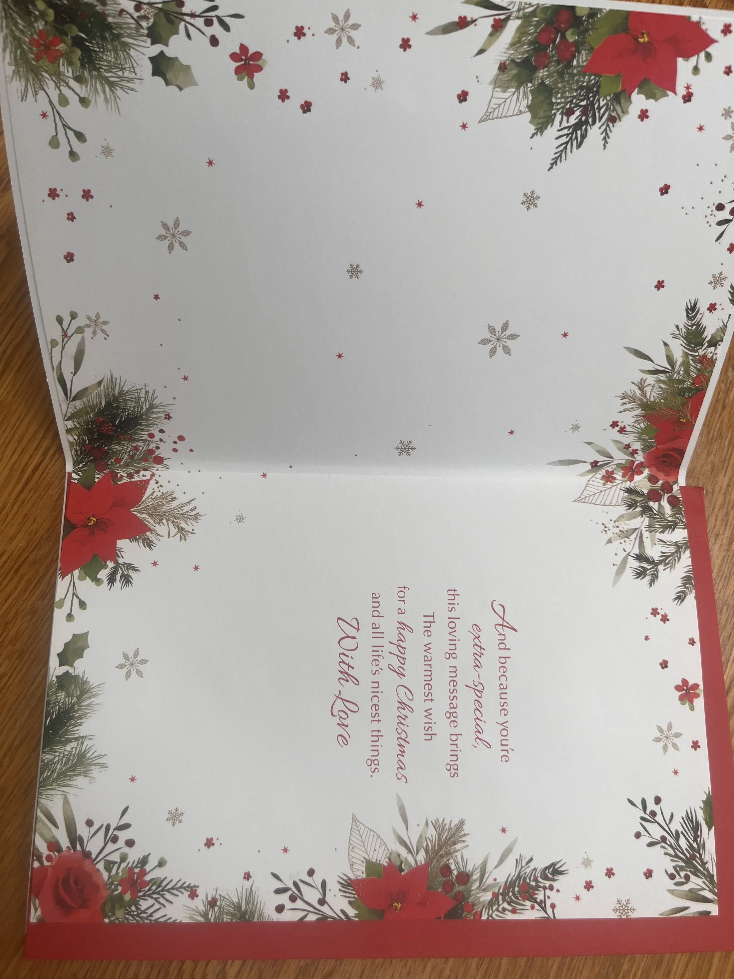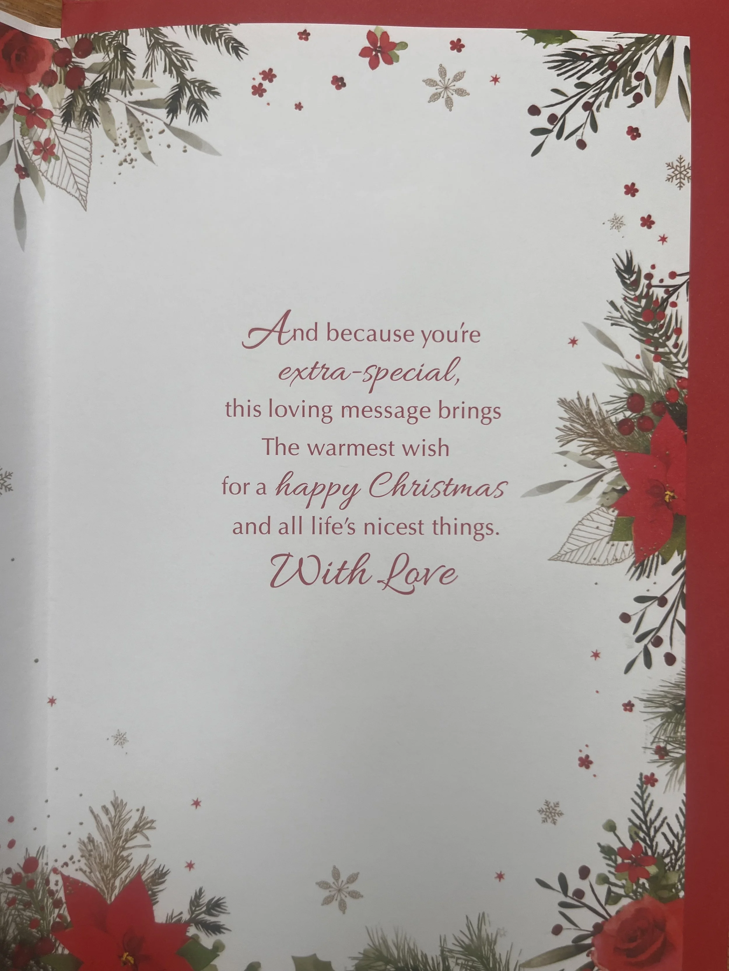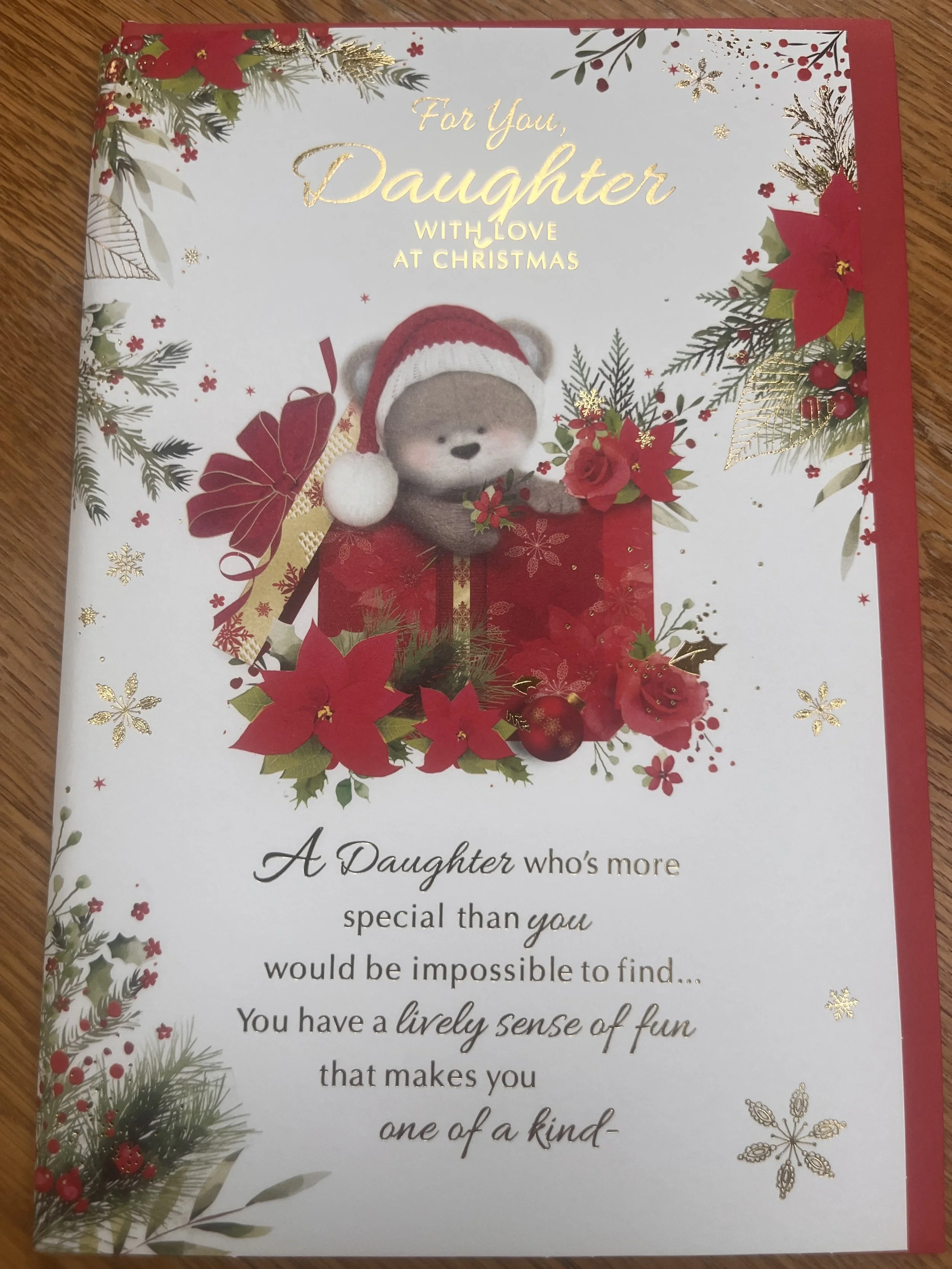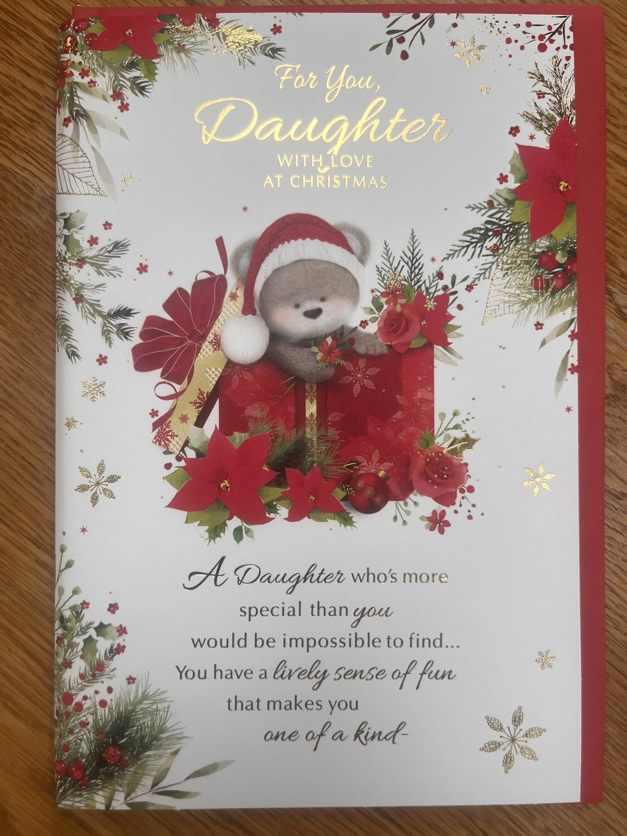 Daughter Christmas card design features very effective foil on a fabulous design that continues inside on a full colour illustrated insert with verse