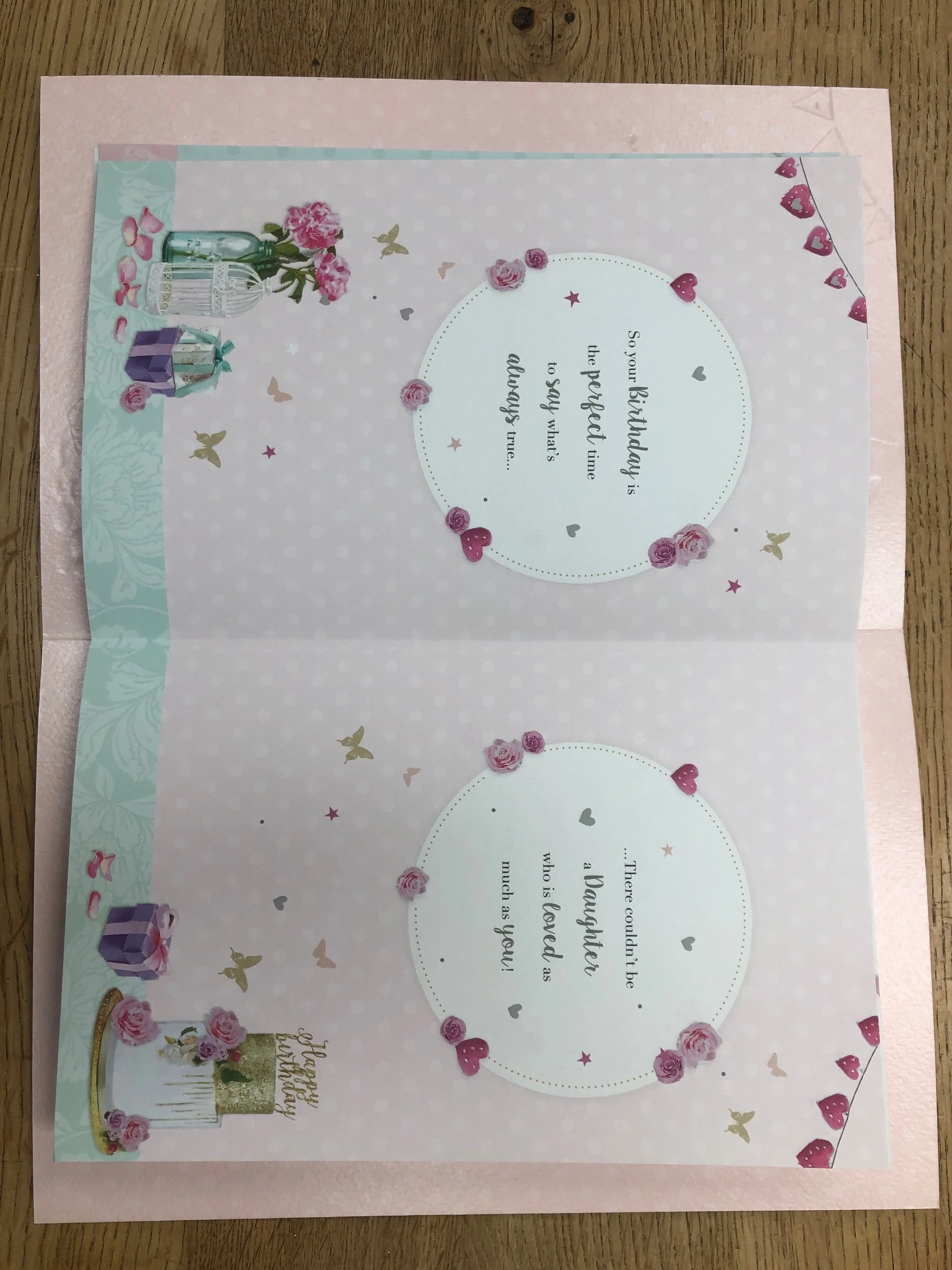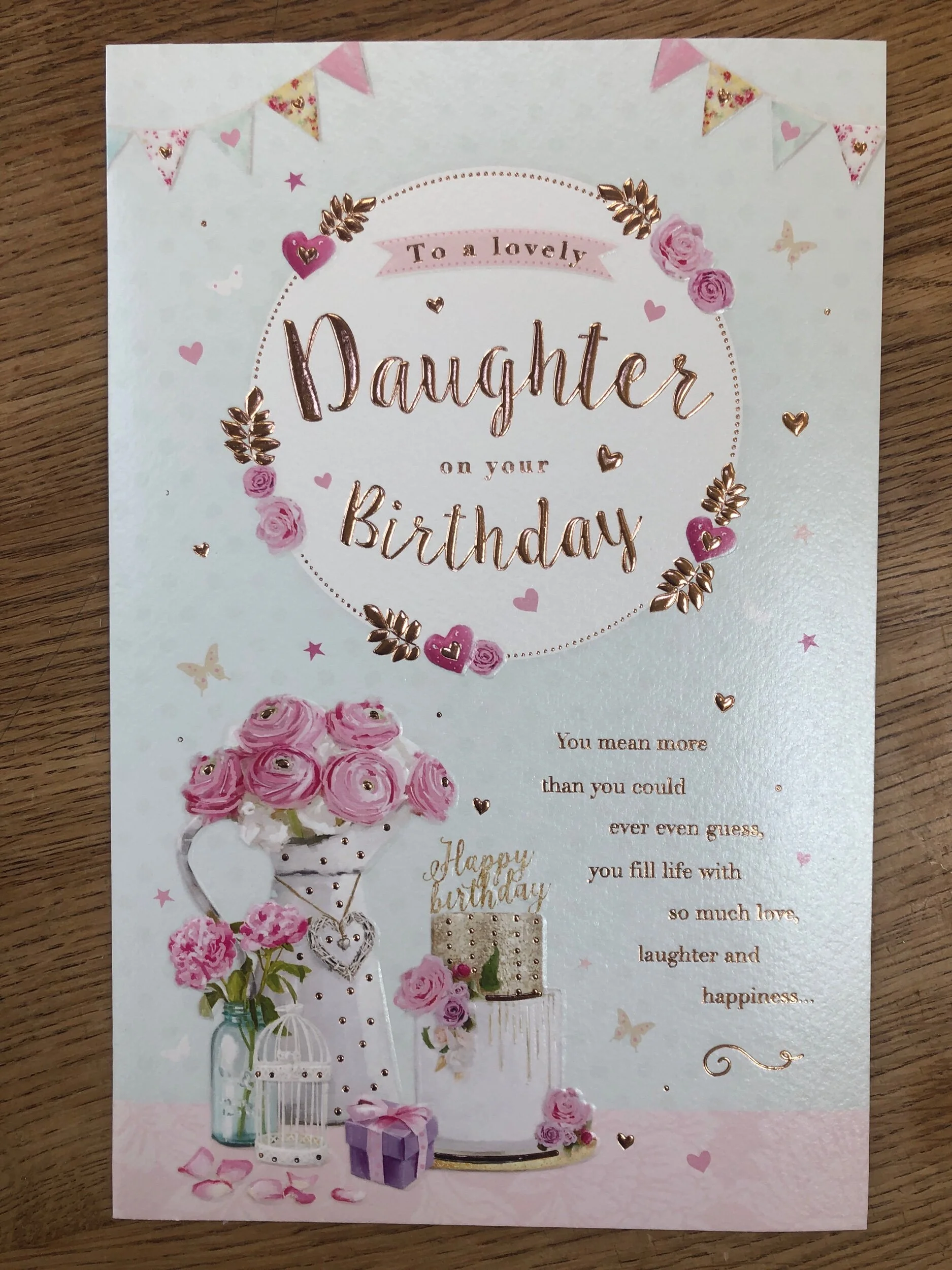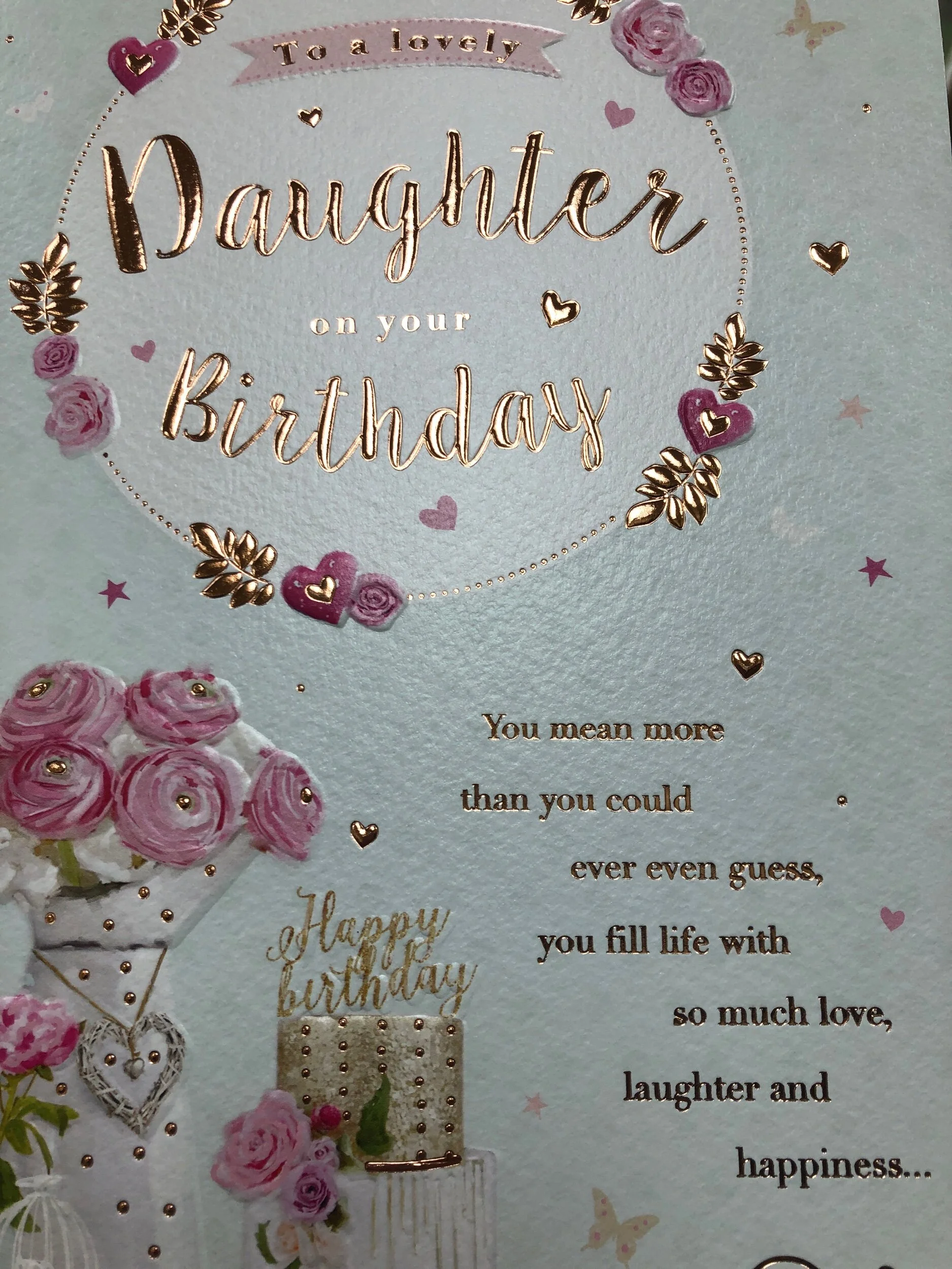 Daughter Birthday card design features effective foil, embossing and Inside heartfelt words on a full colour illustrated insert