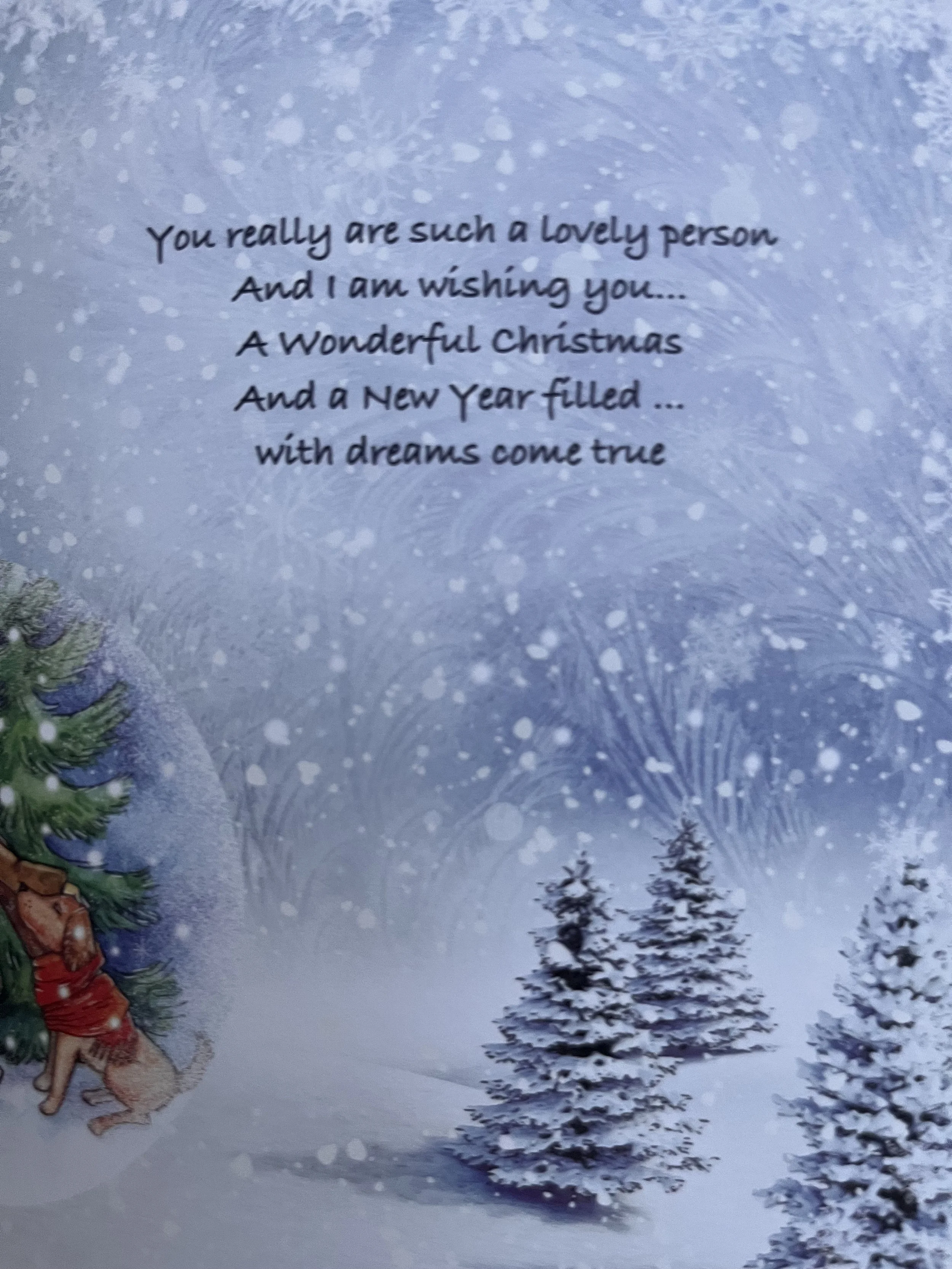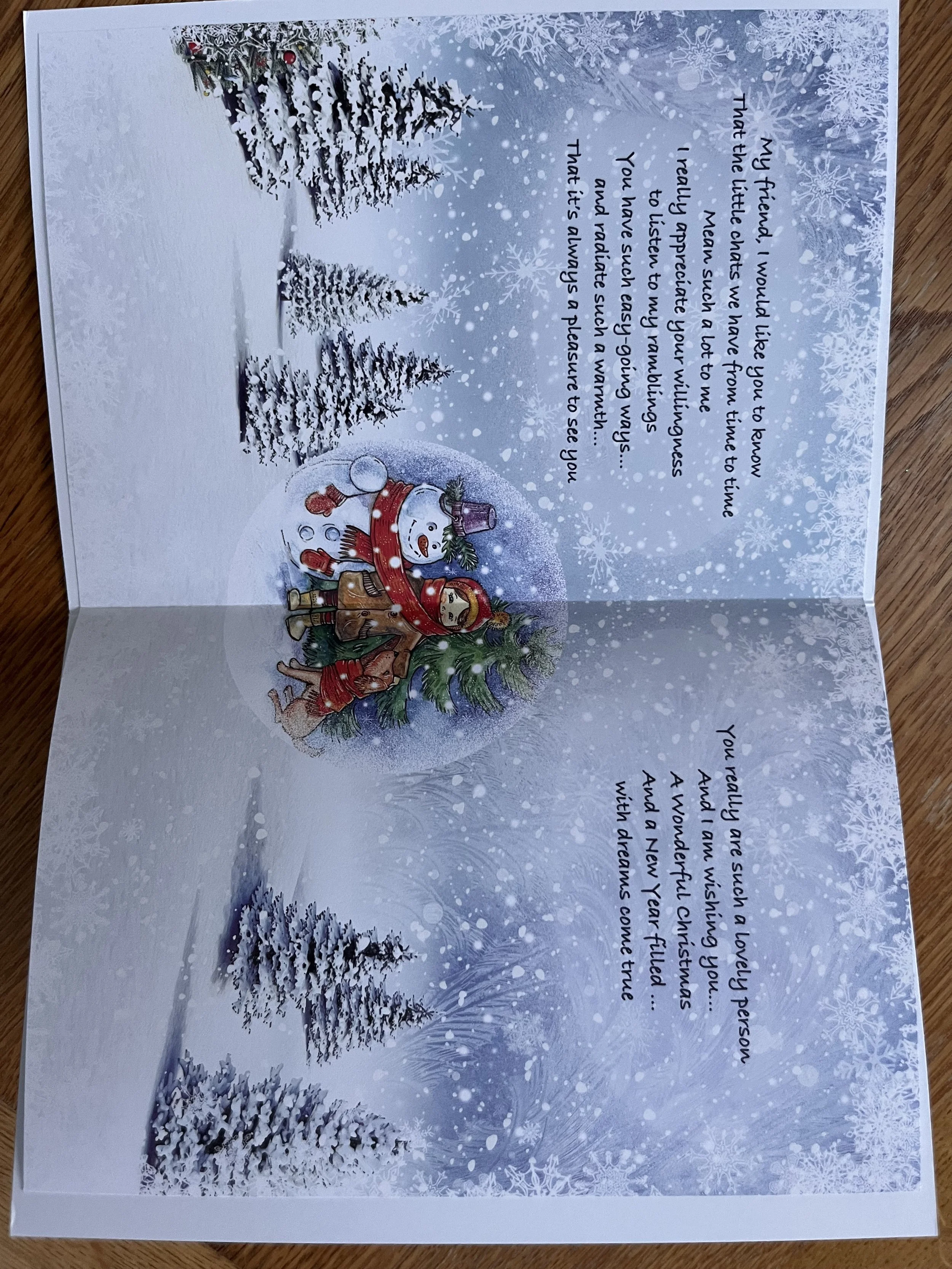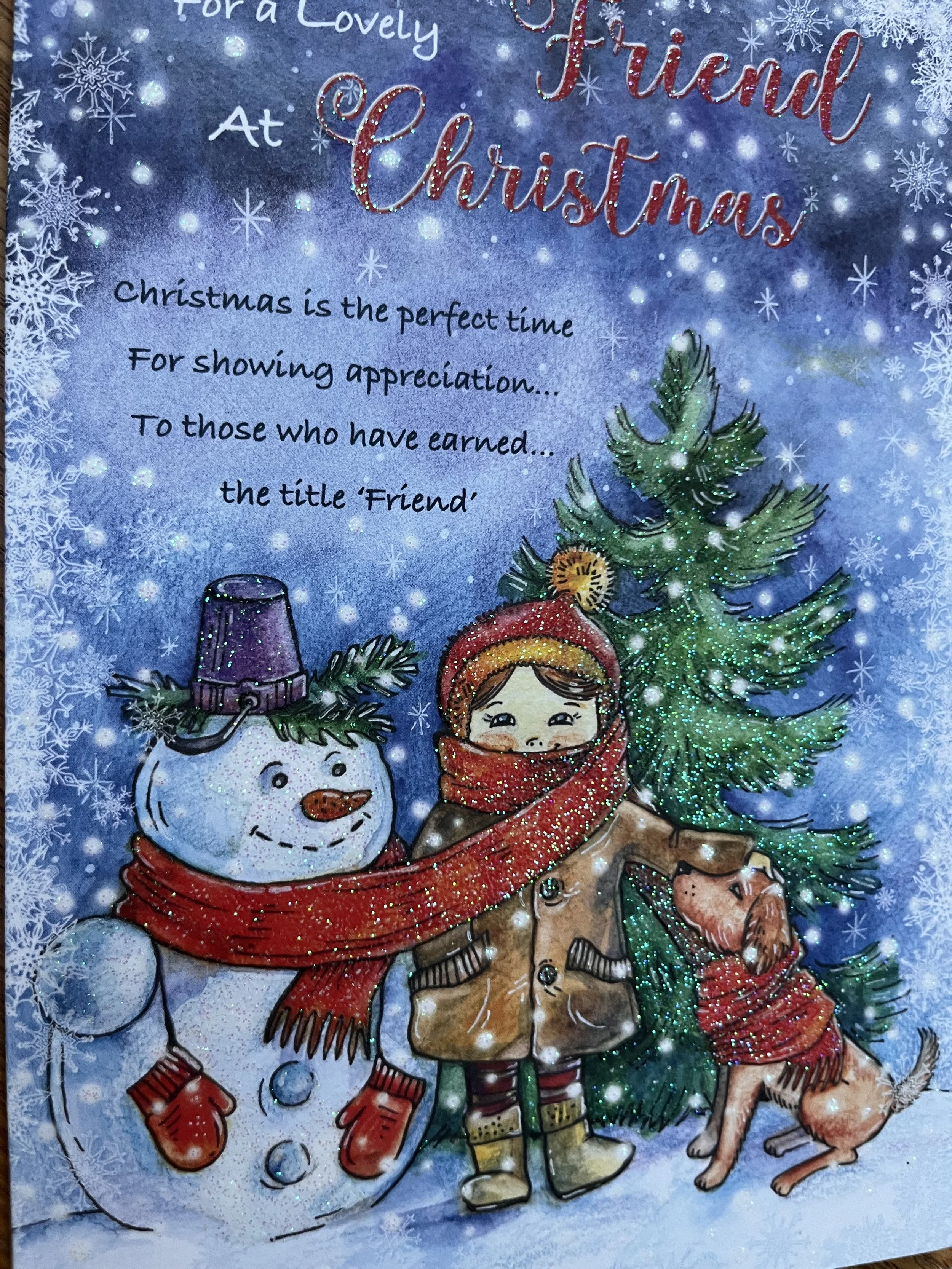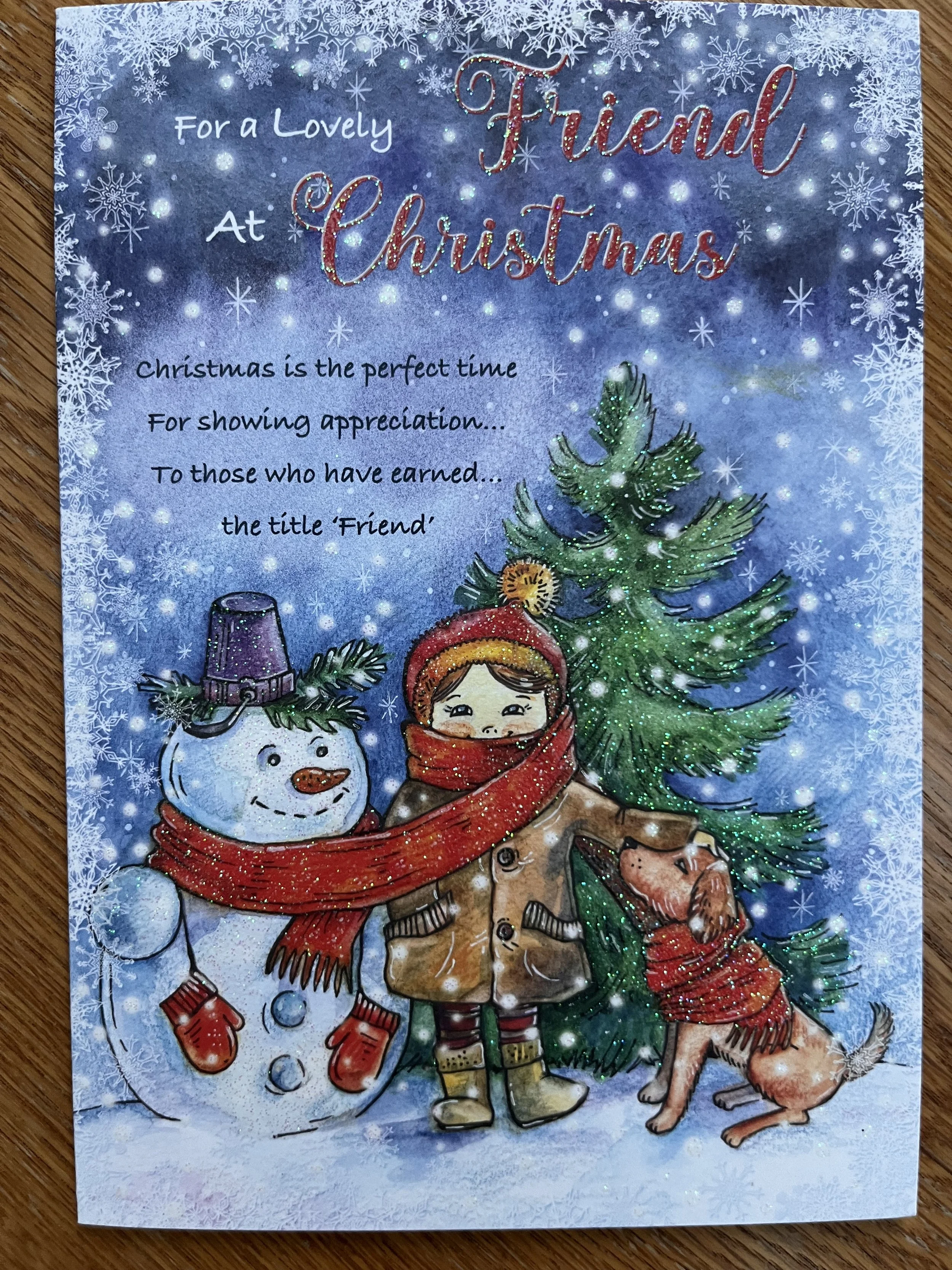 Friend Christmas card design features effective red foiling with heartfelt sentiment that continues inside on a full colour illustrated insert