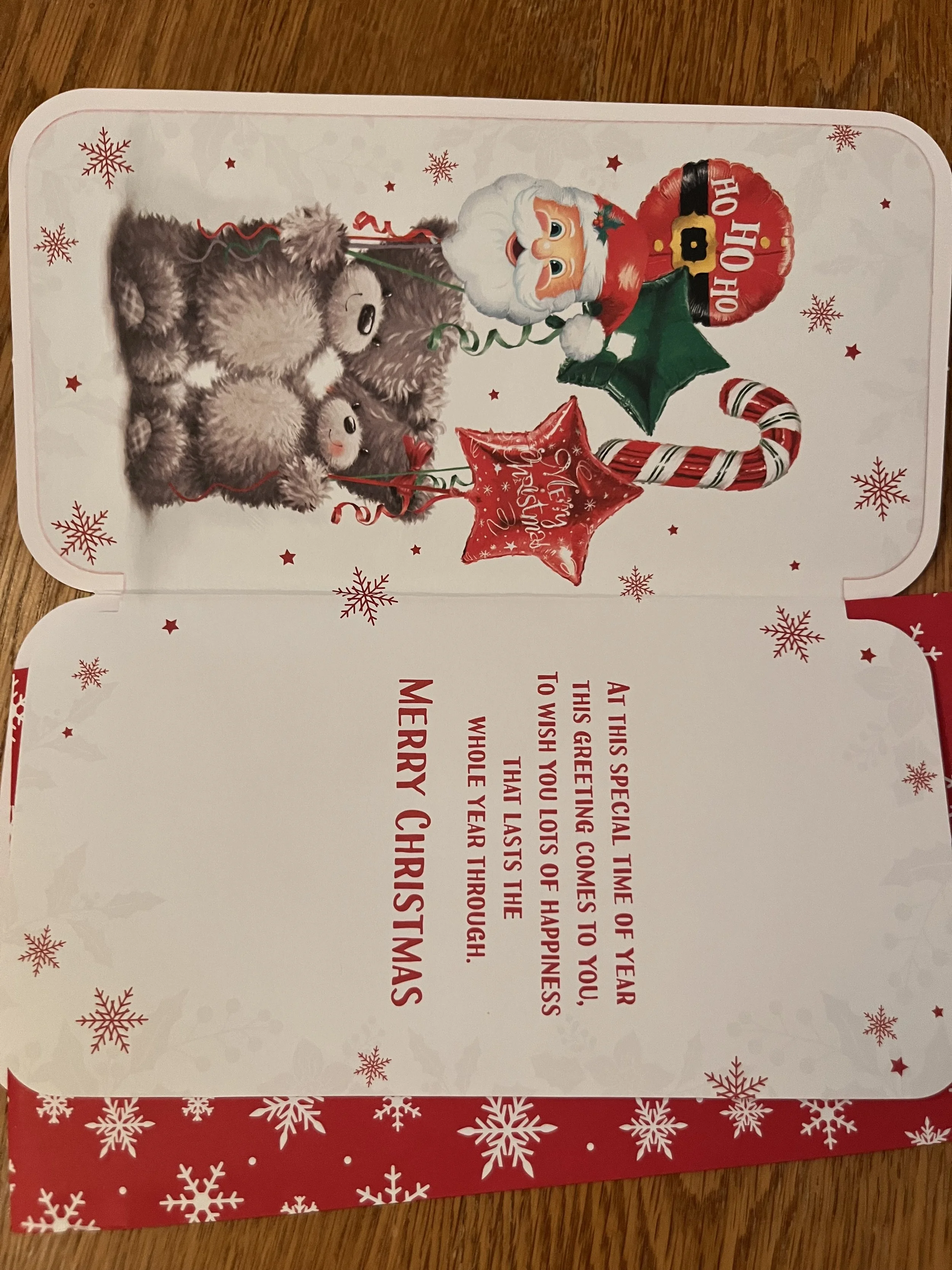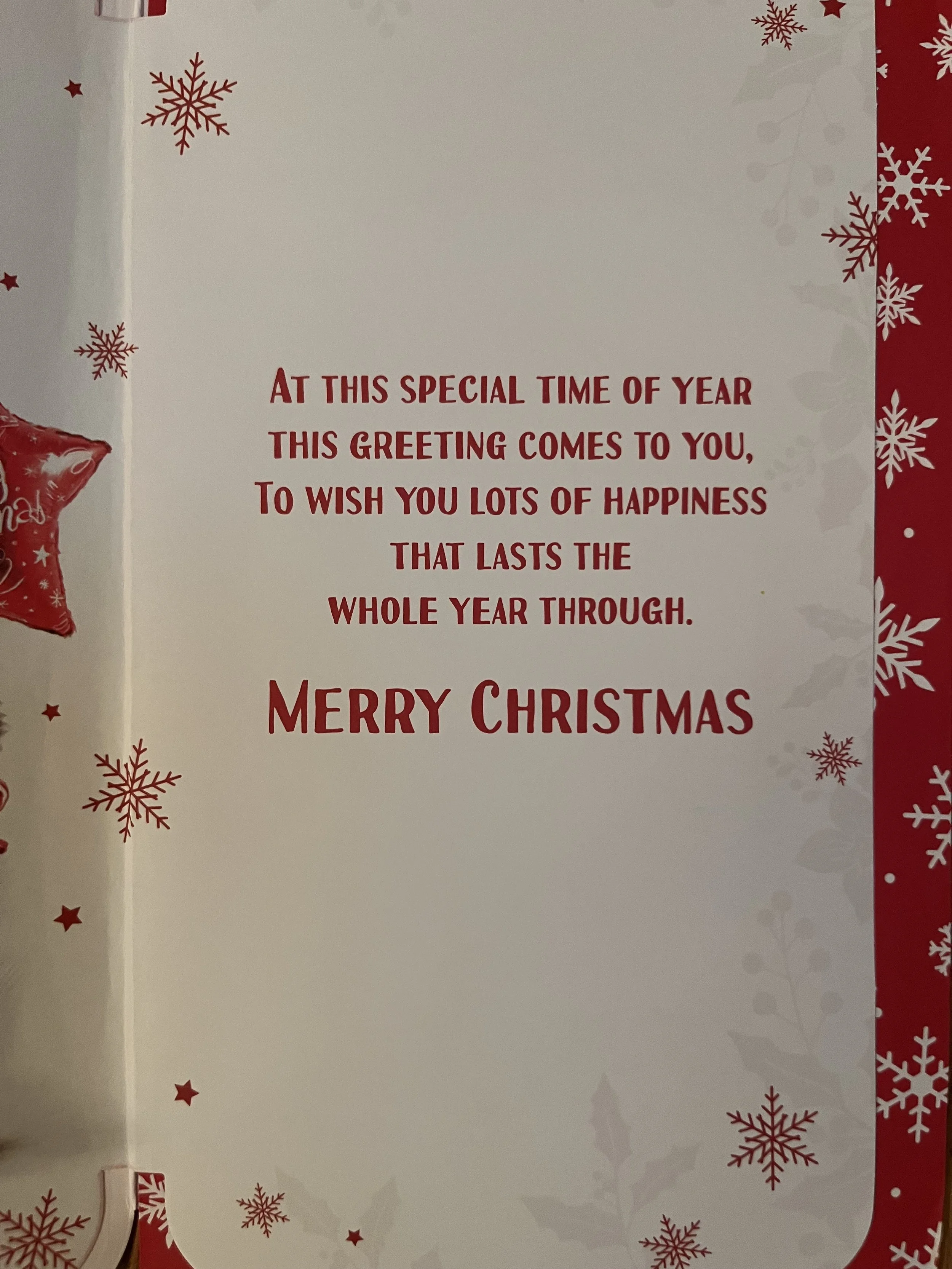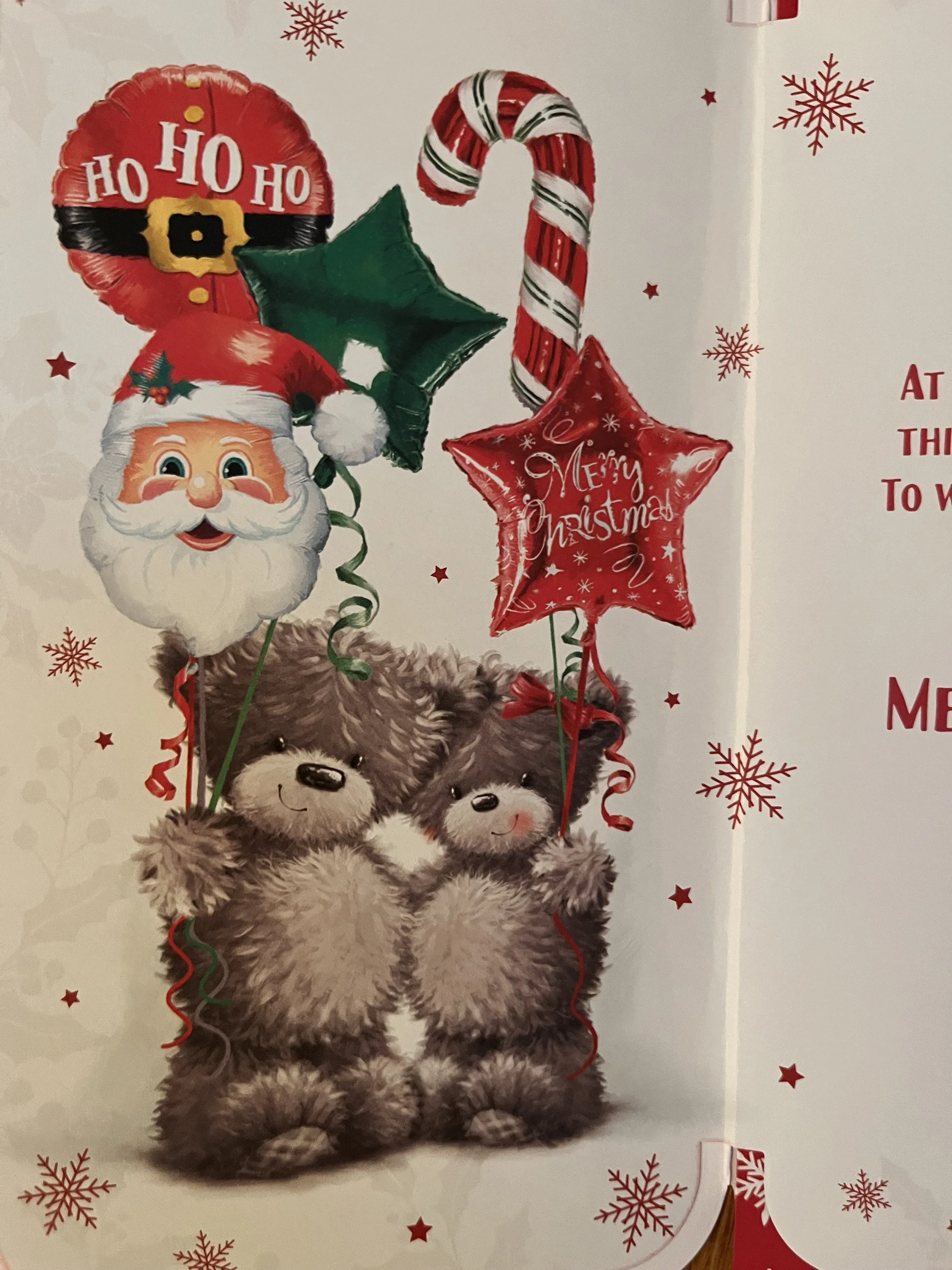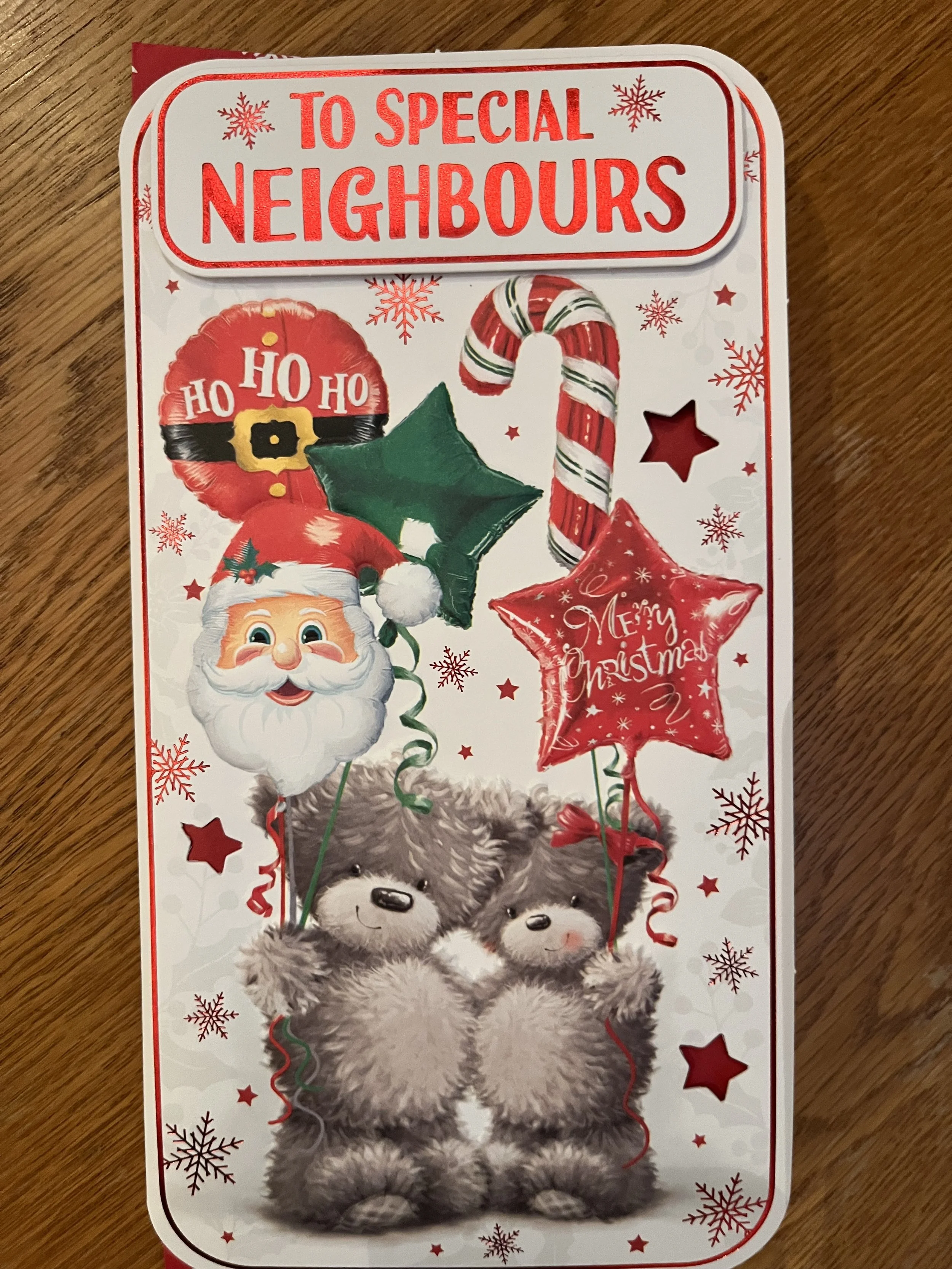 Neighbours Christmas card design features a red fabric ribbon attachment, effective foil, embossing and inside a festive, colour illustrated insert