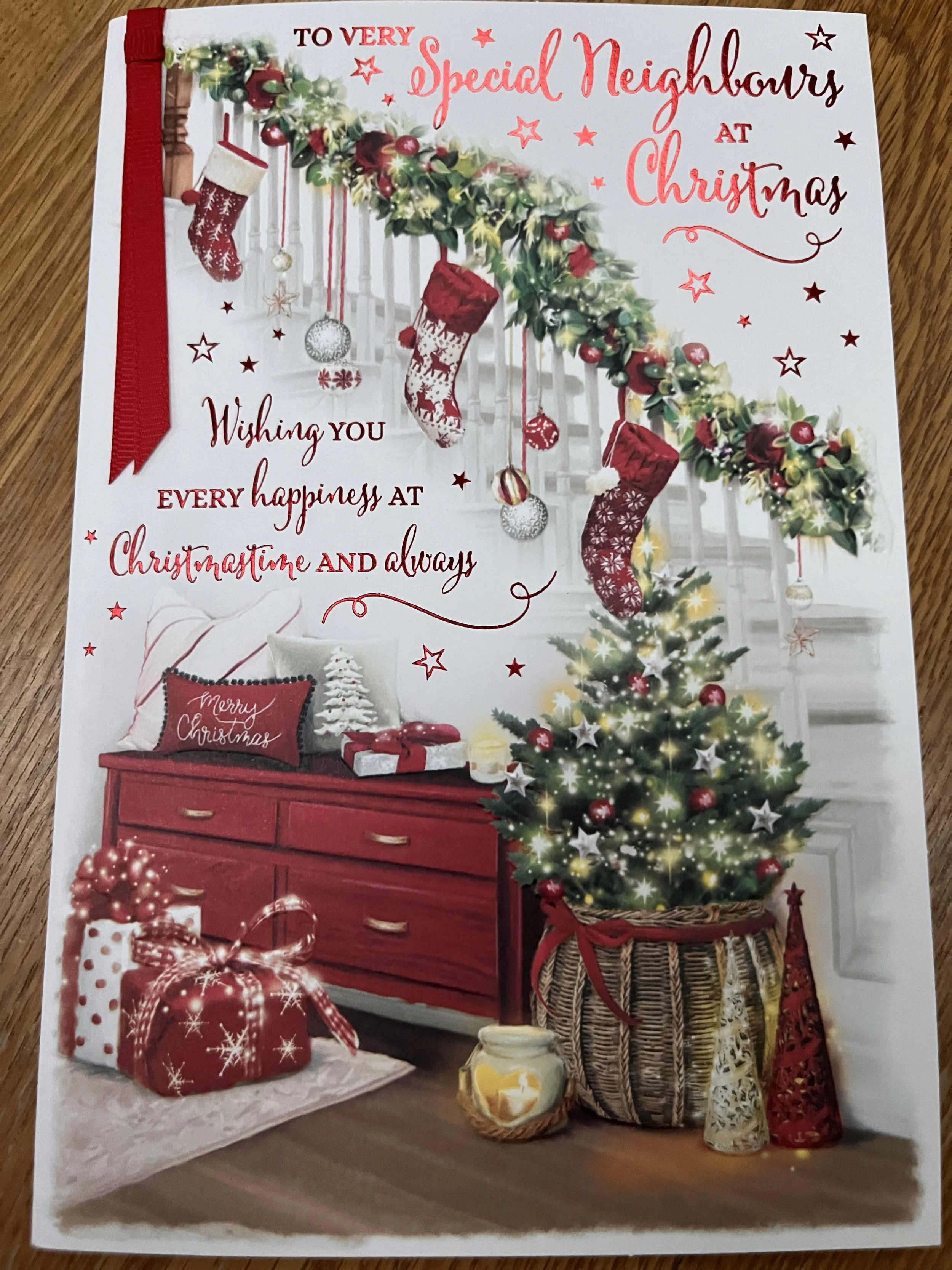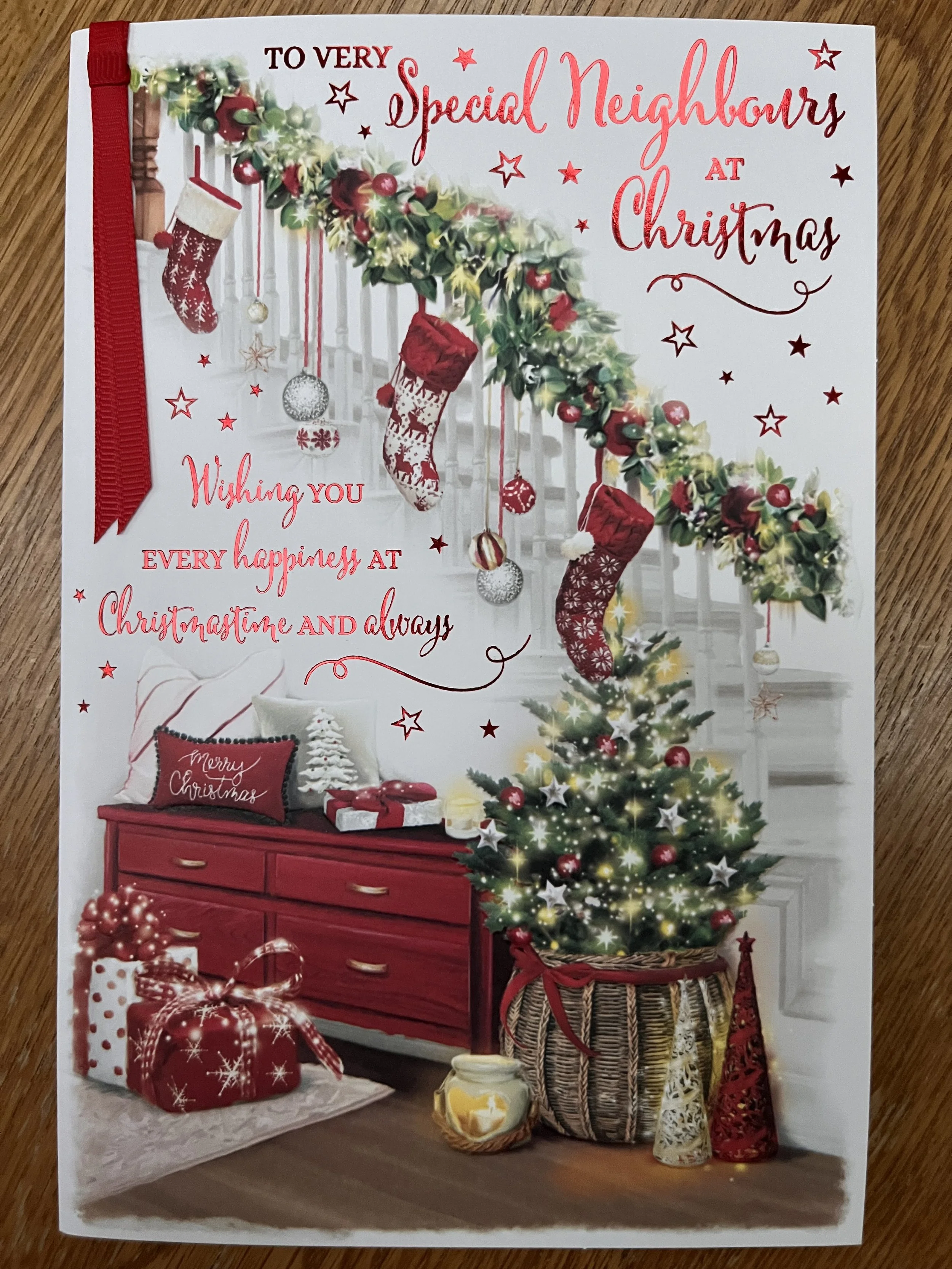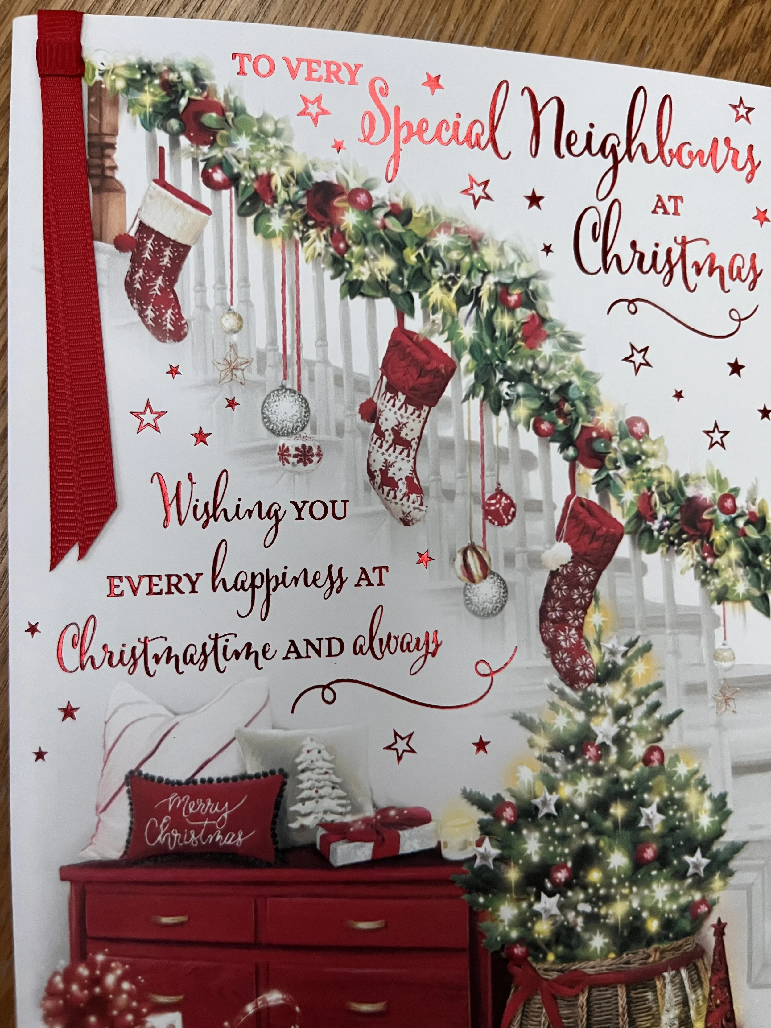 Neighbours Christmas card design features a red and white twisted paper ribbon and bow, effective foil and inside a festive full colour illustrated insert